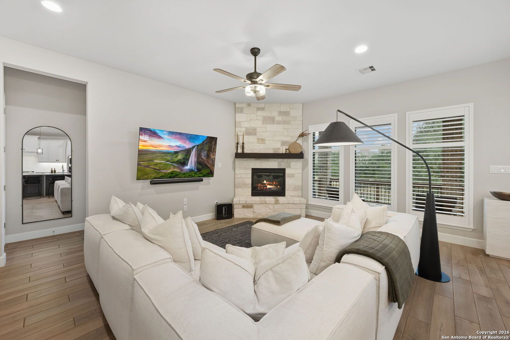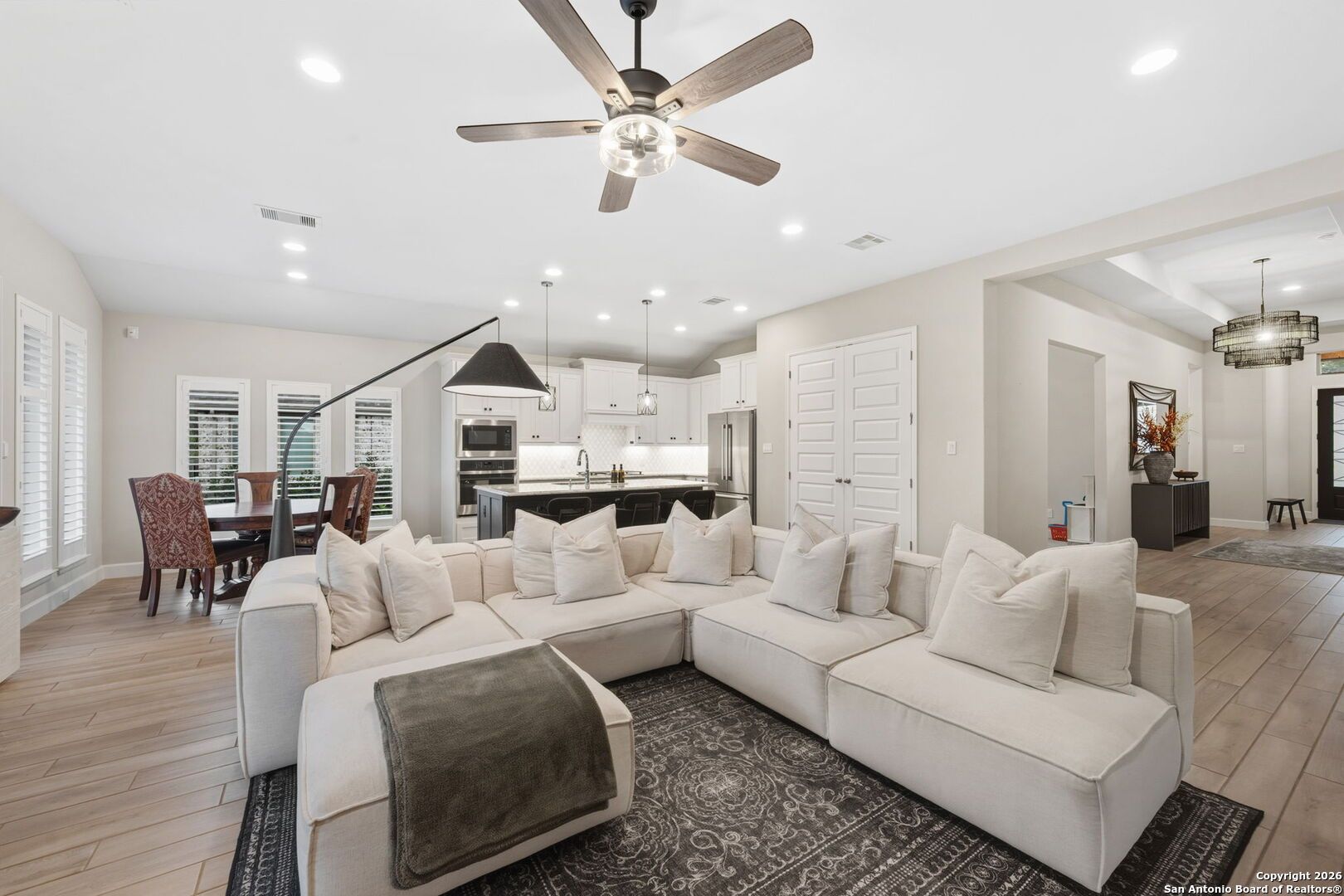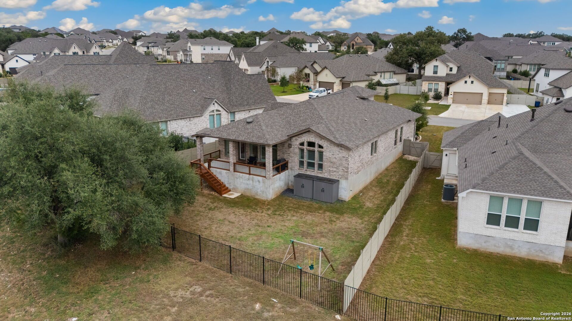 Beautifully maintained home in The Grove at Vintage Oaks, built in 2021 and set on an over 9,500 sq ft lot backing to a peaceful greenbelt with a majestic oak tree providing exceptional privacy. Offering 2,633 square feet, this thoughtfully designed single-story layout features 4 bedrooms, 3 full baths, and a desirable 3-car tandem garage with an epoxy-coated floor. This home showcases a truly exceptional kitchen designed to be lived around, featuring a generous island, abundant counter and cabinet space, stainless steel appliances, built-in microwave, 36" gas range, and double built-in ovens. Luxurious snowfall granite countertops with an elegant ogee edge are complemented by a custom arabesque stone backsplash, creating a striking yet timeless finish ideal for both everyday living and entertaining. The open-concept floor plan provides comfortable everyday living with flexibility for guests or a home office. Enjoy resort-style Vintage Oaks amenities including pools, a lazy river, extensive walking trails, and a full calendar of community events-all within one of New Braunfels' most sought-after Hill Country communities.