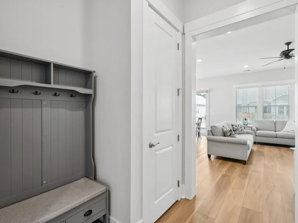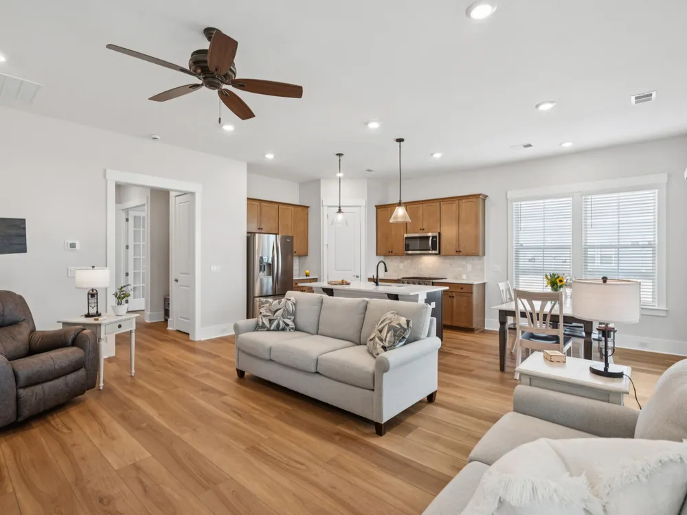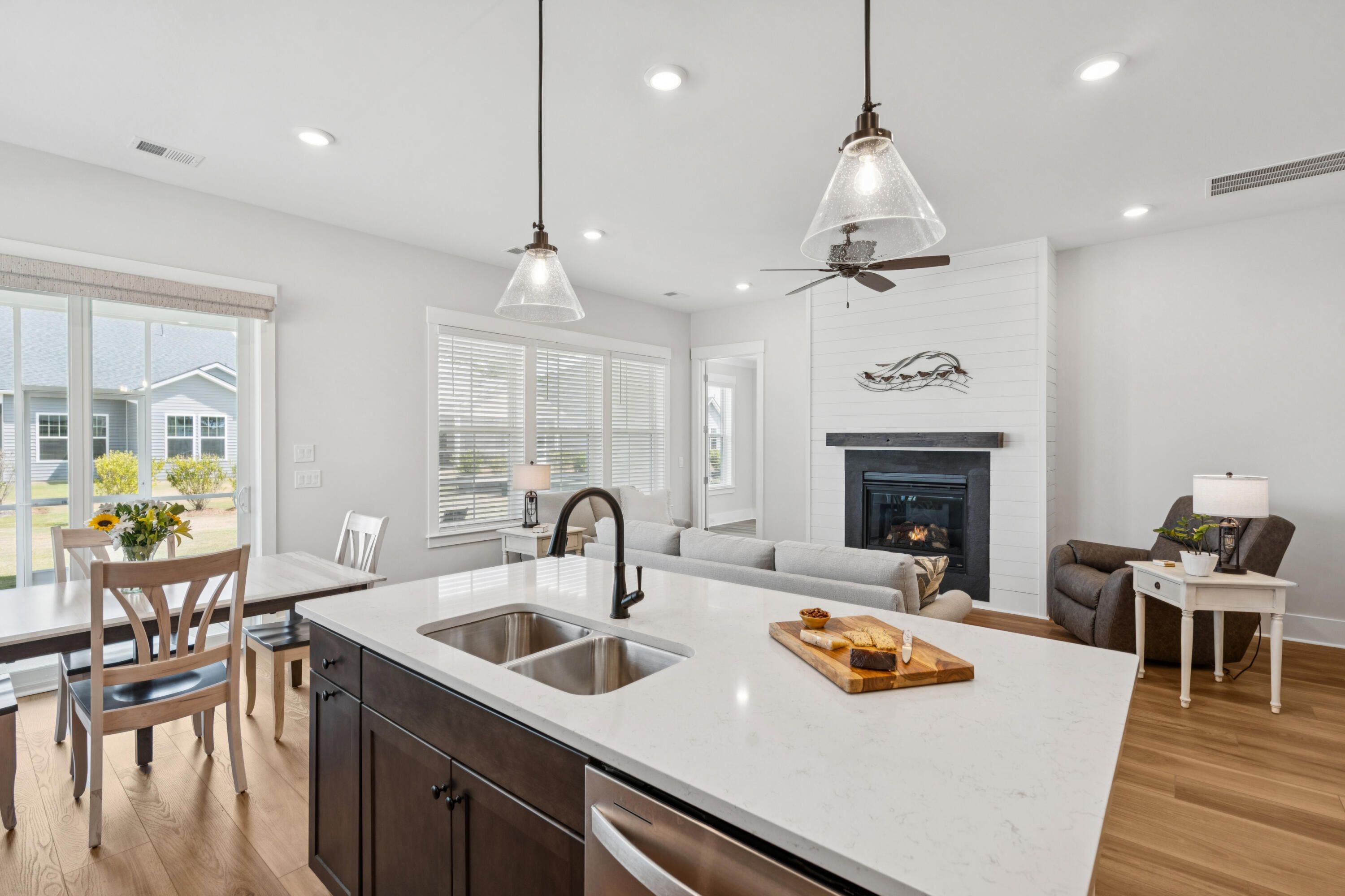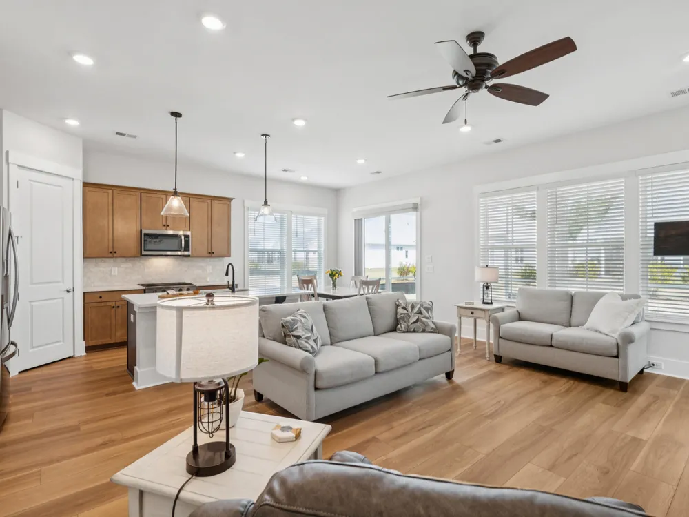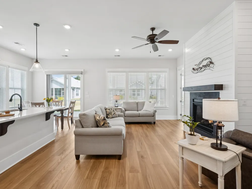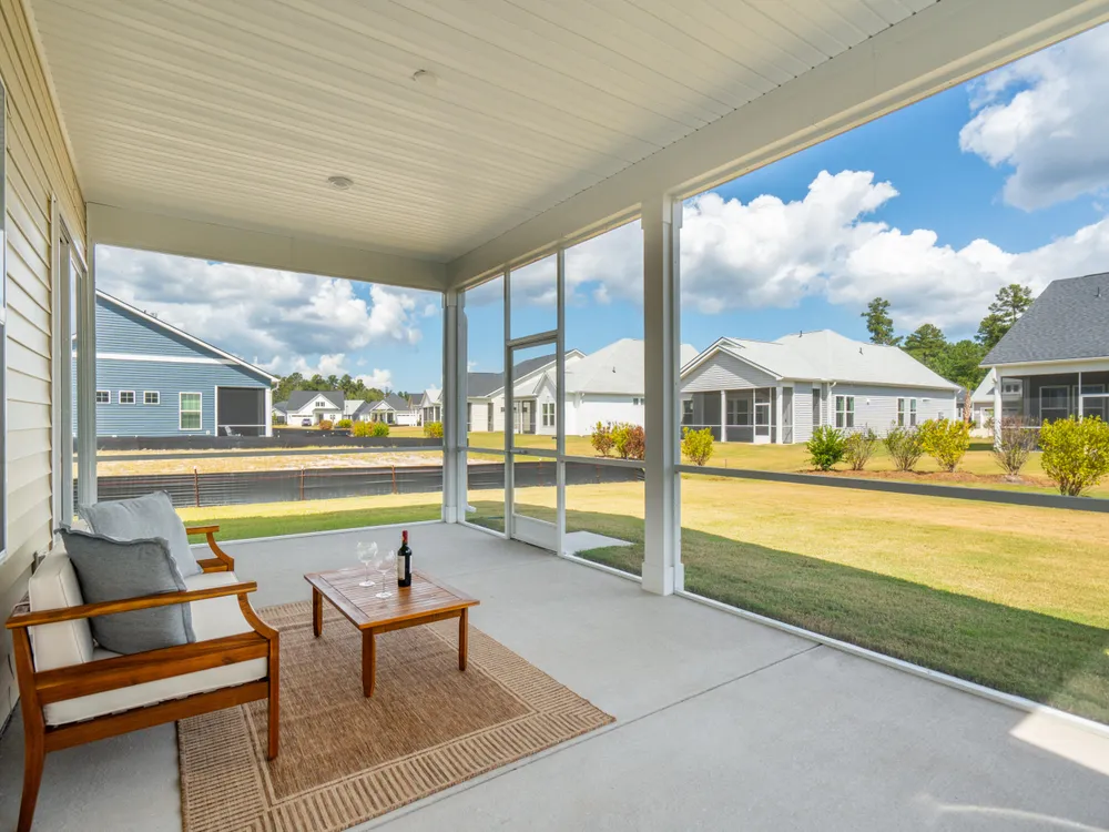 Welcome to Summerwind Crossing, a charming community where 422 Evening Glow Lane stands out as one of the best lots in the neighborhood with an extra approximate 3' on each side of the home. This thoughtfully designed beauty offers comfort, style, and convenience -- all without the wait or stress of new construction.Highlights of the Home Inviting Exterior: Full front porch perfect for relaxing evenings. Welcoming Entry: Foyer with drop zone and coat closet. Flexible Living Spaces: Spacious secondary bedroom and bath opposite the owner's suite for privacy. Large flex room with French doors, perfect for an office, playroom, or third bedroom. Garage Extras: 2-car garage with remote, exterior keypad, utility sink, storage, side door, finished/painted walls, attic pull-down stairs, and special floor coating. Stylish Laundry Room: Beautifully crafted tile flooring, shelving, and large closet. Gourmet Kitchen: Quartz countertops, 42" shaker cabinetry in a rich, soft tan with soft-close drawers, dovetail construction, and trash drawer, gas stove with griddle, tile backsplash, pendant lighting, large walk-in pantry, and generous island overlooking the family room. Family Room: 10' ceilings, fireplace with mantle and shiplap accent. Outdoor Living: Huge screened-in porch for quiet evenings. Owner's Suite: Ensuite bath with dual vanity, tiled shower with bench, private water closet, and frameless glass shower door, and large walk-in closet. Premium Features: "X" flood zone (no flood insurance required), 8' interior doors, 8" baseboards, outlets hidden within trim, tray ceilings, crown moldings, trimmed windows, upgraded LVP throughout (tile in baths, no carpet), high-speed connections, tankless water heater, gutters, window blinds throughout. New Whirlpool side-by-side refrigerator with bottom freezer + high-end washer & dryer (over $5,000 value). Over $75,000 in builder options including extended outdoor living, extra windows, extra-wide bump outs in bedrooms & flex room, additional outdoor lighting, tiled showers, and more. New construction kinks already resolved, move in with confidence. Balance of HOA credit will convey to buyer ($3,510 as of 9/1/25, with $250/month being applied) Selling below original purchase price of $422,203 despite upgrades. $2500 contribution towards closing costs/prepaids/rate buy down with use of preferred lender. Community resort-style amenities: Pool, pavilion with public restrooms, event lawn, dog parks (large and small dogs), pickleball courts. The monthly HOA fee covers not only the amenities but also: home lawn maintenance/weeding/seeding/ mowing/fertilizing/edging/pine straw and community common areas; and Cane Bay Plantation lake access (300 acre lake ideal for kayaking, paddleboarding, fishing and more). Close proximity to top schools, restaurants, shopping, downtown Charleston, and area beaches. This home truly beats the competition, move-in ready, fully upgraded, and priced to sell. Don't miss the chance to call 422 Evening Glow Lane your new home!