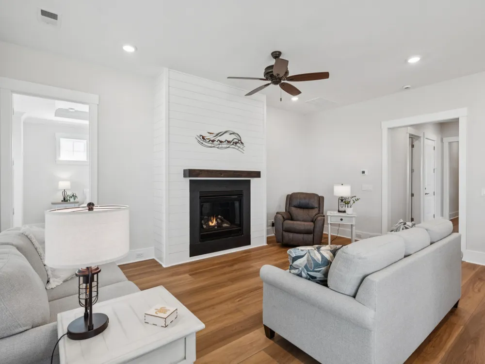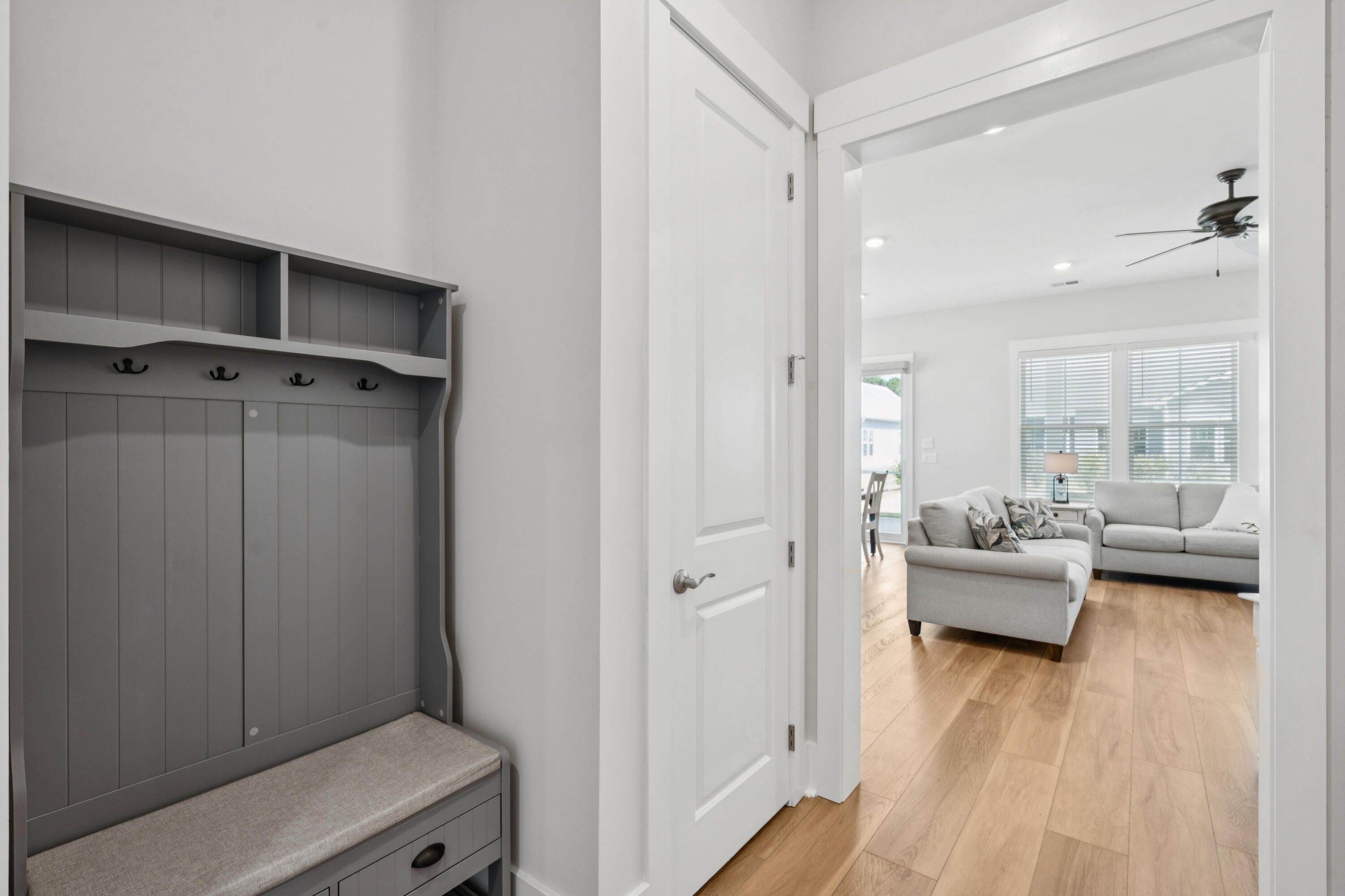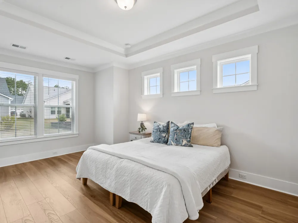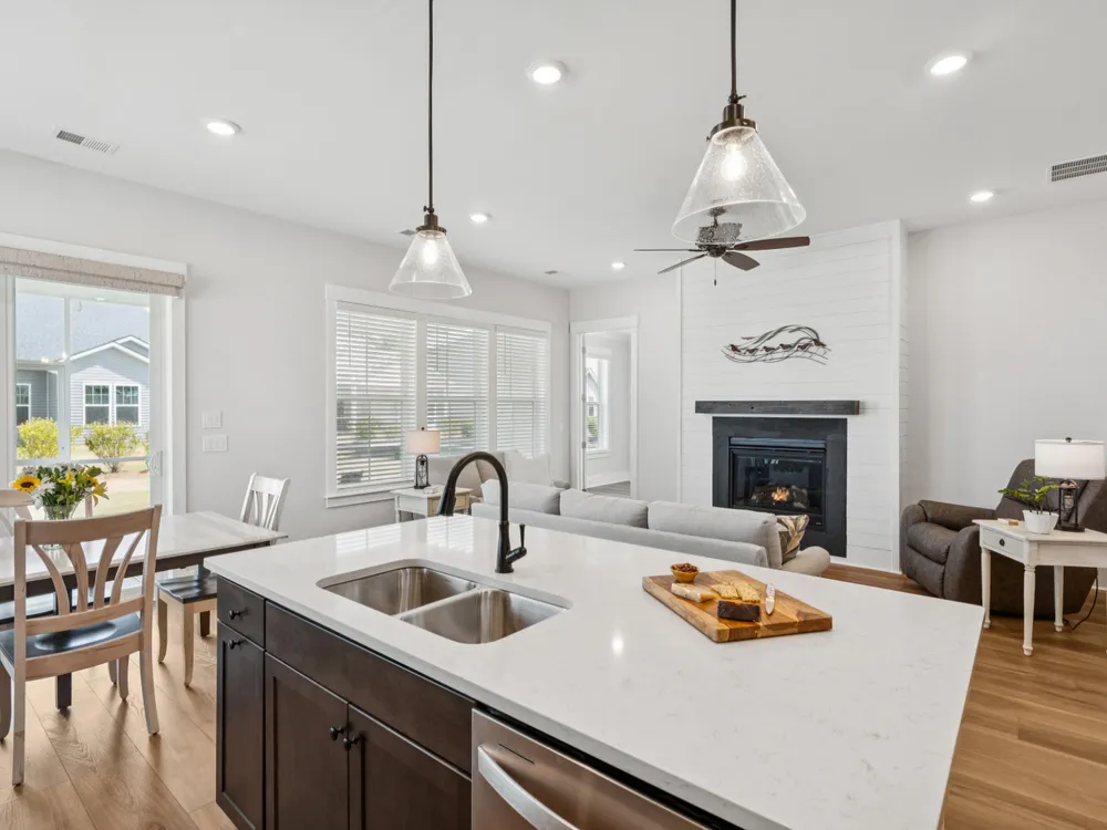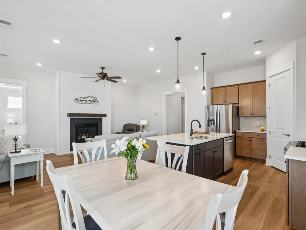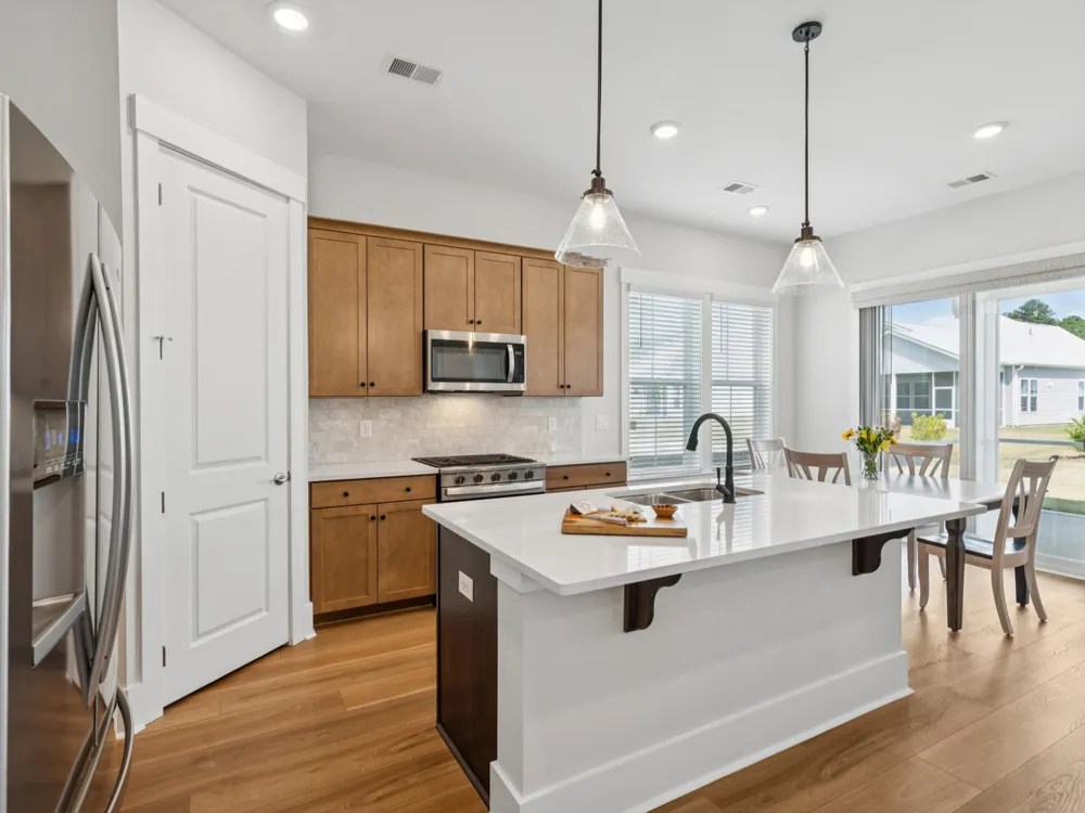 Welcome to Summerwind Crossing, a charming community where 422 Evening Glow Lane stands out as one of the best lots in the neighborhood with an extra approximate 3' on each side of the home. This thoughtfully designed beauty offers comfort, style, and convenience -- all without the wait or stress of new construction.Highlights of the Home Inviting Exterior: Full front porch perfect for relaxing evenings. Welcoming Entry: Foyer with drop zone and coat closet. Flexible Living Spaces: Spacious secondary bedroom and bath opposite the owner's suite for privacy. Large flex room with French doors, perfect for an office, playroom, or third bedroom. Garage Extras: 2-car garage with remote, exterior keypad, utility sink, storage, side door, finished/painted walls, attic pull-down stairs, and special floor coating. Stylish Laundry Room: Beautifully crafted tile flooring, shelving, and large closet. Gourmet Kitchen: Quartz countertops, 42" shaker cabinetry in a rich, soft tan with soft-close drawers, dovetail construction, and trash drawer, gas stove with griddle, tile backsplash, pendant lighting, large walk-in pantry, and generous island overlooking the family room. Family Room: 10' ceilings, fireplace with mantle and shiplap accent. Outdoor Living: Huge screened-in porch for quiet evenings. Owner's Suite: Ensuite bath with dual vanity, tiled shower with bench, private water closet, and frameless glass shower door, and large walk-in closet. Premium Features: "X" flood zone (no flood insurance required), 8' interior doors, 8" baseboards, outlets hidden within trim, tray ceilings, crown moldings, trimmed windows, upgraded LVP throughout (tile in baths, no carpet), high-speed connections, tankless water heater, gutters, window blinds throughout. New Whirlpool side-by-side refrigerator with bottom freezer + high-end washer & dryer (over $5,000 value). Over $75,000 in builder options including extended outdoor living, extra windows, extra-wide bump outs in bedrooms & flex room, additional outdoor lighting, tiled showers, and more. New construction kinks already resolved, move in with confidence. Balance of HOA credit will convey to buyer ($3,510 as of 9/1/25, with $250/month being applied) Selling below original purchase price of $422,203 despite upgrades. $2500 contribution towards closing costs/prepaids/rate buy down with use of preferred lender. Community resort-style amenities: Pool, pavilion with public restrooms, event lawn, dog parks (large and small dogs), pickleball courts. The monthly HOA fee covers not only the amenities but also: home lawn maintenance/weeding/seeding/ mowing/fertilizing/edging/pine straw and community common areas; and Cane Bay Plantation lake access (300 acre lake ideal for kayaking, paddleboarding, fishing and more). Close proximity to top schools, restaurants, shopping, downtown Charleston, and area beaches. This home truly beats the competition, move-in ready, fully upgraded, and priced to sell. Don't miss the chance to call 422 Evening Glow Lane your new home!