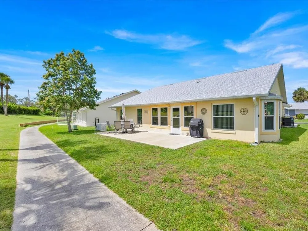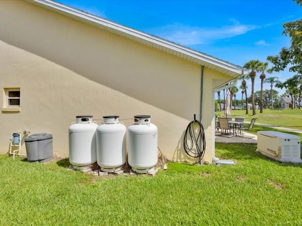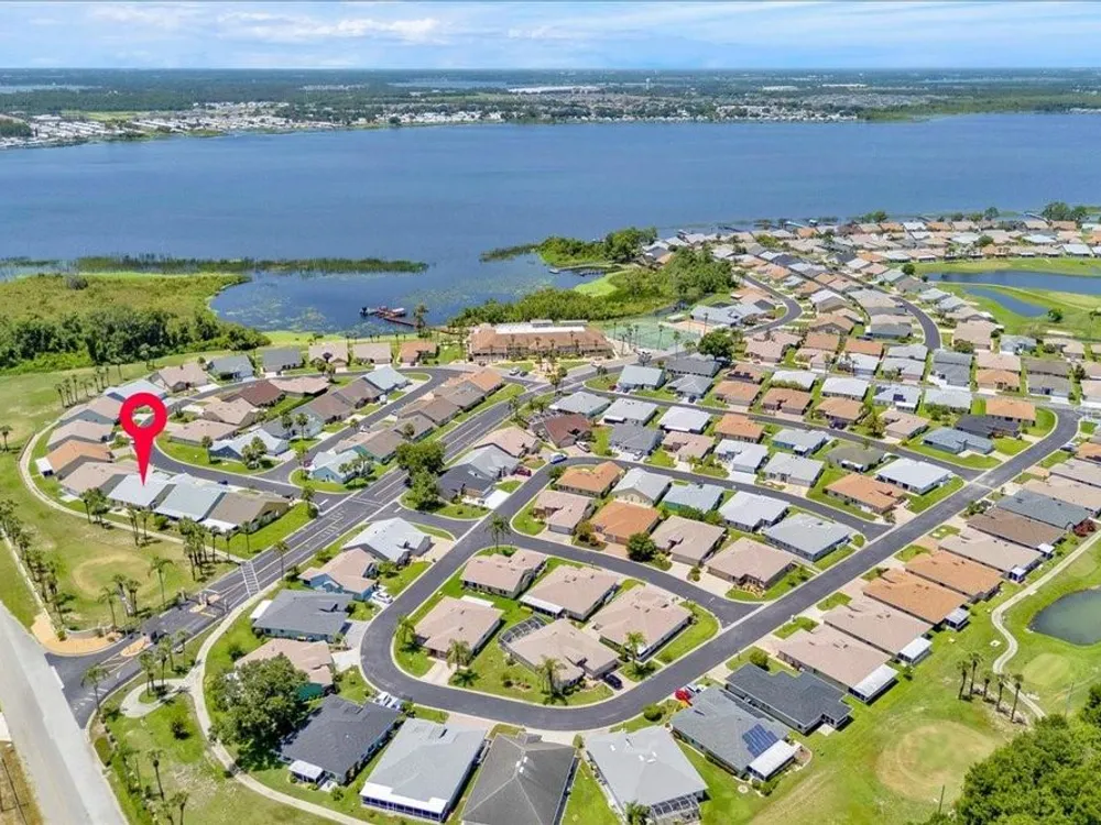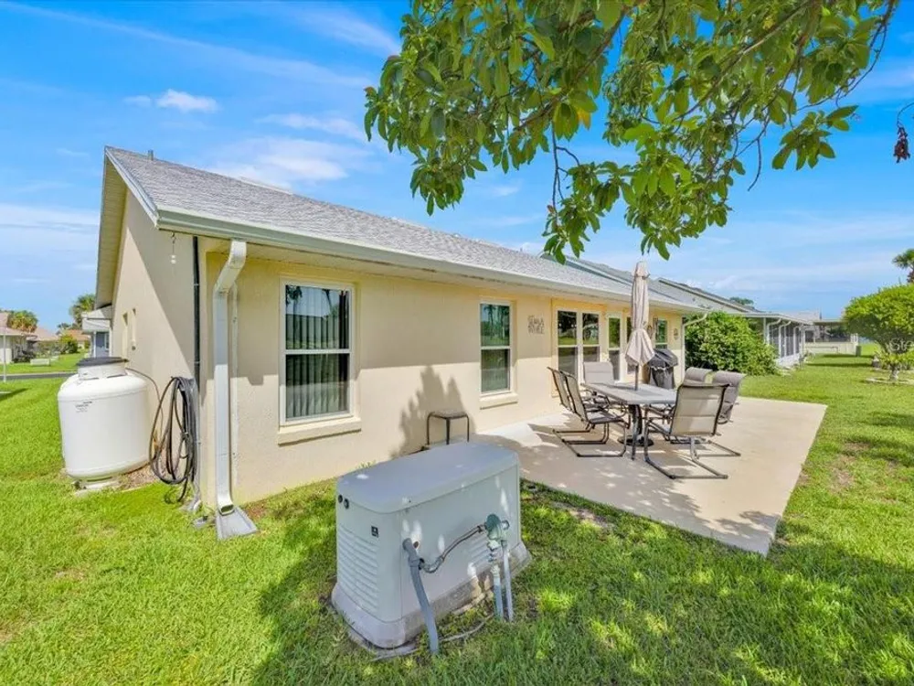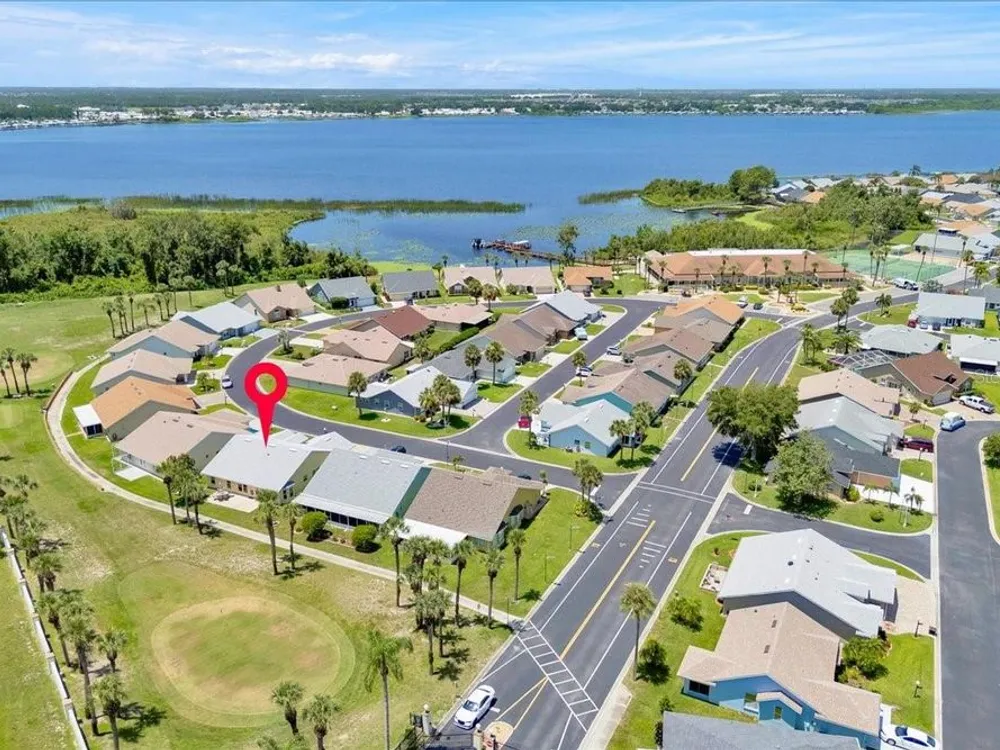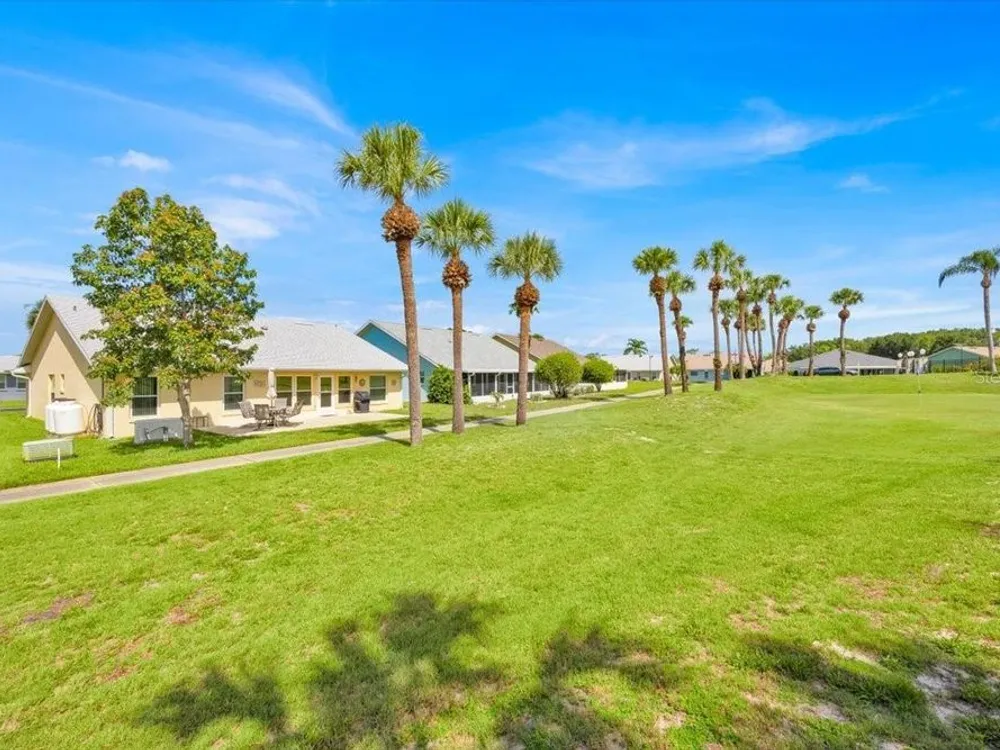 Step through the front door of this beautifully updated 3-bedroom, 2-bath home in the desirable 55+ lakefront community of Lake Henry Estates. Immediately feel the sense of space—thanks to soaring 11-foot ceilings and an open, airy layout. Your eyes are drawn straight to the back of the home, where wide windows frame stunning views of the golf course and swaying palm trees, creating a peaceful, resort-like backdrop. Tile floors run through the main living areas, while the kitchen gleams with granite countertops and modern cabinets (2021). The bedrooms includes warm laminate flooring, and both bathrooms have been stylishly upgraded with tiled showers and grab bars for added comfort. Step out to the covered lanai and soak in the beauty of the backyard—lush greens, palm trees, and the gentle rhythm of the golf course just beyond your property. It’s a picture-perfect retreat for morning coffee or sunset relaxation. Peace of mind comes built in with a new roof (2024), energy-efficient windows, a Generac whole-house generator with a 10 year warranty, three 100-gallon propane tanks, a 2023 water heater, water softener, and a freshly painted garage floor with electric screen. Lake Henry Estates offers gated, lakefront living with unmatched amenities: a 9-hole golf course, community pool, boating, tennis, pickleball, shuffleboard, bocce ball and a vibrant social calendar. The clubhouse includes a pub, library, billiards, and fitness center—everything you need for active, connected living. Just minutes from Publix, Walmart, and restaurants, this home combines beauty, comfort, and convenience. Schedule your private showing today and experience Florida living at its best—right on the golf course, under the palms.