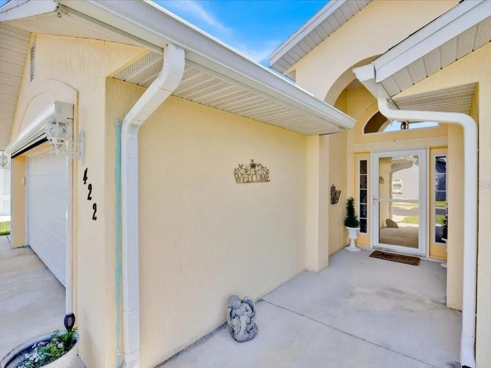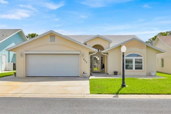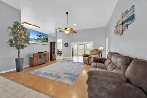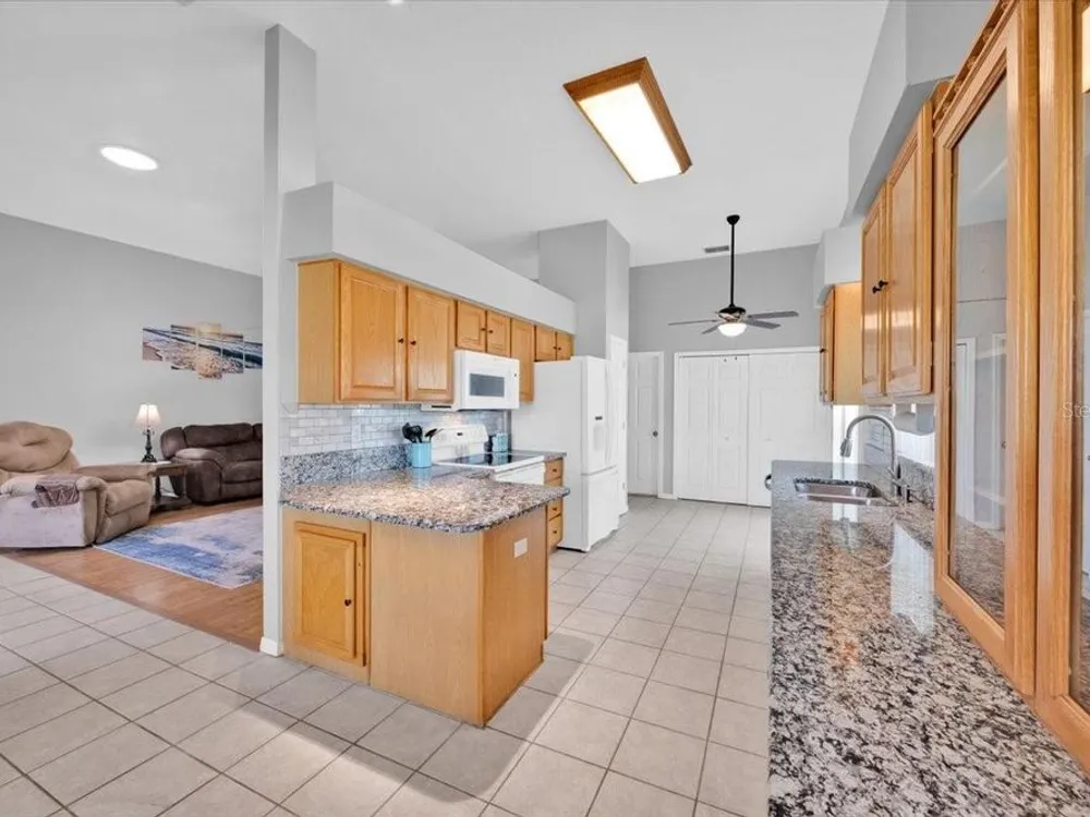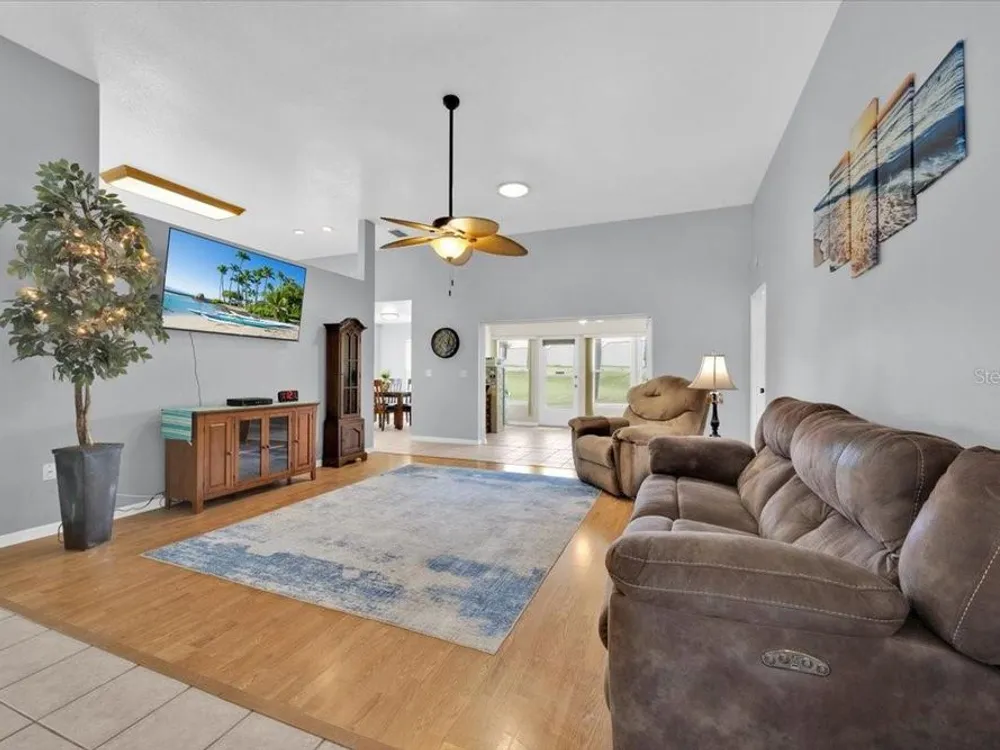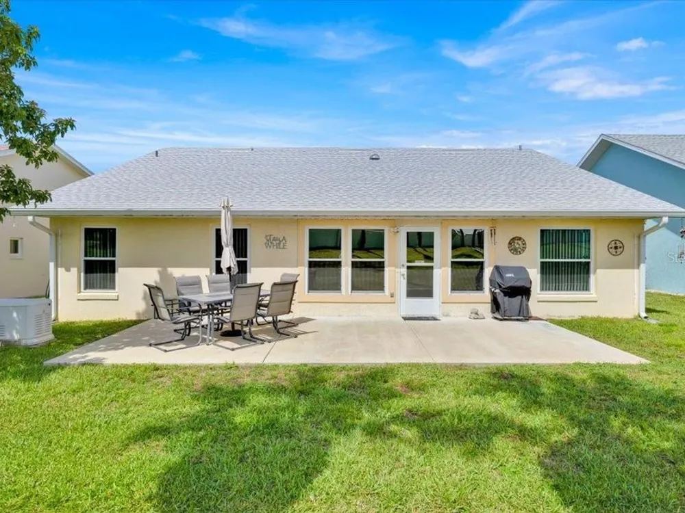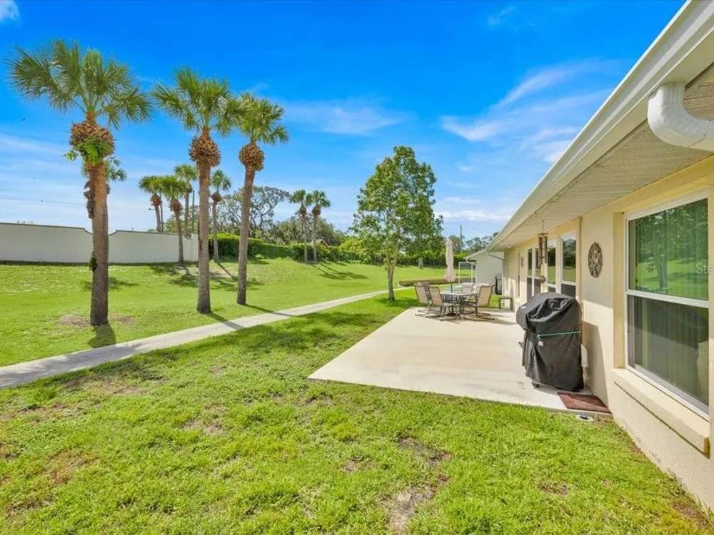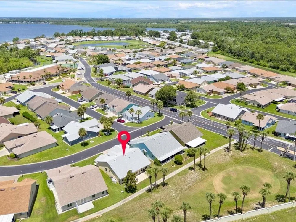 Step through the front door of this beautifully updated 3-bedroom, 2-bath home in the desirable 55+ lakefront community of Lake Henry Estates. Immediately feel the sense of space—thanks to soaring 11-foot ceilings and an open, airy layout. Your eyes are drawn straight to the back of the home, where wide windows frame stunning views of the golf course and swaying palm trees, creating a peaceful, resort-like backdrop. Tile floors run through the main living areas, while the kitchen gleams with granite countertops and modern cabinets (2021). The bedrooms includes warm laminate flooring, and both bathrooms have been stylishly upgraded with tiled showers and grab bars for added comfort. Step out to the covered lanai and soak in the beauty of the backyard—lush greens, palm trees, and the gentle rhythm of the golf course just beyond your property. It’s a picture-perfect retreat for morning coffee or sunset relaxation. Peace of mind comes built in with a new roof (2024), energy-efficient windows, a Generac whole-house generator with a 10 year warranty, three 100-gallon propane tanks, a 2023 water heater, water softener, and a freshly painted garage floor with electric screen. Lake Henry Estates offers gated, lakefront living with unmatched amenities: a 9-hole golf course, community pool, boating, tennis, pickleball, shuffleboard, bocce ball and a vibrant social calendar. The clubhouse includes a pub, library, billiards, and fitness center—everything you need for active, connected living. Just minutes from Publix, Walmart, and restaurants, this home combines beauty, comfort, and convenience. Schedule your private showing today and experience Florida living at its best—right on the golf course, under the palms.