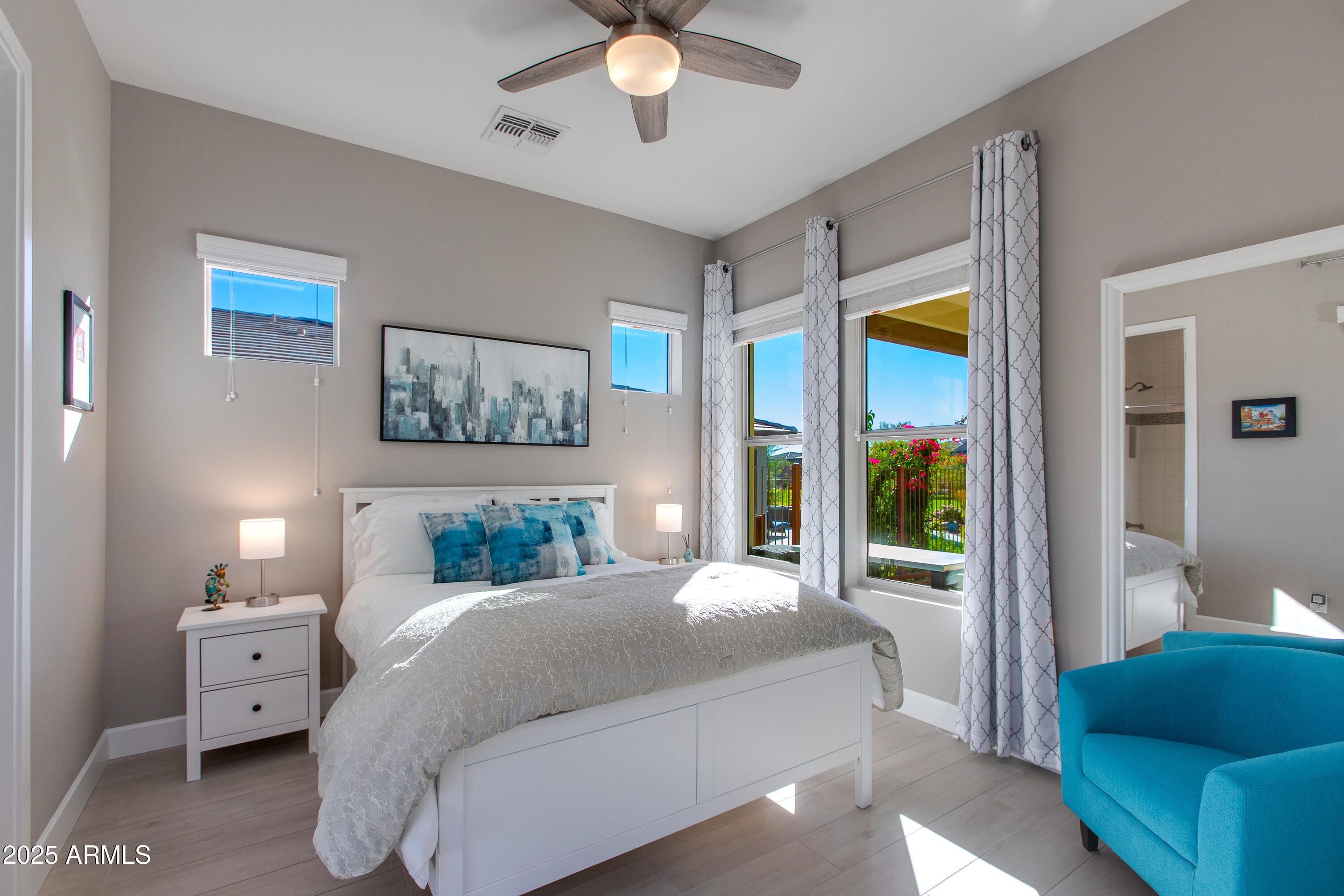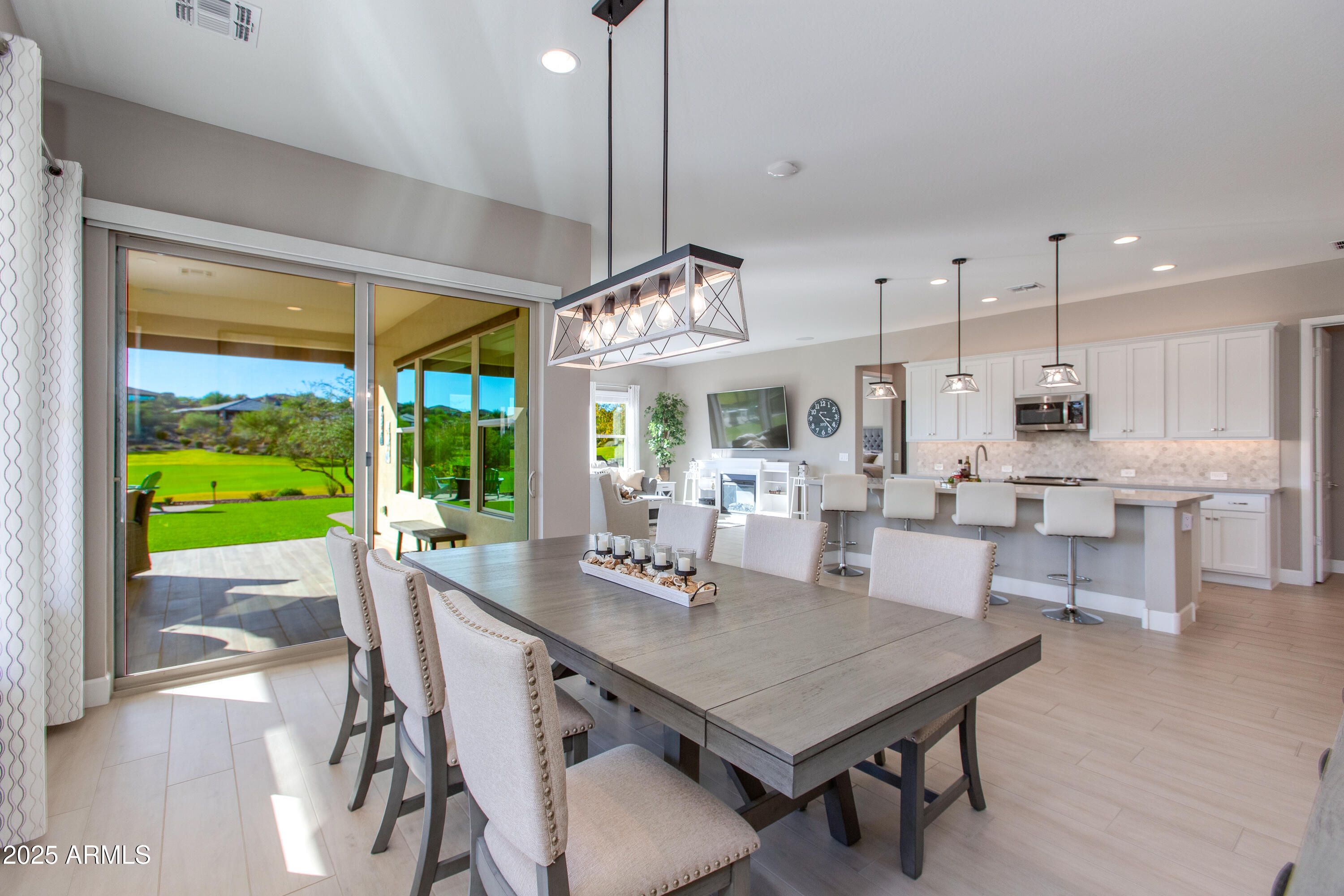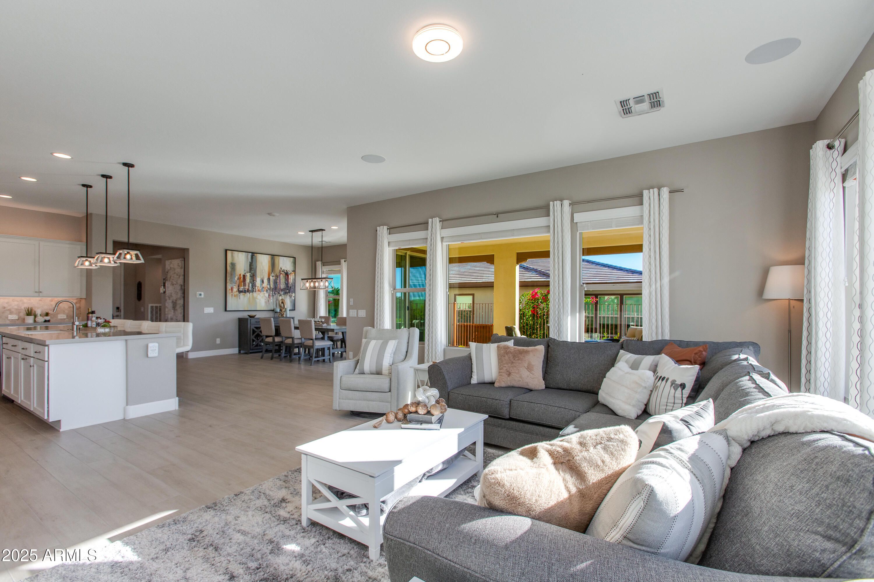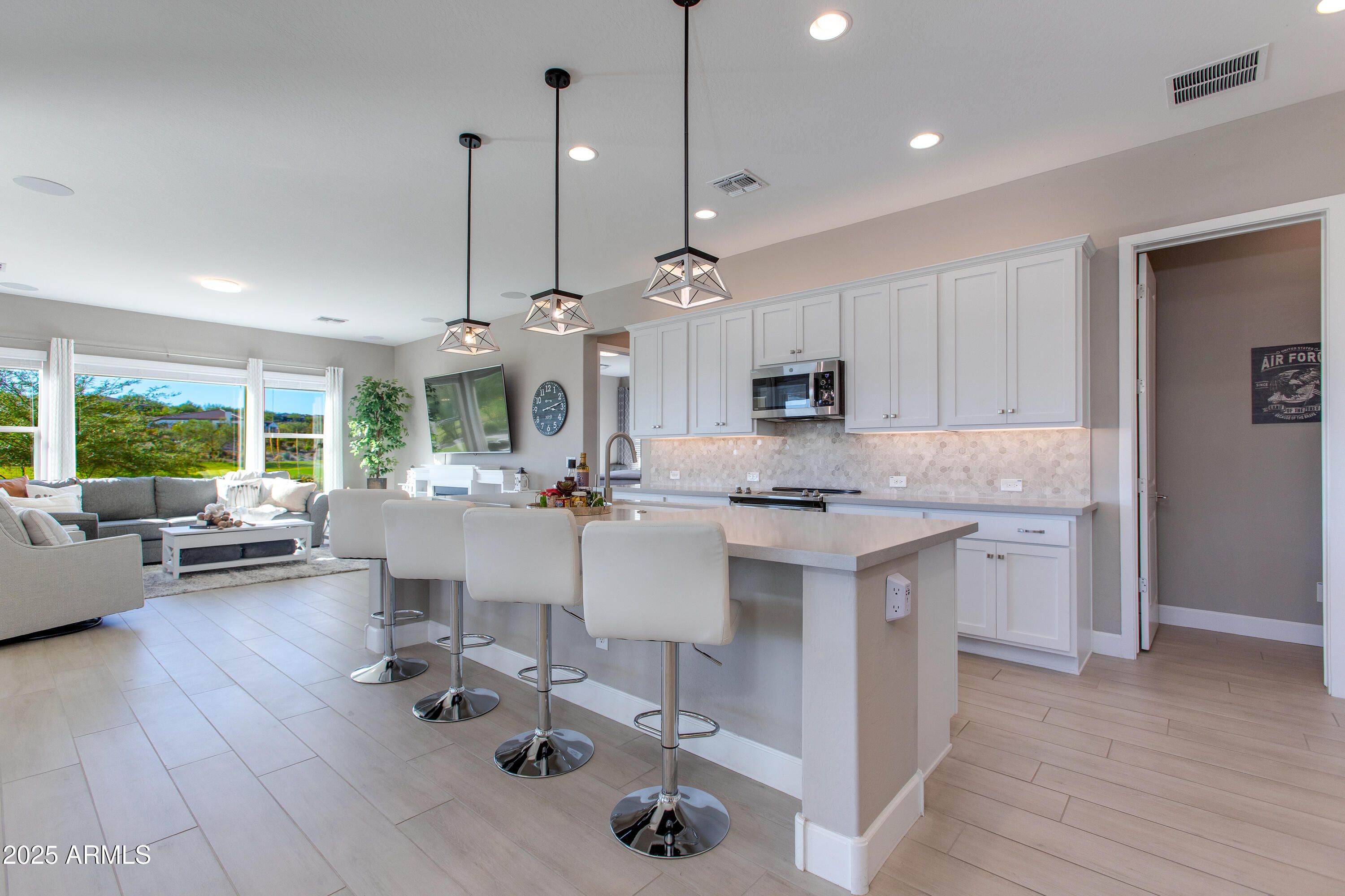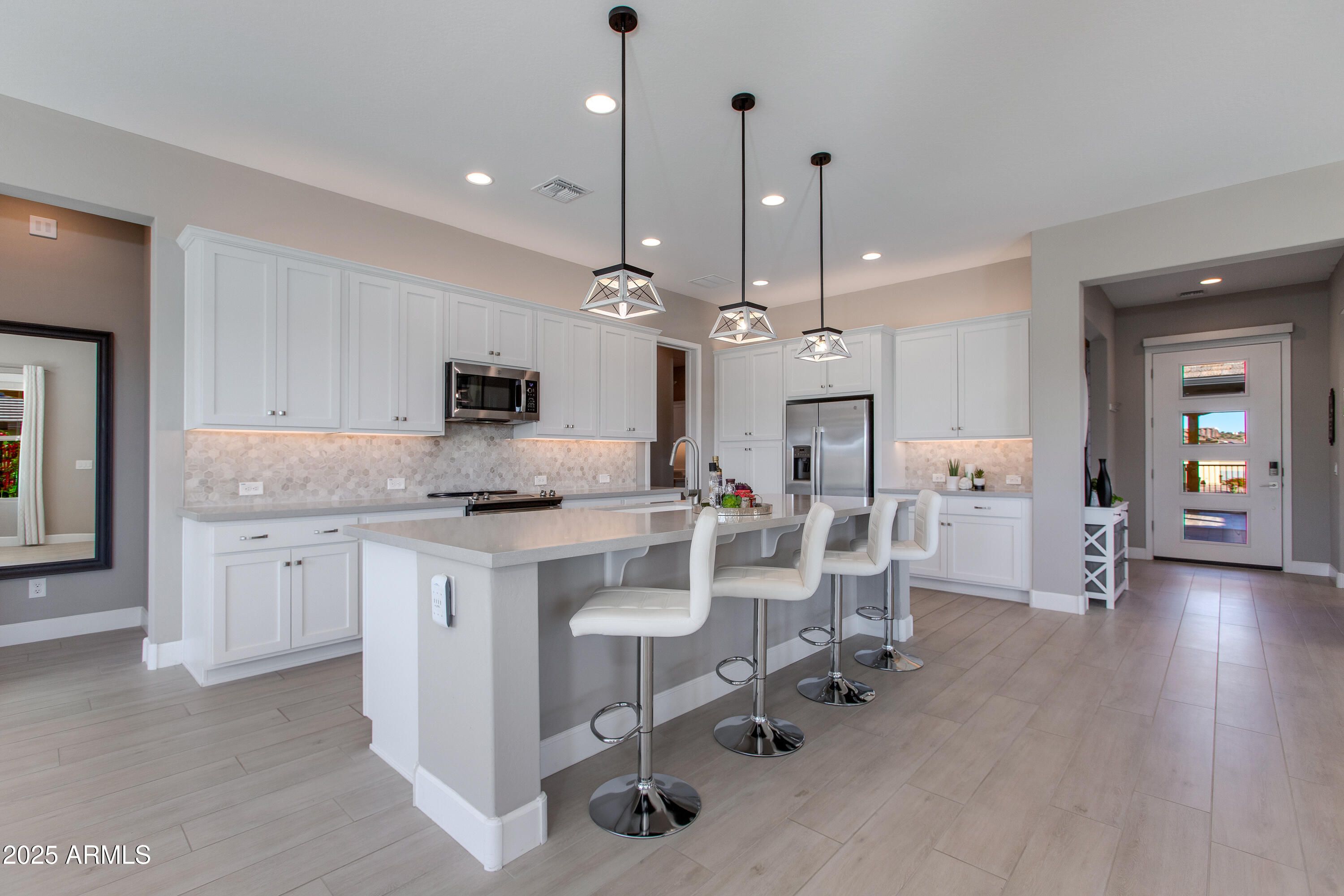 Stunning Shea built Latigo home in the Iron Horse neighborhood of Wickenburg Ranch—perfectly positioned on the 14th fairway with serene pond & waterfall views. 2,771 sq ft with 3 beds + den, 3.5 baths, & a private casita w/ kitchenette & separate entry. Designer upgrades include quartz counters, Carrera stone backsplash, GE Profile appliances, Regal White cabinetry, upgraded flooring, soft-close drawers & 10' ceilings. The 4-car garage is fully insulated w/ epoxy floors, 4' extension, split A/C & EV outlet. Enjoy a whole-home alkaline water filtration system servicing interior & exterior water. Extended tiled patio, manicured yard & open courtyard entry complete this one-of-a-kind home near Lake Park & The Watering Hole. - FULL DESCRIPTION - Experience elevated desert living in this Shea built Latigo home, perfectly situated on the 14th fairway of Wickenburg Ranch's Big Wick course in the exclusive Iron Horse neighborhood. With 2,771 sq ft of thoughtfully designed space, this home features 3 bedrooms plus a den, 3.5 baths, and a private casita with its own entry and kitchenetteideal for guests or multigenerational living. The designer kitchen shines with quartz countertops, Carrera stone backsplash, GE Profile appliances, Regal White cabinetry, and soft-close drawers. Ten-foot ceilings, large picture windows, and upgraded flooring create a light, modern ambiance that frames tranquil views of the pond and waterfall. The 4-car garage is fully insulated and climate-controlled, featuring epoxy floors, a 4' extension, EV outlet, and overhead storage. A whole-home alkaline water filtration system serves both interior and exterior faucets. Outdoors, enjoy an extended tiled patio, manicured yard, and open gated courtyard perfect for gatherings or quiet mornings. Located just steps from Lake Park and The Watering Hole, this Iron Horse address blends luxury, convenience, and serenityan exceptional opportunity within Wickenburg Ranch's resort-style community of golf, fitness, dining, and social experiences.