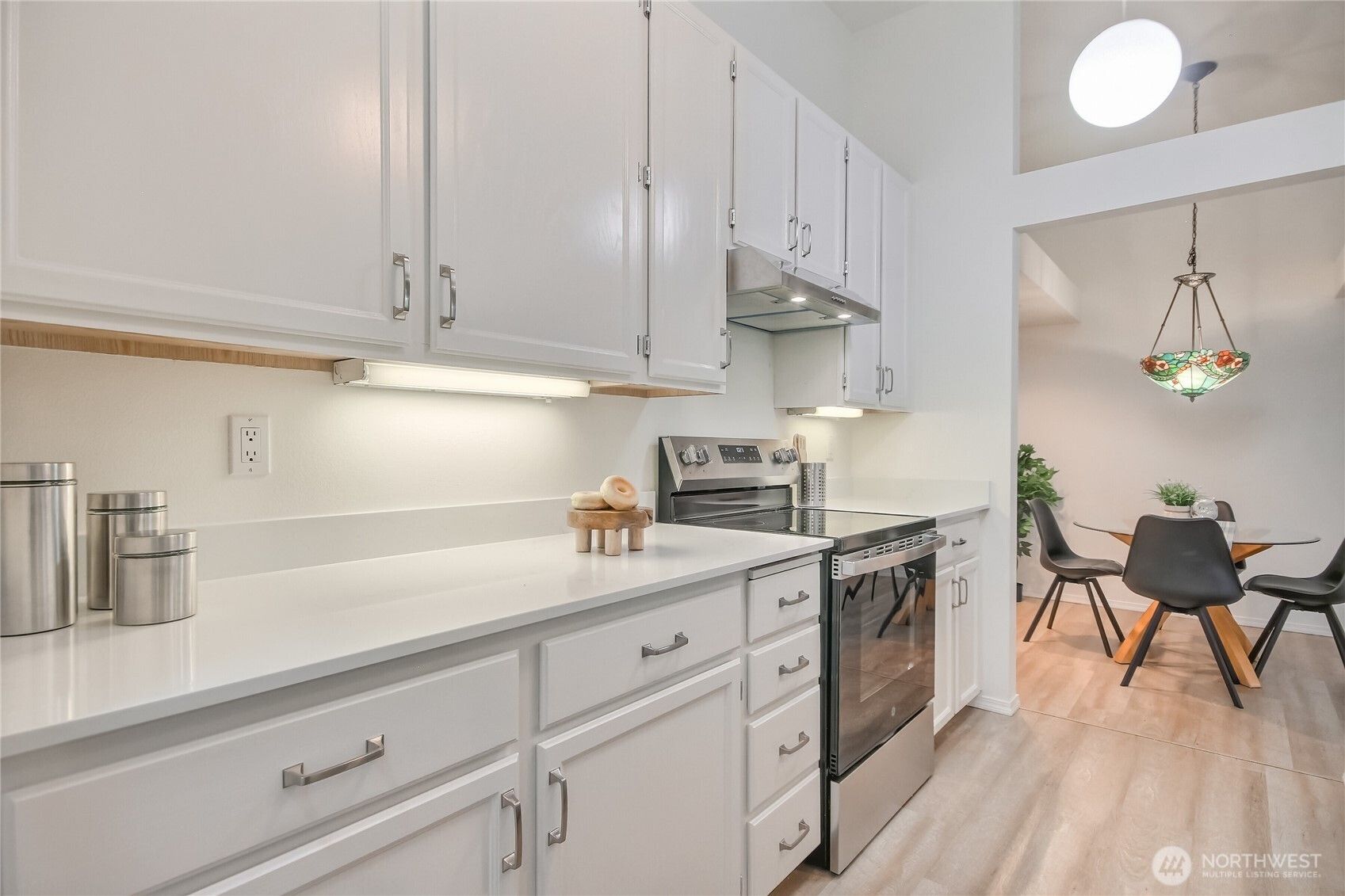 Totally renovated one bedroom condo with modern cohesive color palette. Renovated kitchen with all new stainless appliances, sink & hardware, luxury vinyl plank flooring, open to spacious living room with new carpet, vaulted ceilings and large vinyl windows, formal dining room for entertaining, spacious primary suite with two closets, door to patio, lovely outdoor space to enjoy nature, coffee, dining, and garden. Move in and start enjoying all Providence Point 55 plus active community has to offer. Clubs, games, classes, swimming pool, tennis, pickleball, pea patch, hiking trails, library, 2 full time activities directors, gardeners, maintenance crew, on site HOA, security officers, gated, fenced, 161 landscaped and natural acres to enjoy.