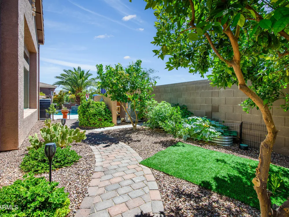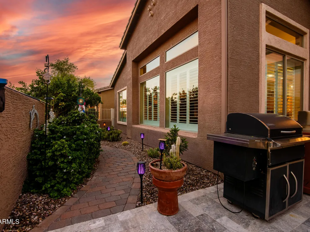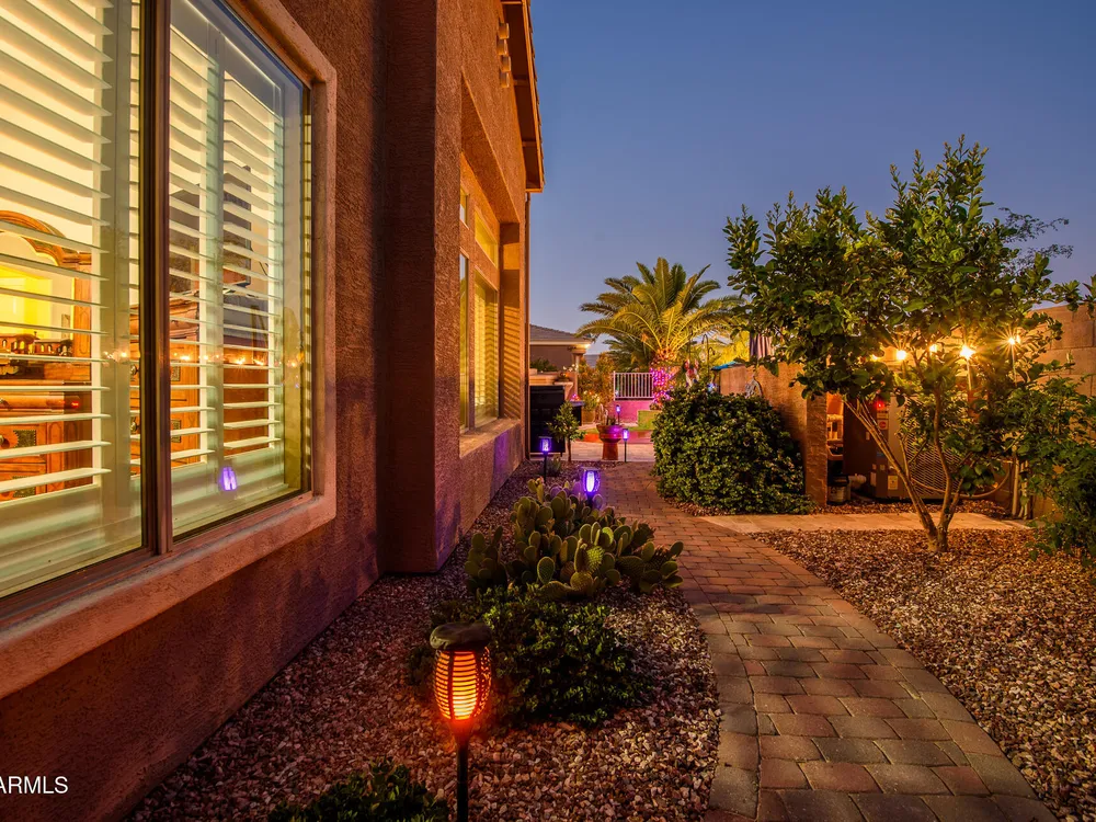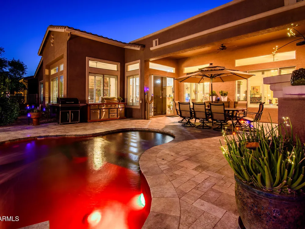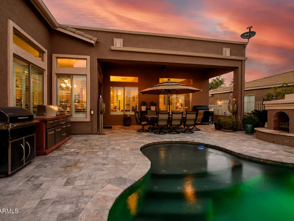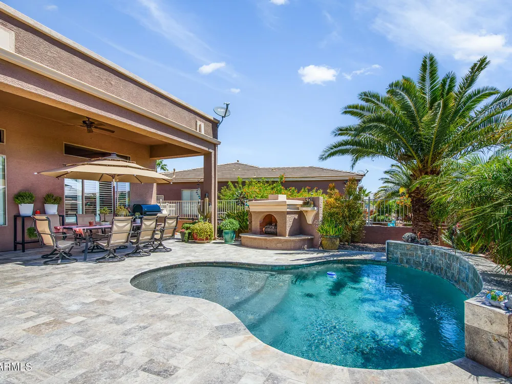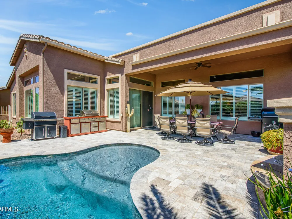 This beautifully designed home in the 55+ Guard-Gated Community of Province will capture your attention from the moment you arrive, with elegant desert landscaping and a welcoming brick-paver courtyard. Inside, soaring 14' ceilings and a decorative entry medallion set the tone for the upscale finishes throughout. The spacious primary suite spans the entire left side of the home and features his and her closets, a glass block walk-in shower, dual sinks, and a garden tub. The gourmet kitchen boasts hickory cabinets, granite countertops, wall ovens, a center island, built-in desk, and a walk-in pantry—all open to the inviting family room with direct access to the backyard. Additional spaces include a formal dining room, a decorative half bath, a versatile den currently used as a bedroom, and a guest bedroom with a private en-suite bath. Step outside to your private backyard oasis with a covered patio, heated and cooled pool, a cozy gas fireplace, and lush landscaping with a desirable south-facing orientation. All of this in the 55+ guard gated lake community of Province; where you can fish in the lakes, walk on one of the 5 miles of walking paths throughout the community, practice your putting, play a game of pickleball or tennis is nothing short of "retiring like you mean it!" To wrap it all up, inside the 32,000 square foot club house, you have a fitness center, lap pool, library, billiards room, ceramic, sewing, and computer center besides the quaint, gorgeous outdoor pool for perfect solitude or fun gatherings with friends and family. Resort-style living at its finest!