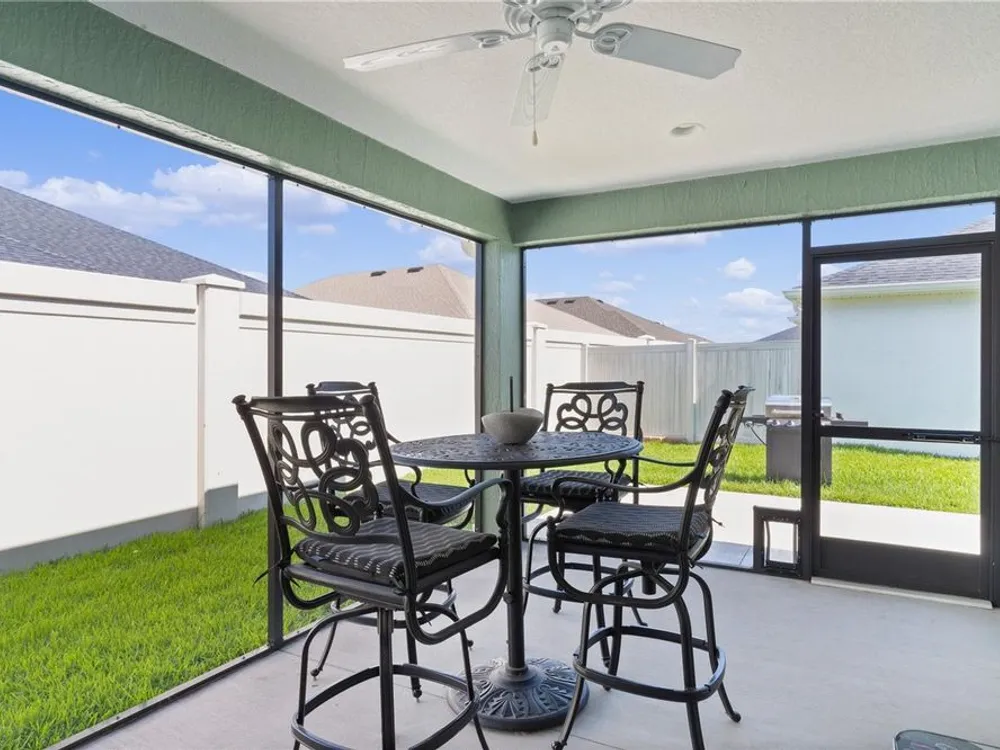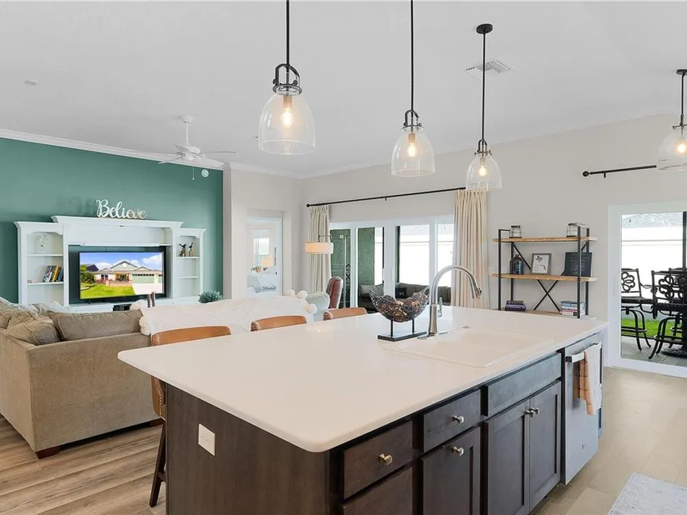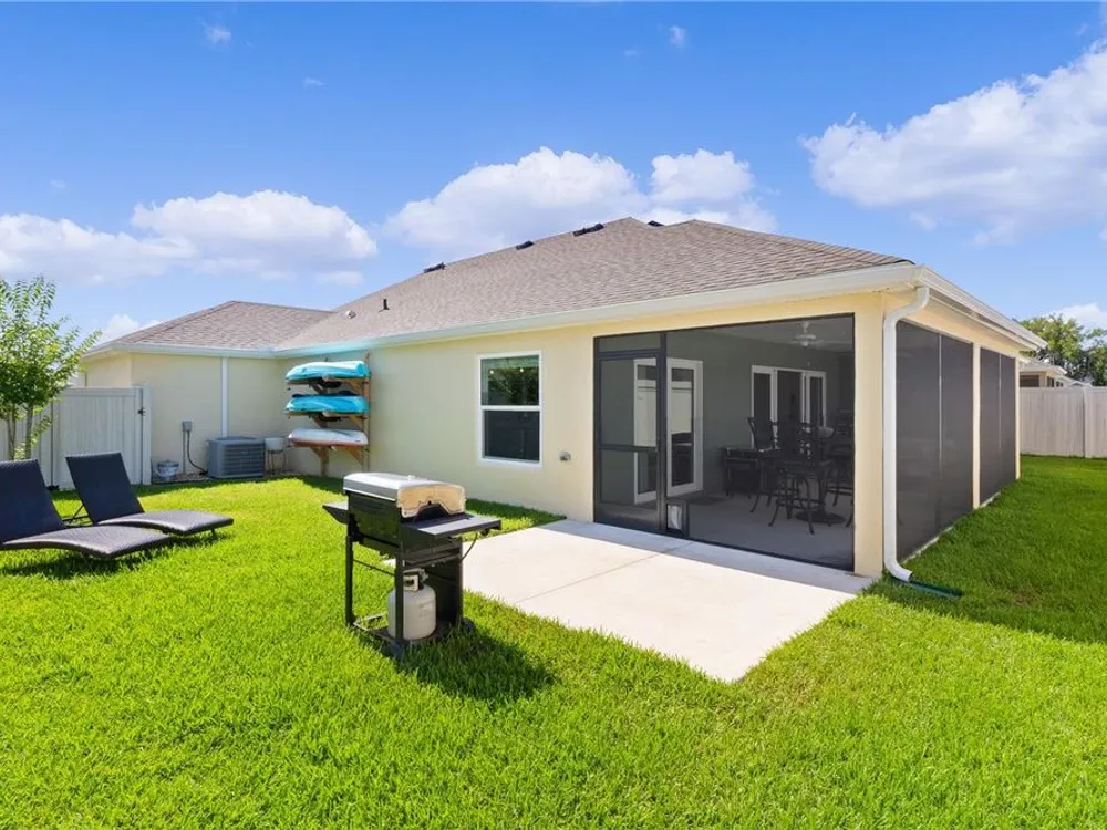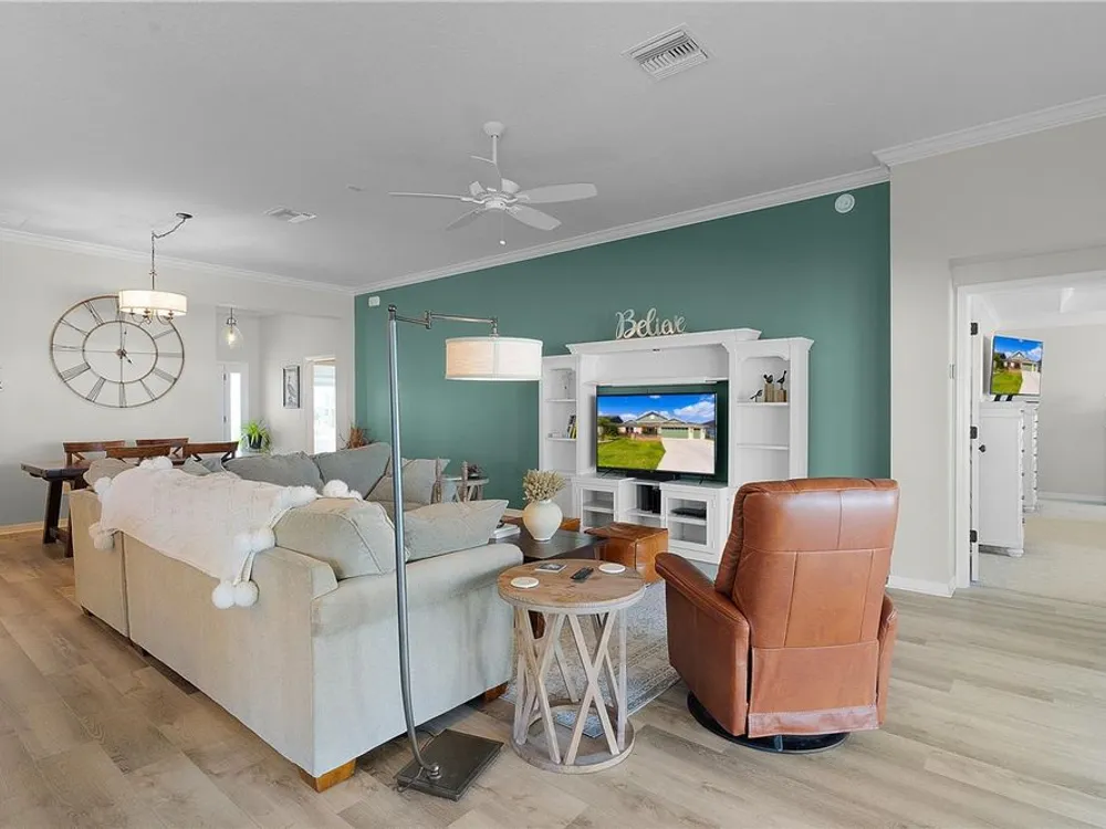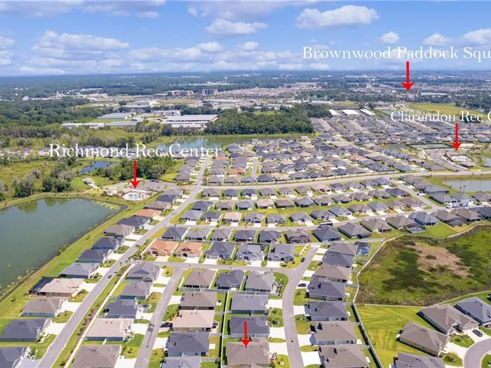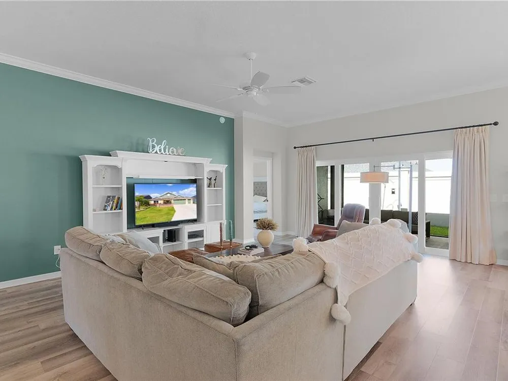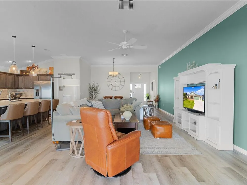 This Isabella Veranda (also known as the Songbird / Zinnia in the Designer Series) comes fully fenced with a privacy wall is located in the Village of Richmond, close to recreation, golf, and Brownwood Paddock Square. Less than 5 minutes by Golf Cart to Brownwood Town Square! Relax on the custom paver patio with iron entry gate to socialize with neighbors and enjoy the sunrise! Inside the home, quartz counters are featured in both the kitchen and baths, along with a basket-weave tile backsplash. The layout includes two bedroom suites, each with a private bathroom and walk-in closet. The primary suite includes dual vanities, a roman shower, and a large walk-in closet. Crown molding runs throughout the entire home, which has been professionally painted in neutral colors. Additional updates include upgraded light fixtures and a whole-house water filtration system. Home is only 3 years old! Mechanicals maintained and serviced regularly. The exterior features professional landscaping, a two-car plus golf cart garage, and pool potential on the side yard! This home combines an updated interior with convenient access to recreation, golf, and entertainment. The Richmond Recreation Center is only .3 miles away and offers an adult pool, shuffleboard, and both large and small dog parks. The Clarendon Recreation Center, with a family pool, is just .5 miles away. Within one mile you’ll also find the Lake Okahumpka Recreation Center, Richmond Pitch and Putt, and the new Harry and the Natives Restaurant. Brownwood Paddock Square is one mile away with shopping, restaurants, and nightly entertainment, just over the Brownwood Bridge on SR44. All major conveniences are at your finger tips! Access to I-75 and FL Turnpike are also only a few minutes away! Start living your retirement dream with everything you need just around the corner!