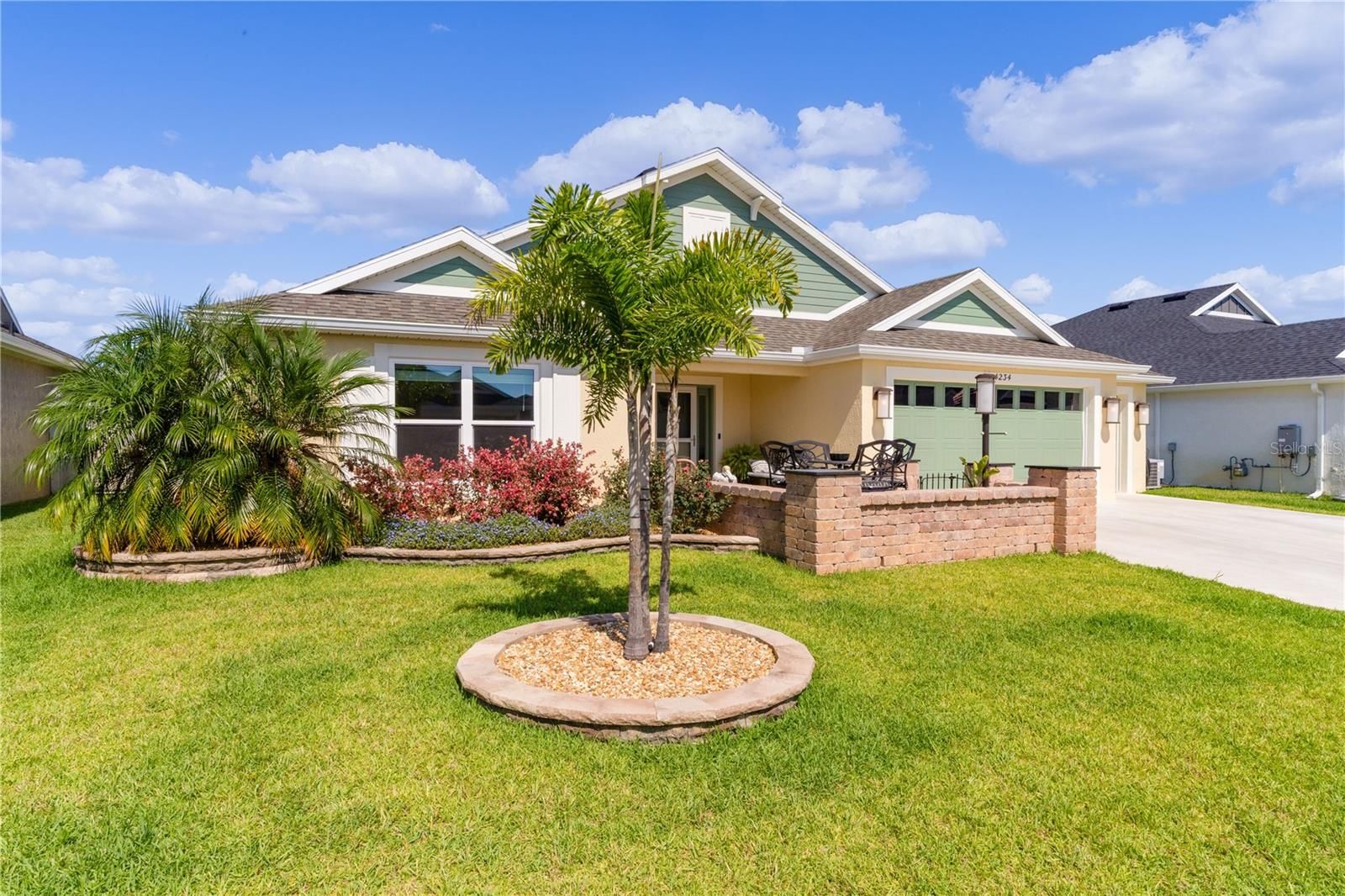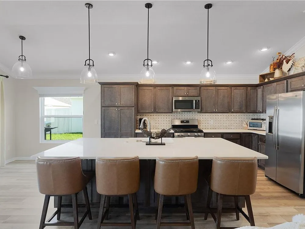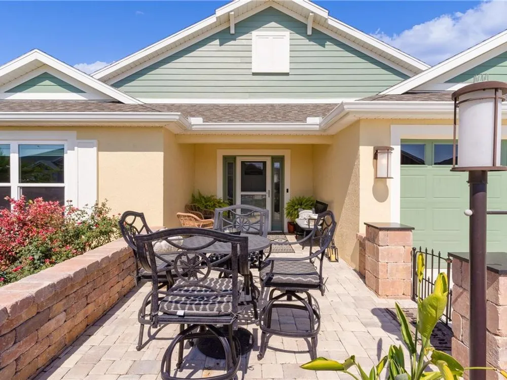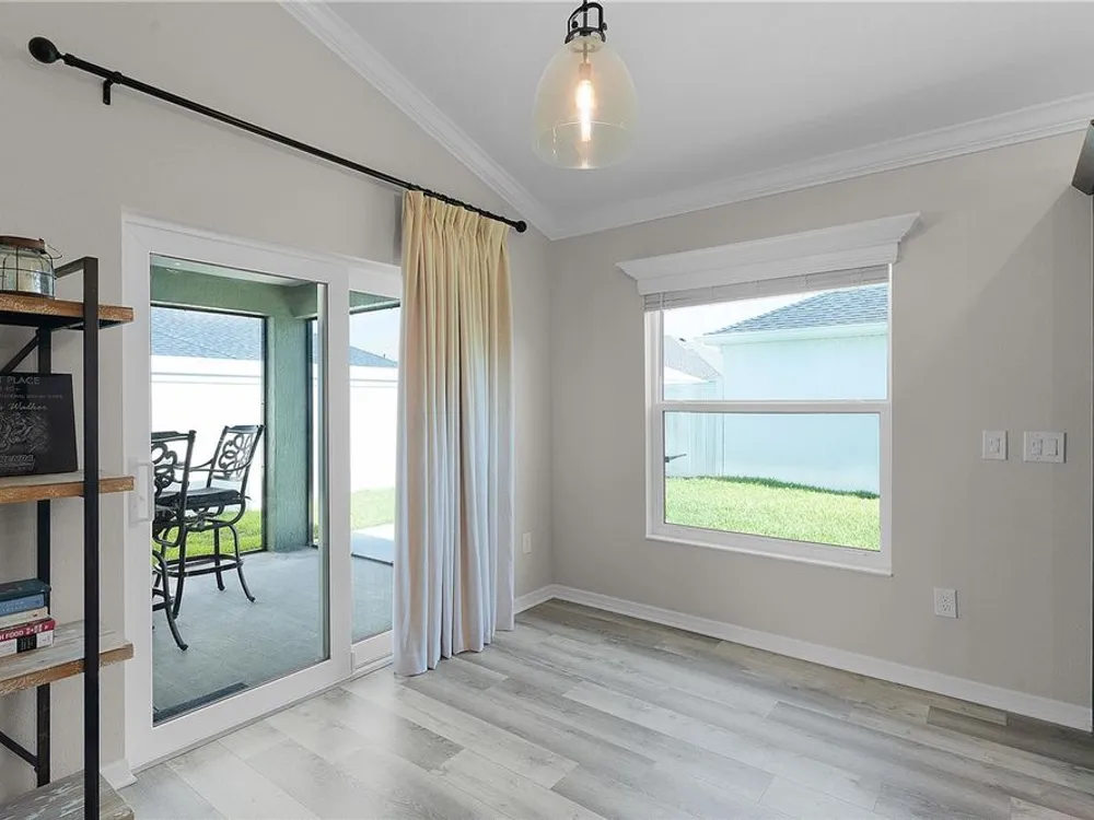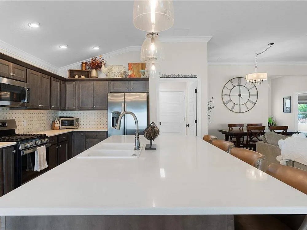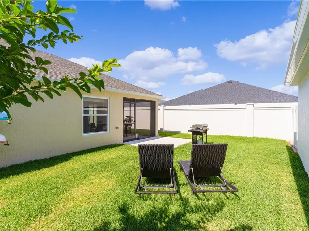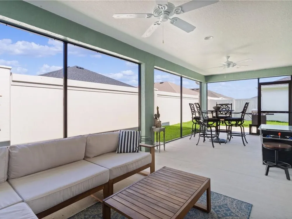 This Isabella Veranda (also known as the Songbird / Zinnia in the Designer Series) comes fully fenced with a privacy wall is located in the Village of Richmond, close to recreation, golf, and Brownwood Paddock Square. Less than 5 minutes by Golf Cart to Brownwood Town Square! Relax on the custom paver patio with iron entry gate to socialize with neighbors and enjoy the sunrise! Inside the home, quartz counters are featured in both the kitchen and baths, along with a basket-weave tile backsplash. The layout includes two bedroom suites, each with a private bathroom and walk-in closet. The primary suite includes dual vanities, a roman shower, and a large walk-in closet. Crown molding runs throughout the entire home, which has been professionally painted in neutral colors. Additional updates include upgraded light fixtures and a whole-house water filtration system. Home is only 3 years old! Mechanicals maintained and serviced regularly. The exterior features professional landscaping, a two-car plus golf cart garage, and pool potential on the side yard! This home combines an updated interior with convenient access to recreation, golf, and entertainment. The Richmond Recreation Center is only .3 miles away and offers an adult pool, shuffleboard, and both large and small dog parks. The Clarendon Recreation Center, with a family pool, is just .5 miles away. Within one mile you’ll also find the Lake Okahumpka Recreation Center, Richmond Pitch and Putt, and the new Harry and the Natives Restaurant. Brownwood Paddock Square is one mile away with shopping, restaurants, and nightly entertainment, just over the Brownwood Bridge on SR44. All major conveniences are at your finger tips! Access to I-75 and FL Turnpike are also only a few minutes away! Start living your retirement dream with everything you need just around the corner!