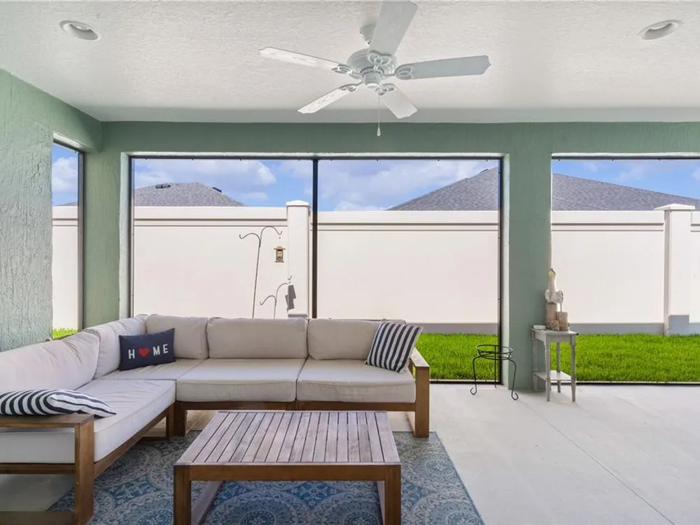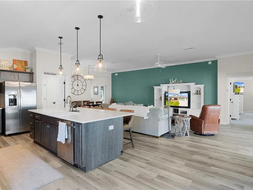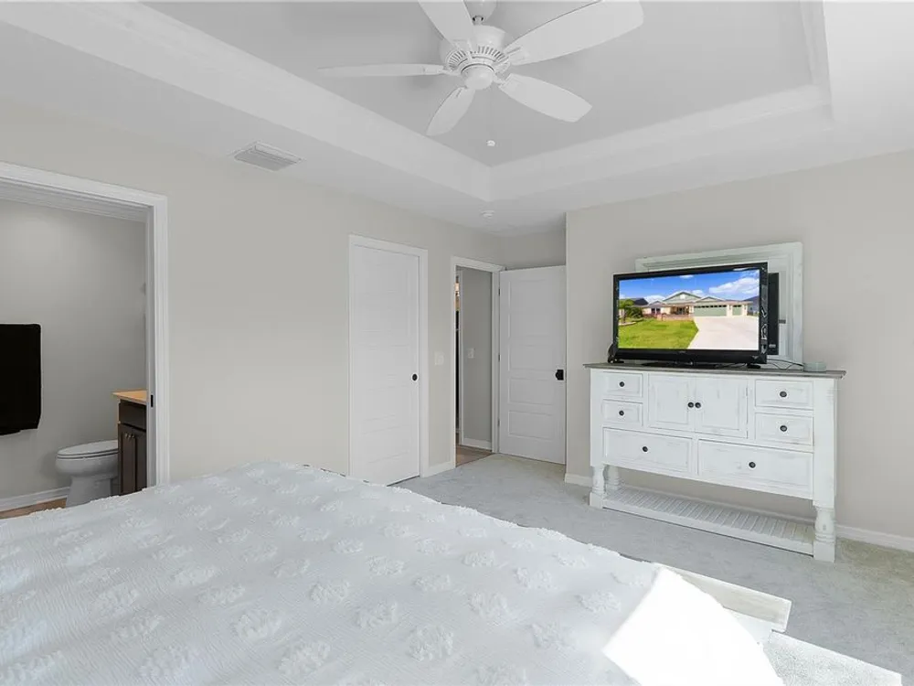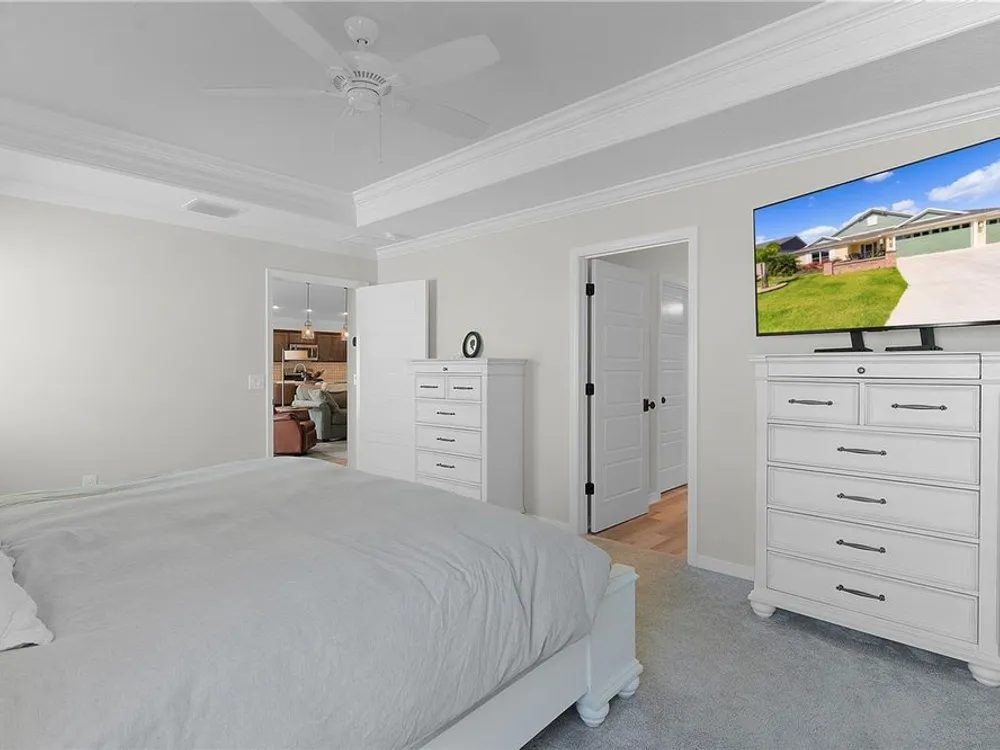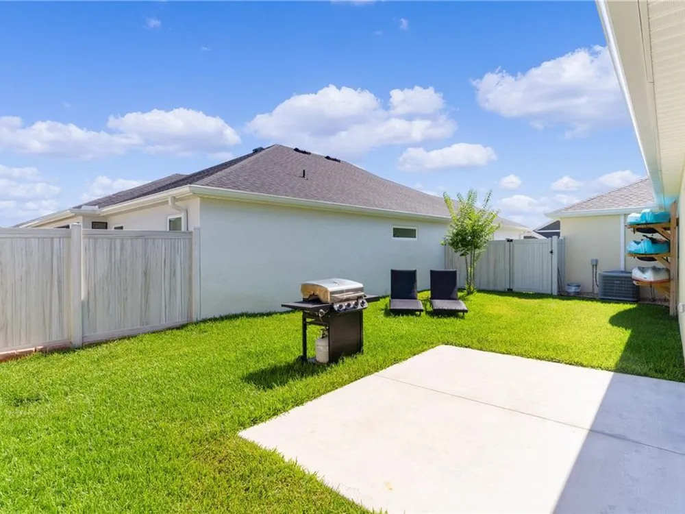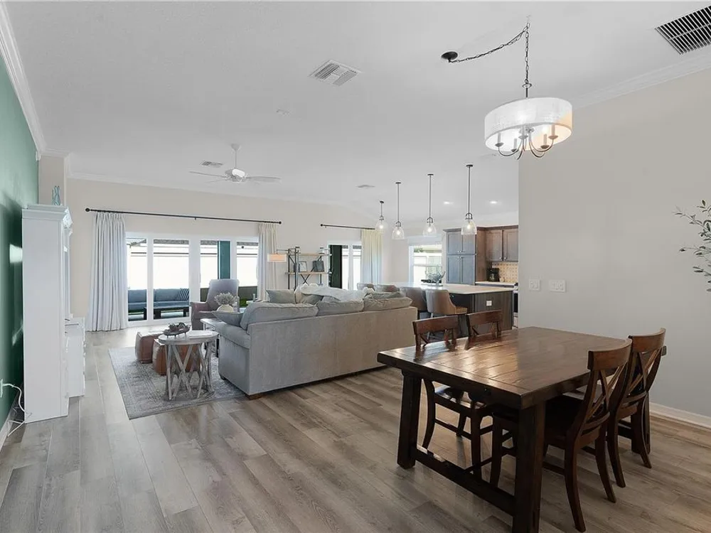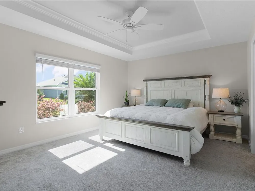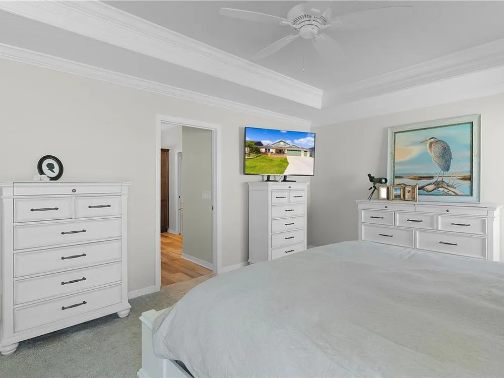 This Isabella Veranda (also known as the Songbird / Zinnia in the Designer Series) comes fully fenced with a privacy wall is located in the Village of Richmond, close to recreation, golf, and Brownwood Paddock Square. Less than 5 minutes by Golf Cart to Brownwood Town Square! Relax on the custom paver patio with iron entry gate to socialize with neighbors and enjoy the sunrise! Inside the home, quartz counters are featured in both the kitchen and baths, along with a basket-weave tile backsplash. The layout includes two bedroom suites, each with a private bathroom and walk-in closet. The primary suite includes dual vanities, a roman shower, and a large walk-in closet. Crown molding runs throughout the entire home, which has been professionally painted in neutral colors. Additional updates include upgraded light fixtures and a whole-house water filtration system. Home is only 3 years old! Mechanicals maintained and serviced regularly. The exterior features professional landscaping, a two-car plus golf cart garage, and pool potential on the side yard! This home combines an updated interior with convenient access to recreation, golf, and entertainment. The Richmond Recreation Center is only .3 miles away and offers an adult pool, shuffleboard, and both large and small dog parks. The Clarendon Recreation Center, with a family pool, is just .5 miles away. Within one mile you’ll also find the Lake Okahumpka Recreation Center, Richmond Pitch and Putt, and the new Harry and the Natives Restaurant. Brownwood Paddock Square is one mile away with shopping, restaurants, and nightly entertainment, just over the Brownwood Bridge on SR44. All major conveniences are at your finger tips! Access to I-75 and FL Turnpike are also only a few minutes away! Start living your retirement dream with everything you need just around the corner!
