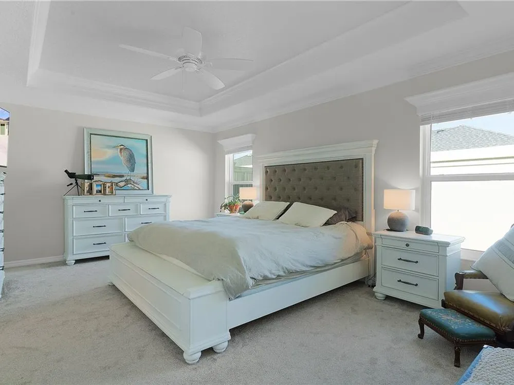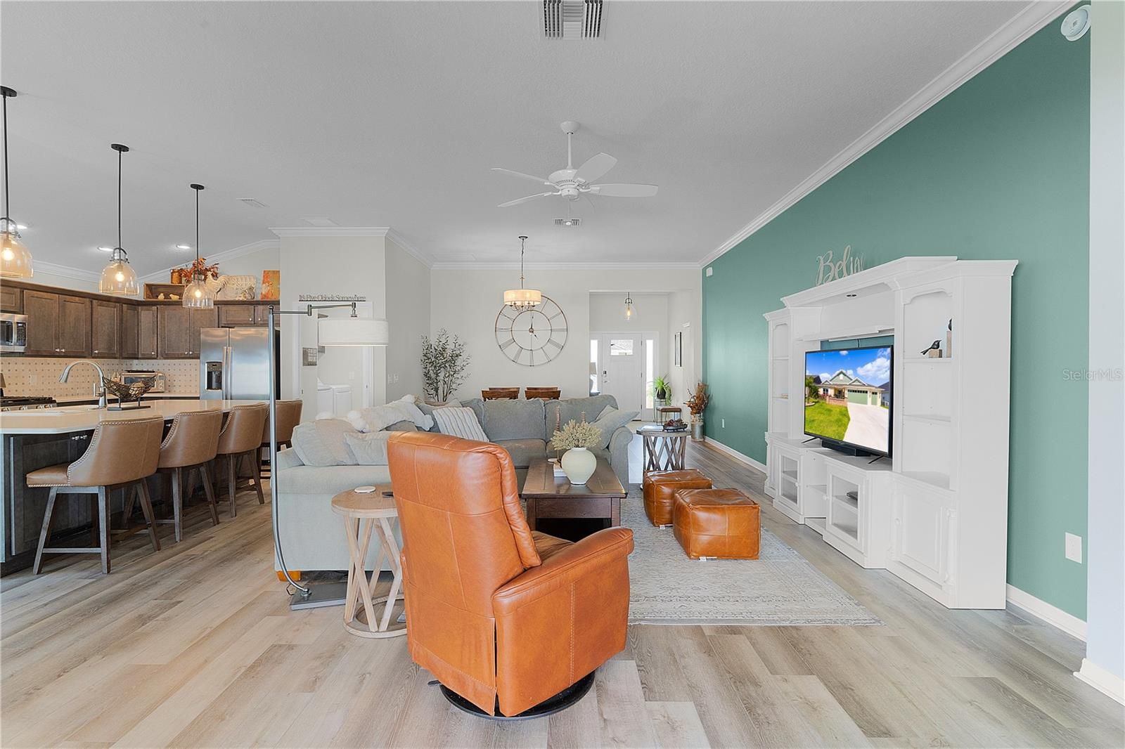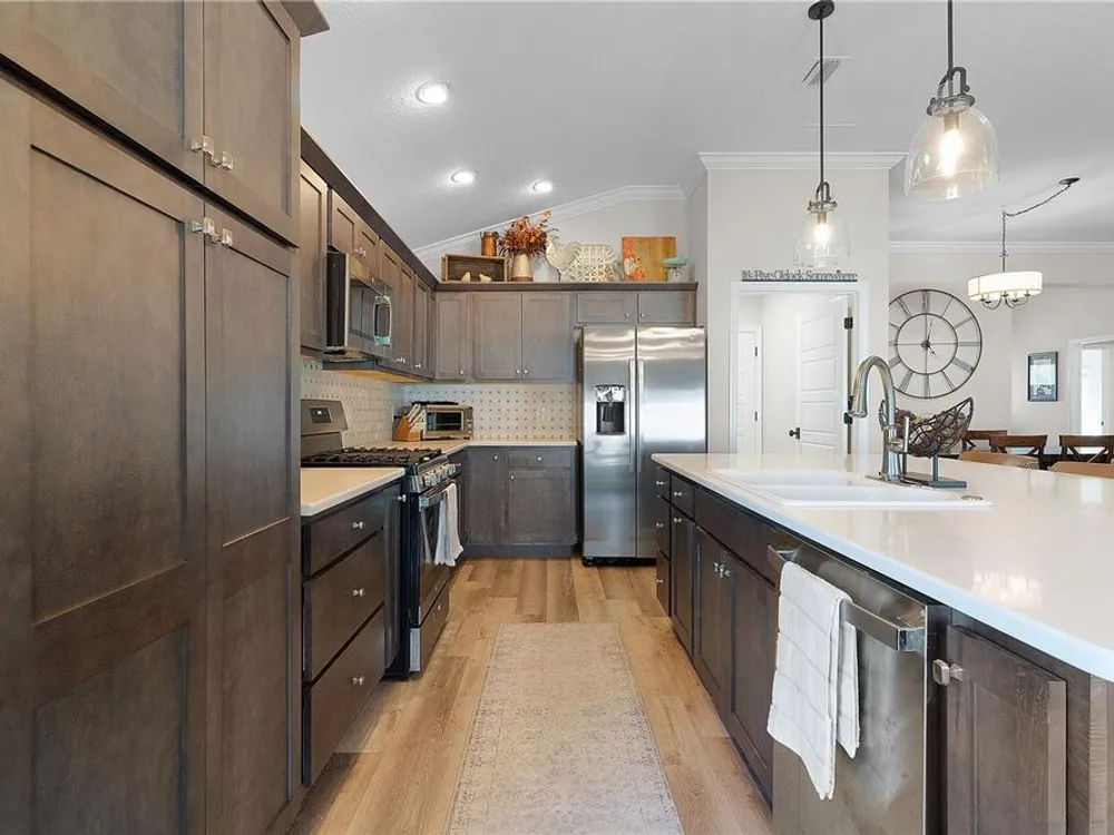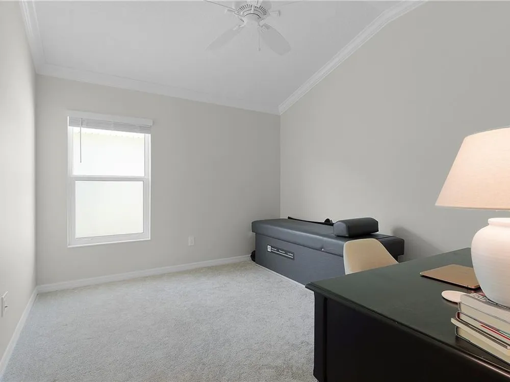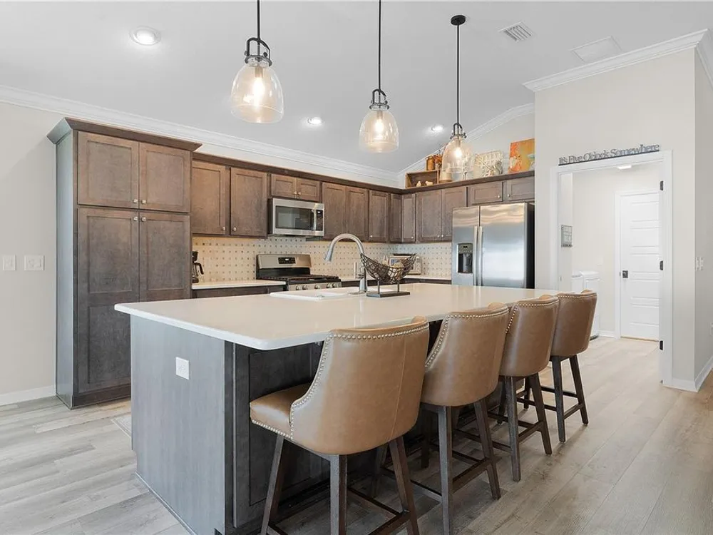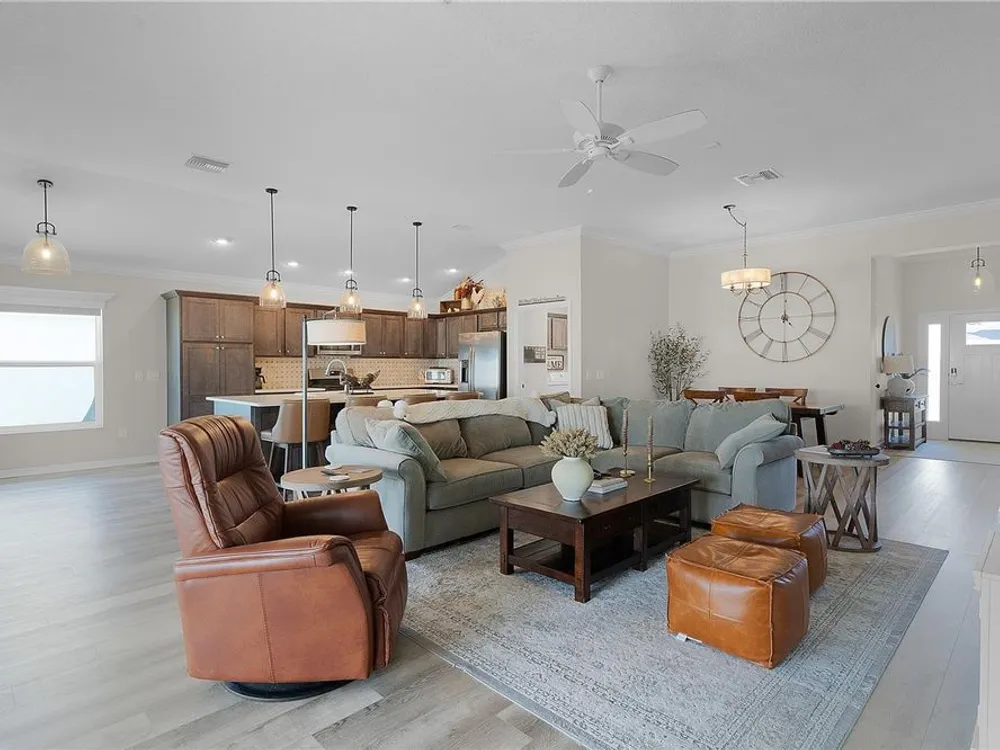 This Isabella Veranda (also known as the Songbird / Zinnia in the Designer Series) comes fully fenced with a privacy wall is located in the Village of Richmond, close to recreation, golf, and Brownwood Paddock Square. Less than 5 minutes by Golf Cart to Brownwood Town Square! Relax on the custom paver patio with iron entry gate to socialize with neighbors and enjoy the sunrise! Inside the home, quartz counters are featured in both the kitchen and baths, along with a basket-weave tile backsplash. The layout includes two bedroom suites, each with a private bathroom and walk-in closet. The primary suite includes dual vanities, a roman shower, and a large walk-in closet. Crown molding runs throughout the entire home, which has been professionally painted in neutral colors. Additional updates include upgraded light fixtures and a whole-house water filtration system. Home is only 3 years old! Mechanicals maintained and serviced regularly. The exterior features professional landscaping, a two-car plus golf cart garage, and pool potential on the side yard! This home combines an updated interior with convenient access to recreation, golf, and entertainment. The Richmond Recreation Center is only .3 miles away and offers an adult pool, shuffleboard, and both large and small dog parks. The Clarendon Recreation Center, with a family pool, is just .5 miles away. Within one mile you’ll also find the Lake Okahumpka Recreation Center, Richmond Pitch and Putt, and the new Harry and the Natives Restaurant. Brownwood Paddock Square is one mile away with shopping, restaurants, and nightly entertainment, just over the Brownwood Bridge on SR44. All major conveniences are at your finger tips! Access to I-75 and FL Turnpike are also only a few minutes away! Start living your retirement dream with everything you need just around the corner!