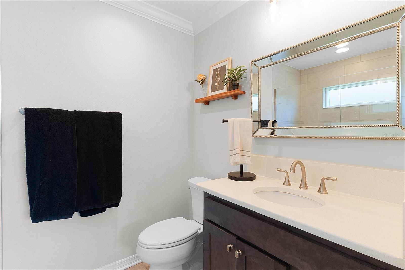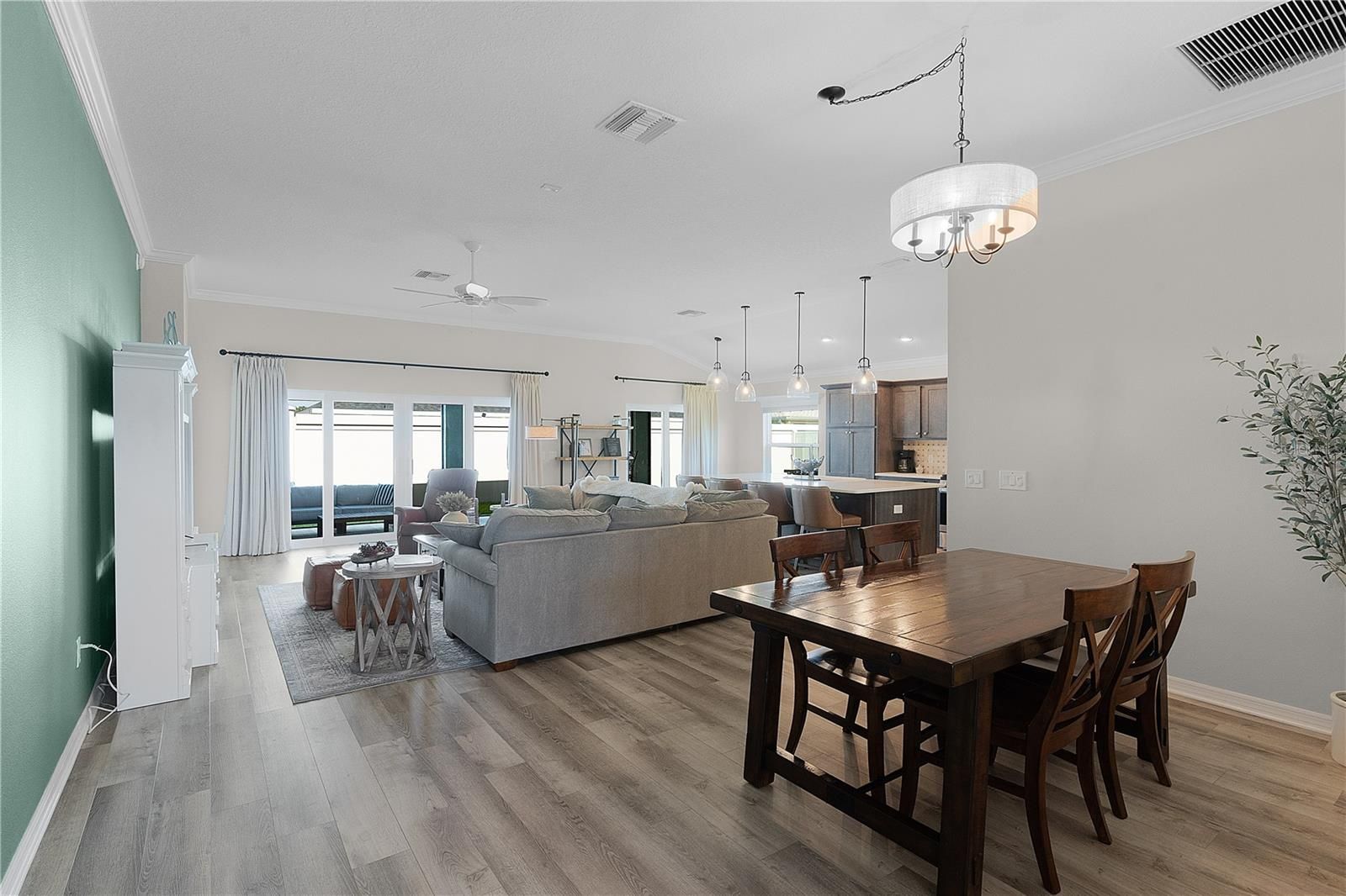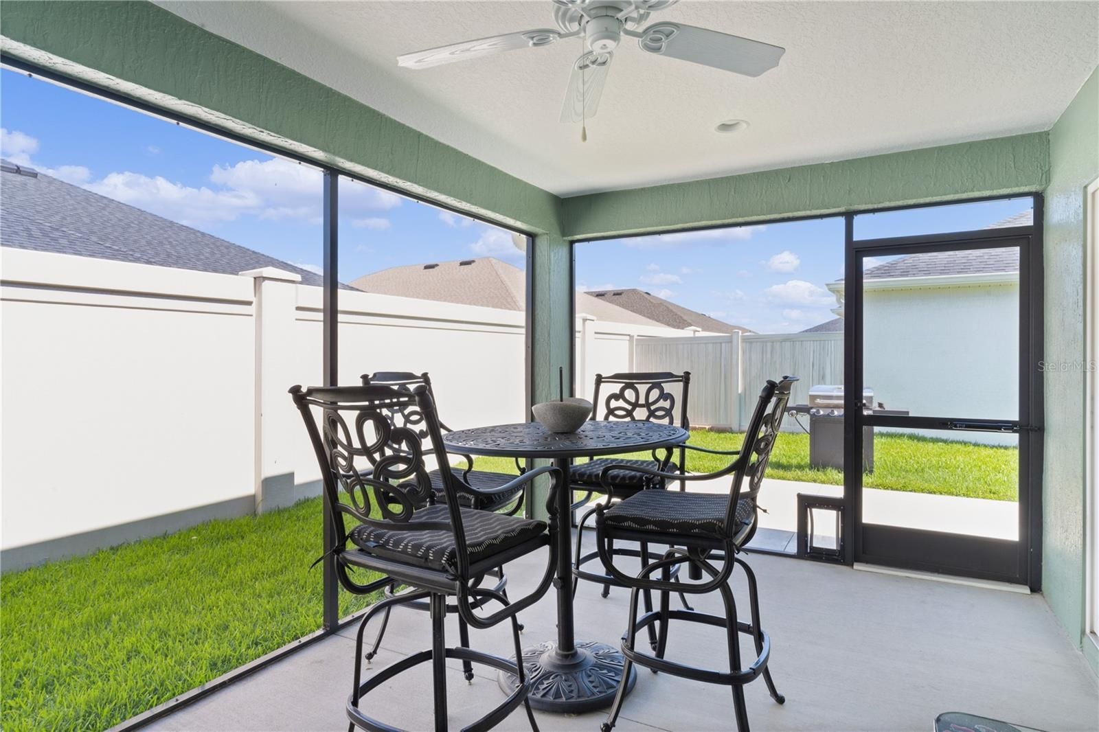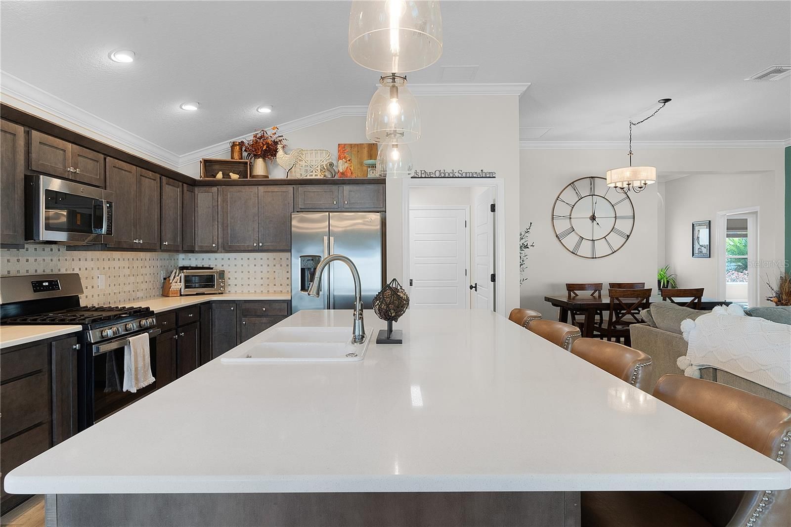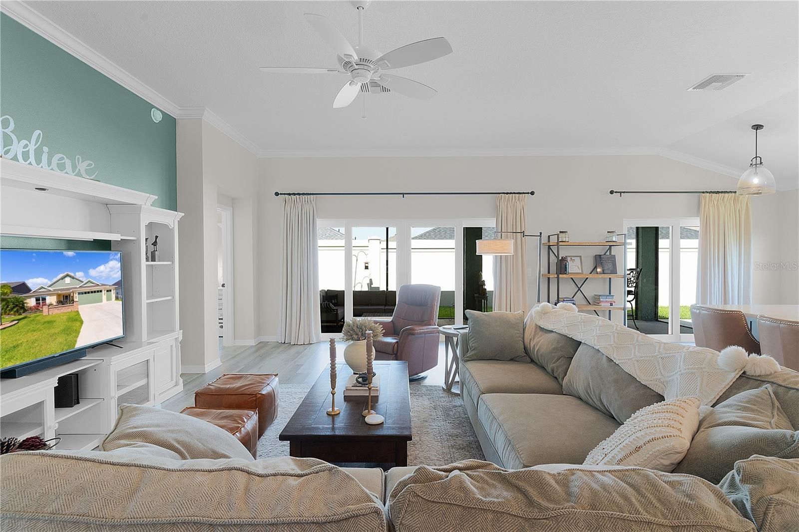 This Isabella Veranda (also known as the Songbird / Zinnia in the Designer Series) comes fully fenced with a privacy wall is located in the Village of Richmond, close to recreation, golf, and Brownwood Paddock Square. Less than 5 minutes by Golf Cart to Brownwood Town Square! Relax on the custom paver patio with iron entry gate to socialize with neighbors and enjoy the sunrise! Inside the home, quartz counters are featured in both the kitchen and baths, along with a basket-weave tile backsplash. The layout includes two bedroom suites, each with a private bathroom and walk-in closet. The primary suite includes dual vanities, a roman shower, and a large walk-in closet. Crown molding runs throughout the entire home, which has been professionally painted in neutral colors. Additional updates include upgraded light fixtures and a whole-house water filtration system. Home is only 3 years old! Mechanicals maintained and serviced regularly. The exterior features professional landscaping, a two-car plus golf cart garage, and pool potential on the side yard! This home combines an updated interior with convenient access to recreation, golf, and entertainment. The Richmond Recreation Center is only .3 miles away and offers an adult pool, shuffleboard, and both large and small dog parks. The Clarendon Recreation Center, with a family pool, is just .5 miles away. Within one mile you’ll also find the Lake Okahumpka Recreation Center, Richmond Pitch and Putt, and the new Harry and the Natives Restaurant. Brownwood Paddock Square is one mile away with shopping, restaurants, and nightly entertainment, just over the Brownwood Bridge on SR44. All major conveniences are at your finger tips! Access to I-75 and FL Turnpike are also only a few minutes away! Start living your retirement dream with everything you need just around the corner!