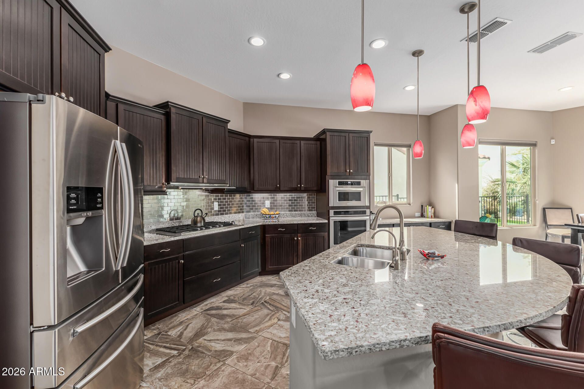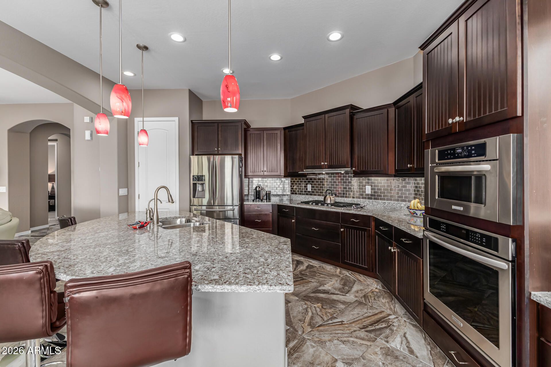Enjoy resort-style living in Sun City Anthem! This Encore Series home on premium lot adjacent to Walker Butte Wash is a dream. Highly upgraded 2BR+den comes FULLY FURNISHED. Chef kitchen features granite countertops, SS appliances, under cabinet lighting, wet bar w/wine frig, bow windows in dining & primary. Luxury backyard retreat has heated pool with baja shelf, stunning sheer descent water/fire feature, bubblers, built-in hot tub with spillway. Covered patio with shades, travertine decking & built in firepit are the perfect relaxation spot. Beautifully appointed primary offers custom walk-in shower, double sink vanity, & walk-in closet. Expanded laundry w/sink has loads of storage; the insulated garage is finished with epoxy flooring. This home is a MUST SEE! Upgrades include hard-wired surround sound with speakers in great room & patio; built-in media cabinet & dimmable recessed lighting; Solid core doors & interior walls insulated for sound; Custom Hunter Douglas top-down/bottom-up shades; soft water plumbing loop; tankless hot water heater, soft water plumbing loop system, RO system in kitchen; high-end cabinets with crown molding, dovetail soft close doors; additional outlets above kitchen cabinets; slide-out vent hood; French doors in primary and den; gas BBQ stub out. EZ-go golf cart with lithium batteries may be negotiable.