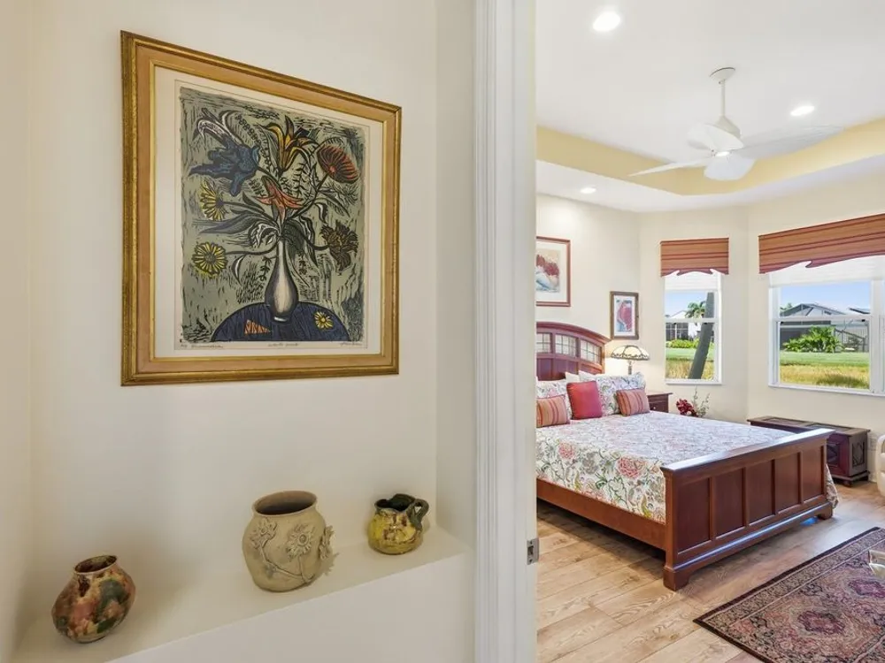 - Built-in Features, Ceiling Fan(s), Crown Molding, Eat-in Kitchen, High Ceilings, Living/Dining Room, Open Floorplan, Main Level Primary, Solid Surface Counters, Solid-Wood Cabinets, Split Bedrooms, Stone Counters, Thermostat, Walk-In Closet(s), Window Treatments