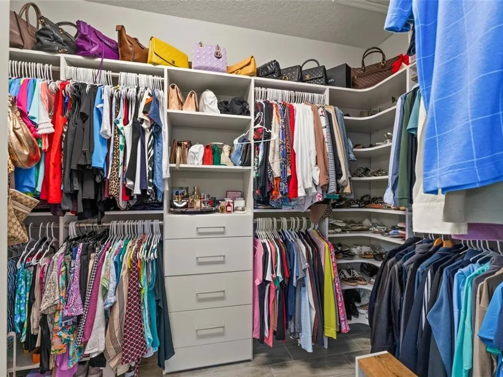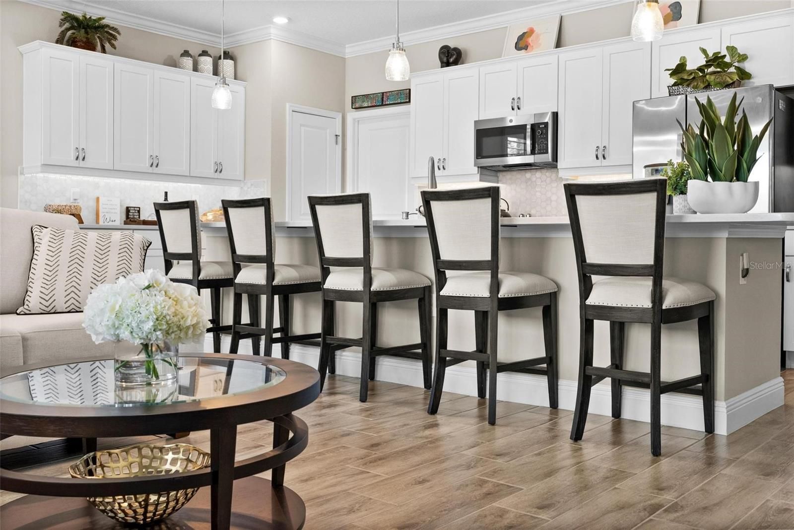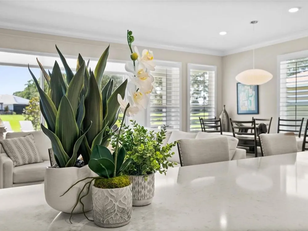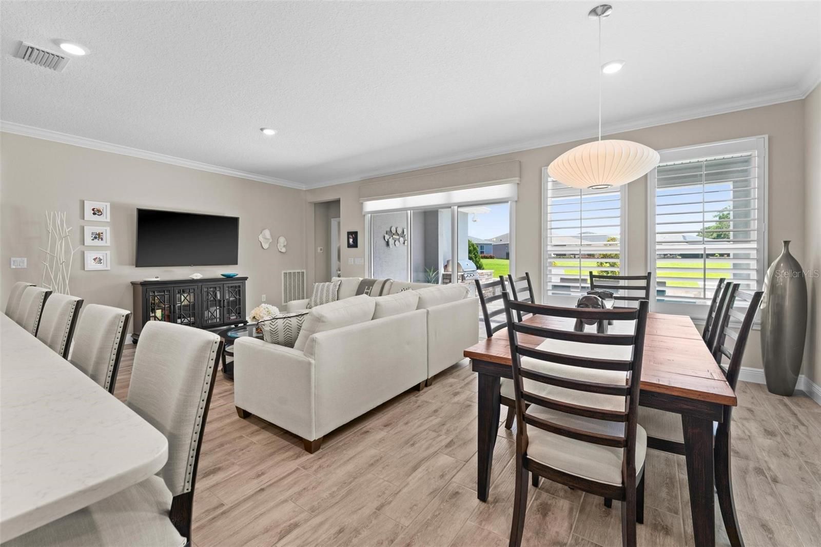 - Built-in Features, Ceiling Fan(s), Crown Molding, Eat-in Kitchen, High Ceilings, Kitchen/Family Room Combo, Living/Dining Room, Open Floorplan, Main Level Primary, Smart Home, Solid Surface Counters, Split Bedrooms, Stone Counters, Thermostat, Tray Ceiling(s), Walk-In Closet(s), Window Treatments