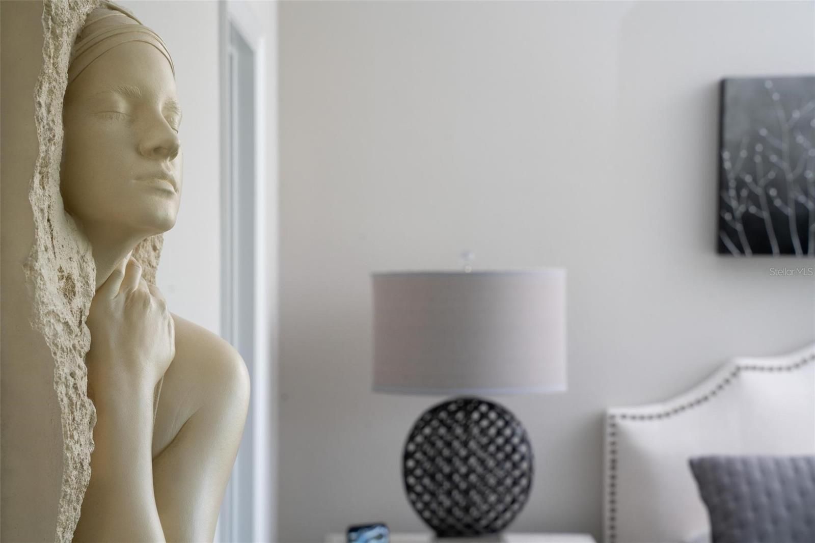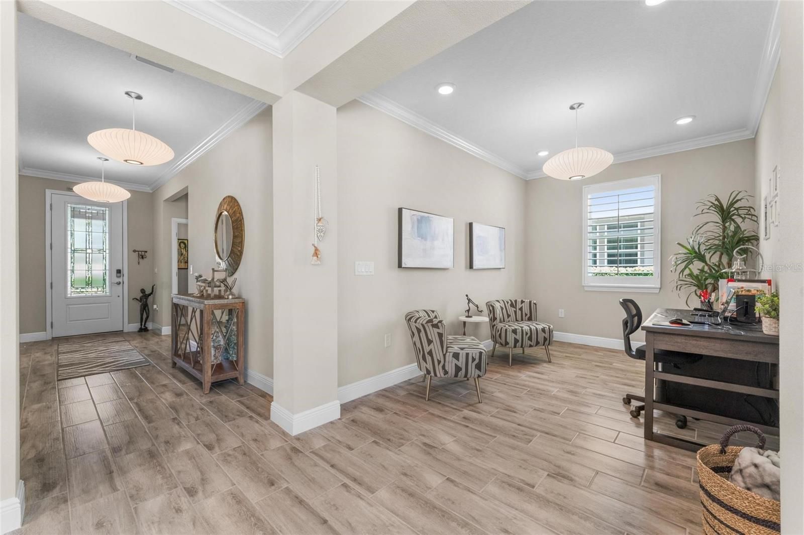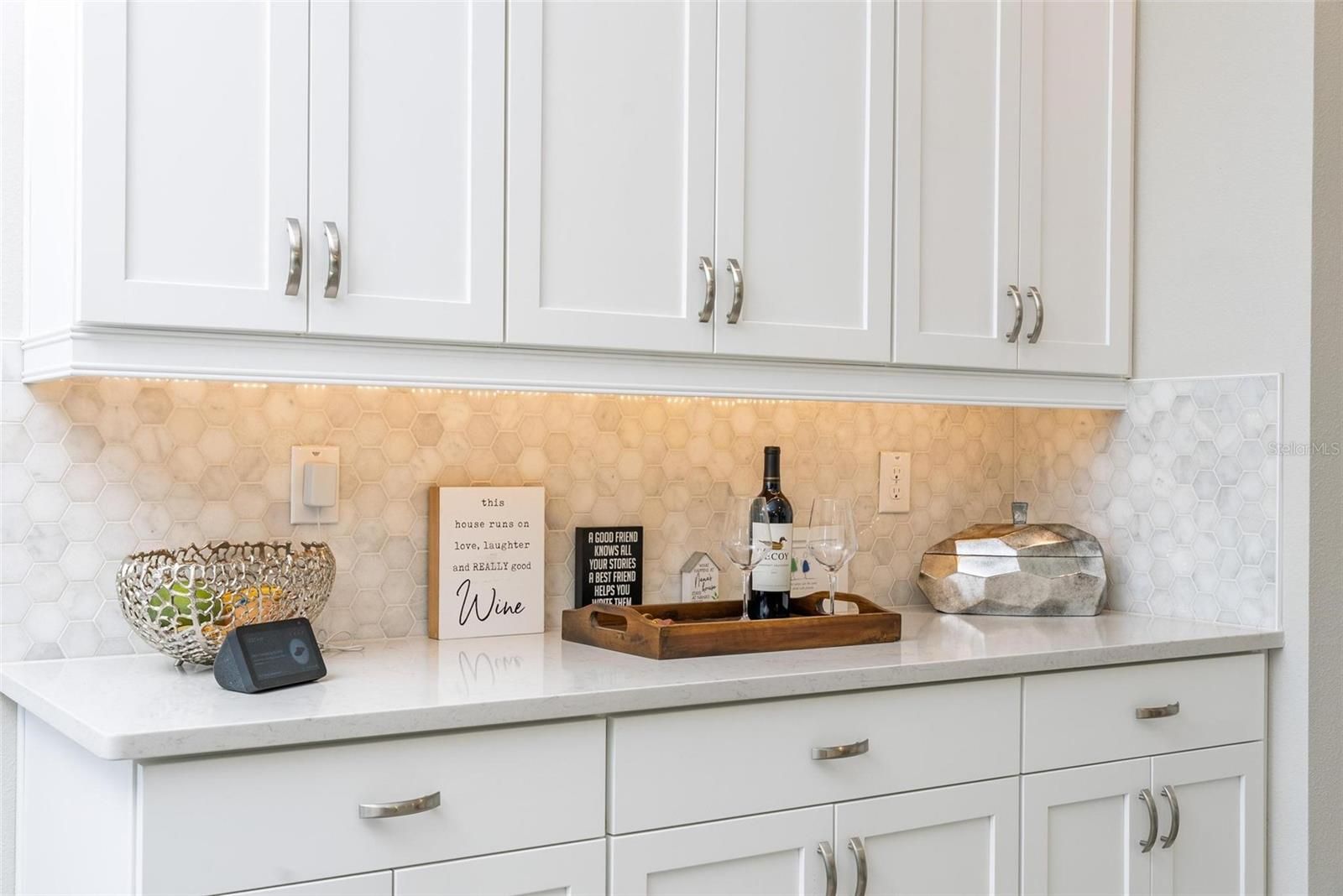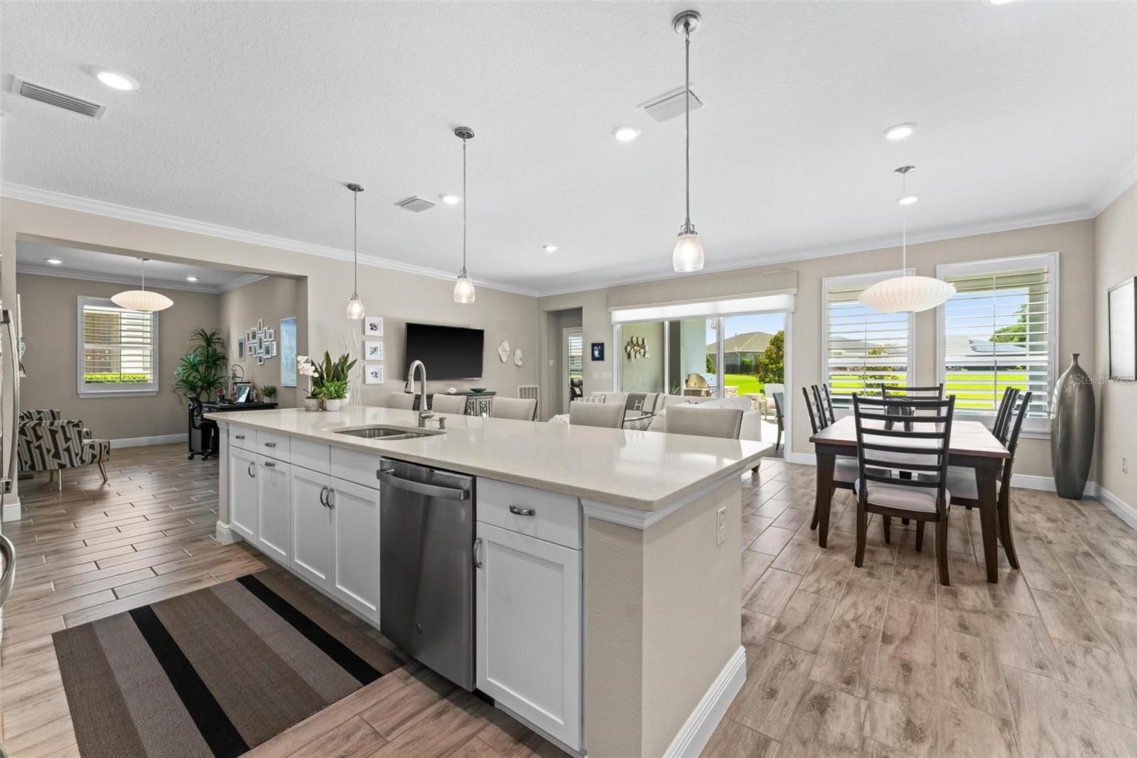 - Built-in Features, Ceiling Fan(s), Crown Molding, Eat-in Kitchen, High Ceilings, Kitchen/Family Room Combo, Living/Dining Room, Open Floorplan, Main Level Primary, Smart Home, Solid Surface Counters, Split Bedrooms, Stone Counters, Thermostat, Tray Ceiling(s), Walk-In Closet(s), Window Treatments