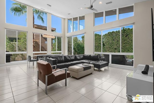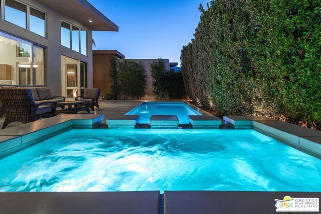Set within the gated community of Escena, this Toll Brothers Brizo model blends architectural intent with everyday livability. Designed with mid-century influence and a modern sensibility, it features clean lines, ceilings rising to 16 feet, and walls of glass that bring light deep into the home. The open layout connects the kitchen, dining, and living areas in one effortless flow. Generous volume, natural light, and simple detailing create a sense of calm and clarity throughout. A true three-bedroom plan offers flexibility rare for the neighborhood, with the third bedroom suited for guests or a home office. Lush, established landscaping surrounds the home, where tall hedges frame a 30-foot saltwater pool and integrated spa with cascading water feature. Mountain glimpses, a mounted outdoor TV, and thoughtful outdoor design make the backyard ideal for quiet mornings or evening entertaining. The primary suite opens directly to the pool and spa, while a private entry courtyard frames striking western mountain views. Residents of Escena enjoy a gated environment of desert-modern architecture with low HOA fees, a newly remodeled clubhouse and grill, walkable streets, a community "Bark Park," and access to some of Palm Springs' most admired mountain and golf course views.