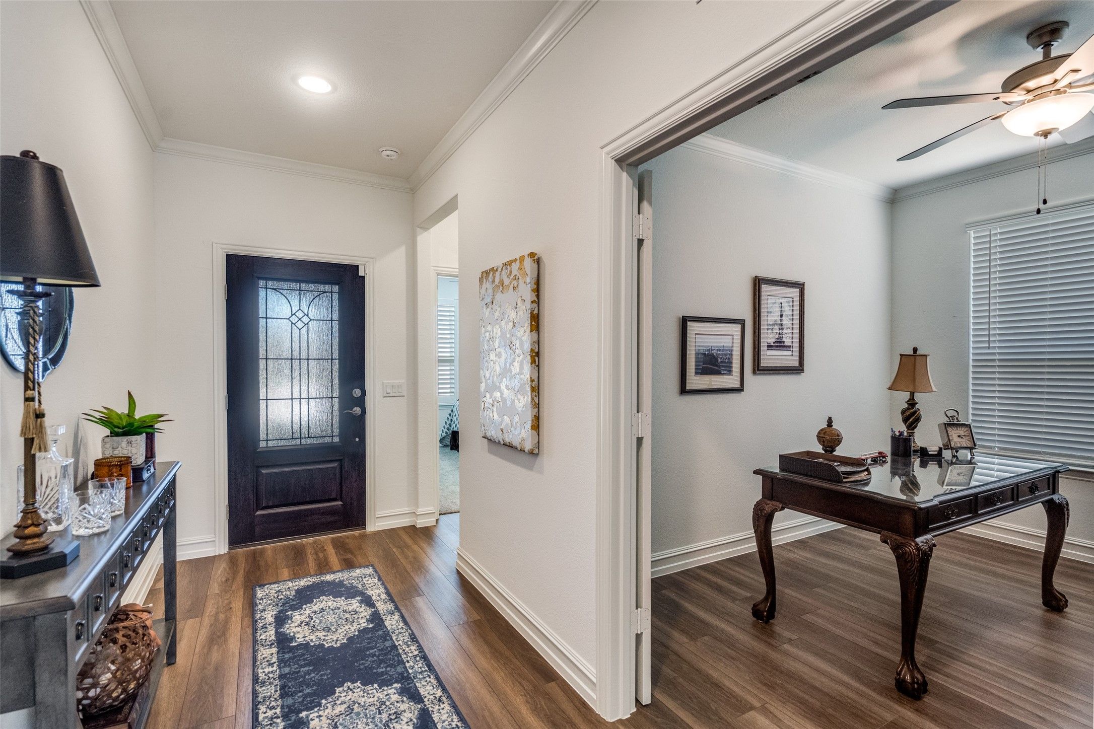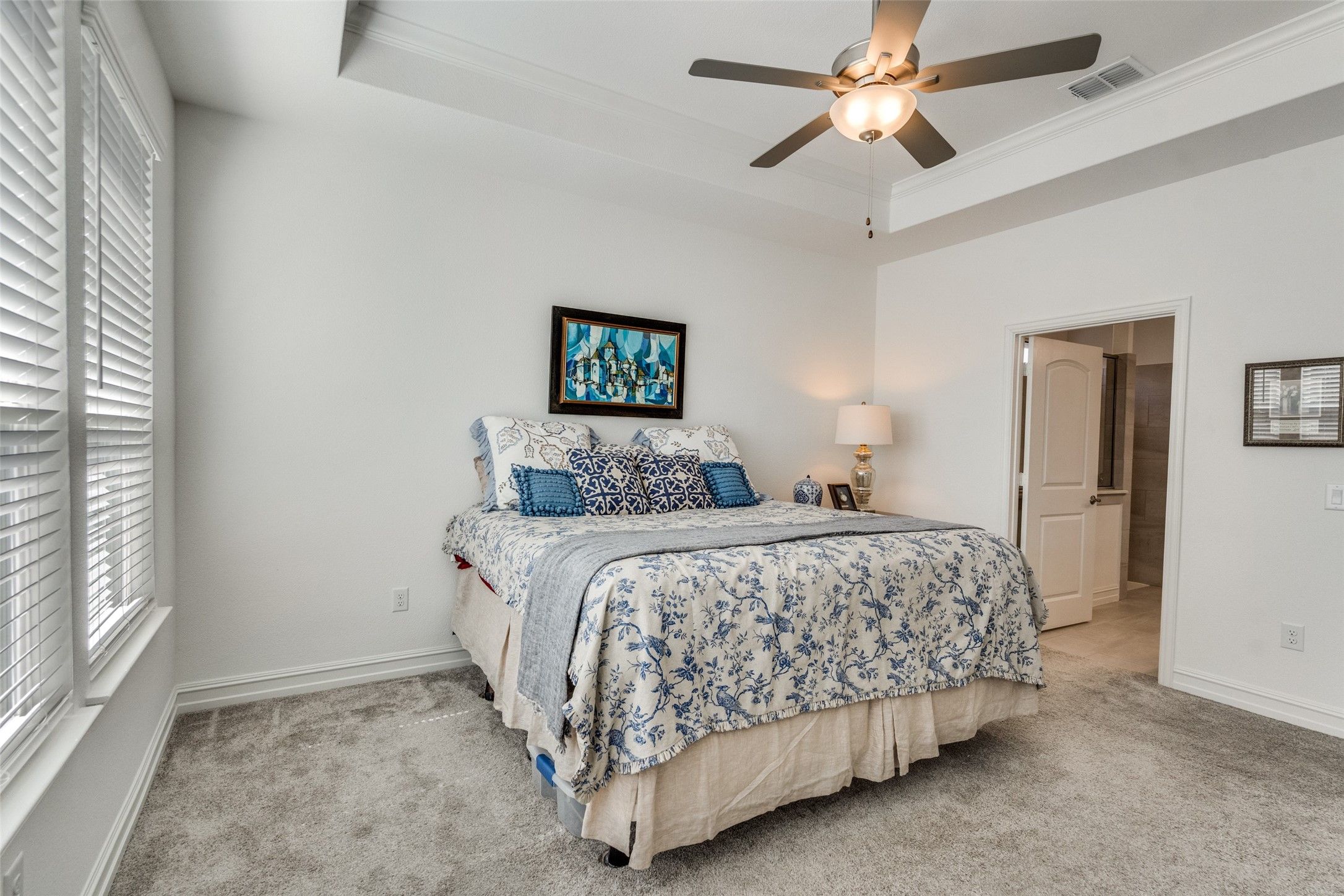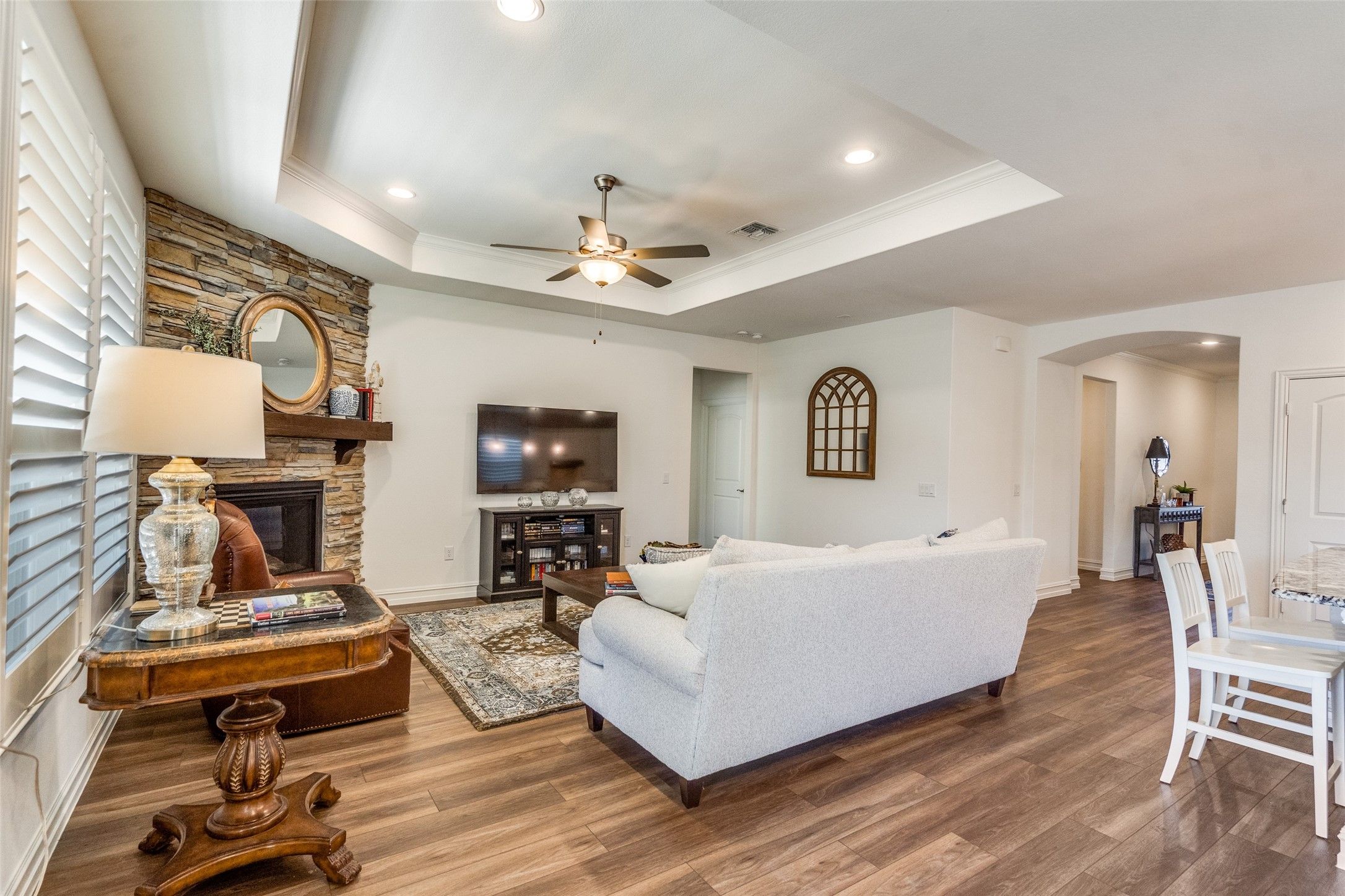 Move-in ready and beautifully upgraded Abbeyville floor plan in the highly sought-after 55+ section of Trinity Falls is truly a showstopper and far from the standard. Thoughtfully selected builder upgrades and enhancements throughout set this home apart. A large covered front porch welcomes you into a meticulously maintained interior featuring wood-look flooring, crown molding, plantation shutters and upgraded tray ceilings in both the living room and primary suite. The fantastic split-bedroom layout offers privacy for guests with a spacious secondary bedroom, upgraded full bath featuring a walk-in shower (no tub) and a private study with French doors—ideal for a home office or flex space. The open-concept living room showcases a striking stone fireplace—an uncommon and highly desirable feature in this floor plan—creating a warm and inviting focal point. The space flows seamlessly into the chef’s kitchen, complete with a large granite island with breakfast bar seating, ample cabinetry, generous counter space and a dedicated dining area—perfect for everyday living and entertaining. The primary suite is a relaxing retreat with a tray ceiling and a spacious ensuite bath featuring dual sinks, a walk-in shower with bench seating and a well-appointed walk-in closet. Additional highlights include a functional mudroom with builder-upgraded mud bench just off the garage entry plus an extra storage closet that can serve as a second pantry. The garage has been upgraded with epoxy flooring and custom wall storage with shelving and overhead racks, offering a clean, organized and highly functional space. Located in Del Webb at Trinity Falls, residents enjoy exclusive 55+ amenities along with resort-style pools, pickleball courts, scenic walking trails, fishing ponds and a clubhouse with a state-of-the-art fitness center creating a vibrant and active lifestyle. If you're looking to downsize without sacrificing luxury, comfort or community—this is the home you’ve been waiting for.