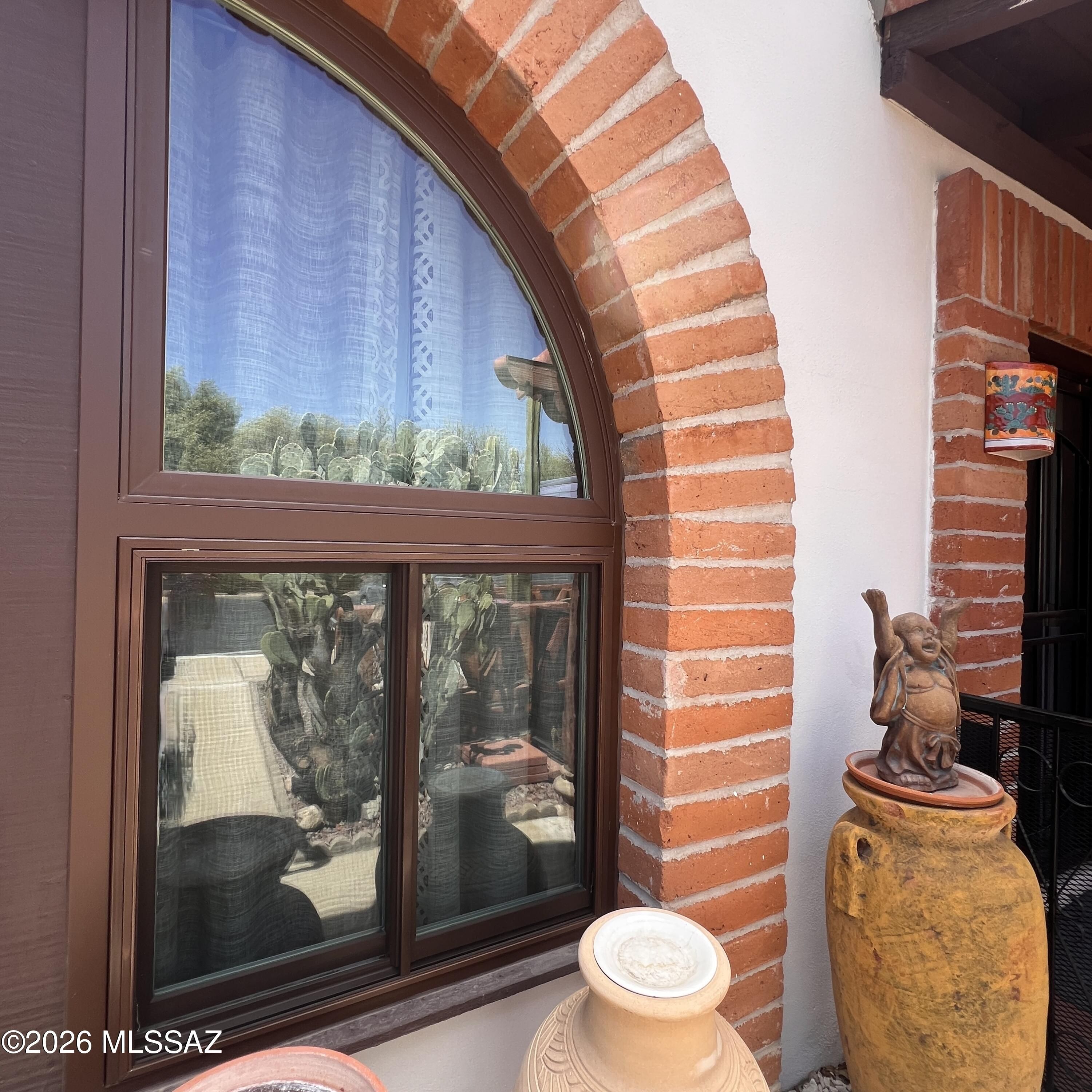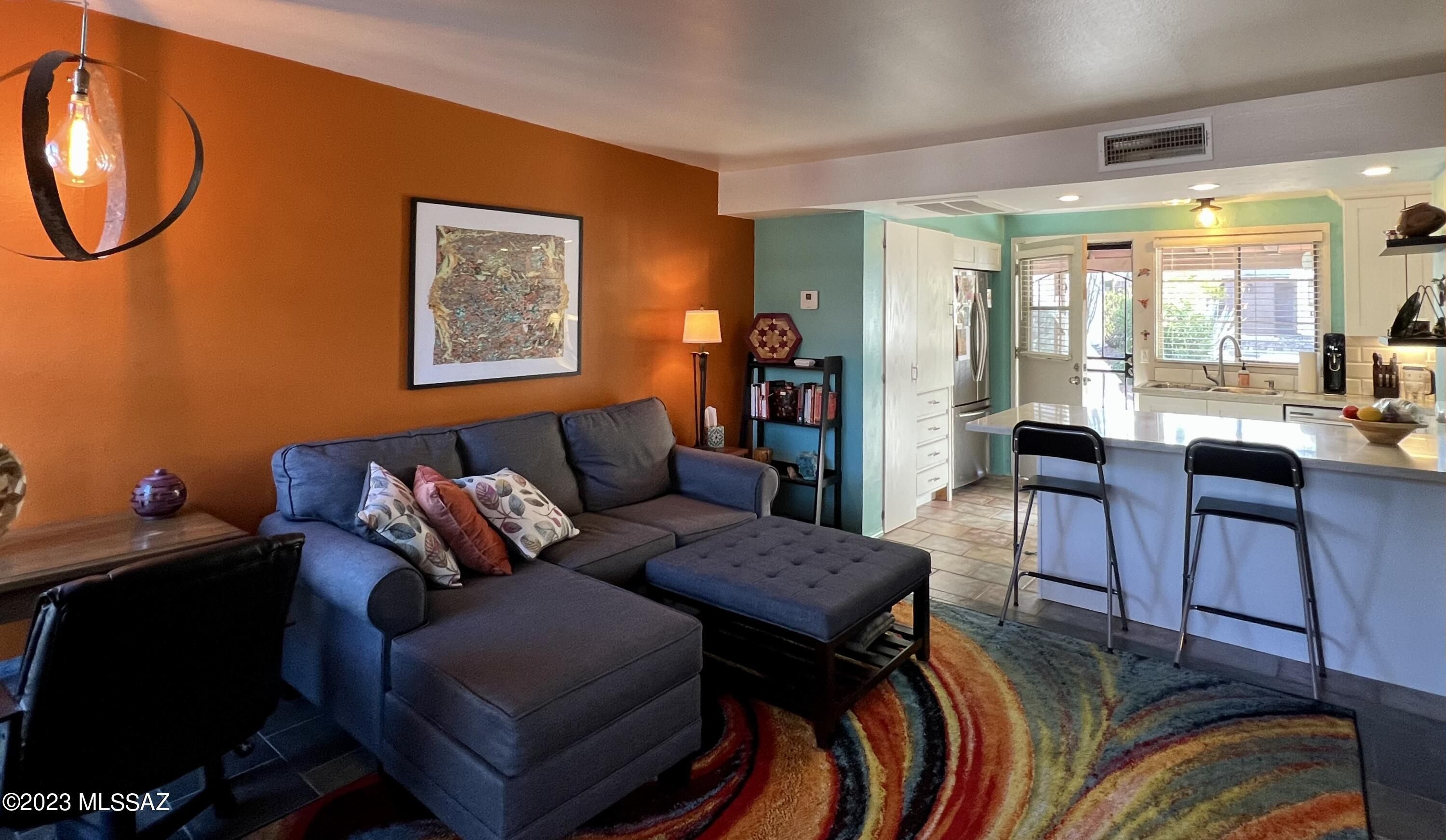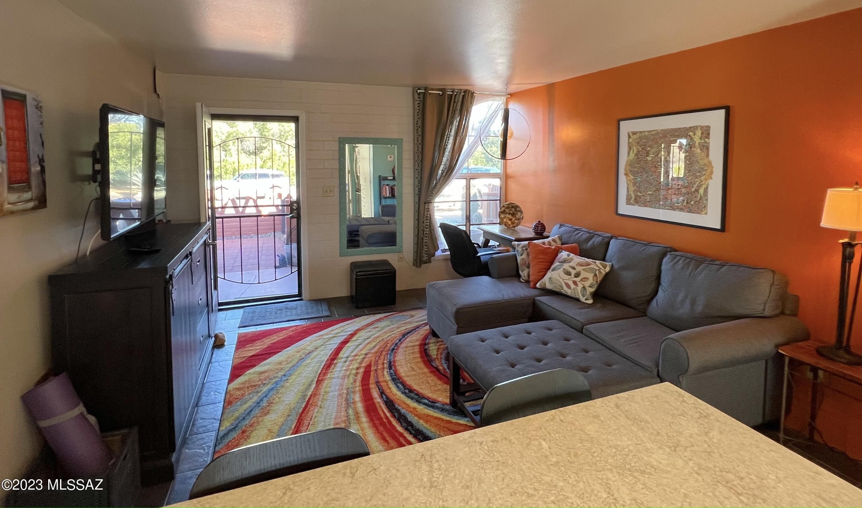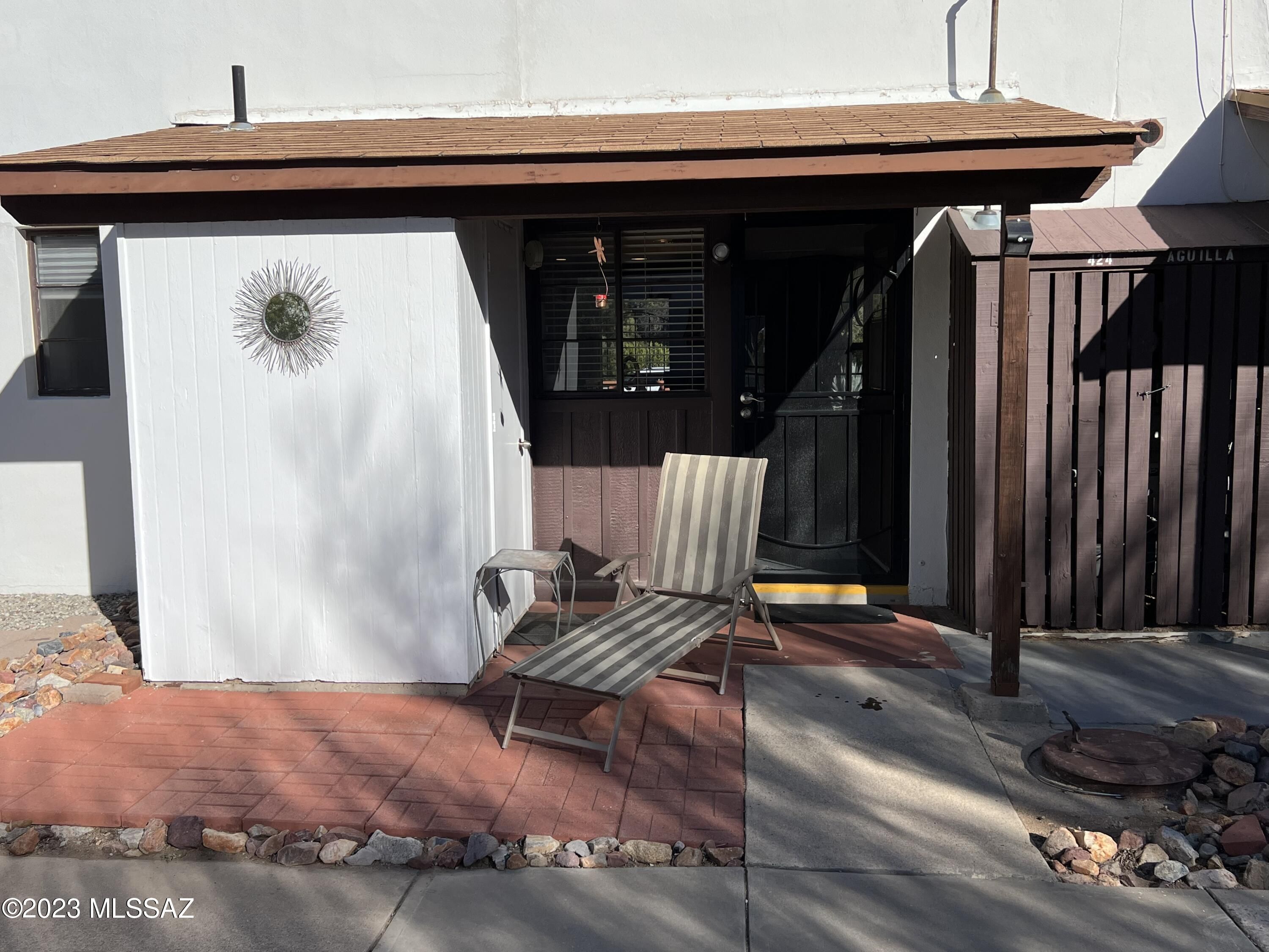 Enjoy your pleasantly updated hacienda style condo. Fully Furnished. New Front & Back door with blinds inside. New windows. Nicely appointed kitchen with Full-size dishwasher, SS french door refrigerator, full-size gas range, soft-close drawers, pullouts & plenty of storage. Subway tile backsplash & under cabinet lighting & crown molding. Morning coffee on your East facing front porch. Back porch. Bathroom has large vanity, tiled shower and extra storage. Full sized stacking Frigidaire washer & dryer in separate Storage room, along with extra cabinets. Tiled floors throughout for easy care. Private parking is in front of unit. HOA covers, common areas, water, trash, exterior, water heater, new roof, new heating/cooling unit, termite treatment. GVR yes