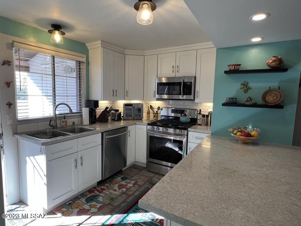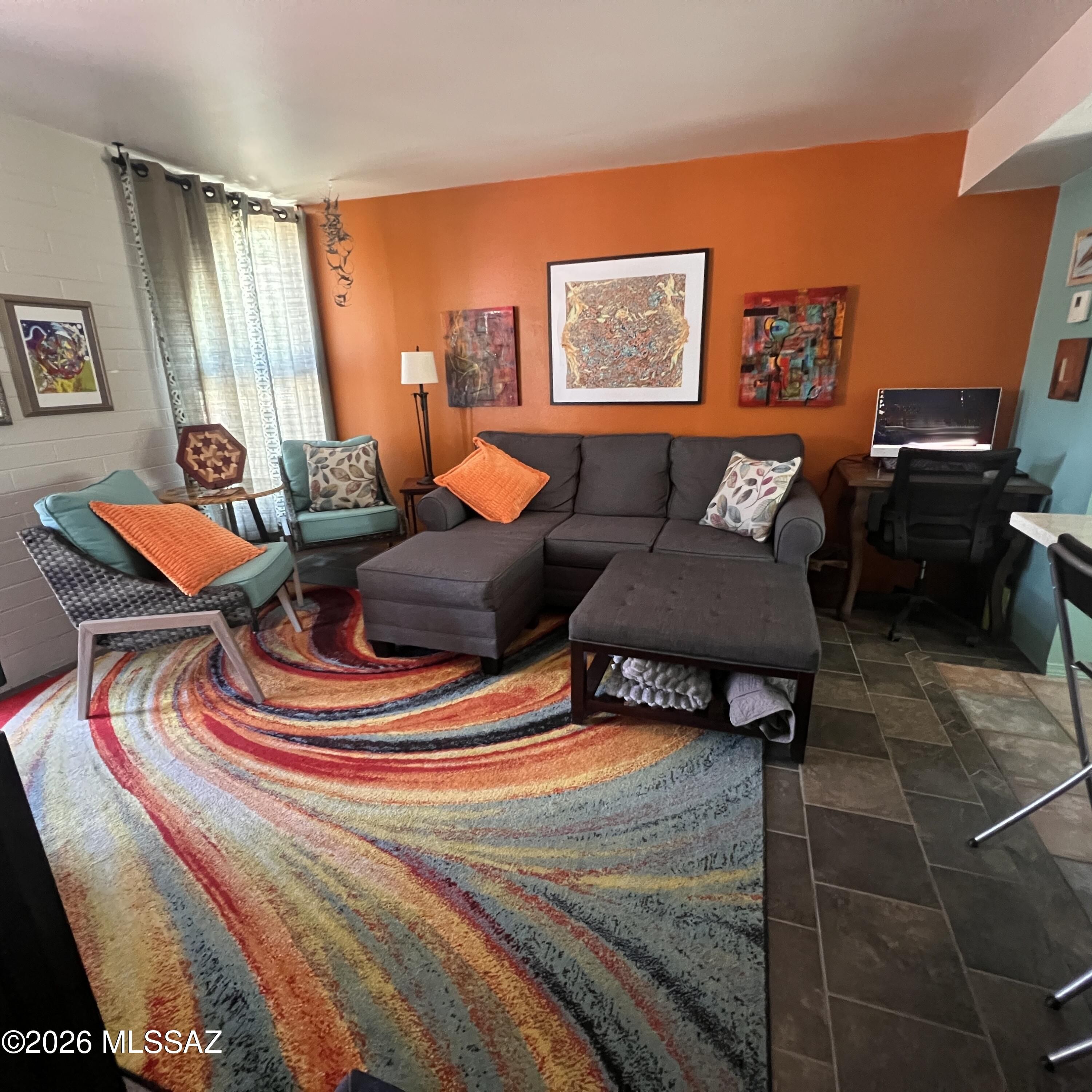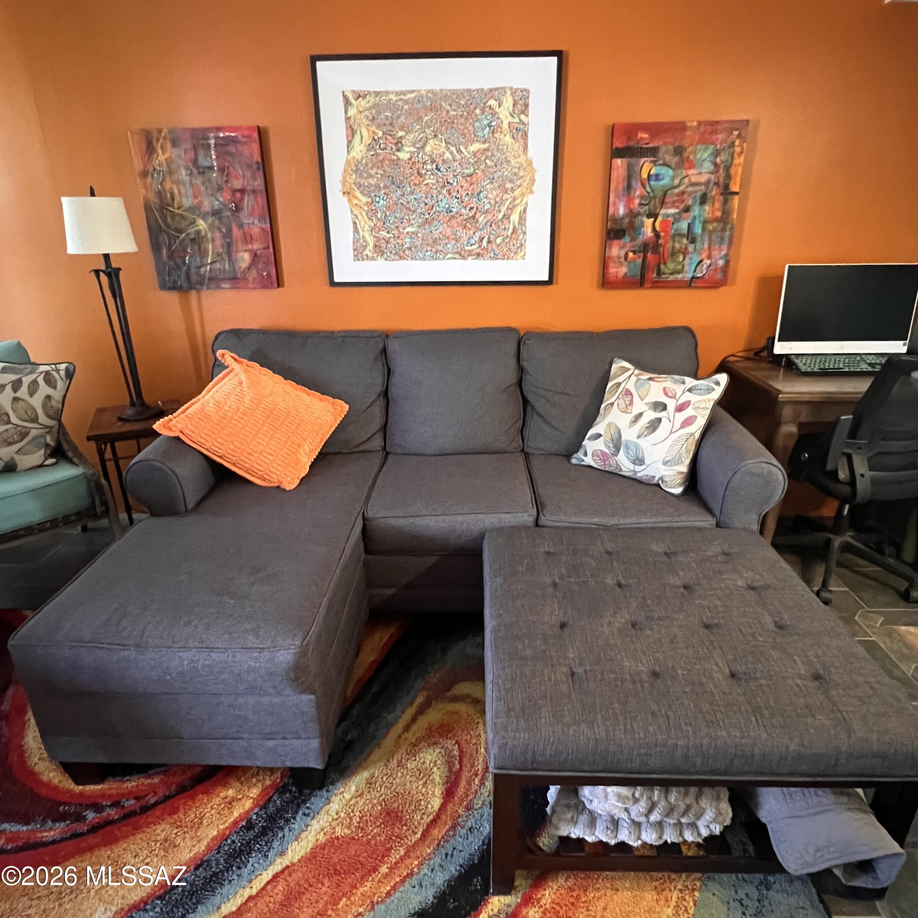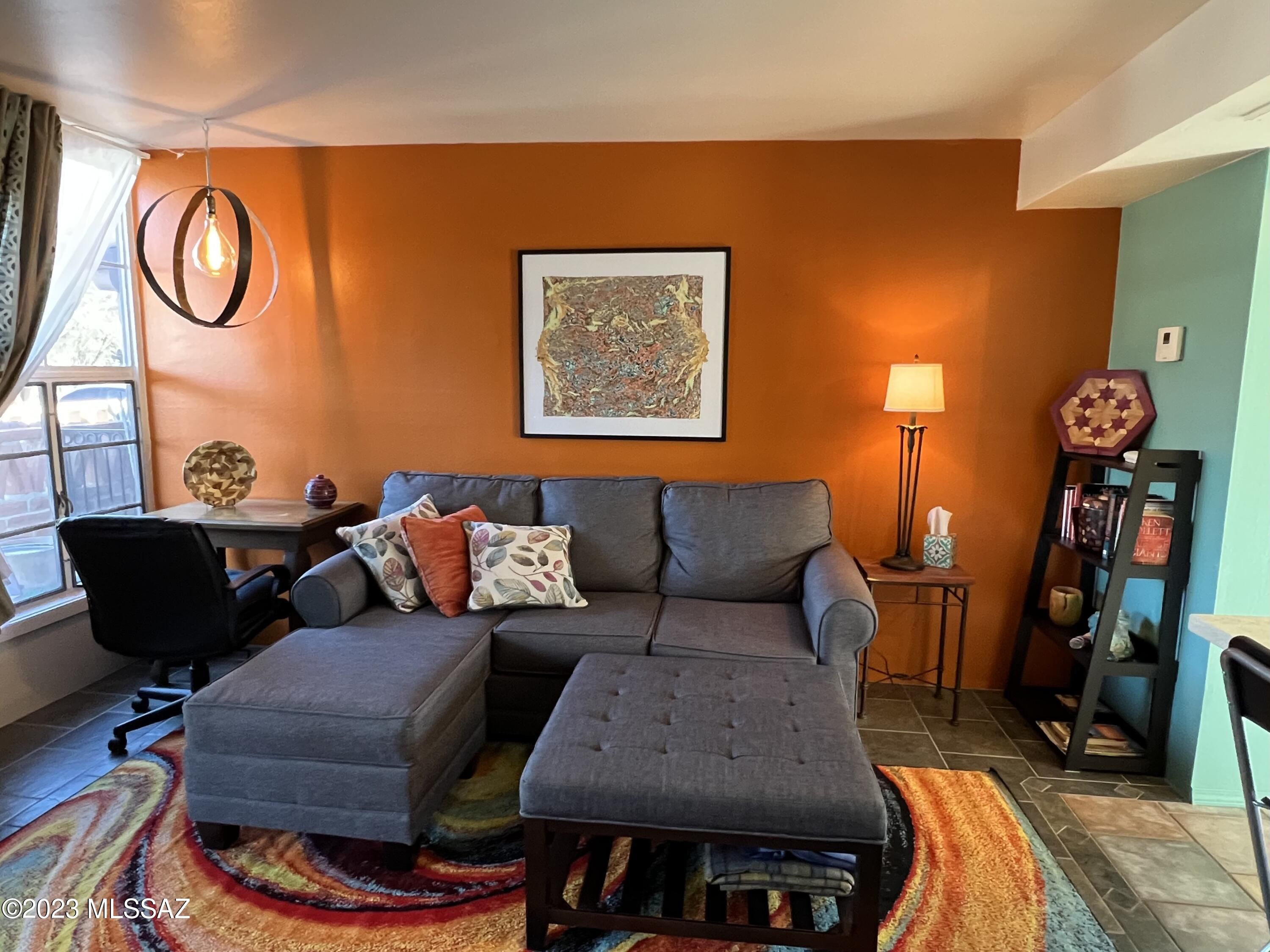 Enjoy your pleasantly updated hacienda style condo. Fully Furnished. New Front & Back door with blinds inside. New windows. Nicely appointed kitchen with Full-size dishwasher, SS french door refrigerator, full-size gas range, soft-close drawers, pullouts & plenty of storage. Subway tile backsplash & under cabinet lighting & crown molding. Morning coffee on your East facing front porch. Back porch. Bathroom has large vanity, tiled shower and extra storage. Full sized stacking Frigidaire washer & dryer in separate Storage room, along with extra cabinets. Tiled floors throughout for easy care. Private parking is in front of unit. HOA covers, common areas, water, trash, exterior, water heater, new roof, new heating/cooling unit, termite treatment. GVR yes
