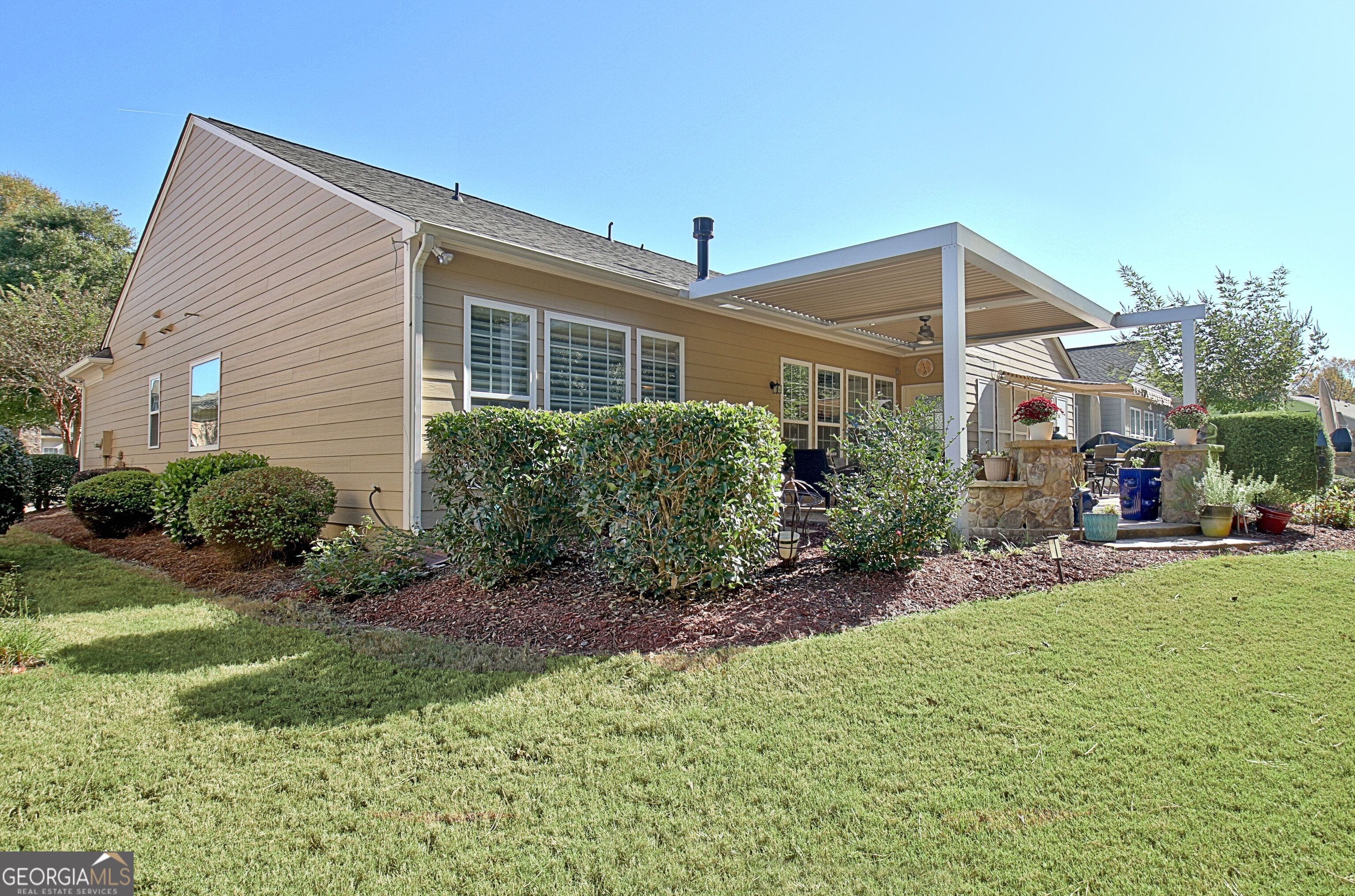 Luxury, Leisure, and low-maintenance living in Georgia's premier active-adult golf-cart community. Welcome to 424 Tallulah Drive, a stunning 3 bedroom, 2.5 bath home offering 2,775 square feet of open, beautifully curated living in the highly south-after Sun City Peachtree-Griffins private, gated 55+community were lifestyle takes center stage. Step inside to discover light-filled sophistication. A spacious family room with gas fireplace opens effortlessly to the expansive tile-floored sunroom-the perfect spot to enjoy morning light, quiet afternoons or host guest. The open-concept layout allows effortlessly into each room. You're going to love all the natural light! The chef's patio is an entertainers dream, featuring a custom stone outdoor kitchen with built-in Green Egg, sink and storage framed by a motorized pergola and awning that adjust with the sun. The private, wooded backyard offers peach and serenity rarely found. The main suite is a retreat unto itself with vaulted ceilings, designer shades, and a calming neutral palette, while the private office includes French doors, beautiful built-in cabinetry for two-ideal for hobbies, reading, or working from home. Every inch of this home is immaculate and tastefully decorated and designed, offering both elegance and ease. The kitchen is the heart of the home, featuring rich cabinetry, gleaming granite countertops, stainless appliances, complemented by a spacious eat-in breakfast area framed by bow windows that bathe the space in the morning light. Perfect for casual coffee moments or intimate dinners with friends Living here is about more than a beautiful home; it's about a lifestyle. Residents enjoy low maintenance living surrounded by resort -style amenities and incredible sense of community. Golf carts glide though tree lined streets toward the 18-hole championship golf course, the Club Peachtree clubhouse and miles of walking trails. Spend mornings at the fitness center or indoor lap pool, and afternoon on the pickleball or tennis court, and evenings with friends at the grill or neighborhood events. Designed for active, vibrant living, Sun City Peachtree combines small-town charm with the comfort of modern luxury. It's where neighbors become friends, and every amenity-from the pools to the golf course-feel like an extension of home
