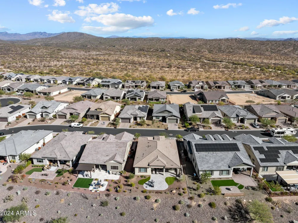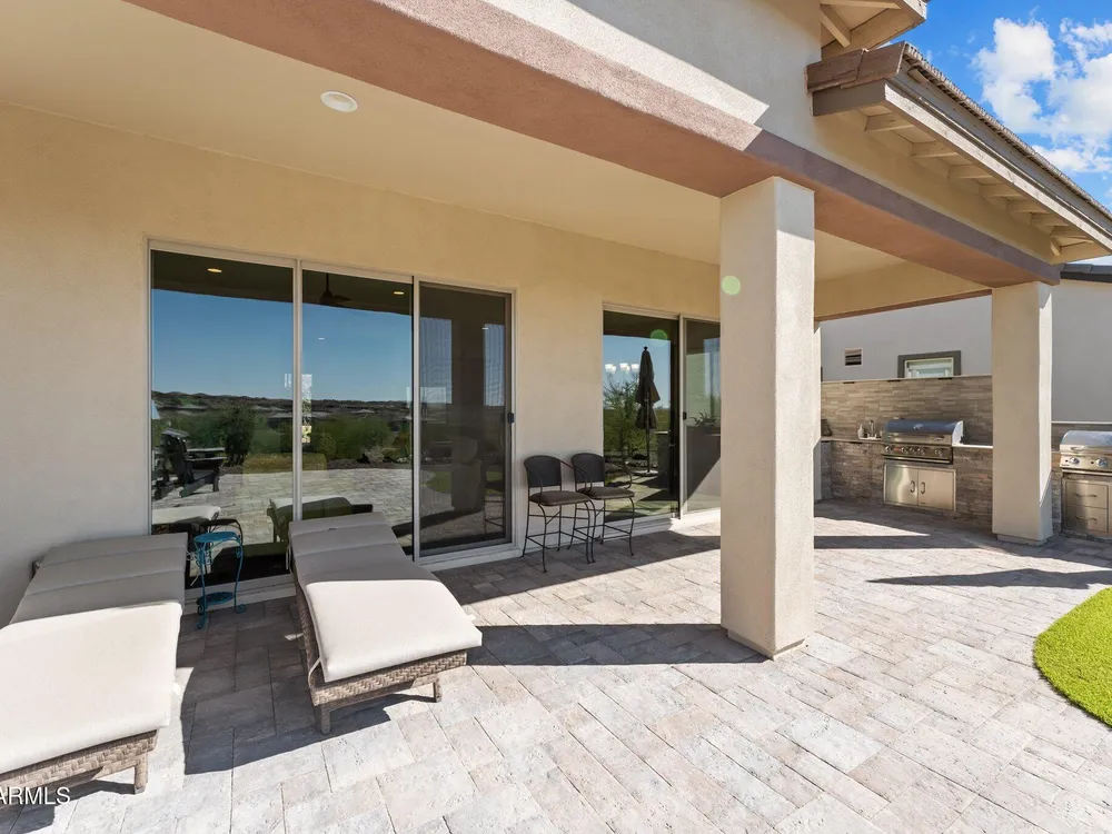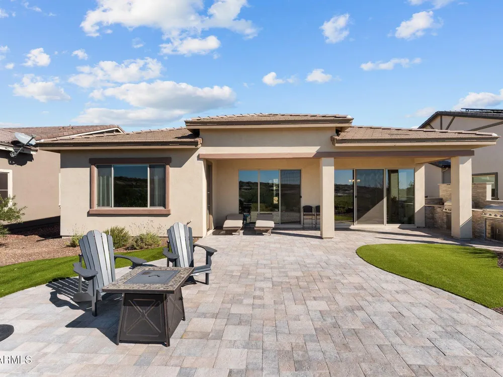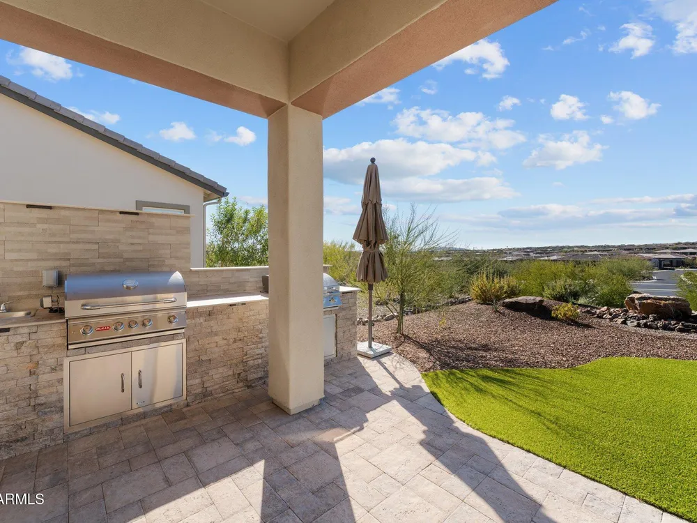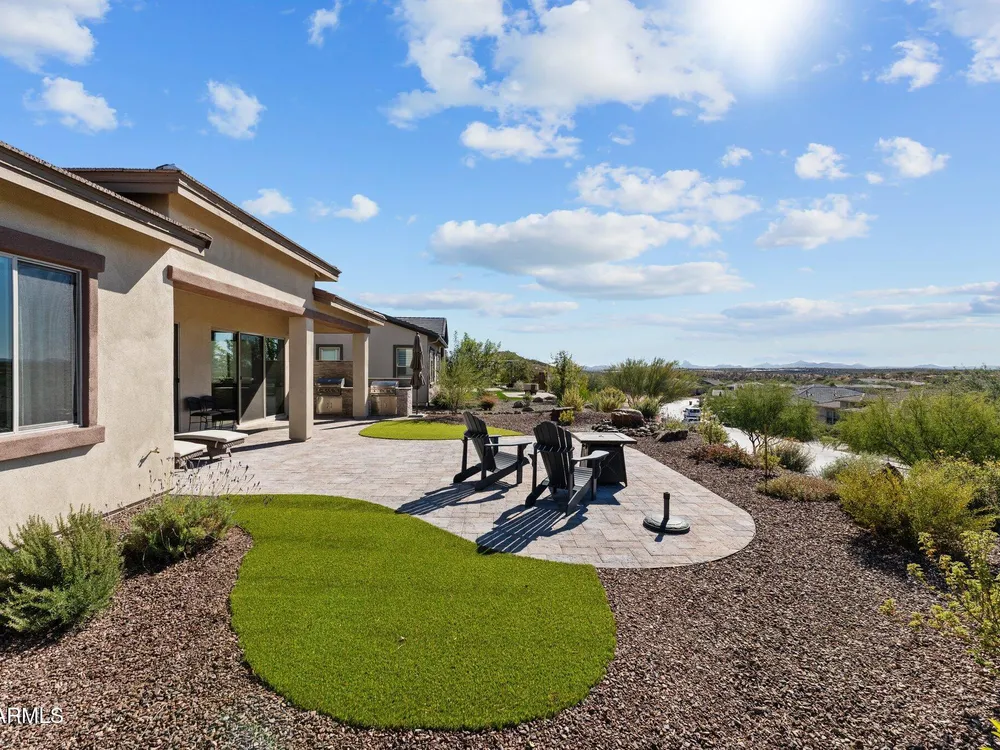 Nestled within the prestigious Wickenburg Ranch community, this exquisite home epitomizes modern luxury and comfort. As you step inside, a wall of sliding glass doors floods the space with natural light. The kitchen boasts an expansive island and granite countertops, complemented by a convenient walk-in pantry and sleek hood range. An open floor plan effortlessly connects the kitchen to the inviting living area, adorned with a cozy den for relaxation or work. 2 bedrooms offer restful retreats, accompanied by 2 luxurious bathrooms for ultimate convenience. Outside, a low-maintenance landscaped backyard beckons with its tranquil ambiance, featuring a beautiful water feature, outdoor kitchen w/sink, covered patio, and magnificent mountain views perfect for alfresco dining