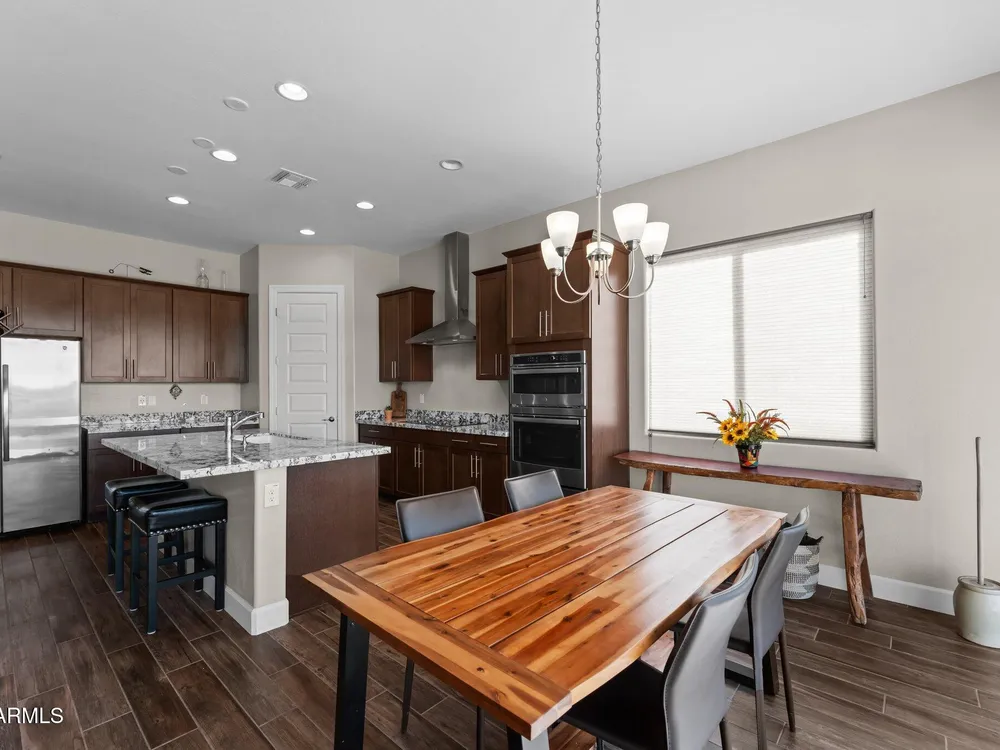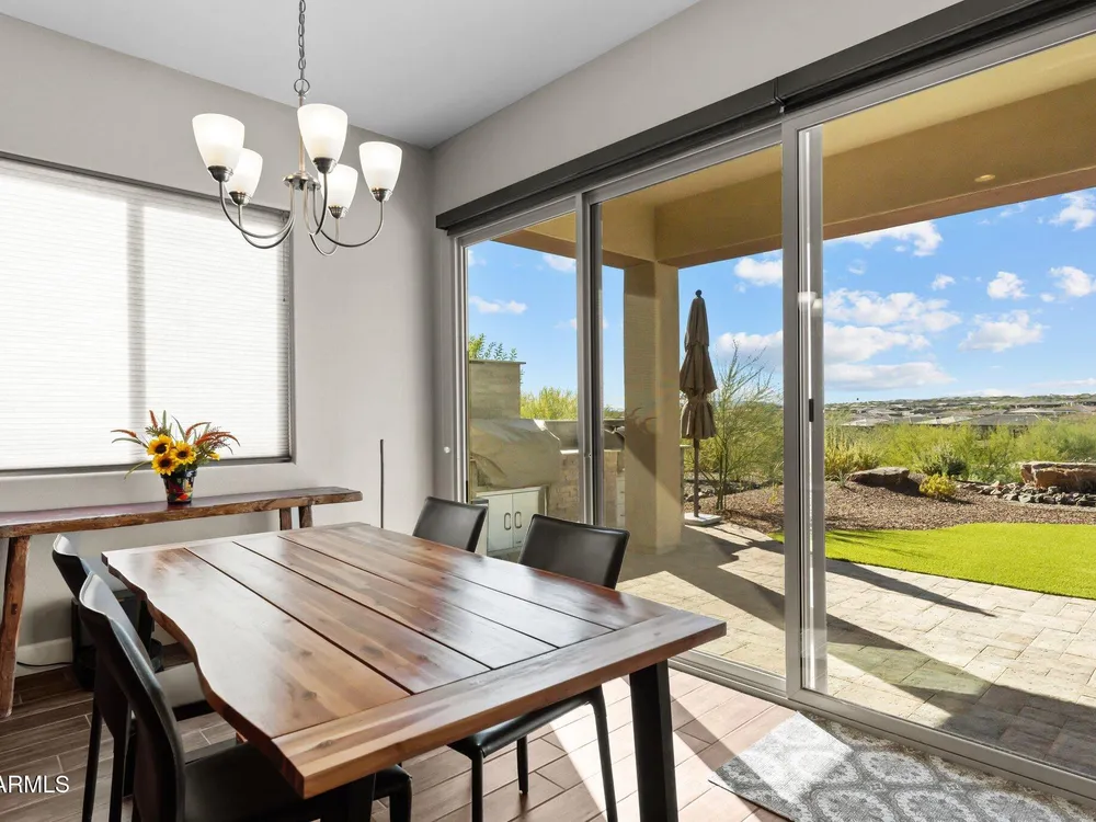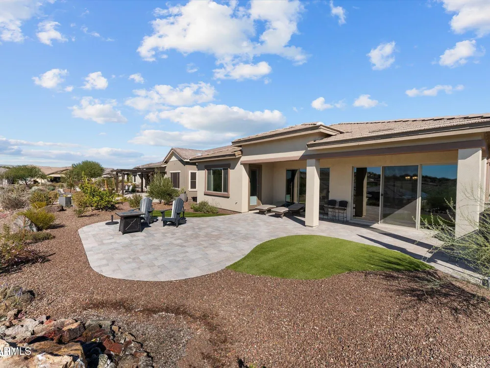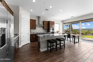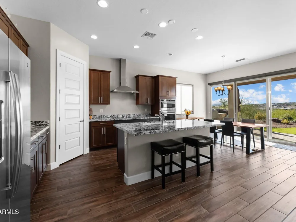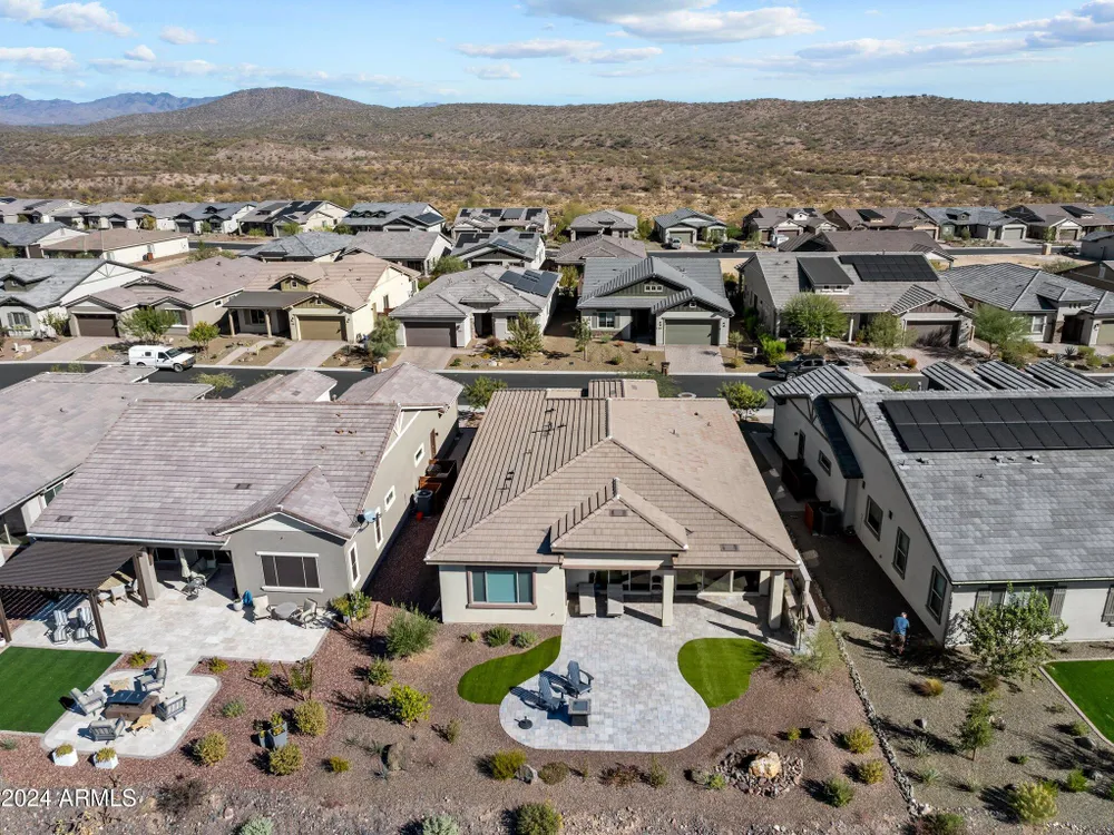 Nestled within the prestigious Wickenburg Ranch community, this exquisite home epitomizes modern luxury and comfort. As you step inside, a wall of sliding glass doors floods the space with natural light. The kitchen boasts an expansive island and granite countertops, complemented by a convenient walk-in pantry and sleek hood range. An open floor plan effortlessly connects the kitchen to the inviting living area, adorned with a cozy den for relaxation or work. 2 bedrooms offer restful retreats, accompanied by 2 luxurious bathrooms for ultimate convenience. Outside, a low-maintenance landscaped backyard beckons with its tranquil ambiance, featuring a beautiful water feature, outdoor kitchen w/sink, covered patio, and magnificent mountain views perfect for alfresco dining