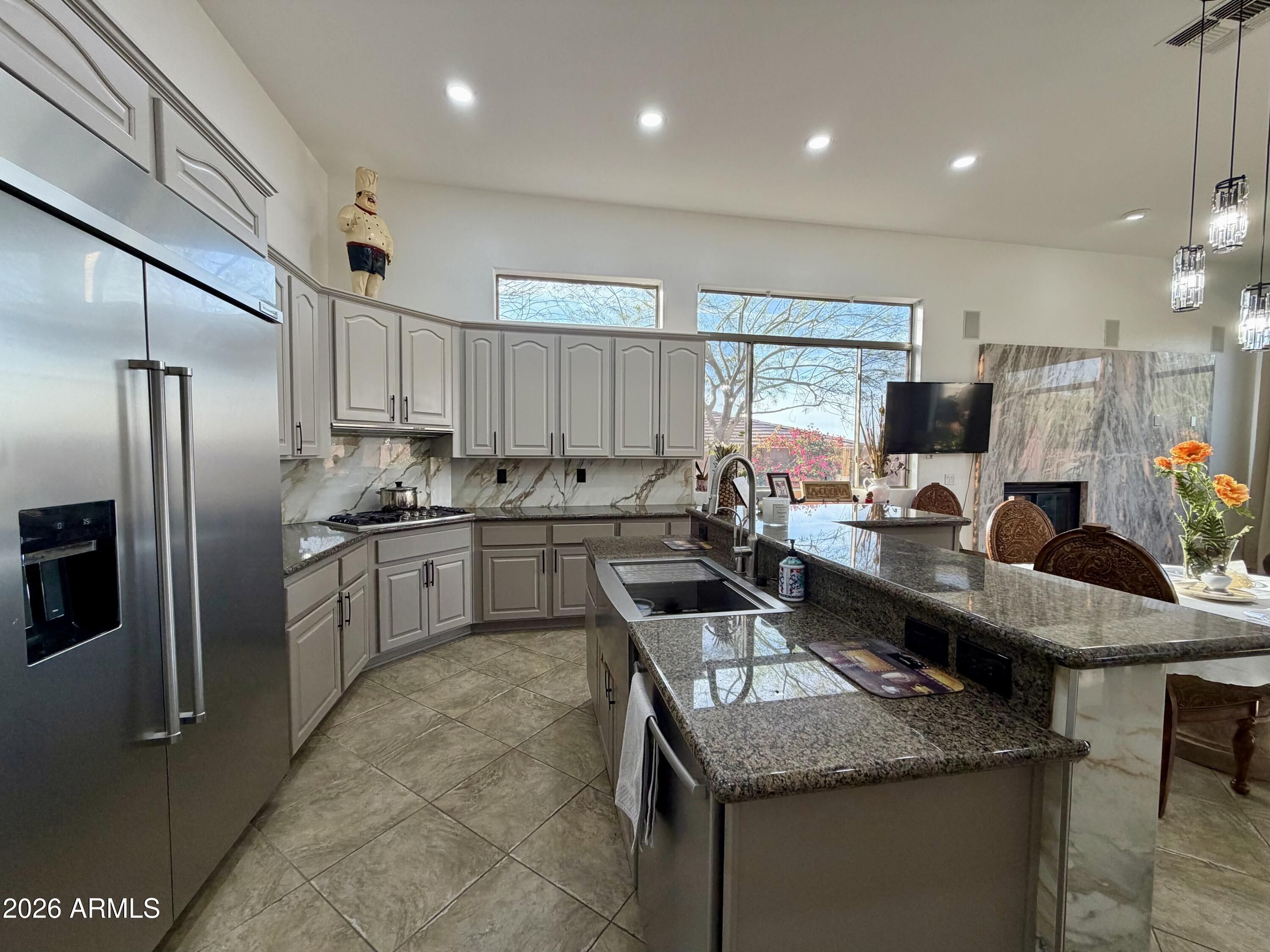 Nestled within Anthem Country Club, this stunning home offers elegance and comfort throughout. Granite shines in every space, including a dramatic lighted granite accent wall. Beautiful hardwood and ceramic flooring pair perfectly with elegant chandeliers that elevate the home's style. The split floor plan provides privacy, featuring a luxurious primary suite with a granite-enclosed shower. A huge second bedroom includes an en-suite bath, while additional bedrooms are generously sized. The kitchen boasts granite countertops and beautiful appliances, ideal for entertaining. Step into a true backyard oasis with a sparkling pool and spa, built-in BBQ, fireplace, and travertine in all the right places. Complete with a 3-car garage and an large laundry room, Owned Solar Panels!
