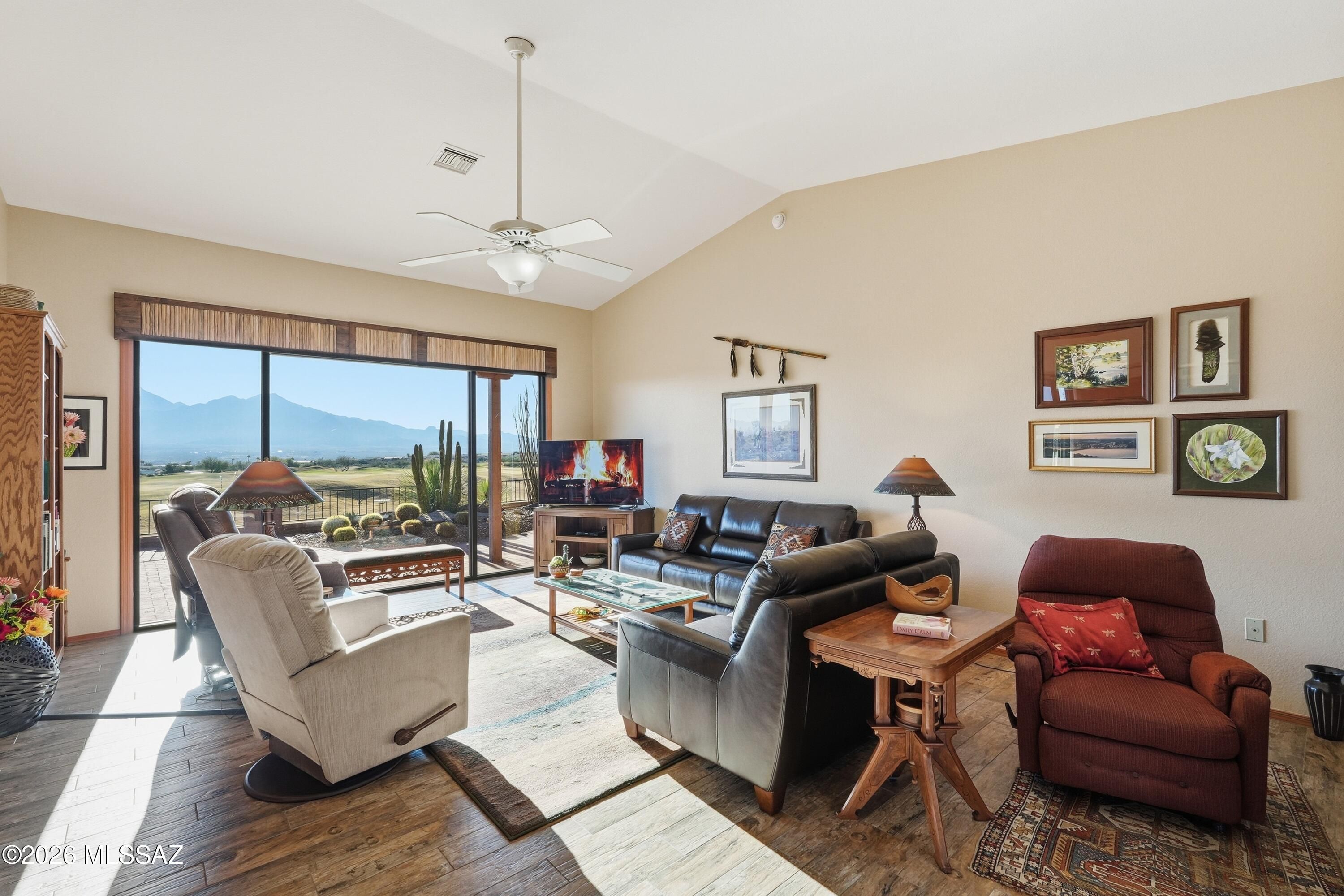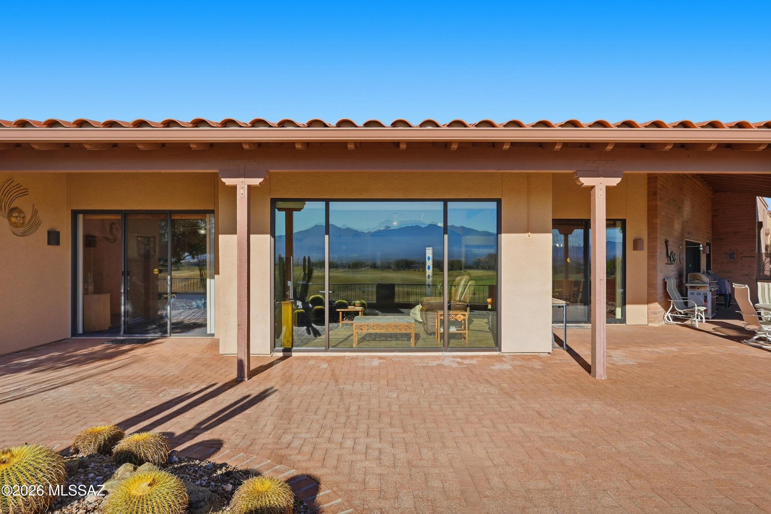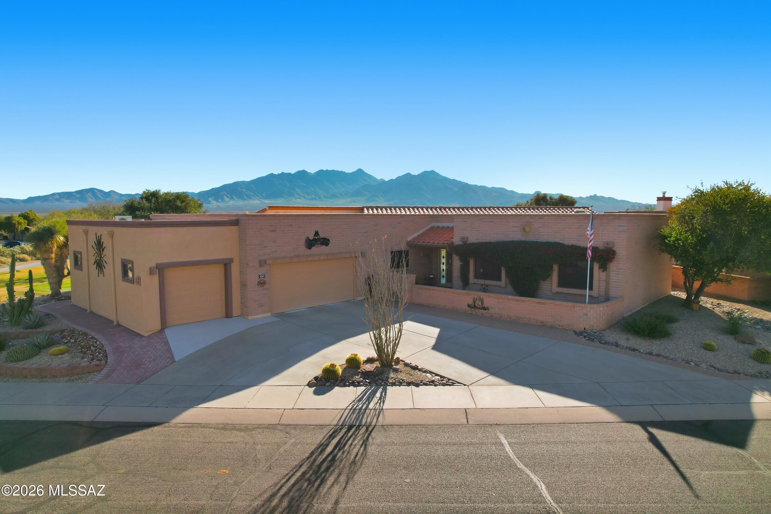 Welcome to this private sanctuary at San Ignacio Golf Course. Where breathtaking mountain panoramas and sweeping fairway vistas take you away. This beautifully maintained 2,508 sq ft residence blends timeless Southwest character with modern comforts, offering an exceptional indoor-outdoor living experience in one of Green Valley's most desirable resort areas. Step inside to fully experience living here! The sunlit interior feels warm and inviting. You feel drawn to the expansive picture windows that perfectly frame the glorious desert beauty in front of you. Luscious green fairways as far as you can see, crowned by the monumental Santa Rita Mountain range, it is exquisite. Open areas flow seamlessly leading to the wrap-around outdoor patios; ideal for simply enjoying the beauty, the