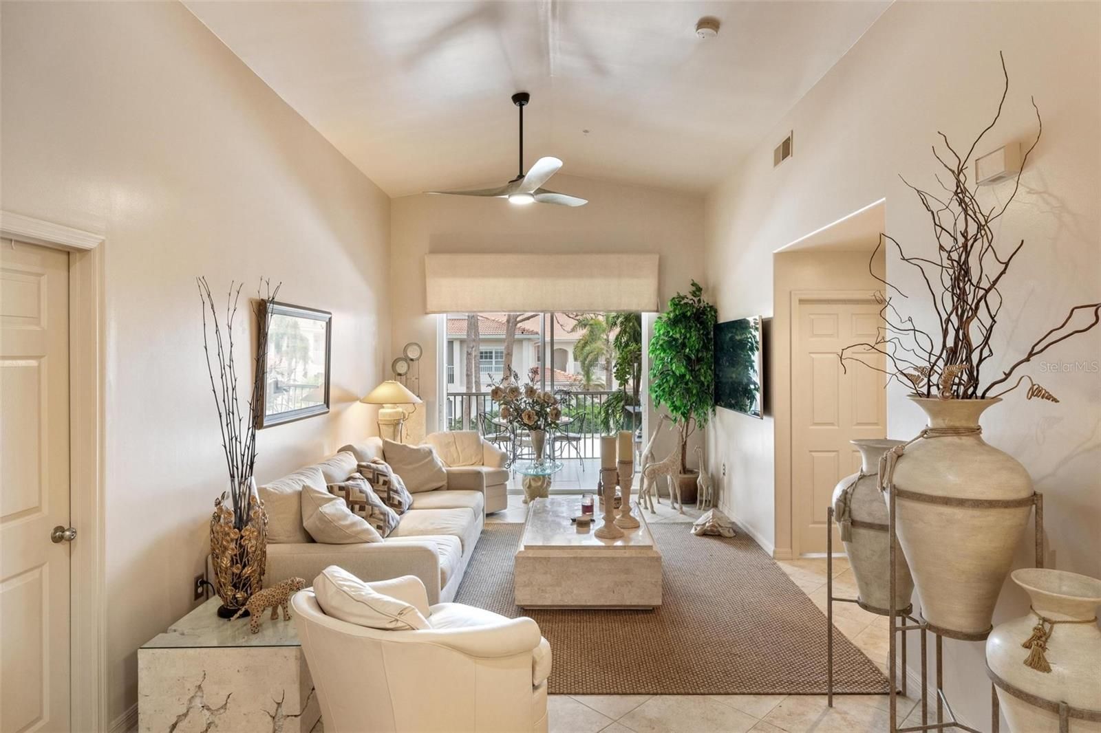 Live the Florida lifestyle in this beautifully updated condo located in the gated community of Plaza De Flores in highly desirable Palmer Ranch. This bright and private corner unit features vaulted ceilings, an open-concept layout, and tile flooring throughout with no transitions, including the bedrooms, creating a clean, modern, and low-maintenance living environment. The kitchen has been tastefully renovated with quartz countertops, a stone backsplash, newer appliances, a modern sink, and generous cabinet and island space—ideal for both everyday living and entertaining. The split-bedroom floor plan offers privacy and functionality. The primary suite includes two walk-in closets, direct lanai access, and a fully remodeled en-suite bath with marble tile, dual sinks, updated lighting, a new glass shower enclosure, and modern finishes. The guest bedroom features vaulted ceilings and a large closet, while the guest bath has also been updated with new fixtures, hardware, and mirror. Step outside to the spacious 26-foot screened lanai, recently tiled and upgraded with new screens and ceiling fans, offering peaceful and private views—perfect for relaxing or entertaining year-round. Additional upgrades include fresh interior paint, updated lighting, ceiling fans in every room, a brand-new tankless water heater, custom blinds, and designer drapery that conveys with the sale. Plaza De Flores is a Mediterranean-style, amenity-rich community known for its lush landscaping, courtyards, and fountains. Residents enjoy a heated pool and spa, tennis court, fitness center, clubhouse with kitchen and library, and on-site management. The monthly fee includes cable, water, sewer, trash, pest control, and exterior maintenance, providing true low-maintenance living. Ideally located next to the Stoneybrook Nature Trail with direct access to the Legacy Trail, and just minutes from Siesta Key Beach, Nokomis Beach, and Venice Beach, as well as Costco, shopping, dining, golf, and top-rated medical facilities. Positioned between downtown Sarasota and historic Venice, this location offers the best of Florida’s Gulf Coast lifestyle. Whether you’re looking for a full-time residence, seasonal getaway, or investment opportunity, this move-in-ready condo delivers location, upgrades, and lifestyle in one of Sarasota’s most sought-after communities.