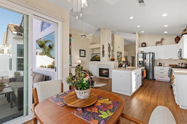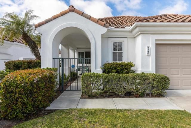Rarely available, single-story detached Syros model in the highly desirable Portofino Village at Ocean Hills Country Club. This immaculate, updated home is truly move-in ready. The intelligently designed floor plan features a spacious combined living and dining area plus an open-concept kitchen and den, ideal for everyday living and entertaining. A large, thoughtfully positioned picture window frames sweeping neighborhood views to the west, offering beautiful sunsets on clear days. All windows and doors are dual pane for comfort and energy efficiency. Direct access from the home to the garage adds everyday convenience. The spotless garage, with its finished painted floor, offers an impressive amount of additional closet and storage space, as well as a dedicated side area with a workbench for hobbies or projects. This Syros layout is one of the most desirable single-story floor plans in the community, and this particular home is among the newer residences in Ocean Hills Country Club, built in 1999. Located within the premier 55+ gated community of Ocean Hills Country Club, residents enjoy a resort-style lifestyle with an 18-hole executive golf course, a stunning clubhouse, solar-heated junior Olympic–sized pool and spa, tennis and pickleball courts, fitness center, dog park, and miles of walking paths. A wide variety of clubs, classes, and social activities make it easy to connect with neighbors and enjoy an active, low-maintenance lifestyle just a short drive from the beaches, shopping, and dining of coastal North County. Now is your chance to own a beautifully maintained, newer single-story home in one of the most sought-after villages in Ocean Hills Country Club.