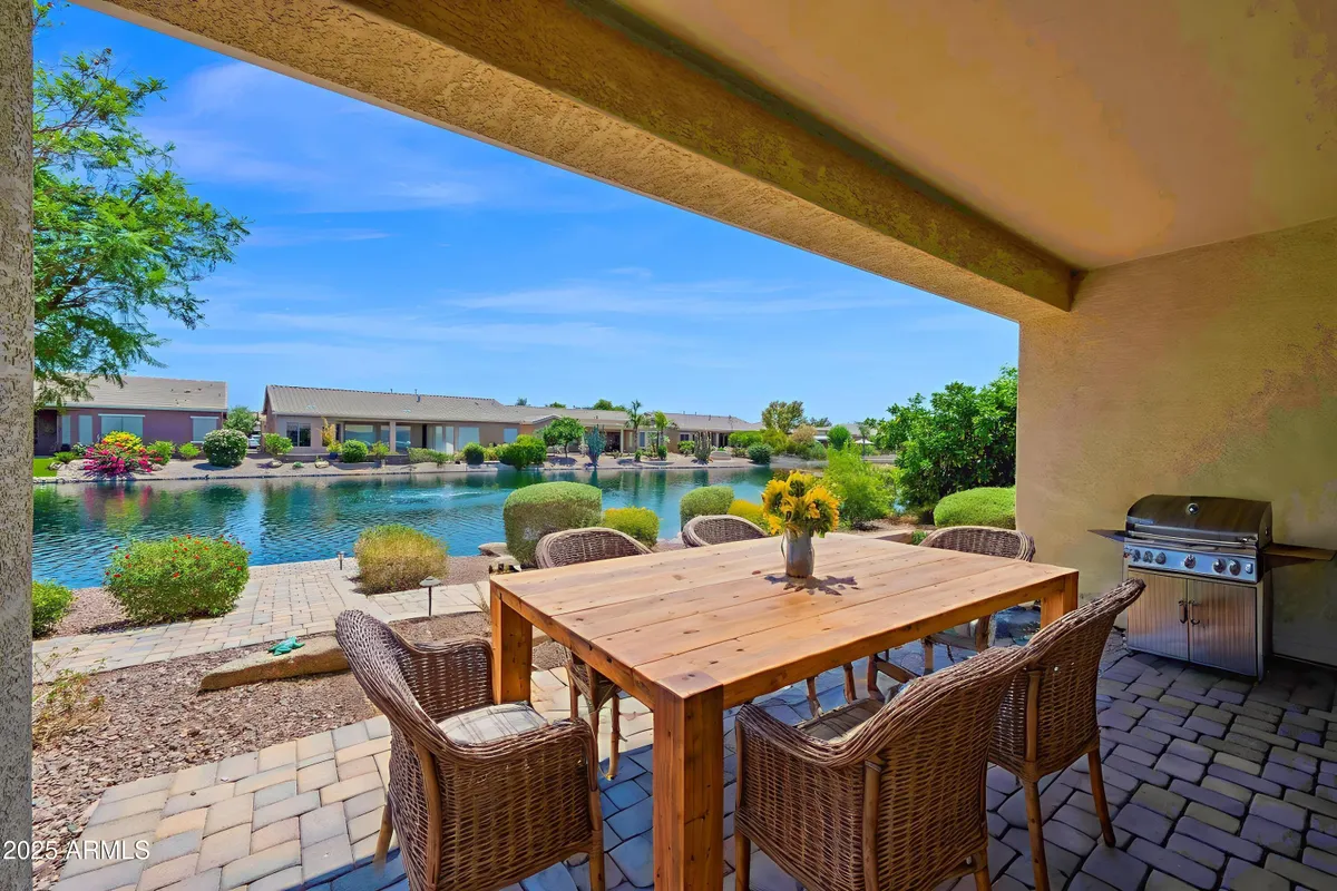 Tranquil waterfront living for the best years of your life! Welcome to resort-style living in the guard-gated Province at Maricopa active adult community. This lovely home offers a split floorplan with 2 bedrooms, a versatile den, and 2 bathrooms, all designed with functionality in mind. Outside, you'll be greeted by a freshly painted exterior, easy maintenance landscaping, and an inviting paver courtyard. Step inside to find a light and bright open concept layout featuring an abundance of windows with waterfront views, designer paint, newer laminate wood flooring throughout the entire home, new window coverings, and ceiling fans with lights in every room. The kitchen offers a large island and breakfast bar, maple cabinets, pull out shelves, upgraded hardware, black appliances, and plenty of counter space. What makes this home truly exceptional is its coveted waterfront lot! Imagine enjoying your morning coffee or hosting sunset gatherings with friends, all while taking in serene views from the covered patio or the expansive pavered seating area. Plus, there are 4 citrus trees (2 lemon, 1 orange, 1 grapefruit) for your enjoyment. With a new HVAC system in 2023, a new water softener in 2020, and FURNISHINGS INCLUDED, this home is turnkey and ready for you! Located just moments from the beautiful 32,000 SqFt Province clubhouse styled after an Italian villa featuring indoor and outdoor pools, fitness center, pickleball courts, and endless social activities, this home offers the perfect opportunity for those seeking relaxation paired with an active lifestyle. This home is a must see!