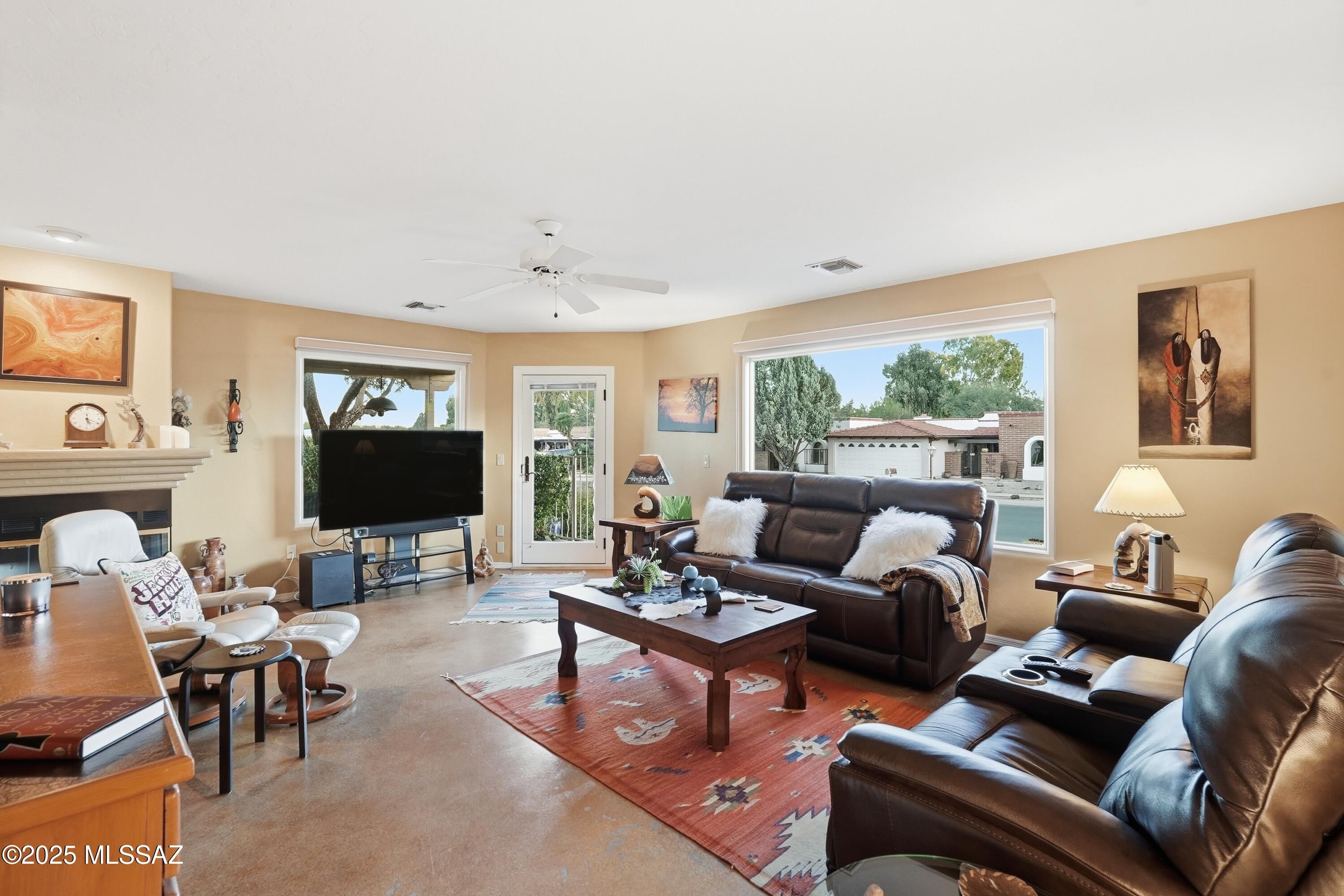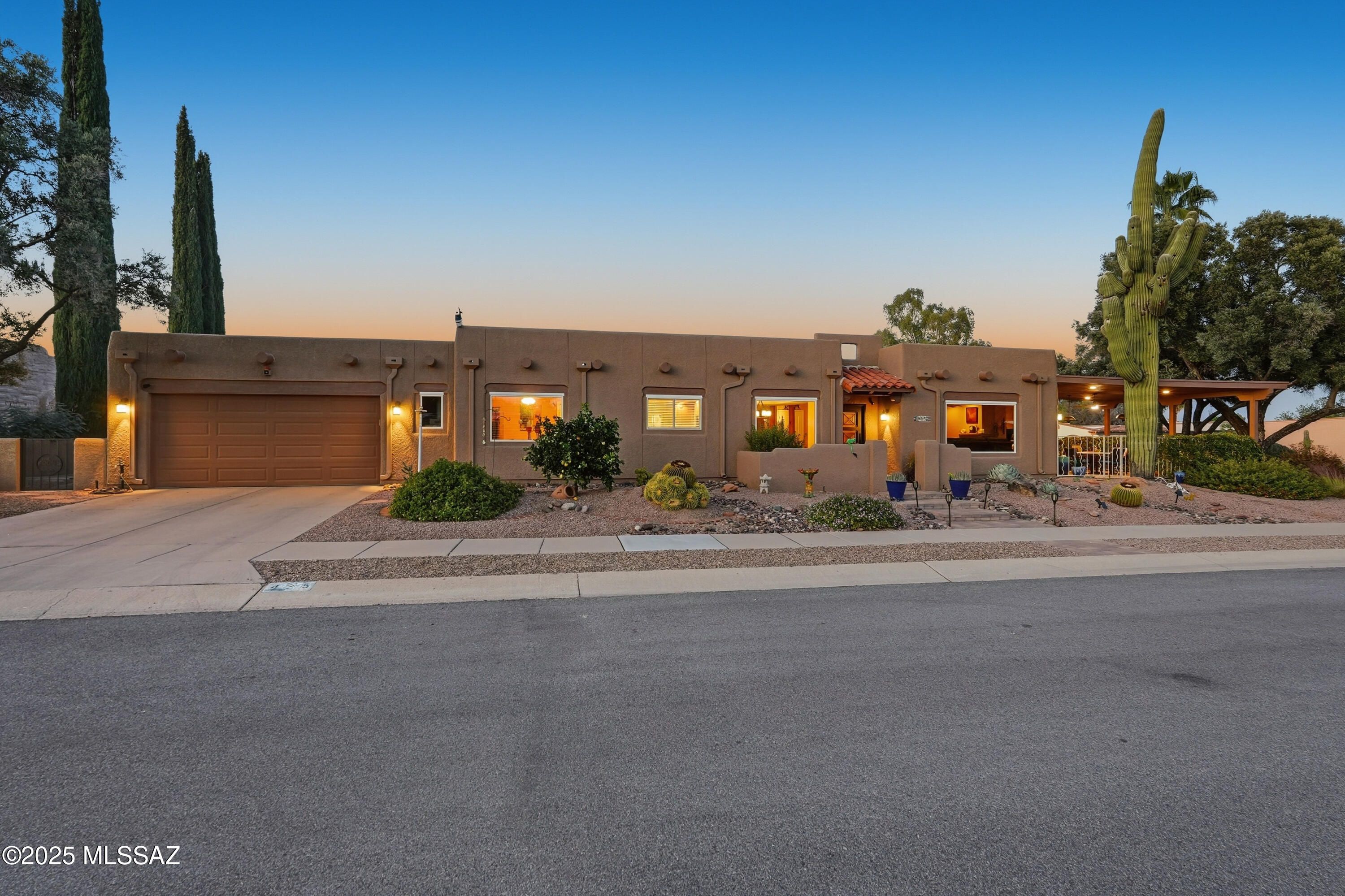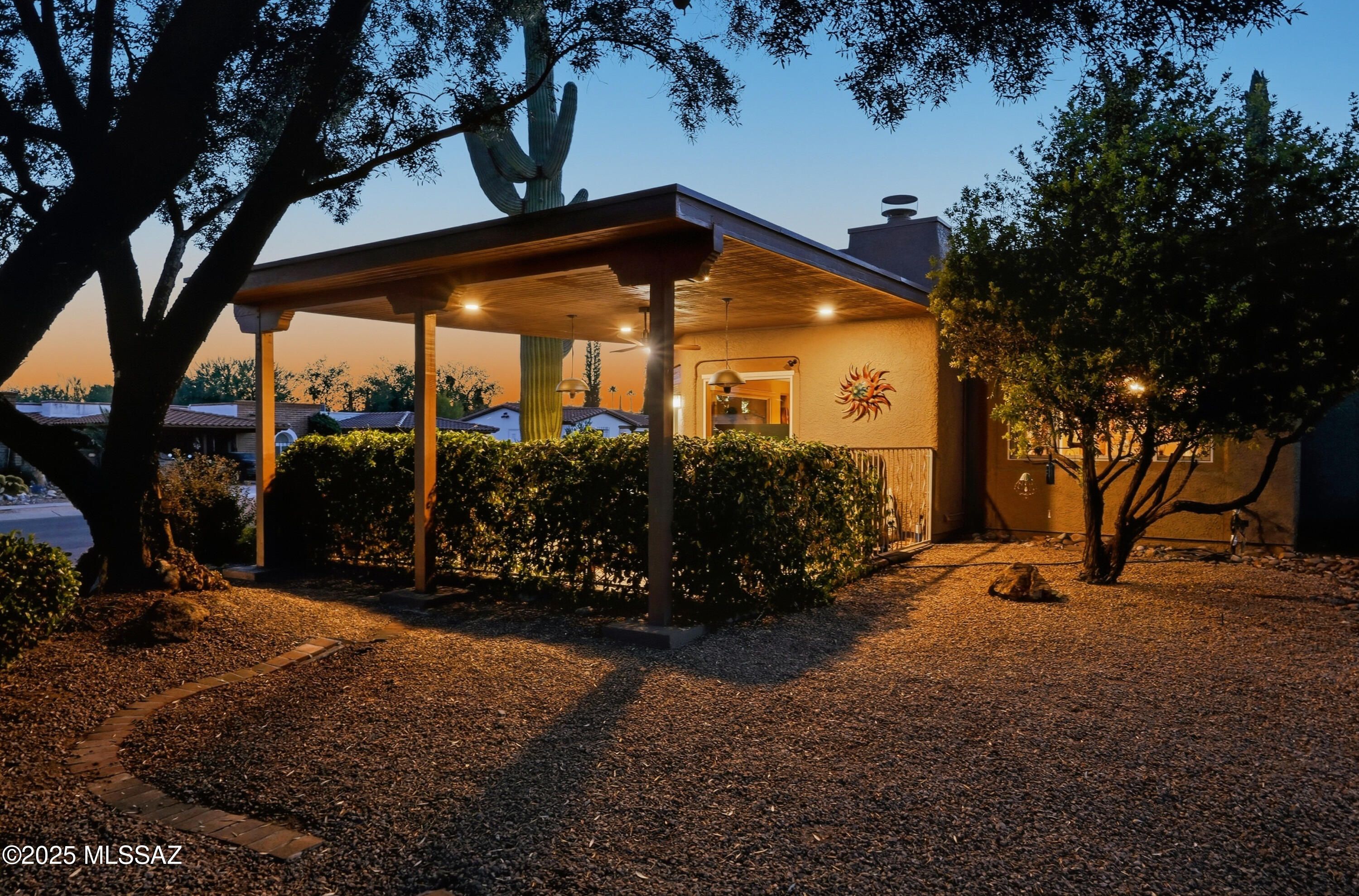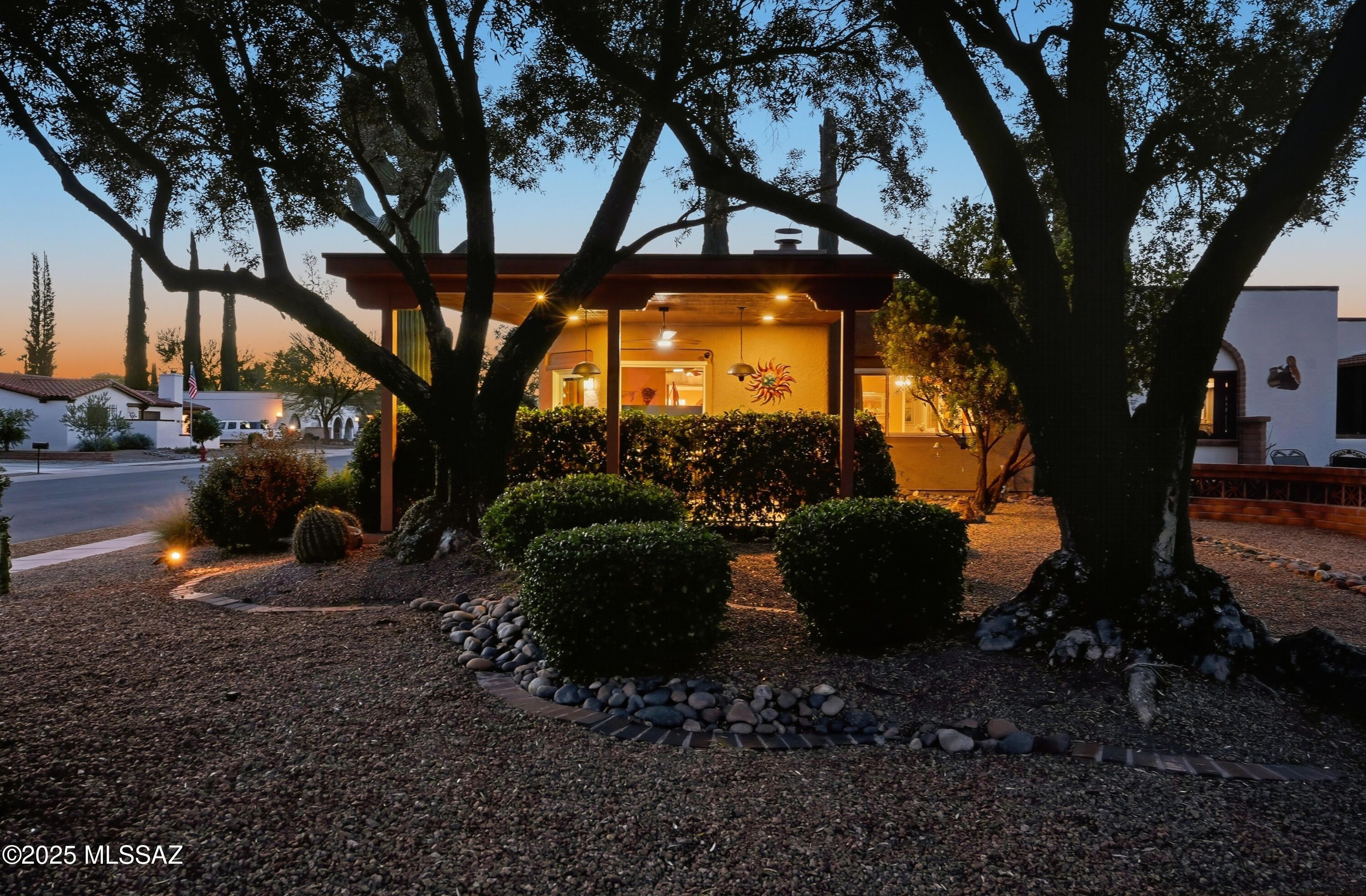 Nestled on a serene corner lot, this-one-of-a-kind townhome is a blend of desert beauty and thoughtful design. From the moment you arrive, you're greeted with natural desert blooms and a flourishing citrus tree. A true gem in Southern Arizona. Step through the designer front door and into the warm interior where rich tones set the stage for comfort and character. The cozy living room features a corner fireplace, built-in shelving and access to the private patio. The updated kitchen is a chef's delight, showcasing granite countertops, stainless steel appliances, pantry, cabinetry with pull-outs, and three lazy Susans. A sunlit breakfast nook adds a cheerful touch. The dining area is a stunning blend of rustic ambience. A large picture window frames the natural