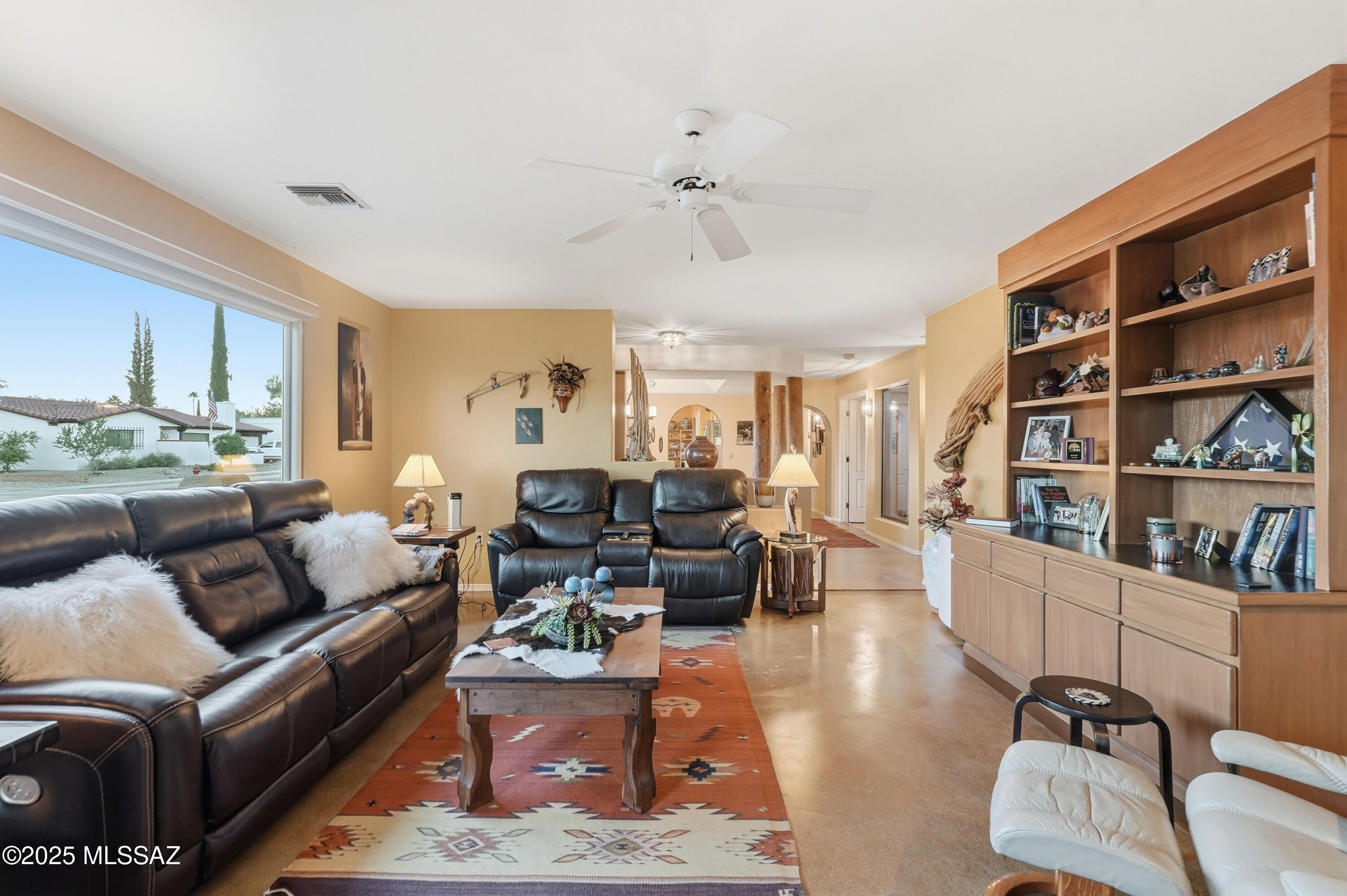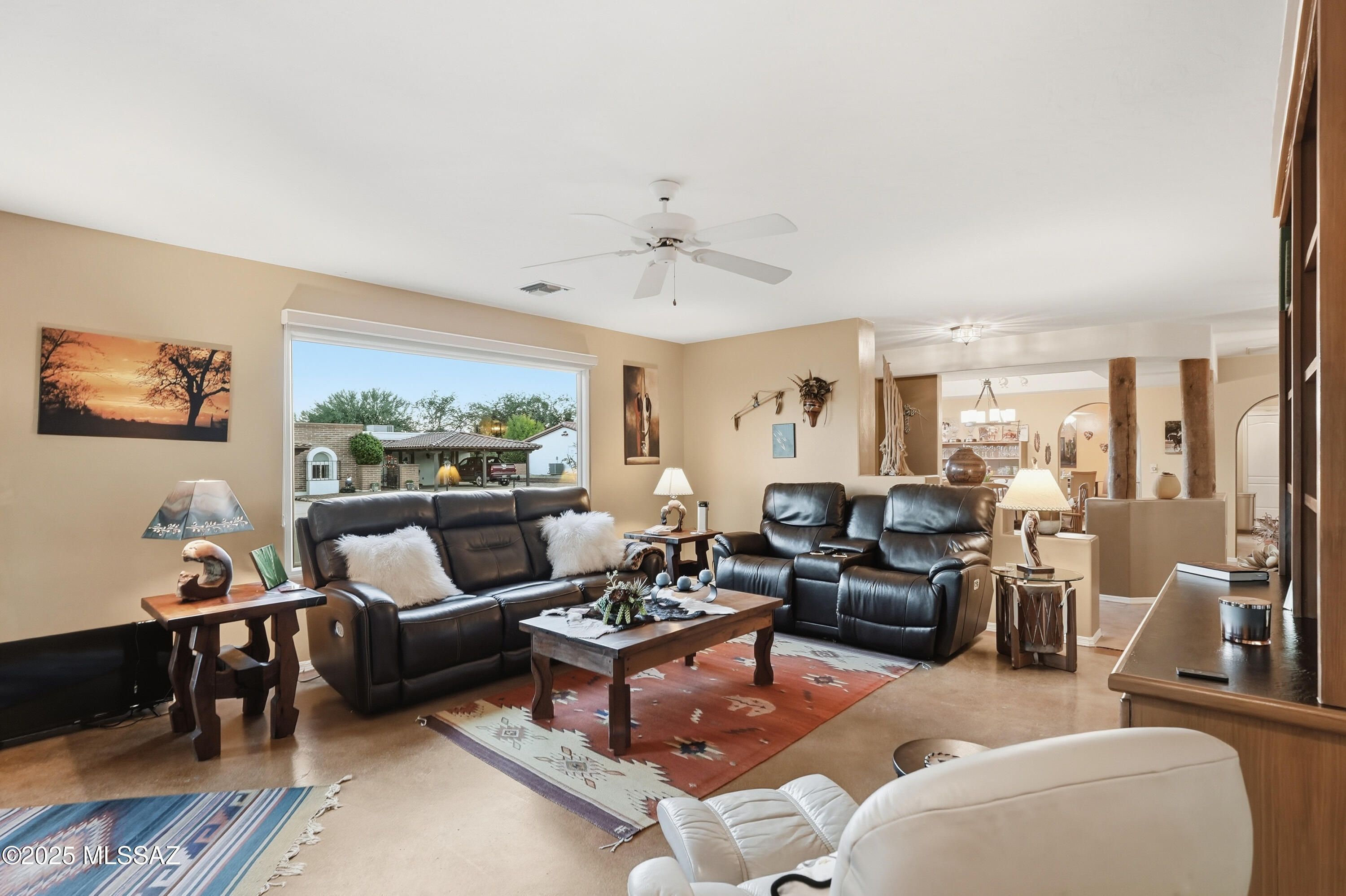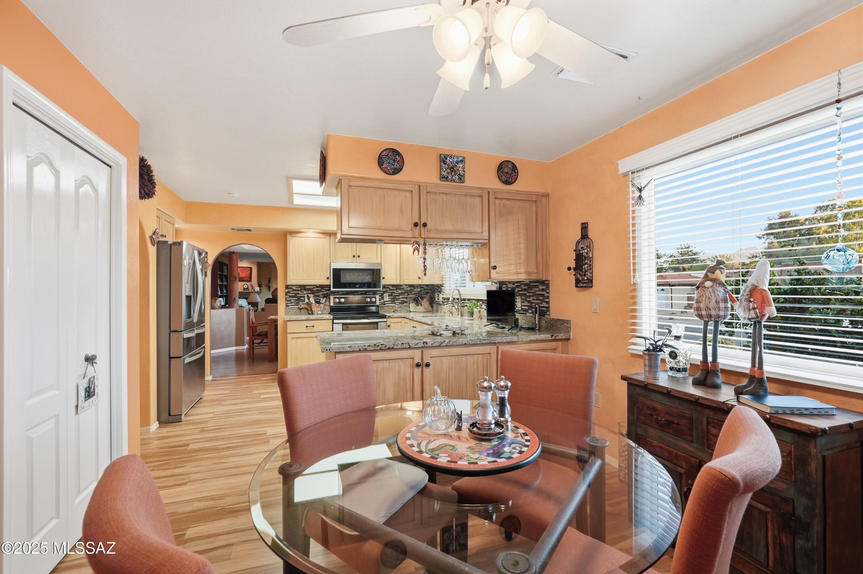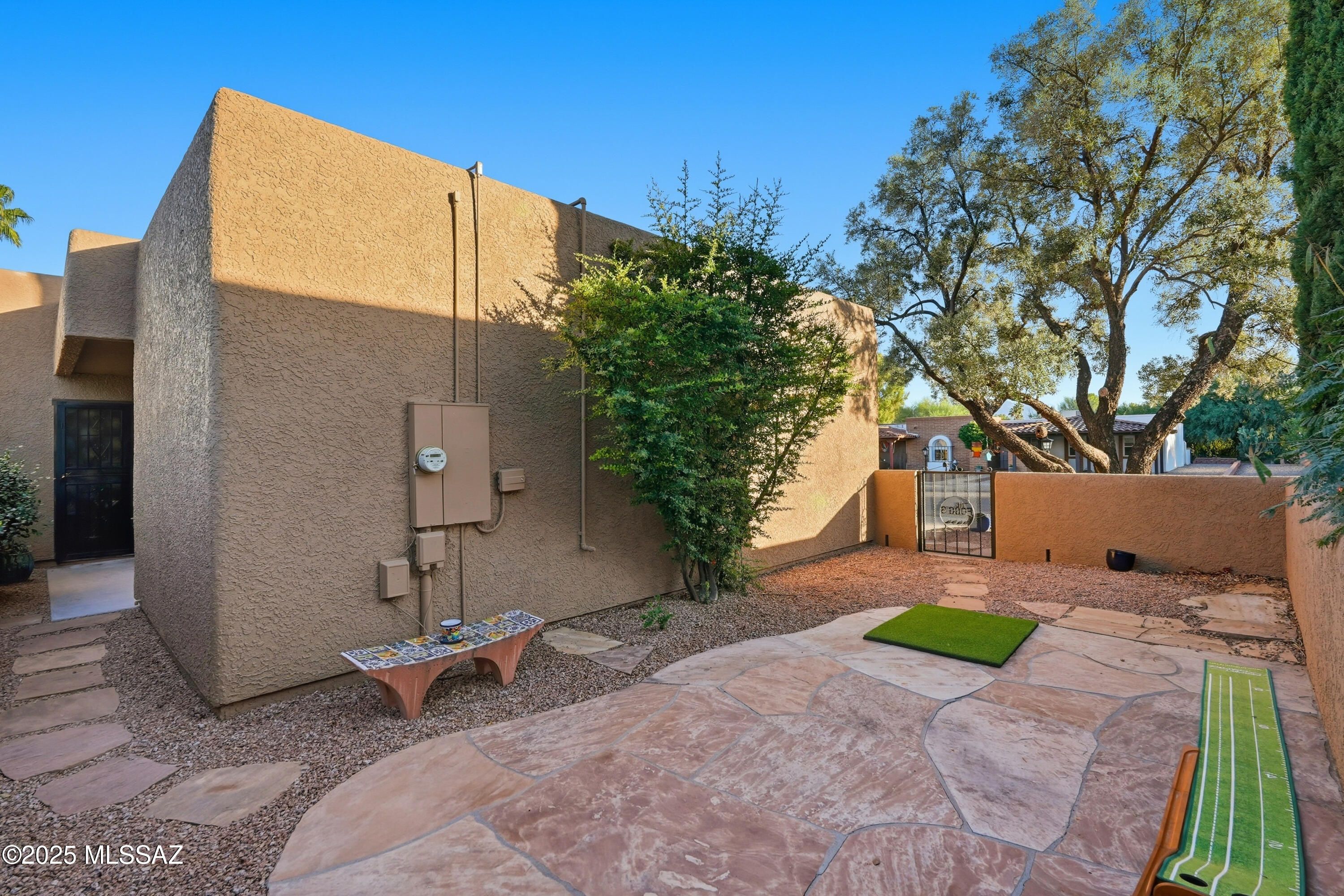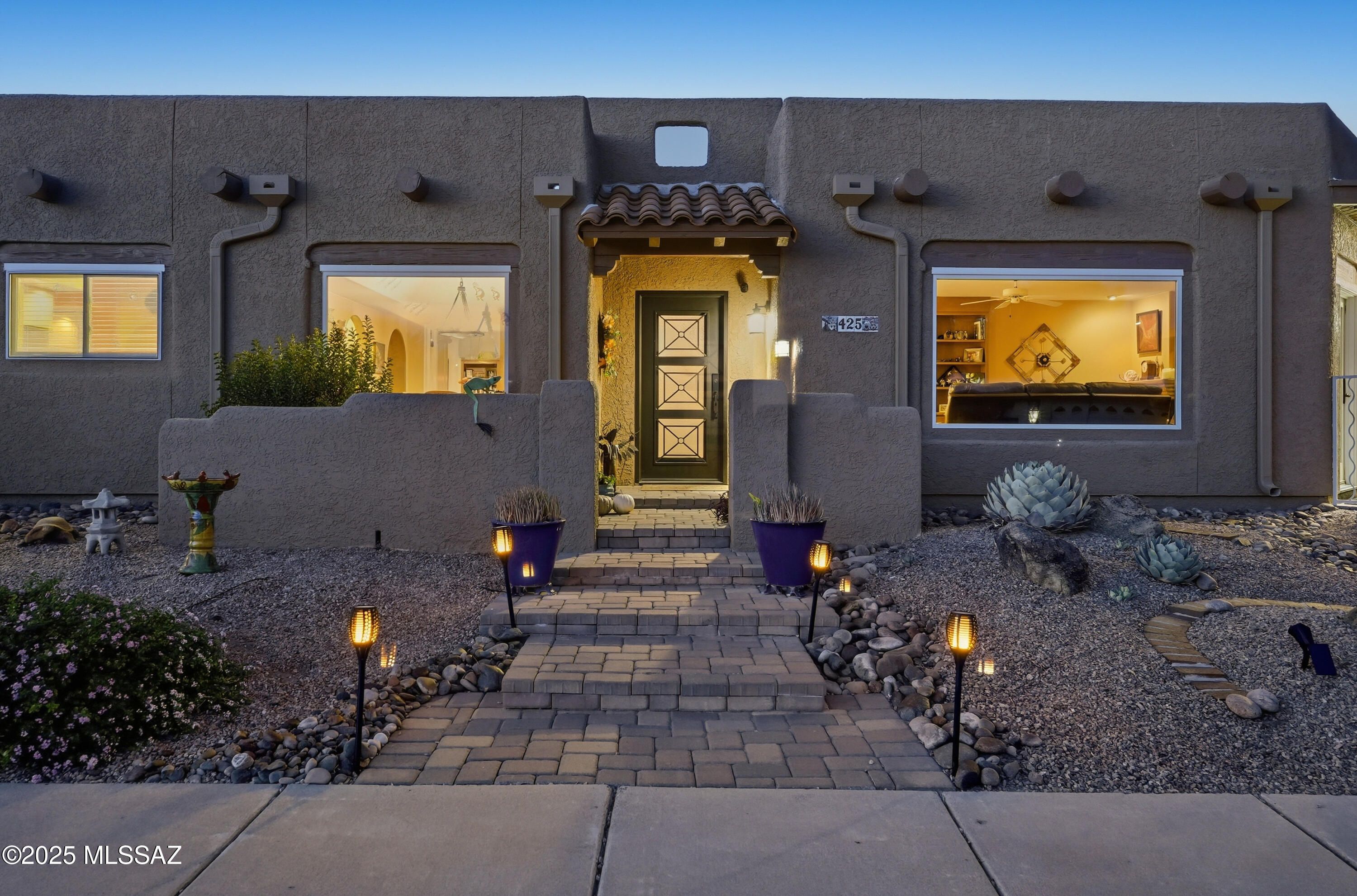 Nestled on a serene corner lot, this-one-of-a-kind townhome is a blend of desert beauty and thoughtful design. From the moment you arrive, you're greeted with natural desert blooms and a flourishing citrus tree. A true gem in Southern Arizona. Step through the designer front door and into the warm interior where rich tones set the stage for comfort and character. The cozy living room features a corner fireplace, built-in shelving and access to the private patio. The updated kitchen is a chef's delight, showcasing granite countertops, stainless steel appliances, pantry, cabinetry with pull-outs, and three lazy Susans. A sunlit breakfast nook adds a cheerful touch. The dining area is a stunning blend of rustic ambience. A large picture window frames the natural