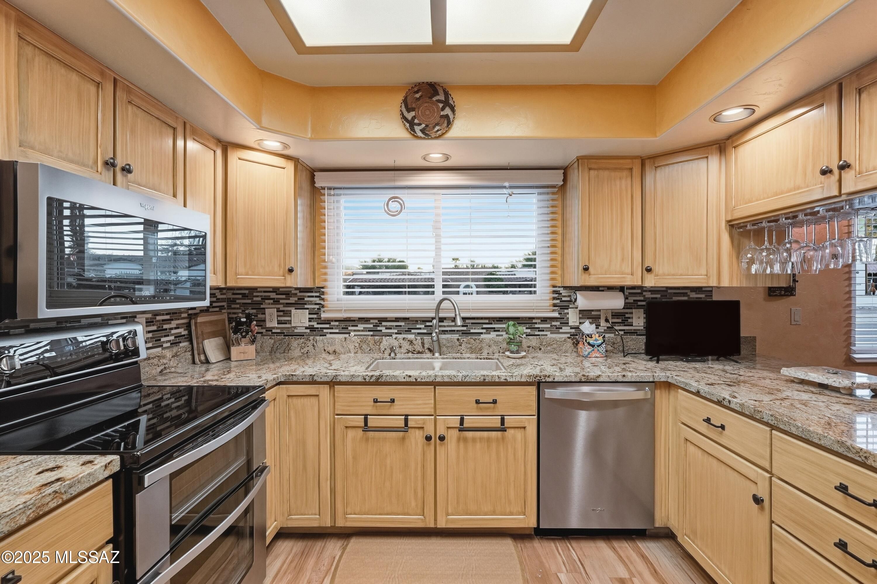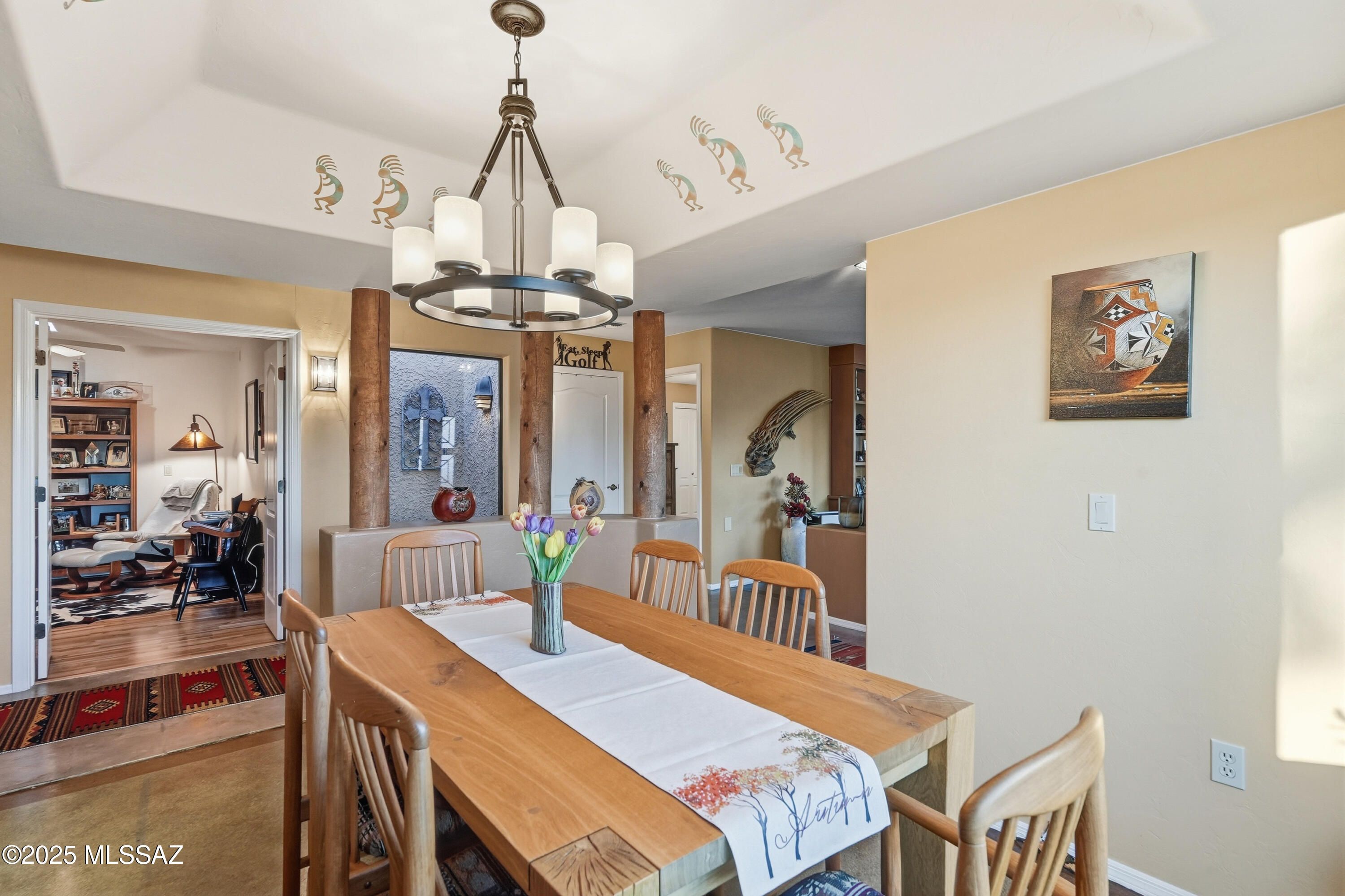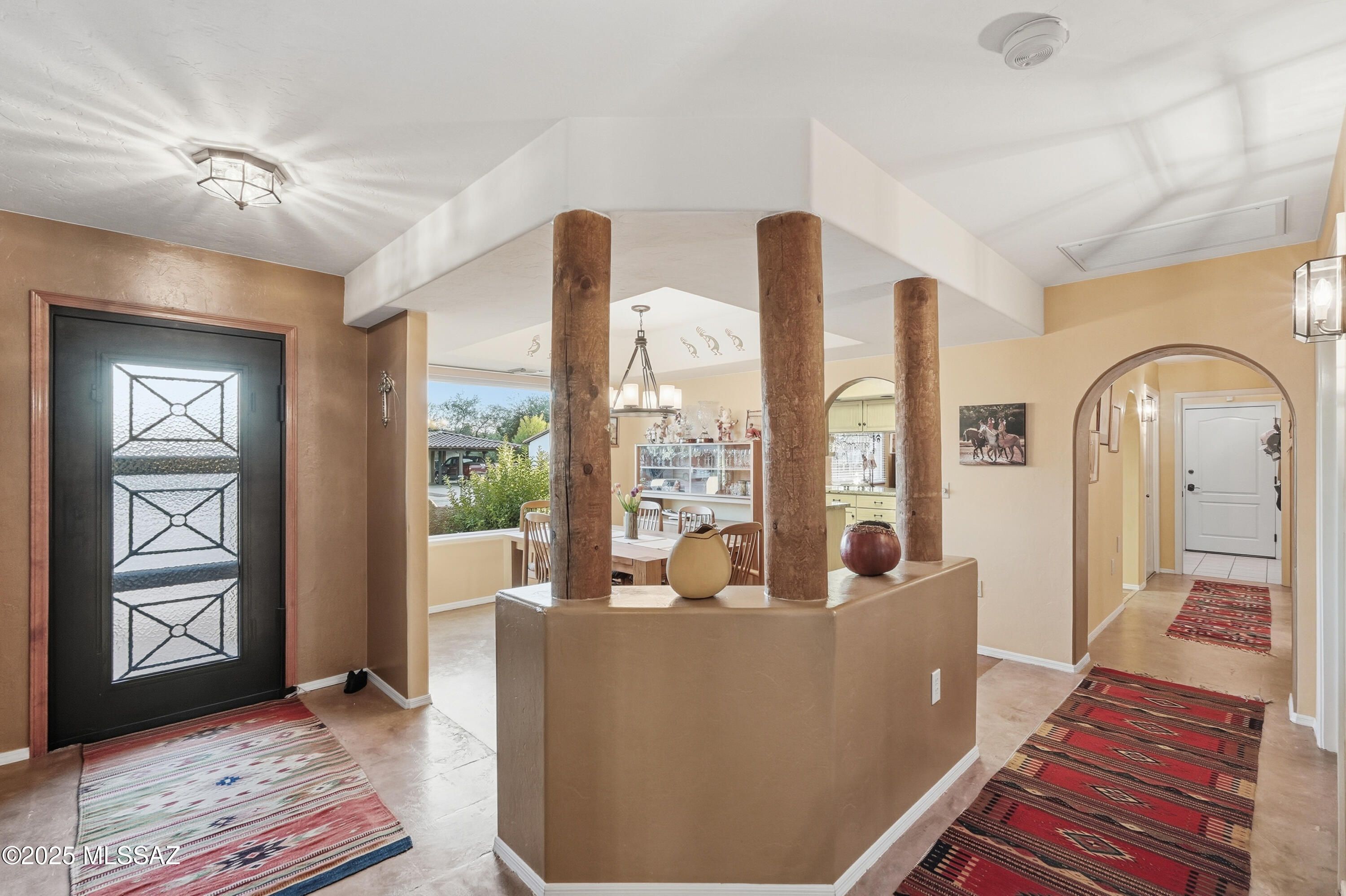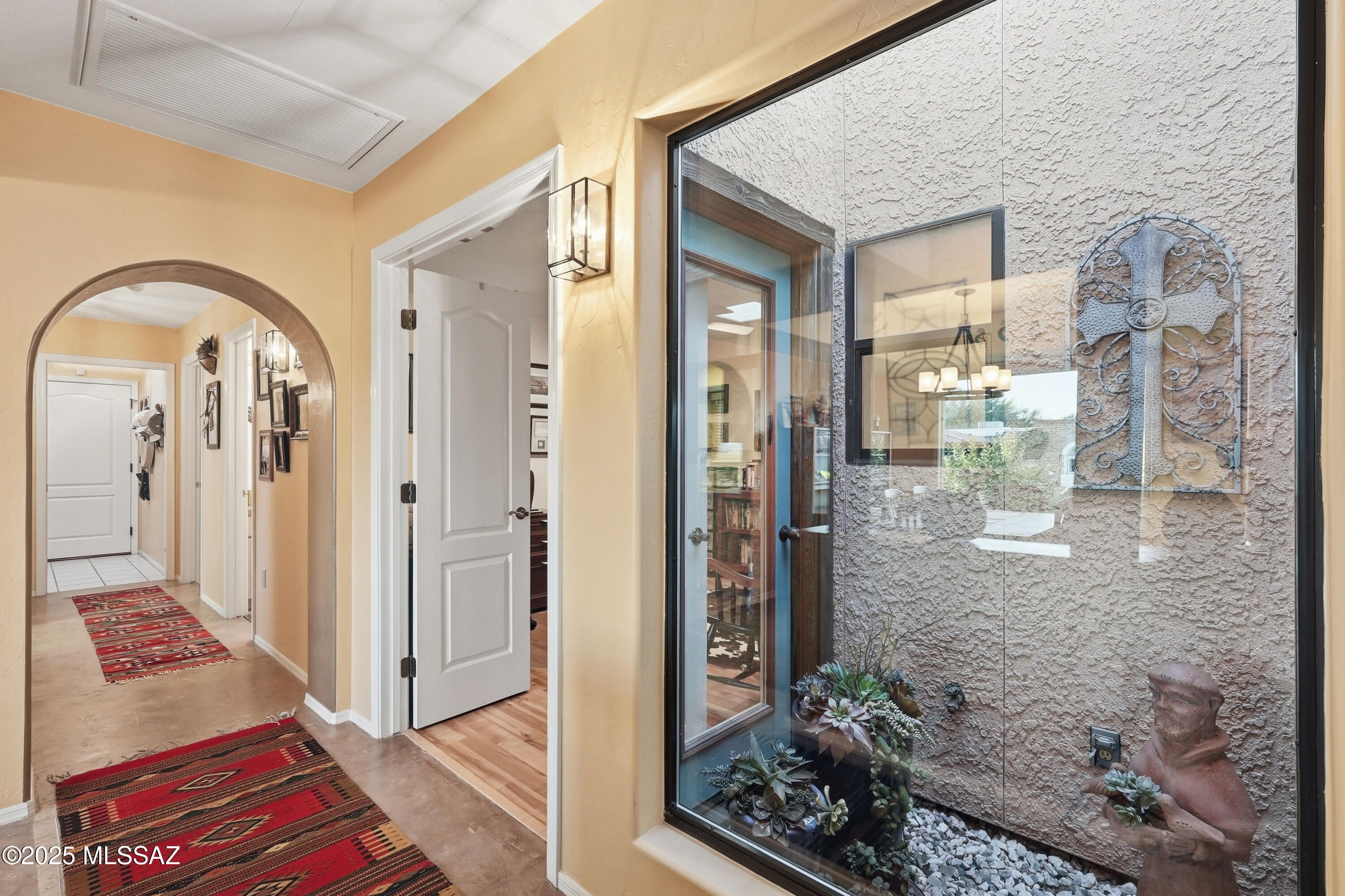 Nestled on a serene corner lot, this-one-of-a-kind townhome is a blend of desert beauty and thoughtful design. From the moment you arrive, you're greeted with natural desert blooms and a flourishing citrus tree. A true gem in Southern Arizona. Step through the designer front door and into the warm interior where rich tones set the stage for comfort and character. The cozy living room features a corner fireplace, built-in shelving and access to the private patio. The updated kitchen is a chef's delight, showcasing granite countertops, stainless steel appliances, pantry, cabinetry with pull-outs, and three lazy Susans. A sunlit breakfast nook adds a cheerful touch. The dining area is a stunning blend of rustic ambience. A large picture window frames the natural