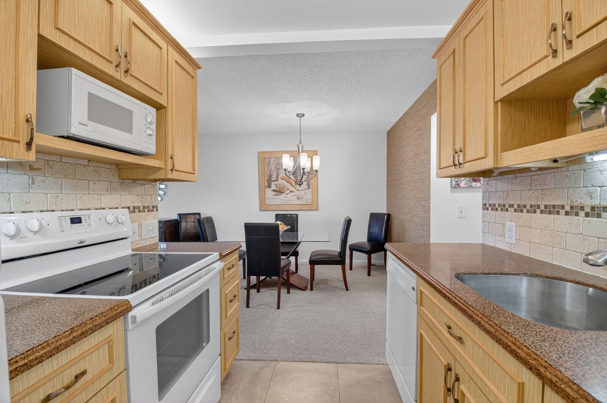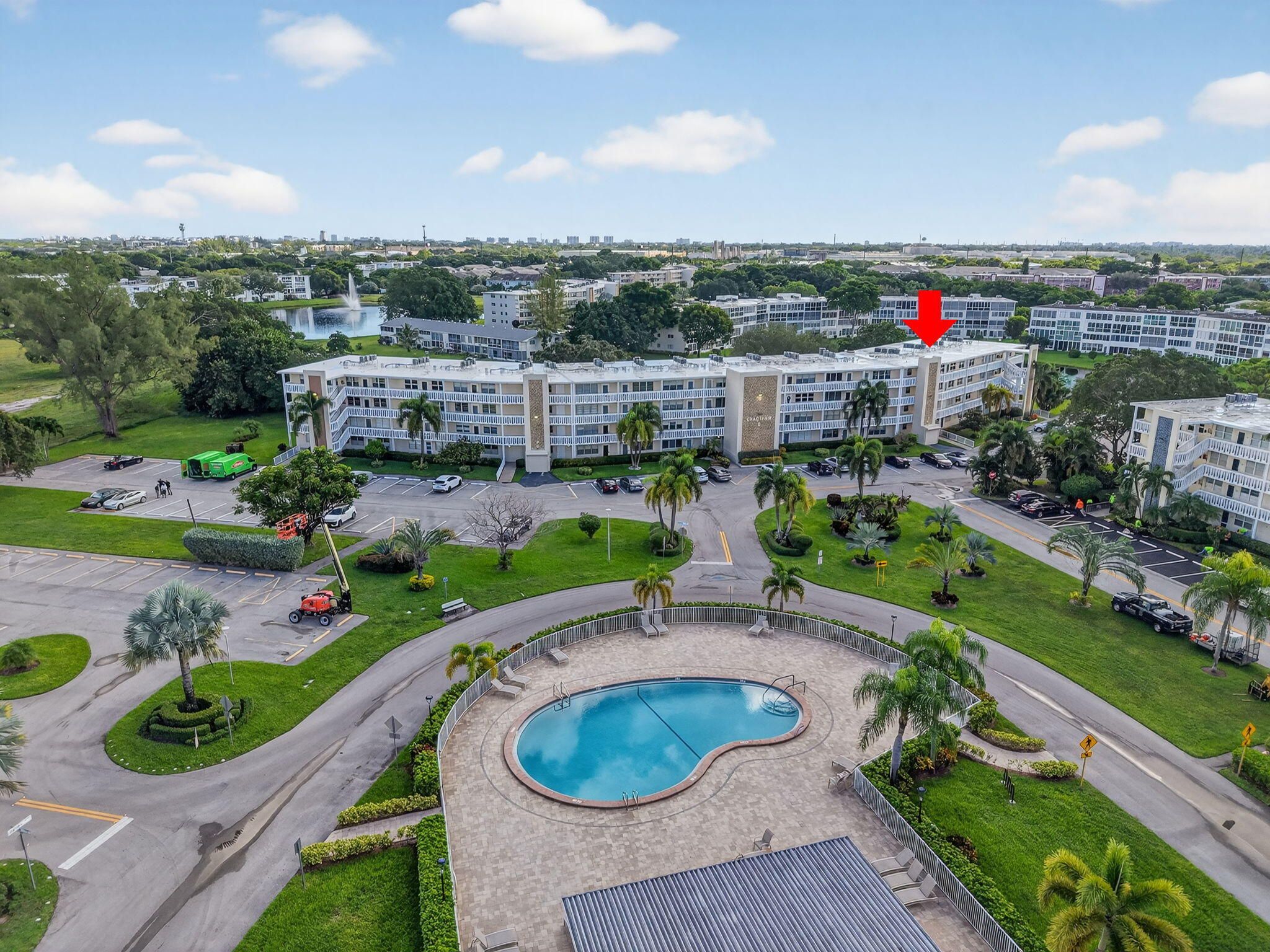 Move-in ready, bright 4th-floor condo in the desirable Grantham B building of Century Village East, conveniently close to the elevator, laundry facility, and locker storage. Features a Florida room with large windows offering a stunning lake view -- perfect as a sitting area, reading nook, or home office with treetop views. Kitchen has been thoughtfully updated for style and functionality. An assigned parking spot near the elevator is included. Enjoy the community pool right in front of the building and take advantage of all the resort-style amenities this vibrant 55+ community offers, including pools, tennis, pickleball, theater, and more! Call today for a private showing!