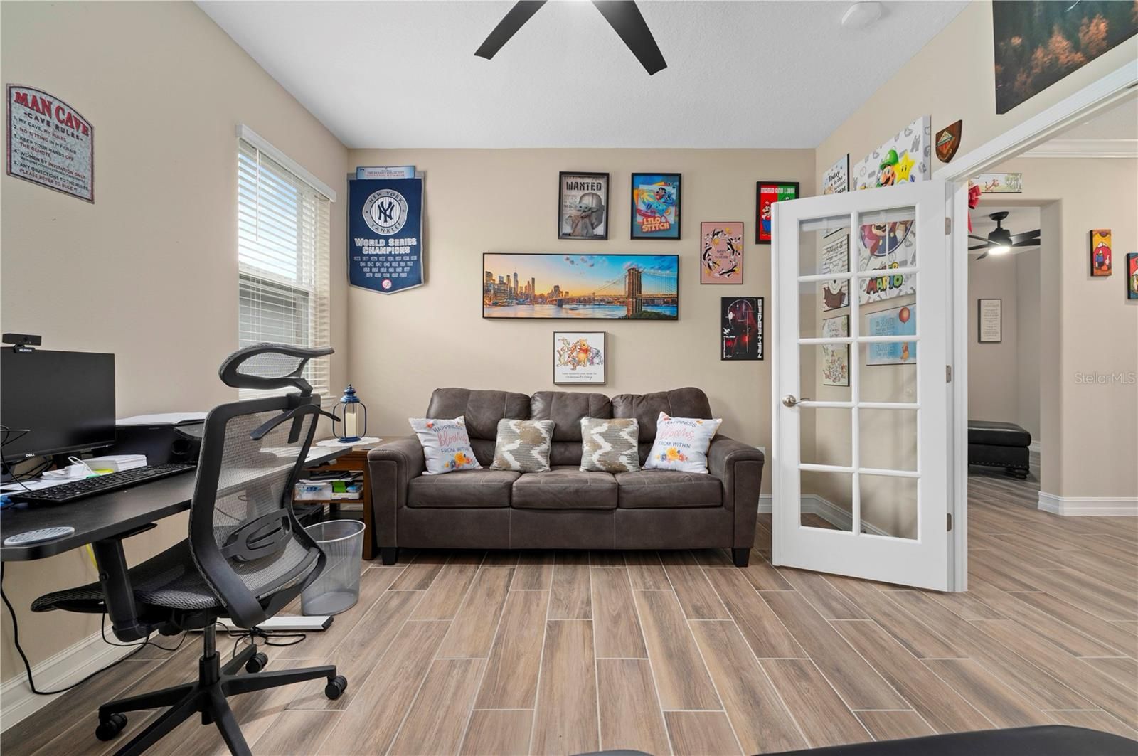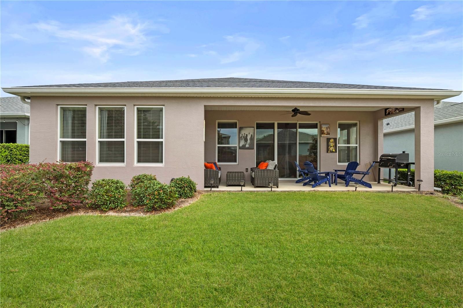 Welcome to this beautifully crafted Shea-built Declare model, a 2022 concrete block home offering 2,048 square feet of thoughtfully designed living space in the sought-after community of Ocala Preserve. This elegant 2-bedroom, 2.5-bathroom residence also features a versatile office/den with glass French doors, perfect for working from home, hosting guests, or creating a cozy reading retreat. Step inside and immediately appreciate the inviting open floor plan, enhanced by wood-look tile flooring that flows seamlessly throughout the home. Large windows fill each room with natural light, creating a bright and airy atmosphere. The split floor plan provides ideal privacy, placing the primary suite on one side of the home and the guest spaces on the other. The spacious primary bedroom is a true retreat, offering a massive walk-in closet and an ensuite bathroom complete with dual vanities and a beautifully tiled stand-up shower. The secondary bedroom is generously sized with a deep closet, and the accompanying full bathroom features a shower/tub combo and an extended vanity for added storage. A convenient half bathroom with a pedestal sink is perfectly situated for guests. Outside, the home sits on a large yard—ideal for outdoor gatherings, gardening, or simply enjoying the Florida sunshine. A 2-car garage provides plenty of storage and parking options. With modern finishes, an efficient layout, and the unmatched amenities of Ocala Preserve, this Declare model delivers comfort, style, and effortless living. Don’t miss the chance to make it yours!
