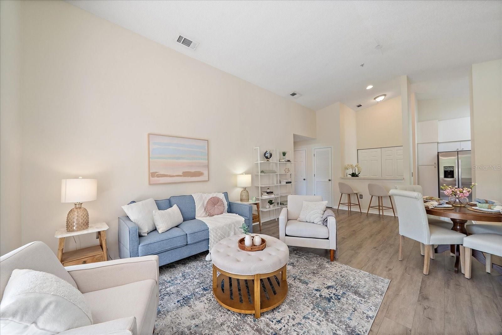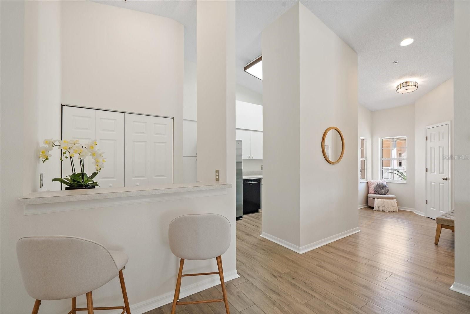 This second floor end unit in Plaza De Flores offers a larger floor plan, vaulted ceilings, concrete construction between floors, and concrete party walls between units providing added privacy and sound insulation in this gated Palmer Ranch community. With a brand new roof, new paving, and updated carports all completed in 2024, along with all assessments paid, this property offers added value and peace of mind not to mention a one year home warranty. Inside, the home has been freshly painted and features new luxury vinyl flooring throughout the entire home. The end unit positioning allows for additional natural light, creating a bright and comfortable living environment. The living room and primary suite both feature sliding glass doors that open to a private oversized, screened lanai, creating a seamless indoor outdoor flow that aligns with the Florida lifestyle. The kitchen has been refreshed with a new sink, a newer refrigerator, and a new washer and dryer. Both bathrooms include updated sinks and faucets, and the primary shower has been refreshed with new grout, contributing to the home’s clean and well maintained condition. Located in Palmer Ranch, this property offers convenient access to the Legacy Trail for biking and walking, as well as Siesta Key beaches, downtown Sarasota, shopping, dining, and I 75. The ongoing redevelopment of the former Sarasota Square Mall into a mixed use destination with retail, dining, and residential spaces continues to enhance the area’s long term appeal. Residents of Plaza De Flores enjoy a gated entrance along with amenities including a clubhouse with catering kitchen, heated pool and spa, fitness center, tennis court, and shaded outdoor gathering spaces.