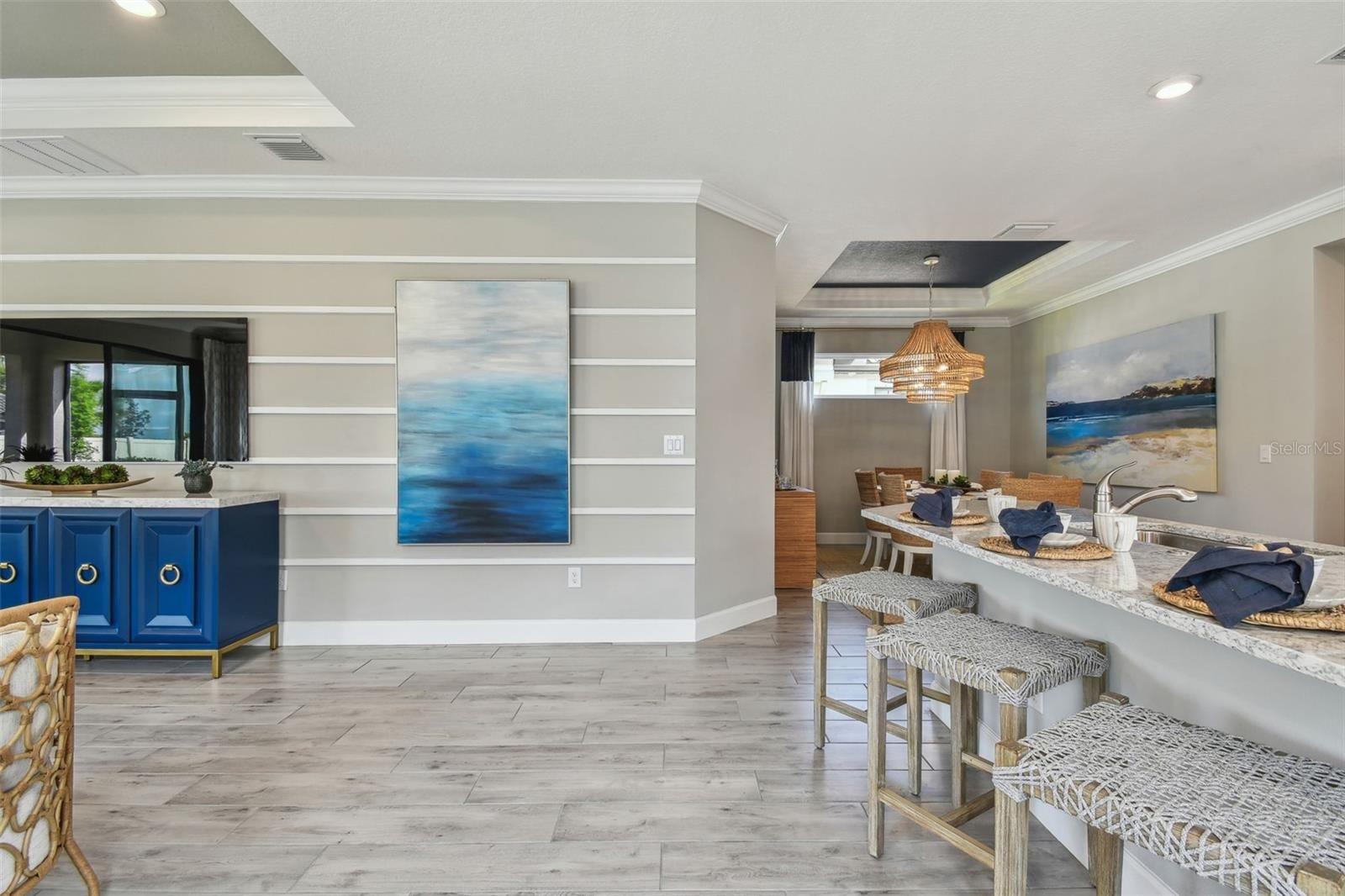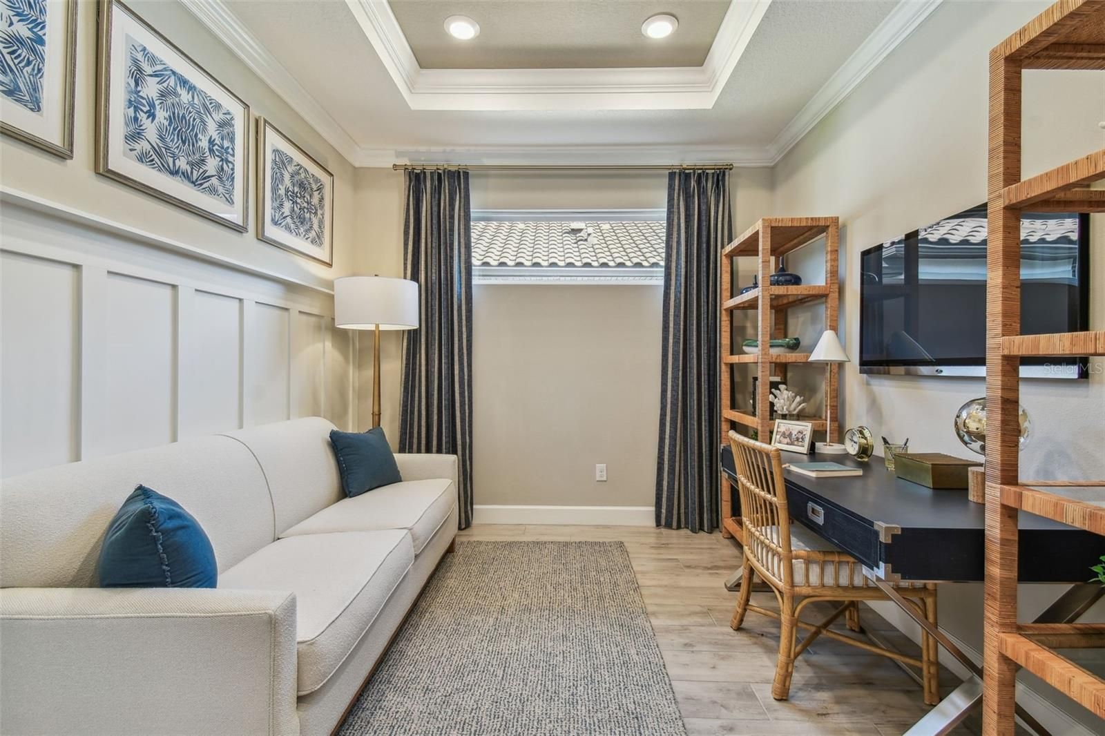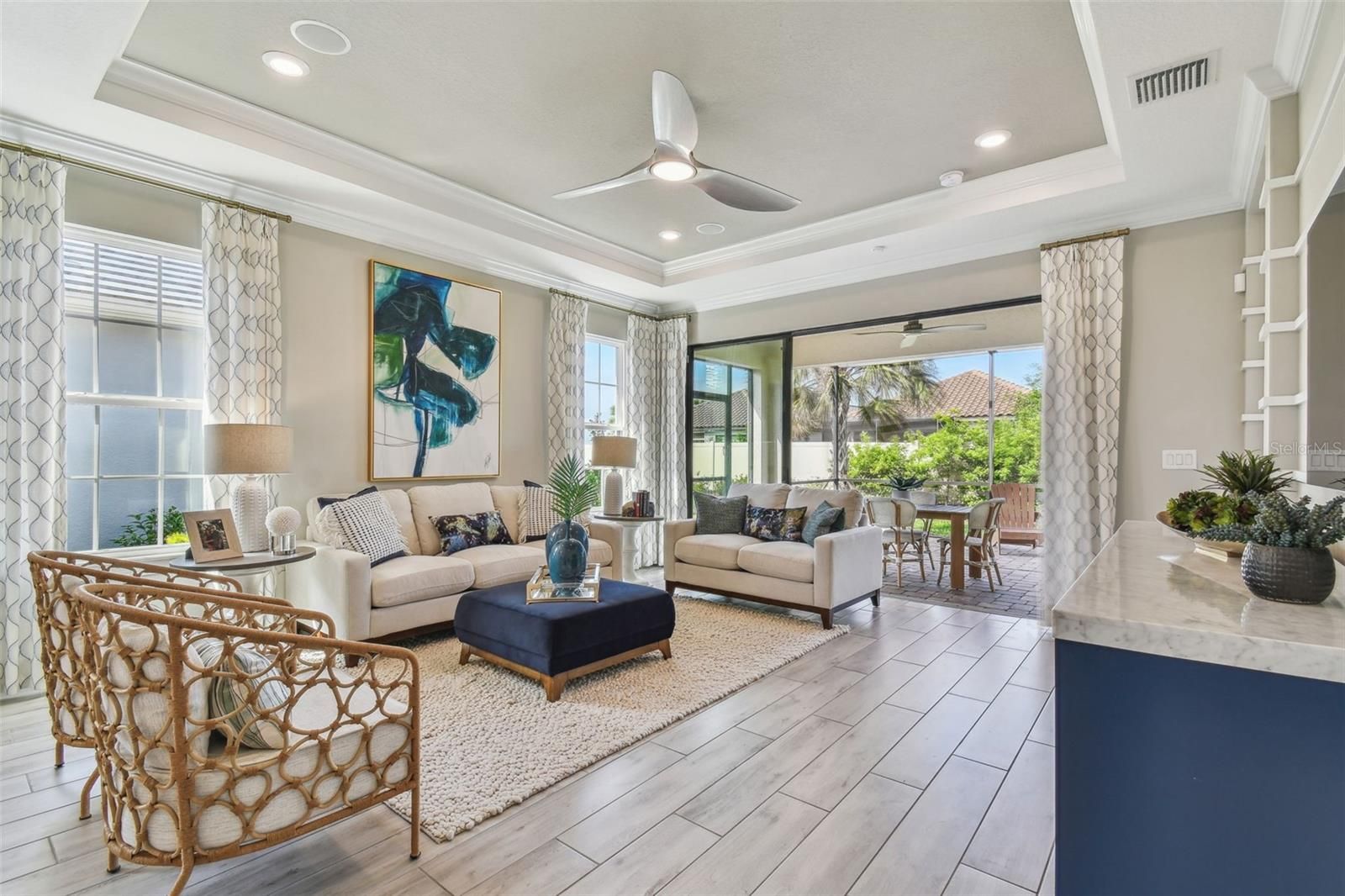 OWNER MOTIVATED!- Why wait to build? Arezzo by Taylor Morrison, a former model home is available, complete with designer selected furnishings. You will be the first to live in this home which features 1,926 SF, 3 bedrooms, 2 baths, an office/flex room, extended garage and extended screened paver lanai. You will notice the attention to detail as you enter the custom glass door to an open floor plan, upgraded gourmet kitchen overlooking a large family room and dining room, featuring 42” solid wood cushion close cabinets with crown molding, quartz counters, under cabinet LED lighting, upgraded stainless steel appliances, porcelain farm sink, pantry, subway tile backsplash, and extra counter space. The owner’s oversized suite has dual sinks, walk in shower, a two-sided closet, and a tray ceiling with crown molding. The family room boasts a tray ceilings with crown molding, and lots of natural light. Bedroom two adjoins the second bath, bedroom three has a walk-in closet. The office/flex room has French doors and custom mill work. This one-story Taylor Morrison custom home has an open floor plan with an extensive list of upgrades. These upgrades include but are not limited to designer plank tile floors throughout in common areas, electronic light package, alarm system, ceiling fans, custom designer drapes, quartz counters in baths, extended paver driveway, tile roof, large laundry room with washer, dryer, cabinets & sink, extended garage has epoxy floors, ceiling speaker package, custom lighting package in all rooms, high end furniture including Bernhardt, wall art, and many decorator accessory items, all are included in this home. Step out on to the covered and extended screened lanai and you will be ready to enjoy the Florida outdoors. Esplanade of Wiregrass Ranch has a luxurious upscale club house with full-time lifestyle and fitness directors. Esplanade of Wiregrass is an active 55+ community with resort style amenities. The Venue includes a resort style pool, hot tub, cabanas, dog park, state-of-the-art 24-hour fitness center, billiard/card room, and spa room. For active outdoor entertainment there is a firepit, tennis, pickleball, bocci, and a large meeting/gathering area. Esplanade also includes worry free yard maintenance, reclaimed water and Spectrum TV and internet package included in fees. This home is located only minutes from shopping, I-275, I-75, hospitals, restaurants, recreation, and entertainment. Come see for yourself this exquisite model perfect residence that is ready for you to move in and call it home! Please see walkthrough and Matterport 3D tours.