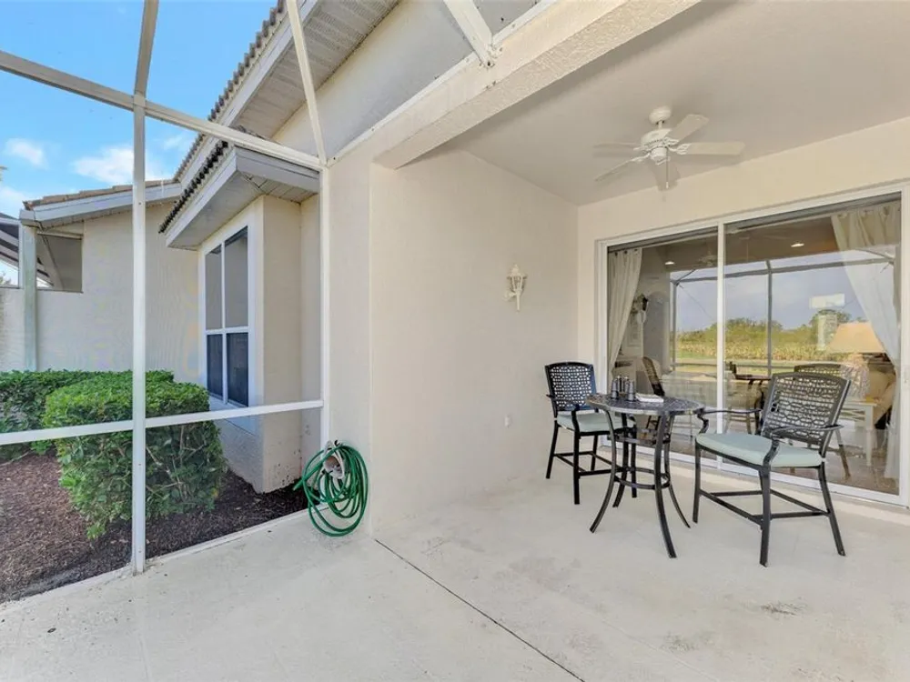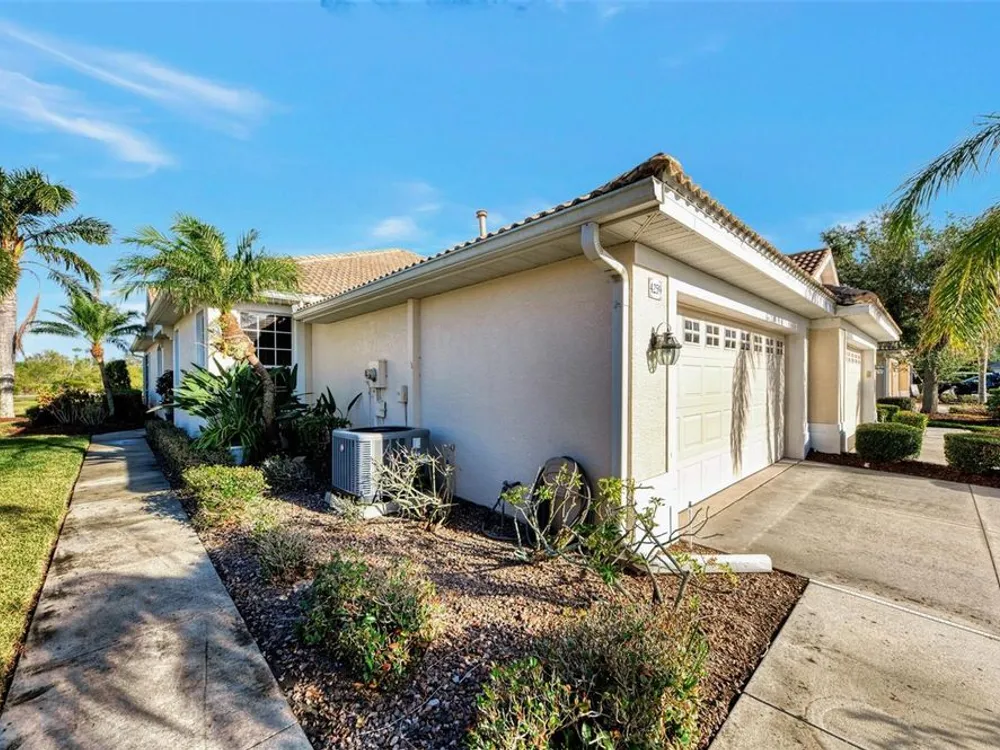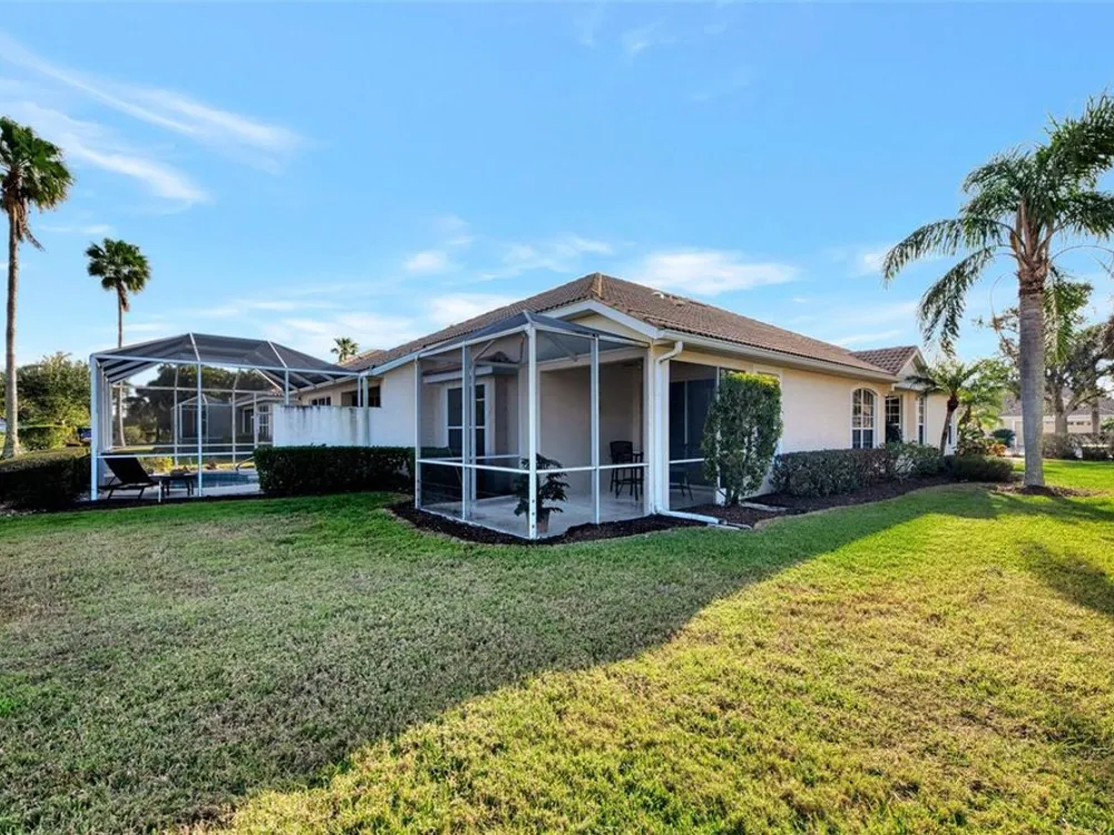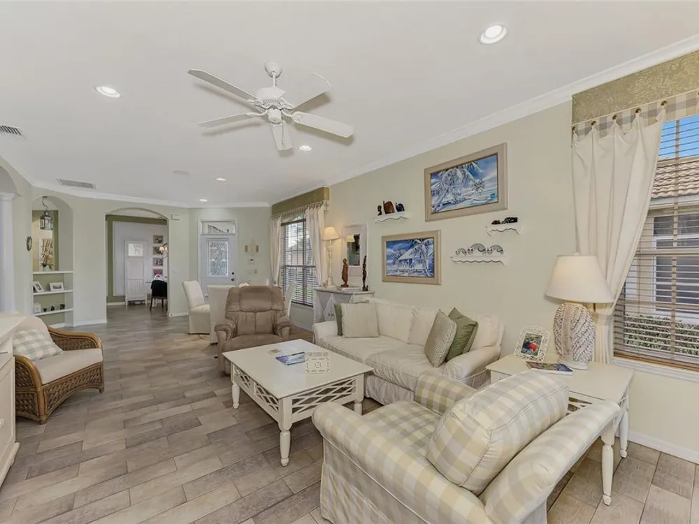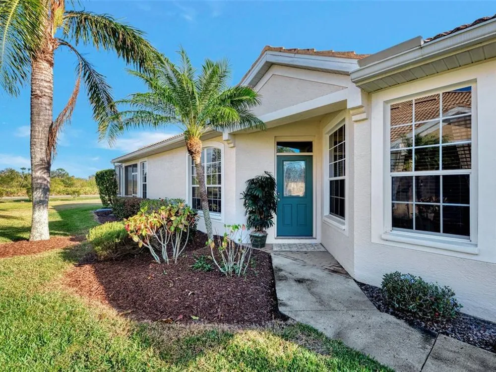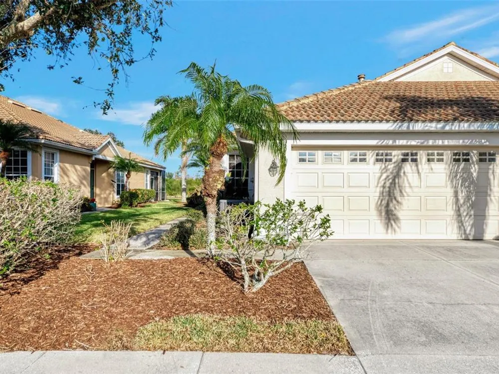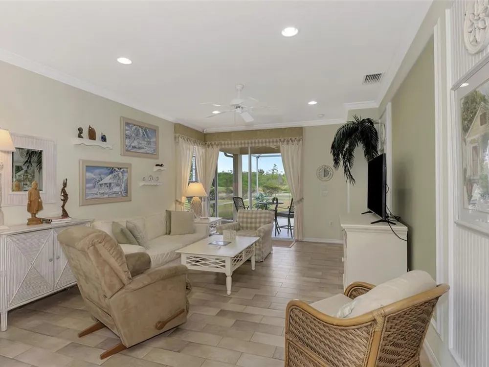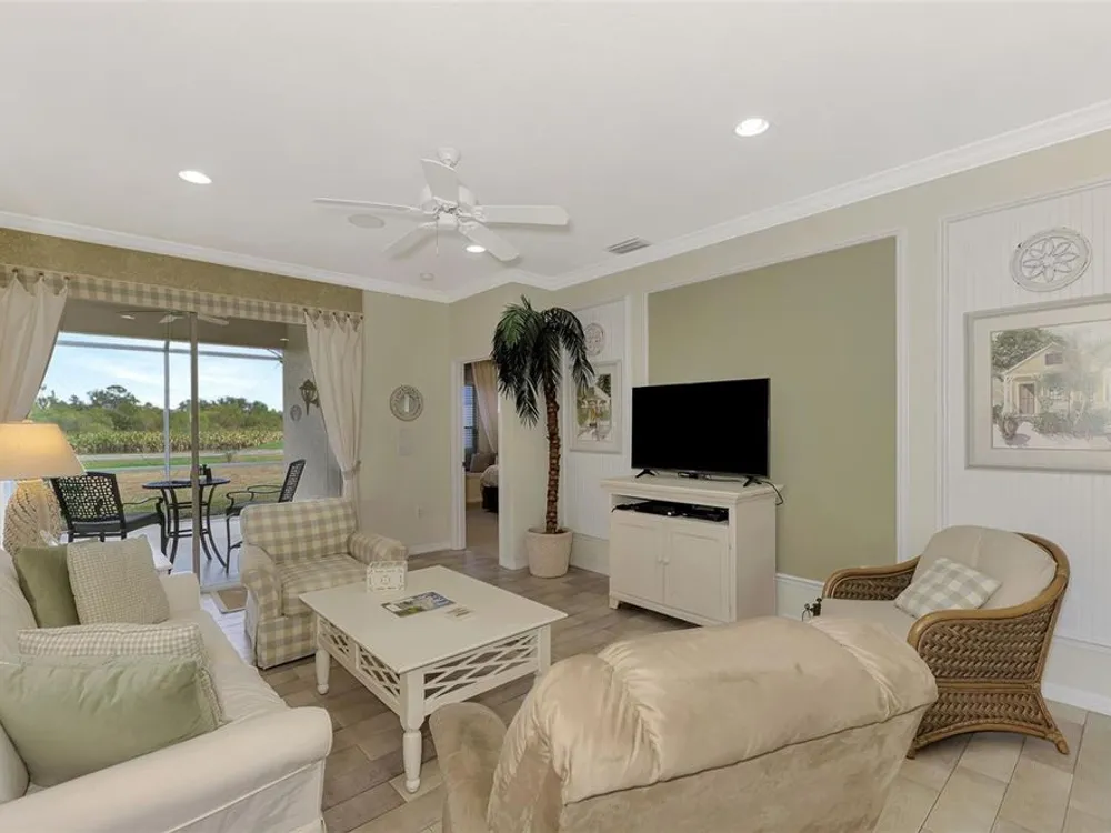 HERON CREEK GOLF & COUNTRY CLUB *TURNKEY FURNISHED *Paired Villa 2BED 2BATH +DEN with panoramic GOLF VIEW (#4 Oaks)! Available for Immediate Occupancy! This former Model is oozing with Coastal Charm, boasts over 1500 sq feet of well-designed living space and is perfectly suited for both seasonal escapes and year-round living! The desirable Bimini floor plan features a spacious open concept great room, versatile DEN/office, split bedroom plan for privacy, a fabulous Island kitchen w/sun filled dining nook and a spacious extended lanai overlooking the lush fairway! From the moment you walk through the beautiful leaded glass door you can’t help but appreciate the chic coastal casual décor and design. This villa surely shows like a model but lives like a home …it is stylish yet comfortable and inviting. Design and décor features include classic crown molding, shiplap and decorative millwork, custom window valances and drapes, decorative lighting and fans, stunning sand washed tile plank flooring throughout the living areas, tray ceilings, unique architectural details and niches, artistic wall treatments and perfectly suited furnishings and coordinating décor! The well-appointed Kitchen has abundant cabinetry and workspace, a NATURAL GAS range and is fully equipped with dinnerware, small appliances & pots and pans. Linens and Towels are also included for both bedrooms so all you really need is your suitcase! This villa could also be a great investment opportunity used as a seasonal rental (MIN RENTAL 3 MONTH). The den features a custom built in desk and workstation perfect for a home office. The Primary suite is bright and cheerful with a large double window and features a great window seat with hidden storage. The ensuite bath has dual vanities, a spacious walk-in shower, clothes closet, separate linen closet and has a tubular skylight that brings in abundant natural light. Guests can enjoy privacy in their own bedroom with adjacent full bath at the front of the home. This beautiful villa is ready to warm your heart just in time for Valentines Day! Heron Creek offers exceptional amenities including a 21,000 sq ft clubhouse, 27 holes of Championship golf Arthur Hills design, resort style pool & spa, a robust social activity calendar, fitness center, Tennis courts & formal & casual dining options! Club Membership is required with 3 membership levels offered beginning at $268/month *NO CDD FEES * LOW HOA FEES include lawn care, trimmings, mulching, irrigation, Cable HIGH-SPEED INTERNET &Gated entry, conveniently located w/easy access to I-75 & US-41, Cocoa Plum Shopping, Myakkahatchee Creek trails, WELLEN PARK, Braves Stadium, COSTCO & new SMH health