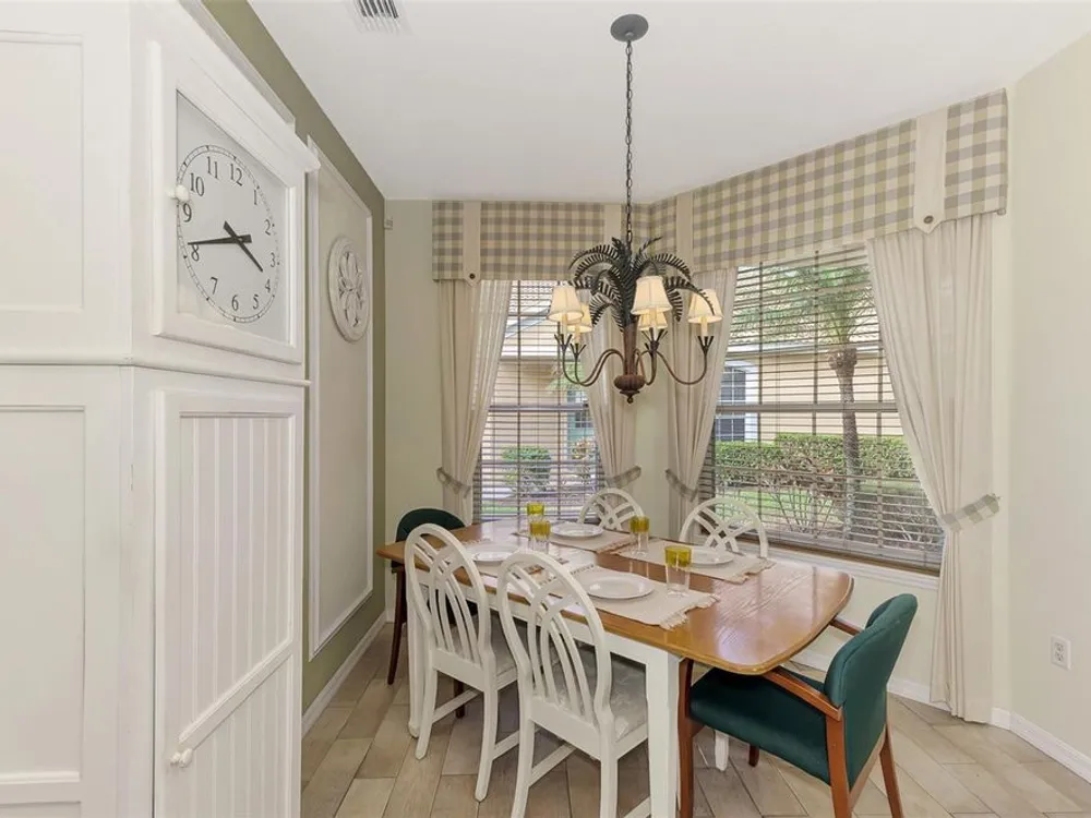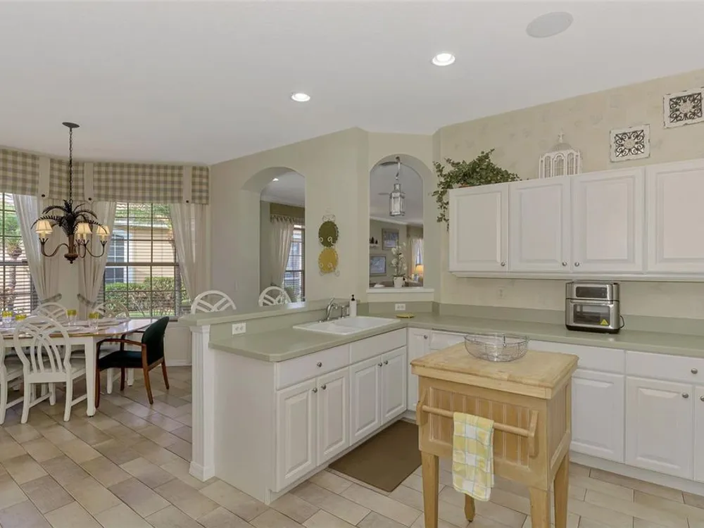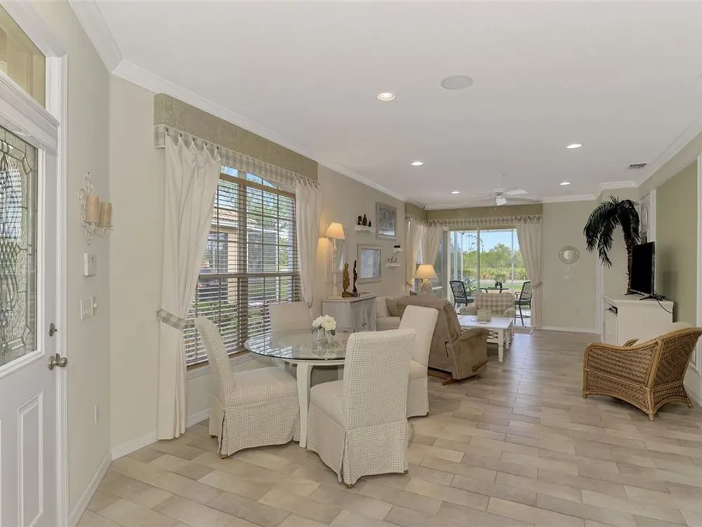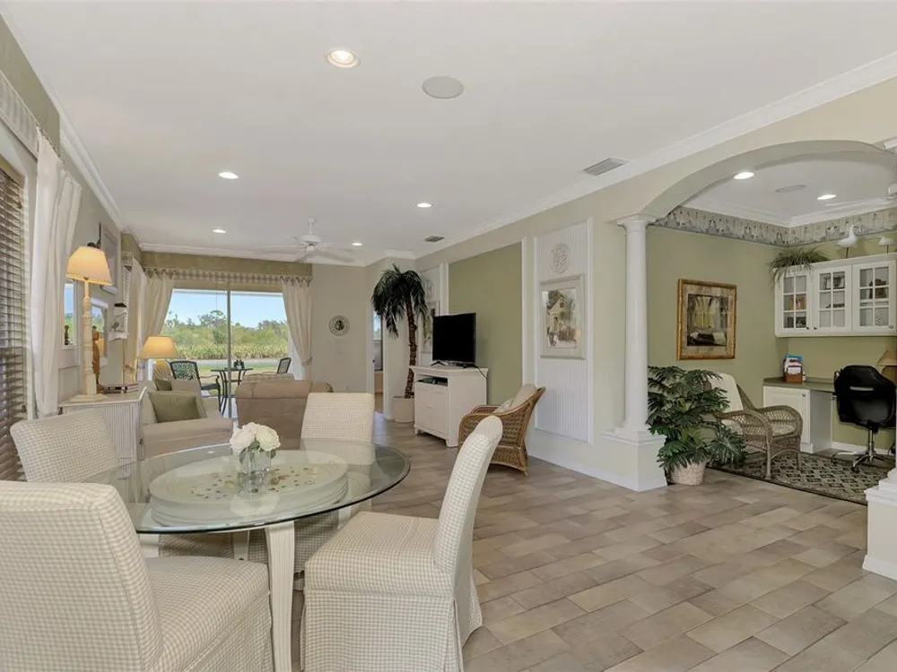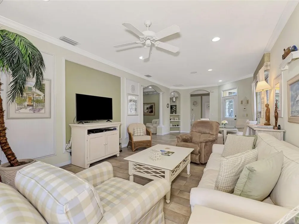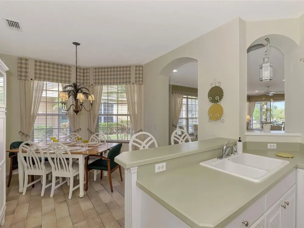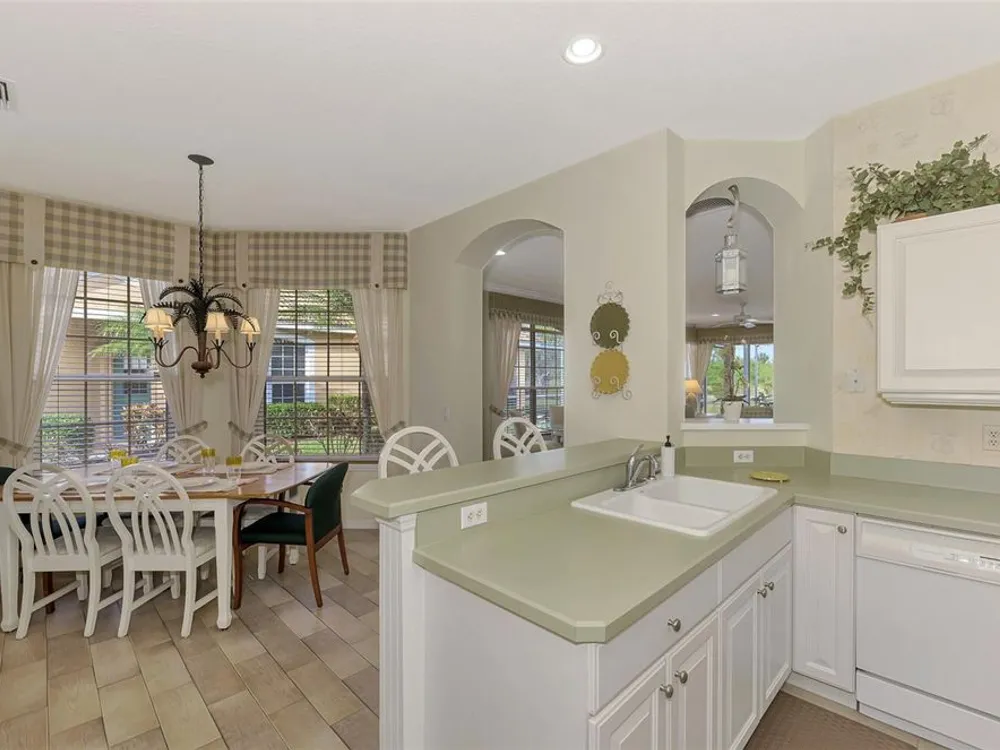 HERON CREEK GOLF & COUNTRY CLUB *TURNKEY FURNISHED *Paired Villa 2BED 2BATH +DEN with panoramic GOLF VIEW (#4 Oaks)! Available for Immediate Occupancy! This former Model is oozing with Coastal Charm, boasts over 1500 sq feet of well-designed living space and is perfectly suited for both seasonal escapes and year-round living! The desirable Bimini floor plan features a spacious open concept great room, versatile DEN/office, split bedroom plan for privacy, a fabulous Island kitchen w/sun filled dining nook and a spacious extended lanai overlooking the lush fairway! From the moment you walk through the beautiful leaded glass door you can’t help but appreciate the chic coastal casual décor and design. This villa surely shows like a model but lives like a home …it is stylish yet comfortable and inviting. Design and décor features include classic crown molding, shiplap and decorative millwork, custom window valances and drapes, decorative lighting and fans, stunning sand washed tile plank flooring throughout the living areas, tray ceilings, unique architectural details and niches, artistic wall treatments and perfectly suited furnishings and coordinating décor! The well-appointed Kitchen has abundant cabinetry and workspace, a NATURAL GAS range and is fully equipped with dinnerware, small appliances & pots and pans. Linens and Towels are also included for both bedrooms so all you really need is your suitcase! This villa could also be a great investment opportunity used as a seasonal rental (MIN RENTAL 3 MONTH). The den features a custom built in desk and workstation perfect for a home office. The Primary suite is bright and cheerful with a large double window and features a great window seat with hidden storage. The ensuite bath has dual vanities, a spacious walk-in shower, clothes closet, separate linen closet and has a tubular skylight that brings in abundant natural light. Guests can enjoy privacy in their own bedroom with adjacent full bath at the front of the home. This beautiful villa is ready to warm your heart just in time for Valentines Day! Heron Creek offers exceptional amenities including a 21,000 sq ft clubhouse, 27 holes of Championship golf Arthur Hills design, resort style pool & spa, a robust social activity calendar, fitness center, Tennis courts & formal & casual dining options! Club Membership is required with 3 membership levels offered beginning at $268/month *NO CDD FEES * LOW HOA FEES include lawn care, trimmings, mulching, irrigation, Cable HIGH-SPEED INTERNET &Gated entry, conveniently located w/easy access to I-75 & US-41, Cocoa Plum Shopping, Myakkahatchee Creek trails, WELLEN PARK, Braves Stadium, COSTCO & new SMH health
