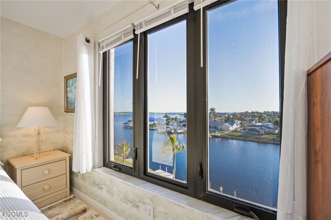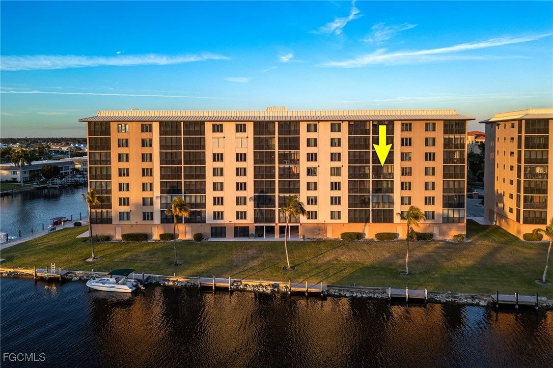 Wake up to sunrises and unwind with sunsets overlooking the Caloosahatchee River. This light and bright 2-bedroom, 2-bath 5th-floor waterfront condo offers sweeping southwest views of the river and intersecting canals, where dolphins, manatees, and stingrays are often part of the daily scenery. Located riverside in the well-maintained River Towers community at the end of palm-tree-lined Beach Parkway, this condo is priced to sell and allows room for updating while staying within budget—a fantastic opportunity to personalize a riverfront home to your taste. The balcony extends the living area, creating a comfortable space to relax and take in the views. The unit features tile flooring throughout, a whole-house water purifier, and washer and dryer inside the unit, and is offered fully furnished for an easy transition. River Towers offers a true waterfront lifestyle with a heated riverside pool, tiki hut, fishing pier, grilling areas, shuffleboard, library, and community rooms. Kayak launch and storage rack is coming soon. Each unit includes one assigned parking space, ample guest parking, and a 10x10 ground-floor storage unit, plus community laundry for oversized items. Boat docks are available on a first-come, first-served basis. This 55+ community is non-smoking, no pets, and ideal for seasonal enjoyment or comfortable year-round living. When it comes to location, this one truly delivers. Enjoy walking distance to the soon-to-reopen Jaycee Park, where Beach Parkway leads directly to the riverfront and scenic walking and biking paths. Live life on the river with daily walks, bike rides, and sunset strolls right next door.