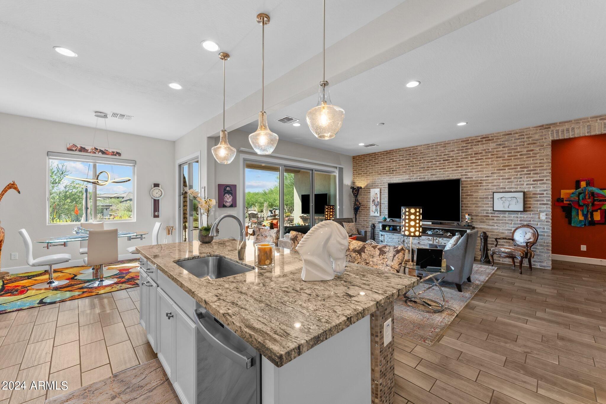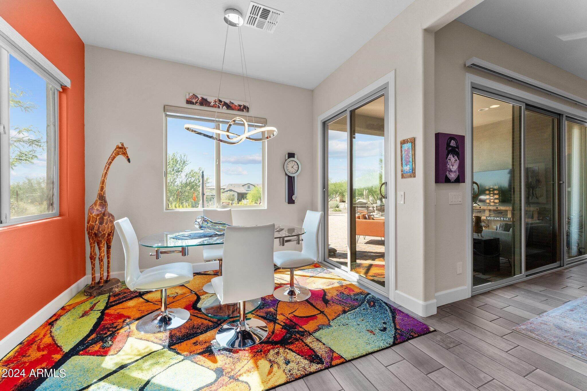 This beautifully upgraded Hotel California model in Wickenburg Ranch offers the perfect blend of elegance and functionality. Situated on a premium corner lot, the home features 2 bedrooms, 2.5 bathrooms, a rare find for this model, and an open floor plan designed for modern living. The upgraded kitchen boasts a large island and a premium gas stove package, ideal for home chefs and entertaining. The guest bedroom is thoughtfully extended by 2 feet, complete with an en suite bathroom for added privacy. The entire home showcases unique upgrades with stylish tile flooring, upgraded lighting fixtures, and ceiling fans throughout. Outside, the spacious backyard impresses with extensive landscaping and a large paver patio, perfect for outdoor gatherings.