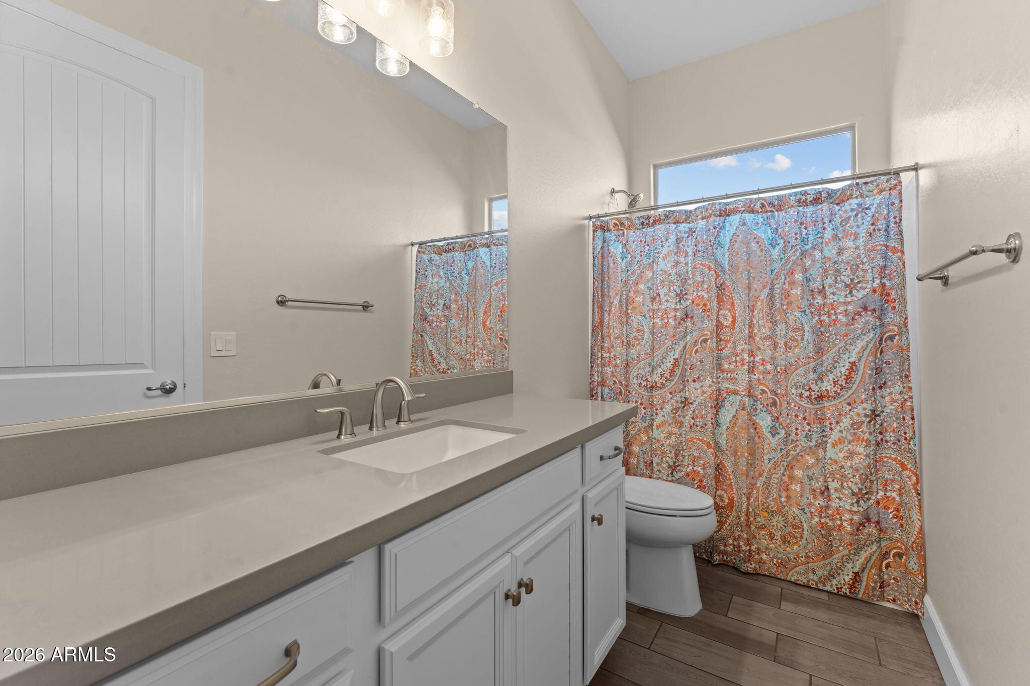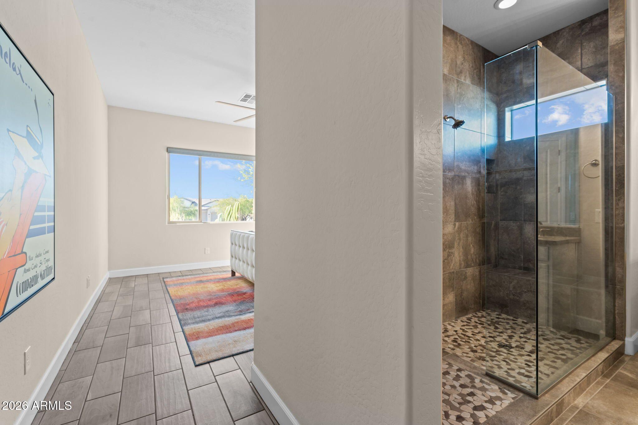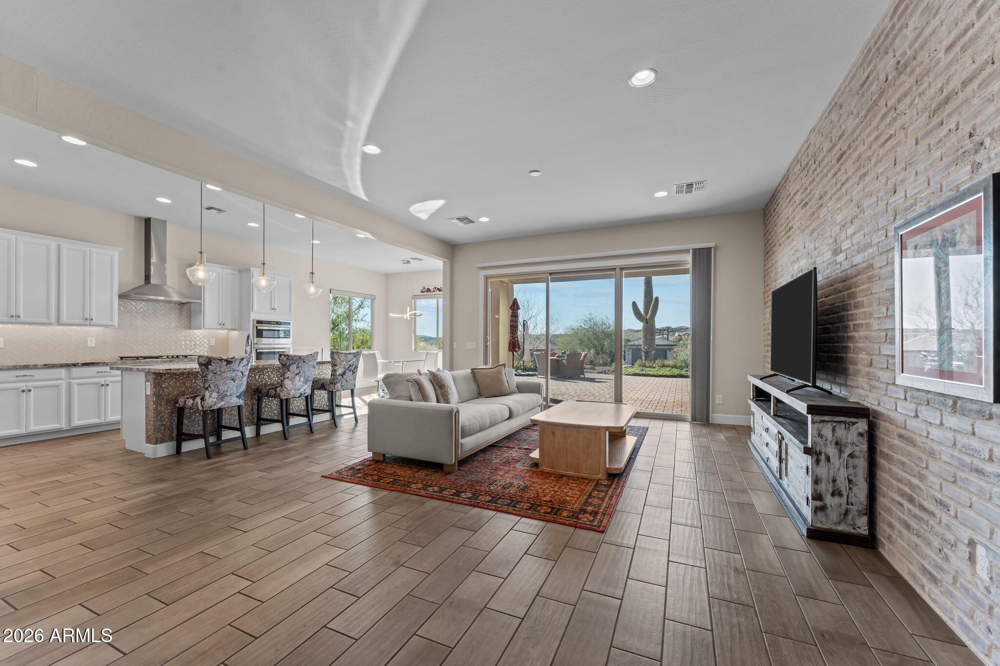 All indoor furniture and decor comes with this beautifully upgraded Hotel California model in Wickenburg Ranch. This home offers the perfect blend of elegance and functionality. Situated on a premium corner lot, the home features 2 beds, 2.5 baths, a rare find for this model, and an open floor plan designed for modern living. The upgraded kitchen boasts a large island and a premium gas stove package, ideal for home chefs and entertaining. The guest bedroom is extended by 2 feet, complete with an en suite bathroom for added privacy. The entire home showcases unique upgrades with stylish tile flooring, upgraded lighting fixtures, and ceiling fans throughout. Outside, the spacious backyard impresses with extensive landscaping and a large paver patio, perfect for outdoor gatherings