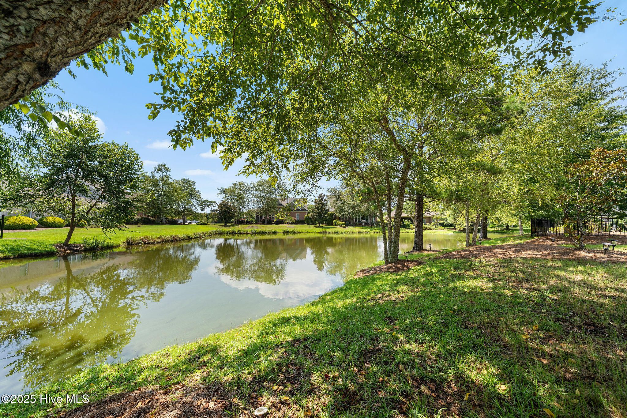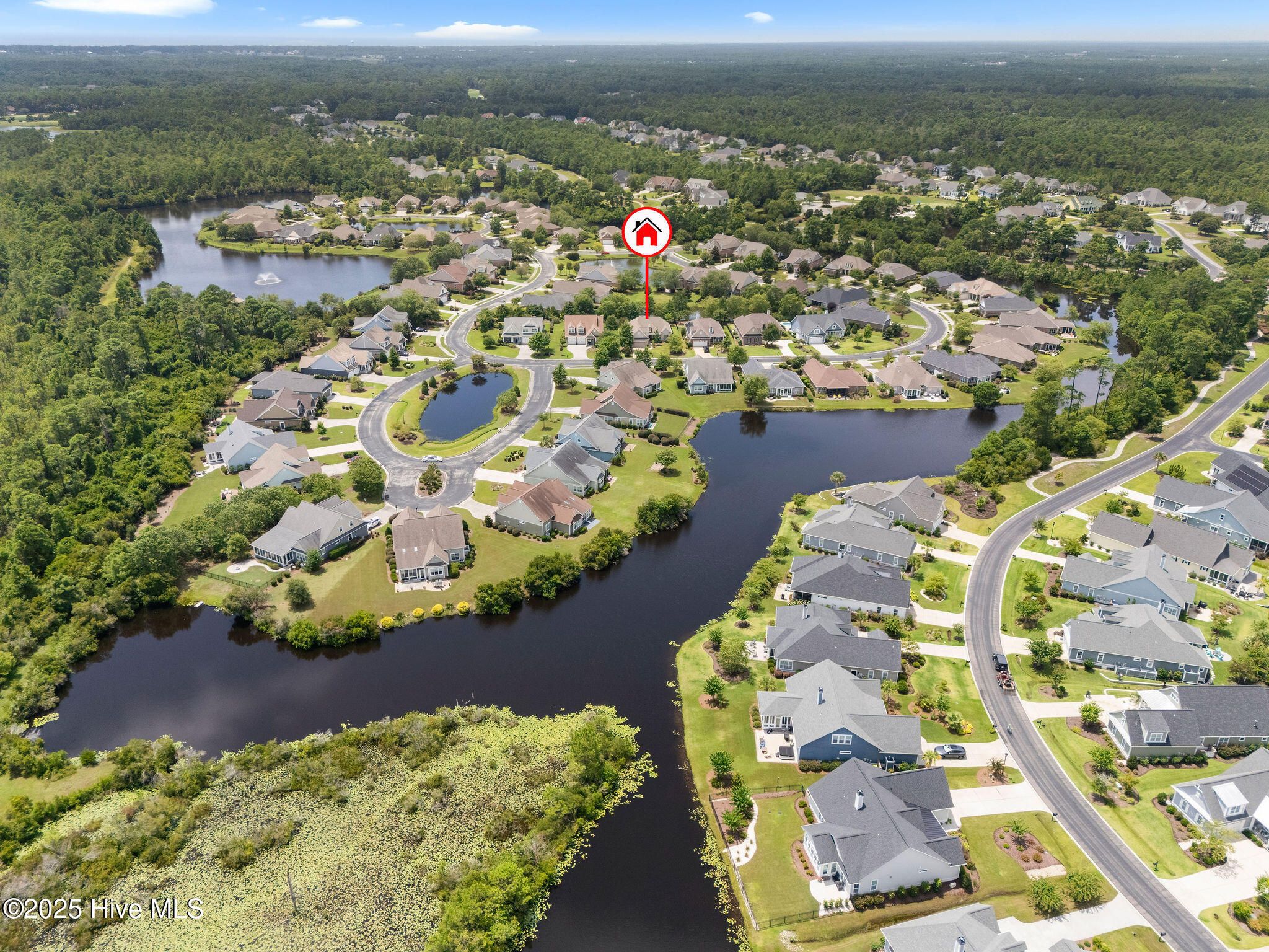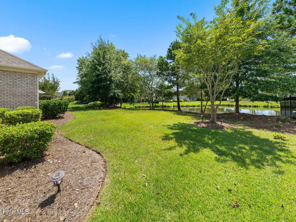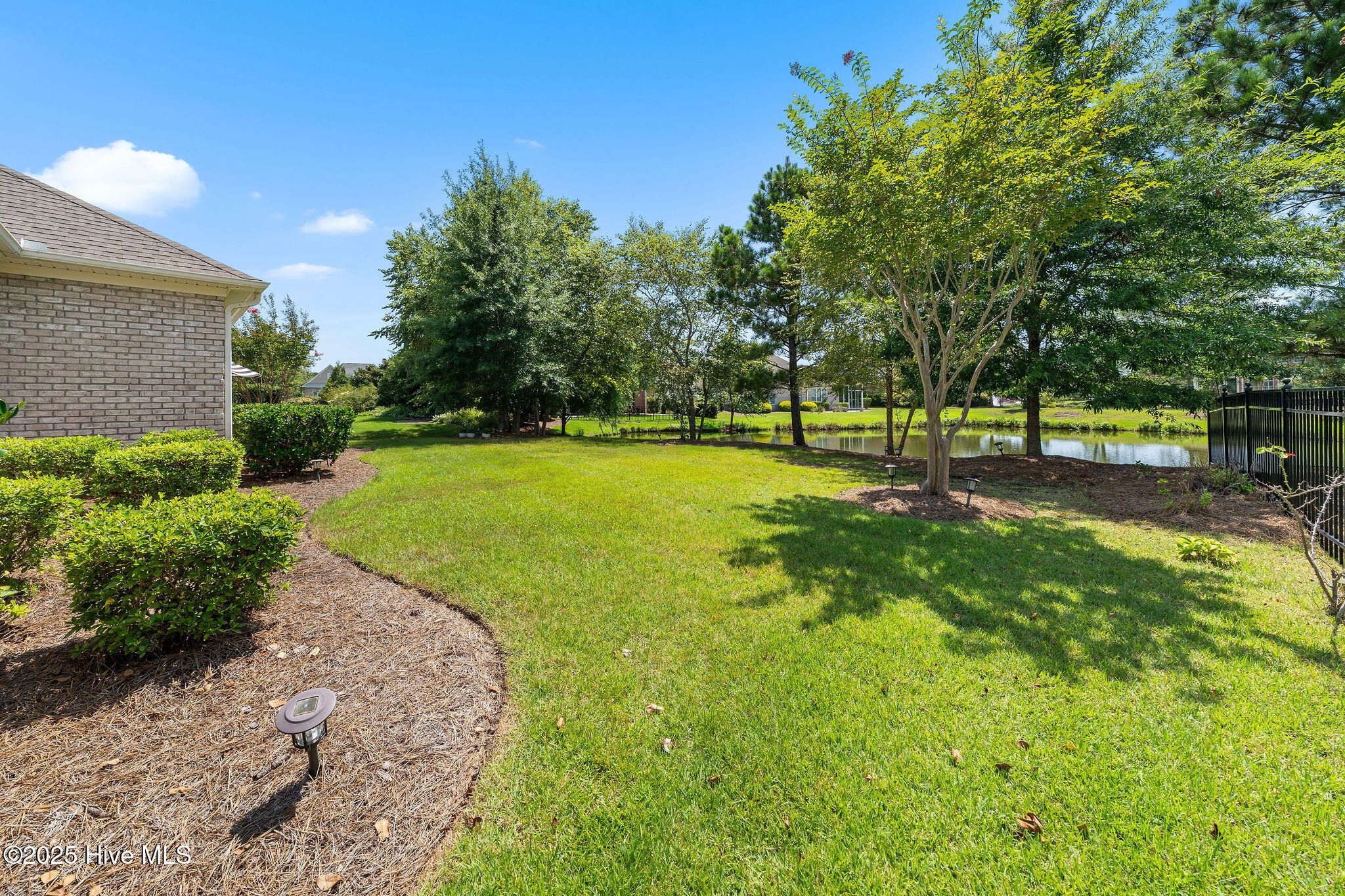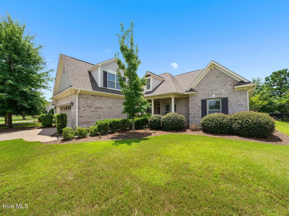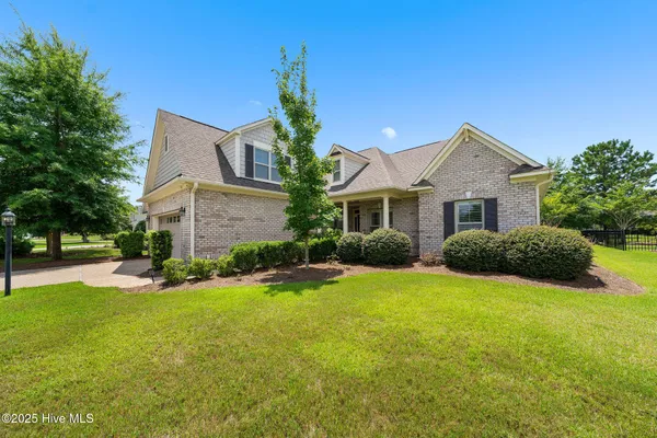 This beautiful all-brick home enjoys peaceful pond views and is located in the Regency Lakes neighborhood of St. James Plantation. Regency Lakes offers maintenance free lawncare/landscaping and is conveniently located just minutes to the Players Club amenity center and entry/exit. This one-story open floorplan offers 4 bedrooms, 3 bathrooms, and 2,440 square feet of comfortable living space. An aggregate driveway and walkway lead through the front yard to a welcoming front porch, where stately columns and a charming beadboard ceiling create a warm first impression. Step inside the entryway, where wide plank engineered hardwood floors and a graceful arched doorway invite you into the formal dining room. This area features crown molding, custom wainscoting, and angled walls that add architectural interest. Plantation shutters decorate the windows throughout the main living area. Beyond the dining room, the spacious great room welcomes you with a vaulted ceiling, electric fireplace flanked by custom built-ins, and an open flow into the adjacent kitchen. A central island beneath pendant lighting offers counter-height seating, while a raised shelf cleverly conceals dishes and includes convenient electrical outlets. The kitchen is complete with stainless steel appliances, ample cabinetry, a pantry, a warm tumbled tile backsplash, and views of the pond and wildlife. A built-in desk provides the perfect space for organizational needs, and a charming breakfast nook offers additional seating for casual meals. Step through the arched opening into the sunroom where peaceful backyard views of the pond can be seen from every window. The sunroom opens directly to a concrete patio, an ideal spot for grilling and taking in the mild Carolina weather. The master suite is a true retreat, featuring an elegant octagon-shaped tray ceiling and hardwood floors that transition seamlessly to tile as you enter the en-suite bathroom. Here, a dual sink vanity, a linen closet, and a zero-entry