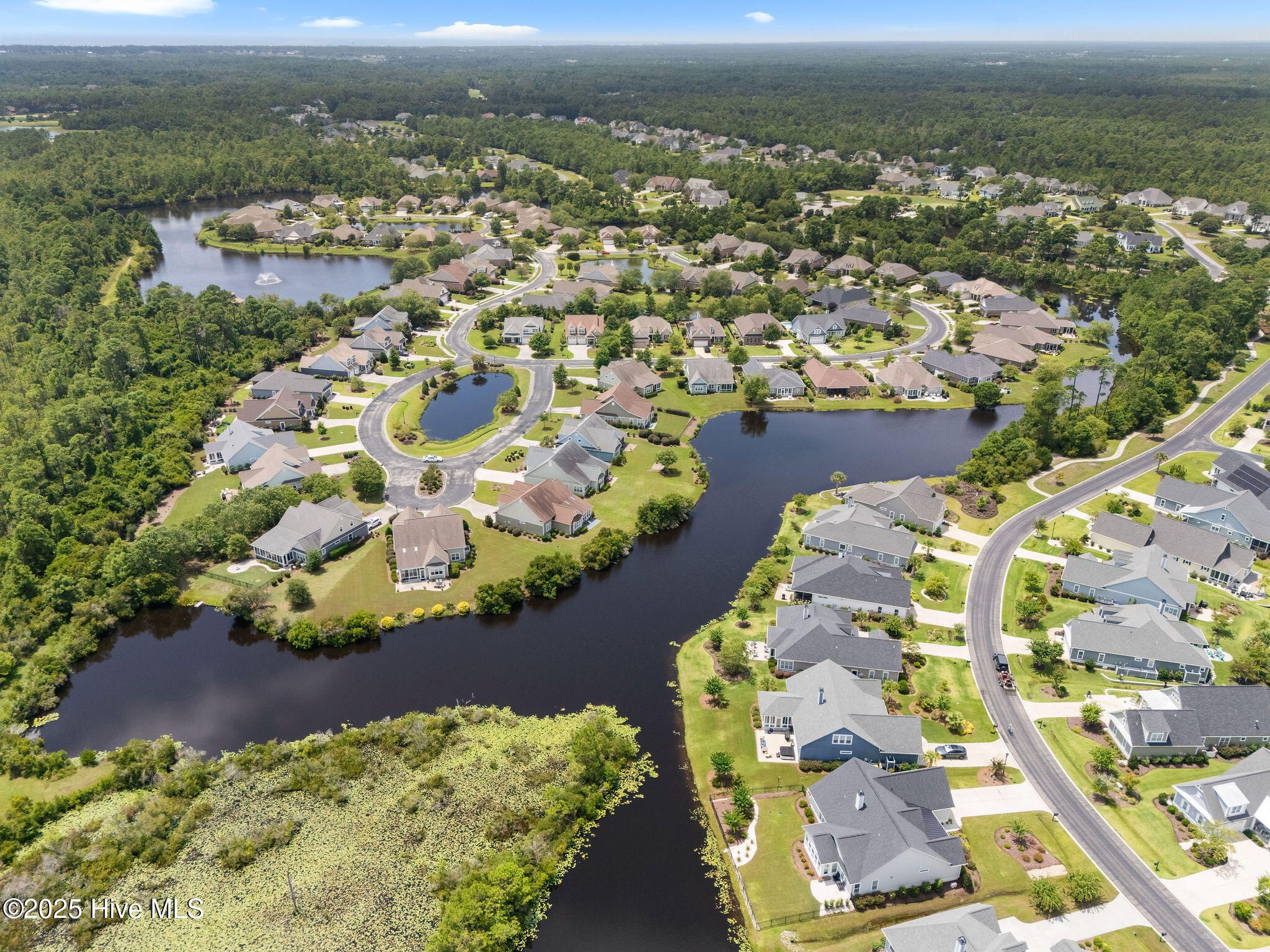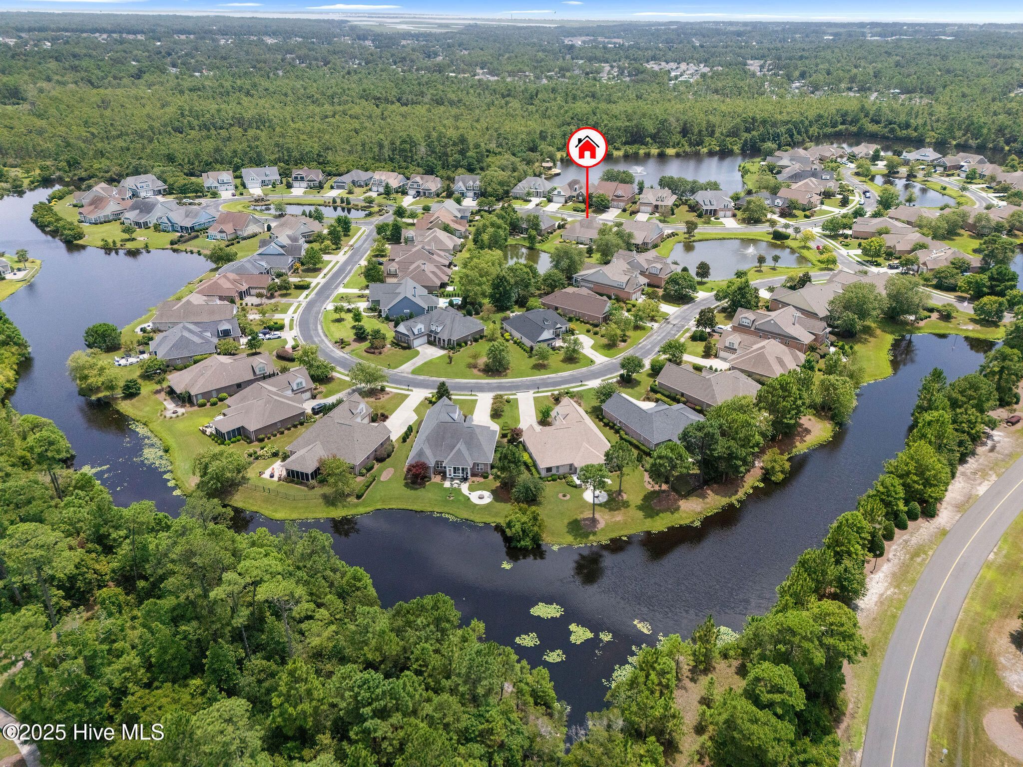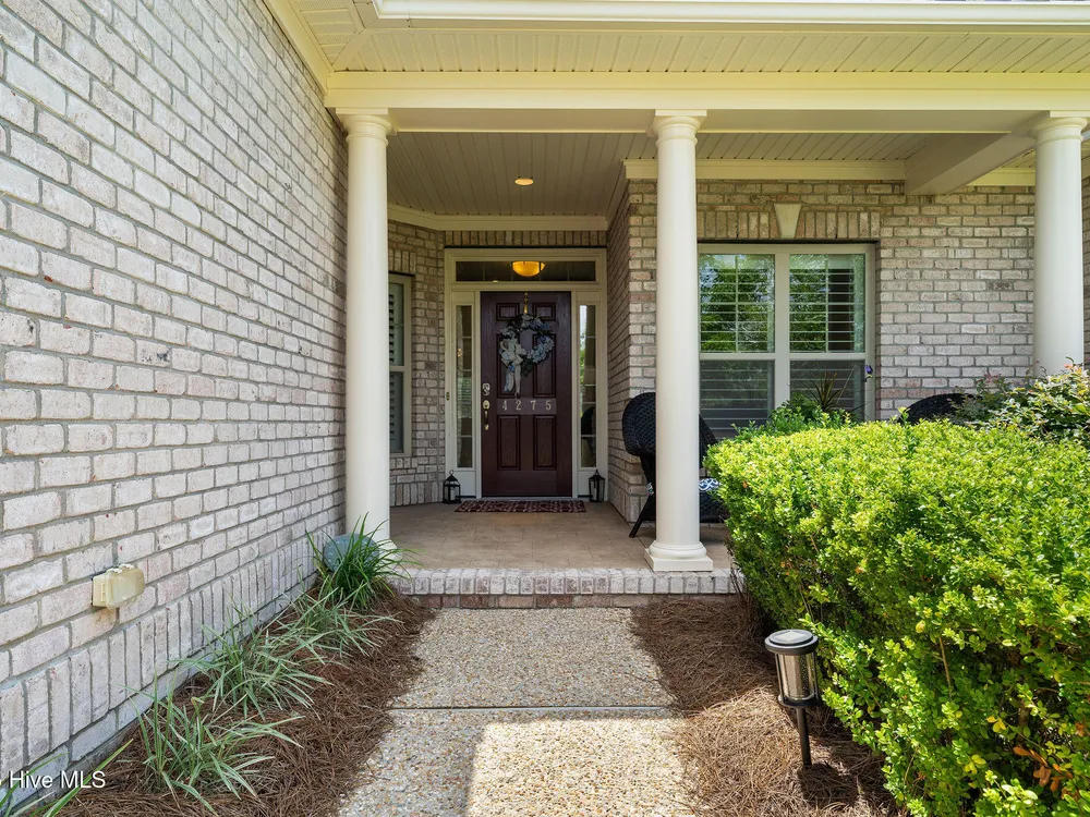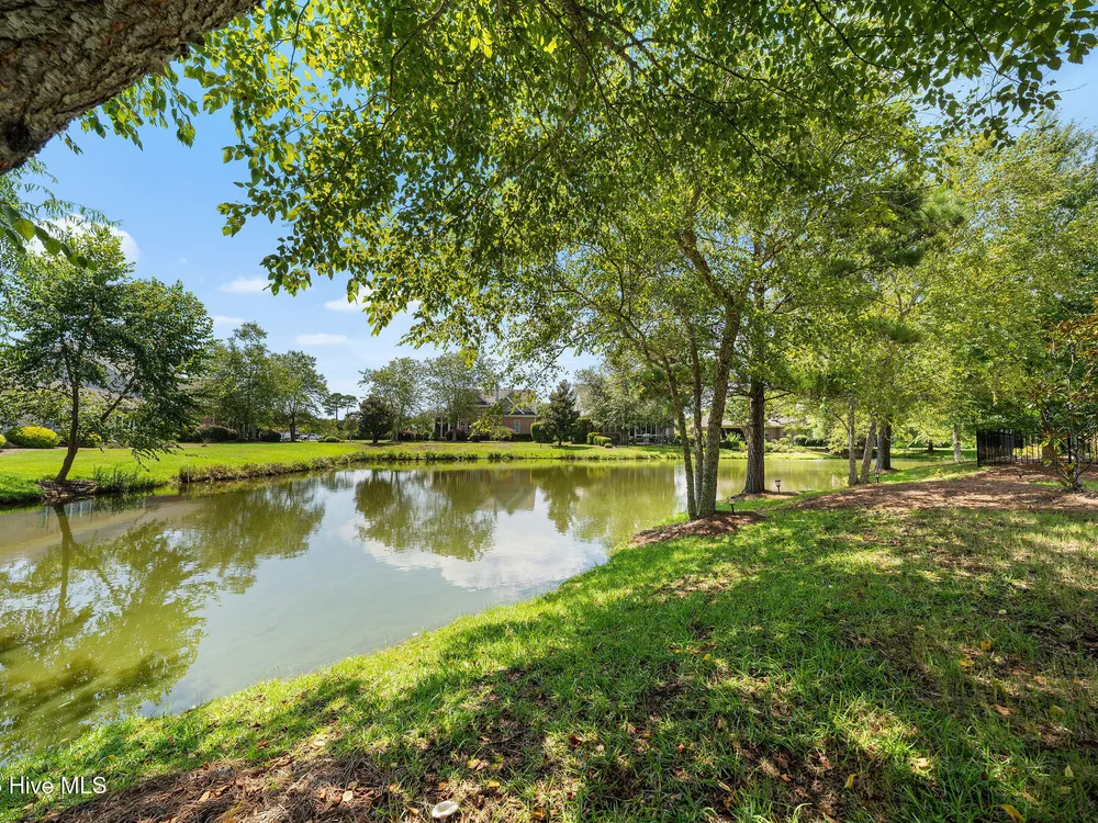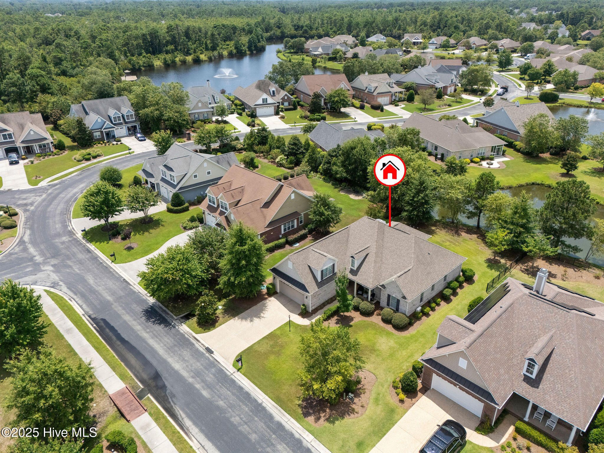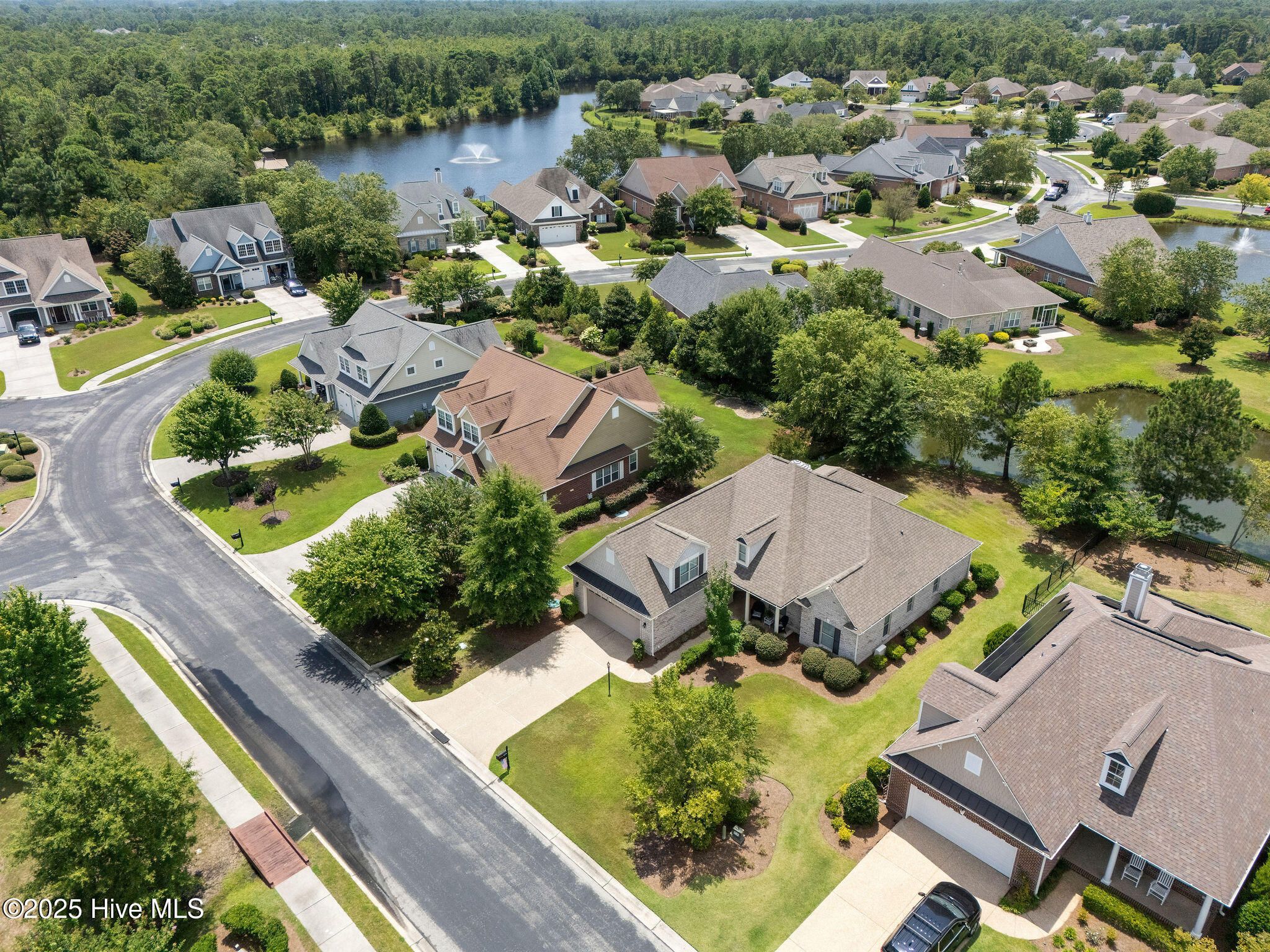 This beautiful all-brick home enjoys peaceful pond views and is located in the Regency Lakes neighborhood of St. James Plantation. Regency Lakes offers maintenance free lawncare/landscaping and is conveniently located just minutes to the Players Club amenity center and entry/exit. This one-story open floorplan offers 4 bedrooms, 3 bathrooms, and 2,440 square feet of comfortable living space. An aggregate driveway and walkway lead through the front yard to a welcoming front porch, where stately columns and a charming beadboard ceiling create a warm first impression. Step inside the entryway, where wide plank engineered hardwood floors and a graceful arched doorway invite you into the formal dining room. This area features crown molding, custom wainscoting, and angled walls that add architectural interest. Plantation shutters decorate the windows throughout the main living area. Beyond the dining room, the spacious great room welcomes you with a vaulted ceiling, electric fireplace flanked by custom built-ins, and an open flow into the adjacent kitchen. A central island beneath pendant lighting offers counter-height seating, while a raised shelf cleverly conceals dishes and includes convenient electrical outlets. The kitchen is complete with stainless steel appliances, ample cabinetry, a pantry, a warm tumbled tile backsplash, and views of the pond and wildlife. A built-in desk provides the perfect space for organizational needs, and a charming breakfast nook offers additional seating for casual meals. Step through the arched opening into the sunroom where peaceful backyard views of the pond can be seen from every window. The sunroom opens directly to a concrete patio, an ideal spot for grilling and taking in the mild Carolina weather. The master suite is a true retreat, featuring an elegant octagon-shaped tray ceiling and hardwood floors that transition seamlessly to tile as you enter the en-suite bathroom. Here, a dual sink vanity, a linen closet, and a zero-entry