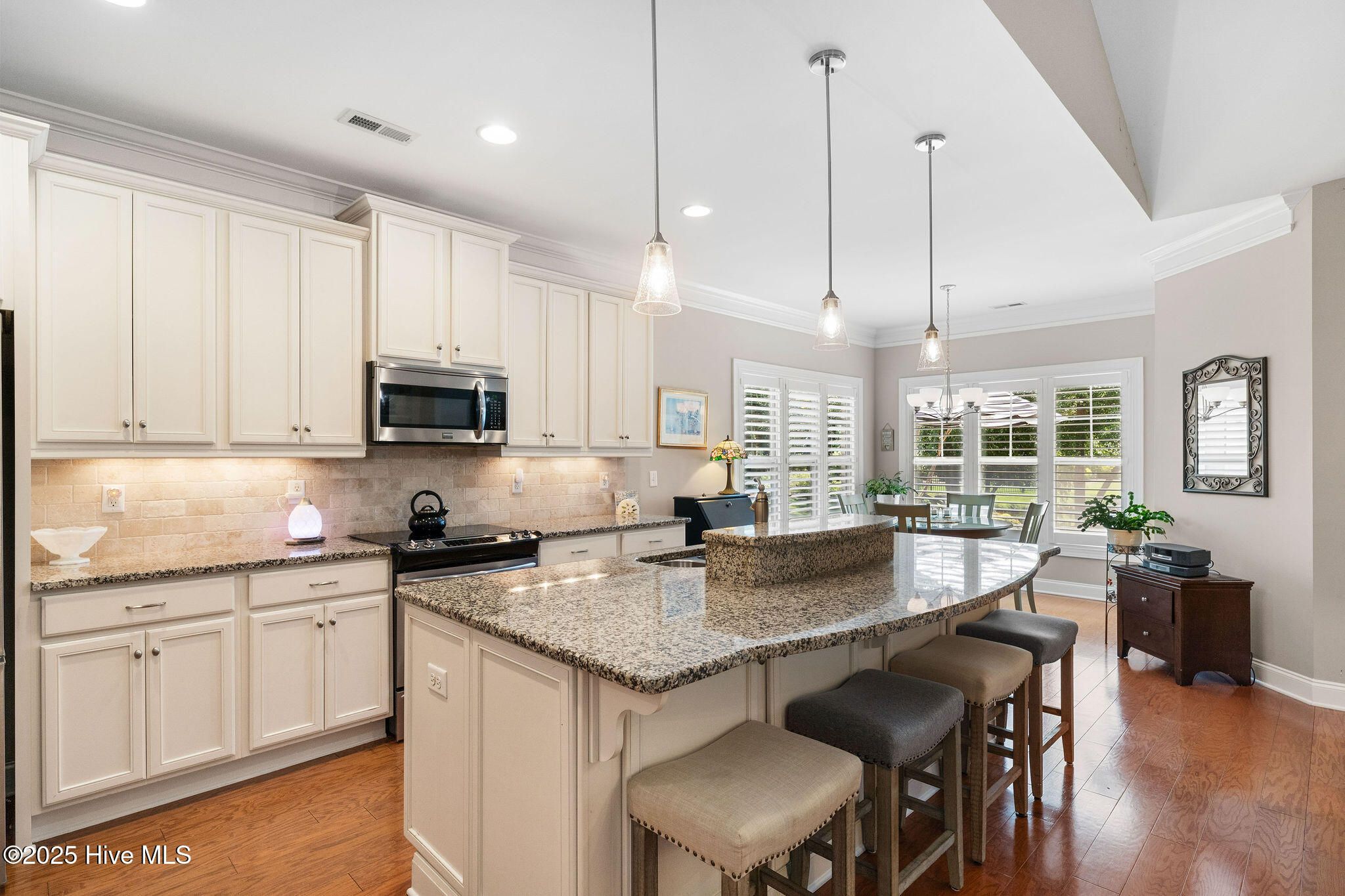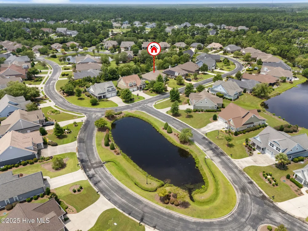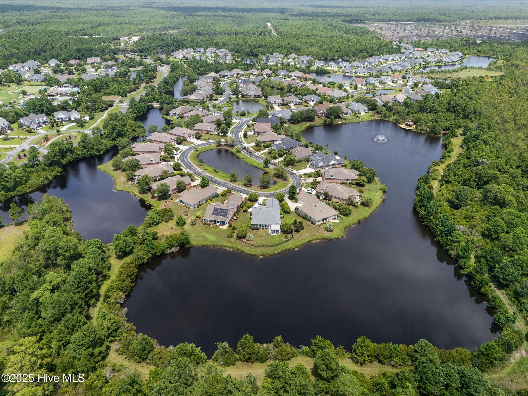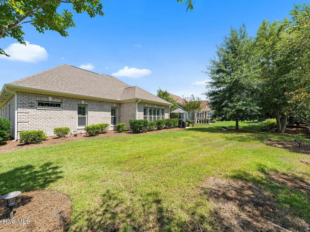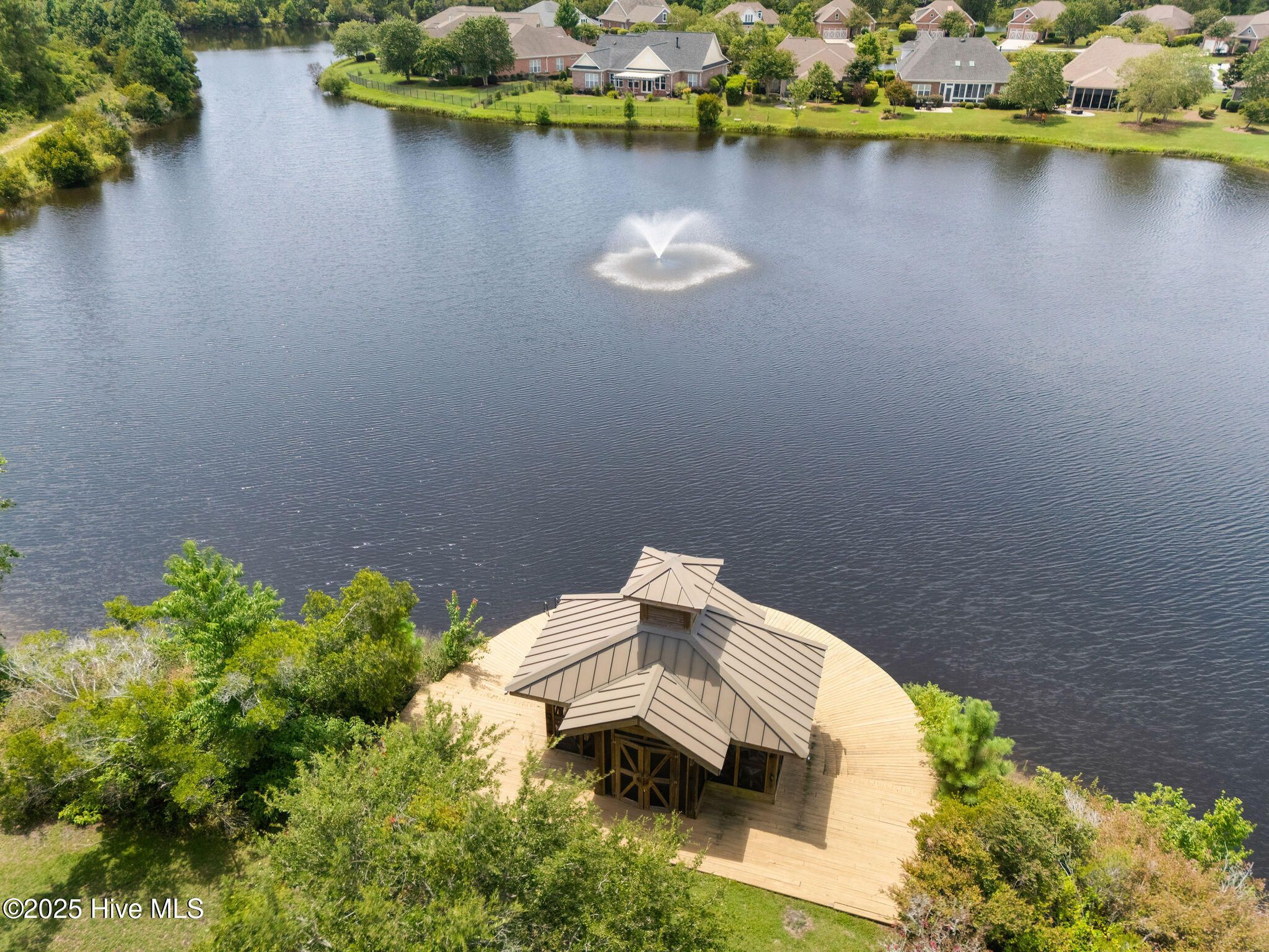 This beautiful all-brick home enjoys peaceful pond views and is located in the Regency Lakes neighborhood of St. James Plantation. Regency Lakes offers maintenance free lawncare/landscaping and is conveniently located just minutes to the Players Club amenity center and entry/exit. This one-story open floorplan offers 4 bedrooms, 3 bathrooms, and 2,440 square feet of comfortable living space. An aggregate driveway and walkway lead through the front yard to a welcoming front porch, where stately columns and a charming beadboard ceiling create a warm first impression. Step inside the entryway, where wide plank engineered hardwood floors and a graceful arched doorway invite you into the formal dining room. This area features crown molding, custom wainscoting, and angled walls that add architectural interest. Plantation shutters decorate the windows throughout the main living area. Beyond the dining room, the spacious great room welcomes you with a vaulted ceiling, electric fireplace flanked by custom built-ins, and an open flow into the adjacent kitchen. A central island beneath pendant lighting offers counter-height seating, while a raised shelf cleverly conceals dishes and includes convenient electrical outlets. The kitchen is complete with stainless steel appliances, ample cabinetry, a pantry, a warm tumbled tile backsplash, and views of the pond and wildlife. A built-in desk provides the perfect space for organizational needs, and a charming breakfast nook offers additional seating for casual meals. Step through the arched opening into the sunroom where peaceful backyard views of the pond can be seen from every window. The sunroom opens directly to a concrete patio, an ideal spot for grilling and taking in the mild Carolina weather. The master suite is a true retreat, featuring an elegant octagon-shaped tray ceiling and hardwood floors that transition seamlessly to tile as you enter the en-suite bathroom. Here, a dual sink vanity, a linen closet, and a zero-entry