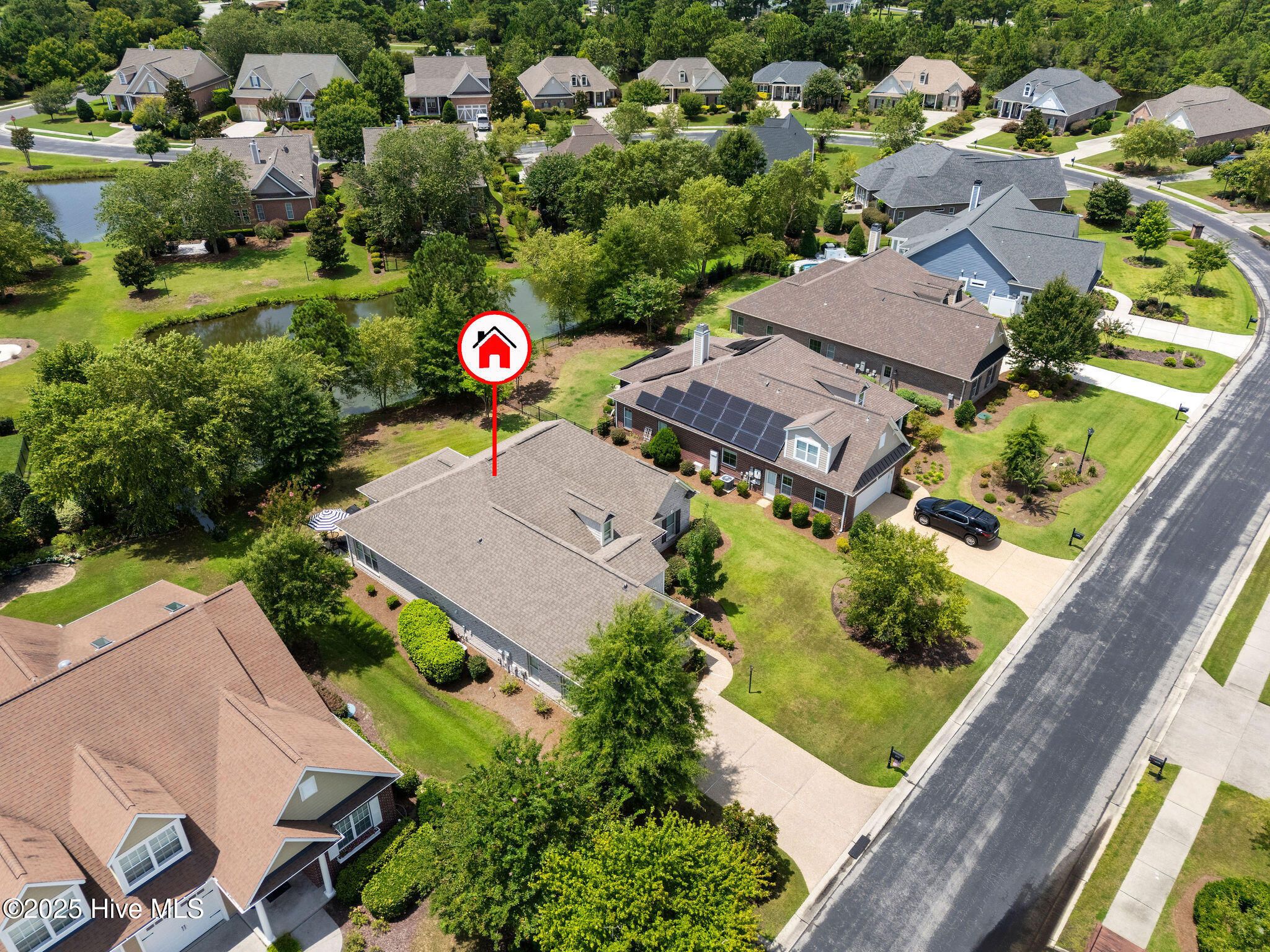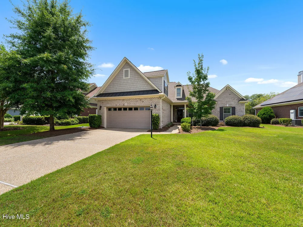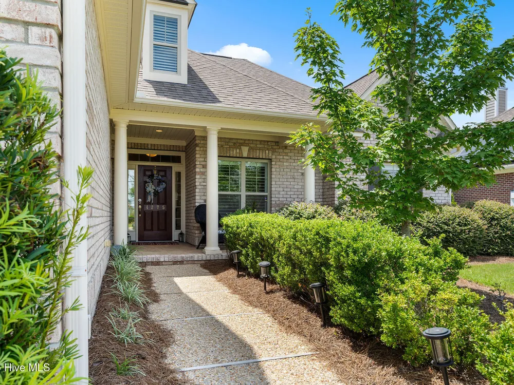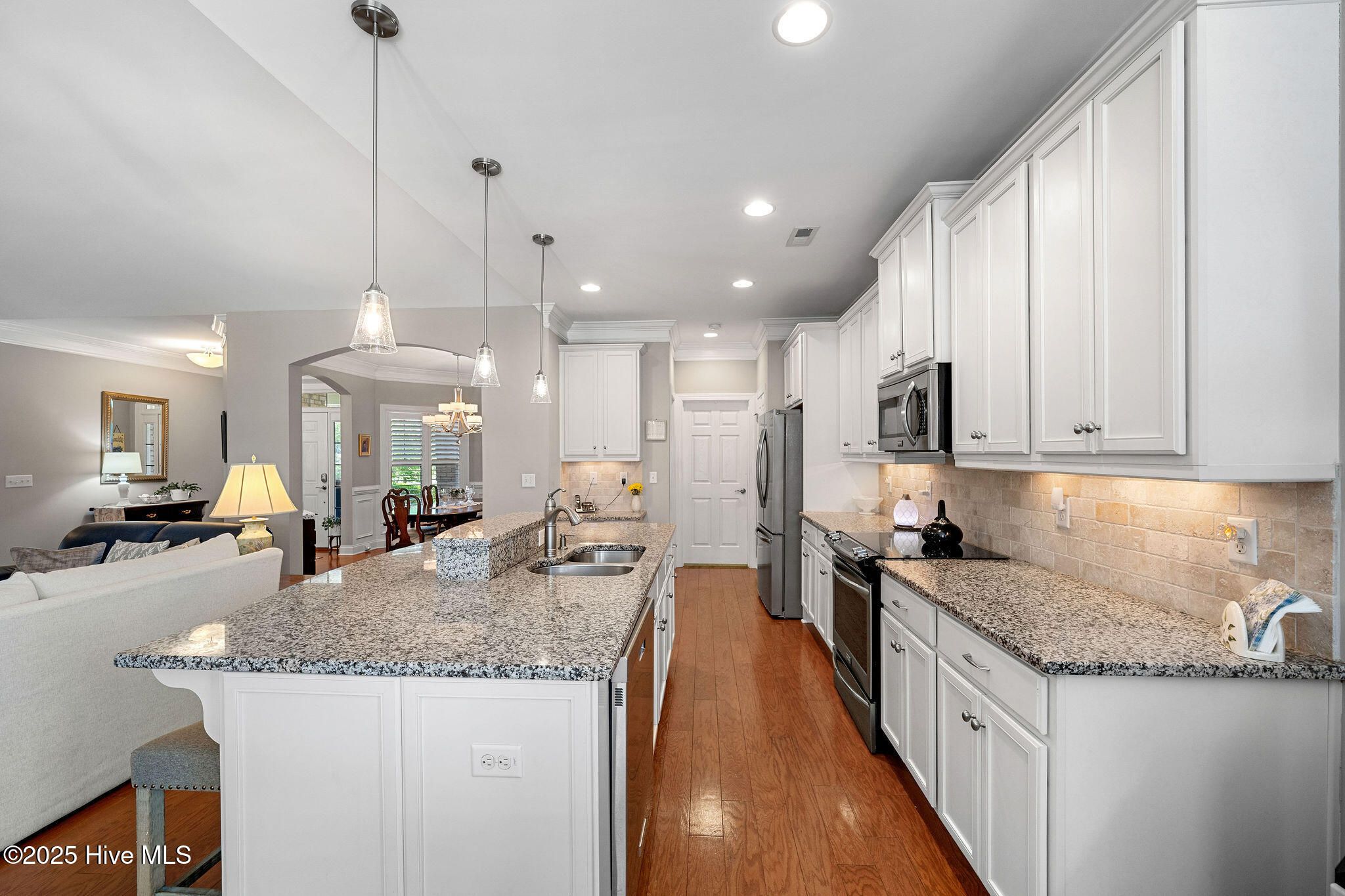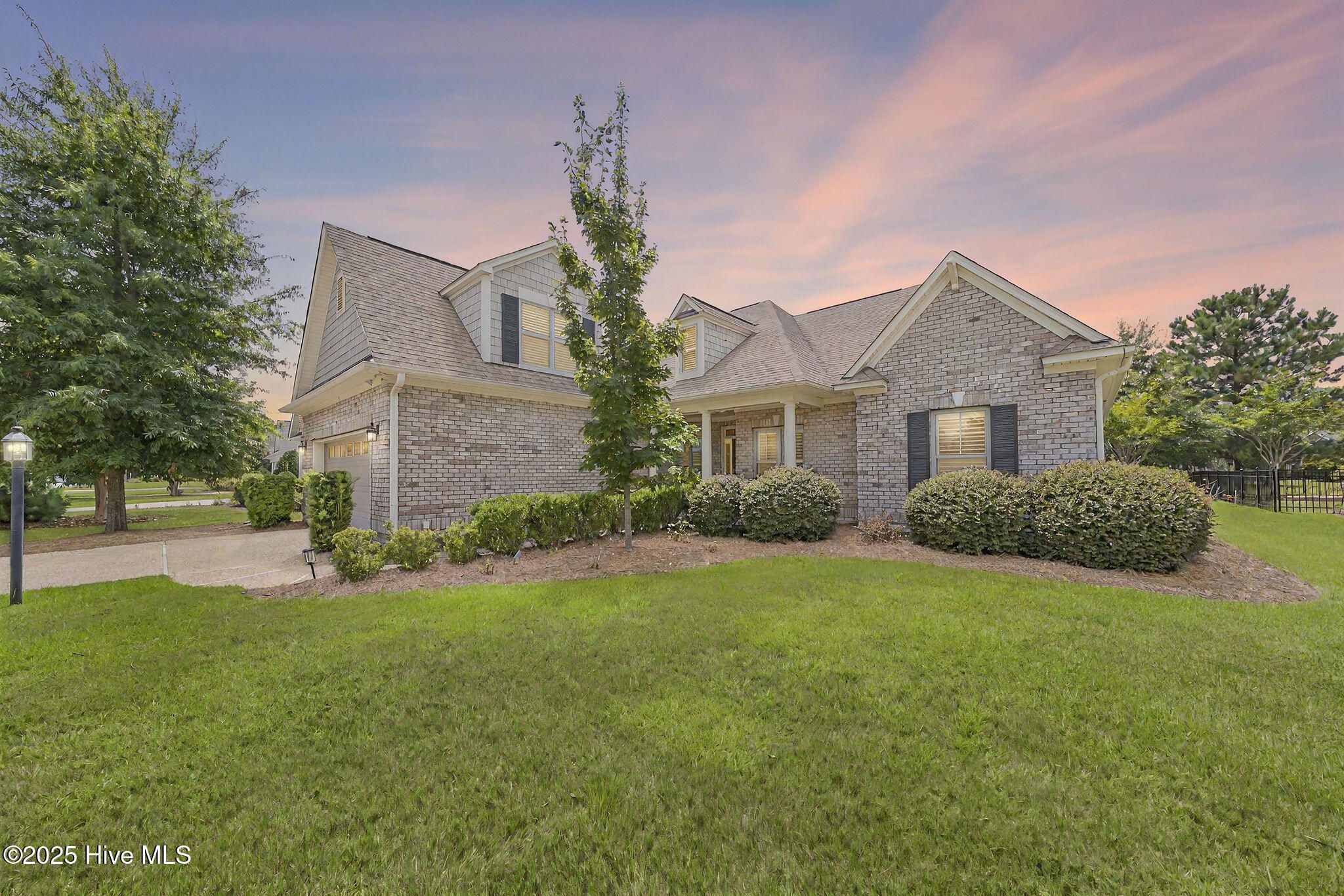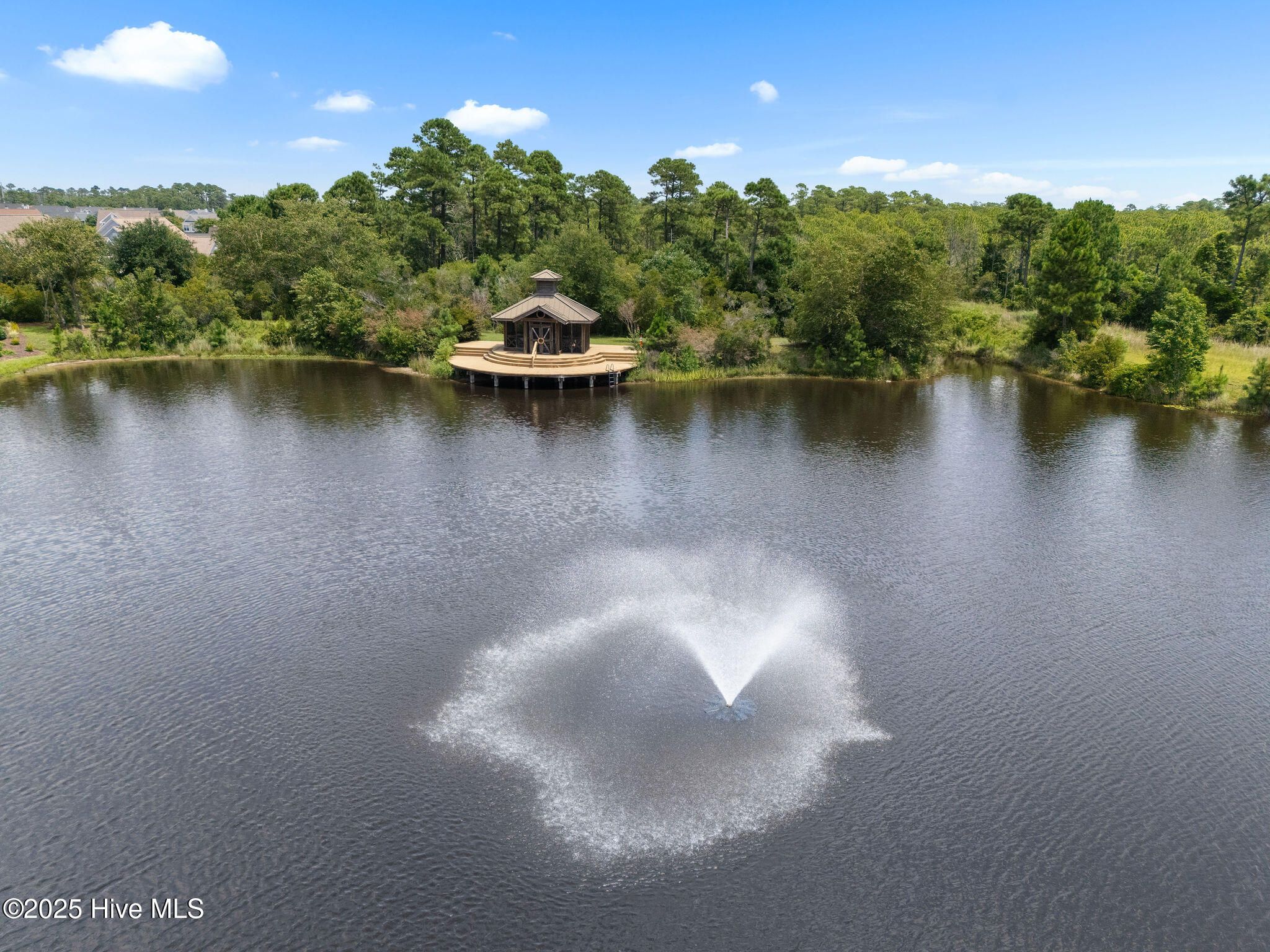 This beautiful all-brick home enjoys peaceful pond views and is located in the Regency Lakes neighborhood of St. James Plantation. Regency Lakes offers maintenance free lawncare/landscaping and is conveniently located just minutes to the Players Club amenity center and entry/exit. This one-story open floorplan offers 4 bedrooms, 3 bathrooms, and 2,440 square feet of comfortable living space. An aggregate driveway and walkway lead through the front yard to a welcoming front porch, where stately columns and a charming beadboard ceiling create a warm first impression. Step inside the entryway, where wide plank engineered hardwood floors and a graceful arched doorway invite you into the formal dining room. This area features crown molding, custom wainscoting, and angled walls that add architectural interest. Plantation shutters decorate the windows throughout the main living area. Beyond the dining room, the spacious great room welcomes you with a vaulted ceiling, electric fireplace flanked by custom built-ins, and an open flow into the adjacent kitchen. A central island beneath pendant lighting offers counter-height seating, while a raised shelf cleverly conceals dishes and includes convenient electrical outlets. The kitchen is complete with stainless steel appliances, ample cabinetry, a pantry, a warm tumbled tile backsplash, and views of the pond and wildlife. A built-in desk provides the perfect space for organizational needs, and a charming breakfast nook offers additional seating for casual meals. Step through the arched opening into the sunroom where peaceful backyard views of the pond can be seen from every window. The sunroom opens directly to a concrete patio, an ideal spot for grilling and taking in the mild Carolina weather. The master suite is a true retreat, featuring an elegant octagon-shaped tray ceiling and hardwood floors that transition seamlessly to tile as you enter the en-suite bathroom. Here, a dual sink vanity, a linen closet, and a zero-entry