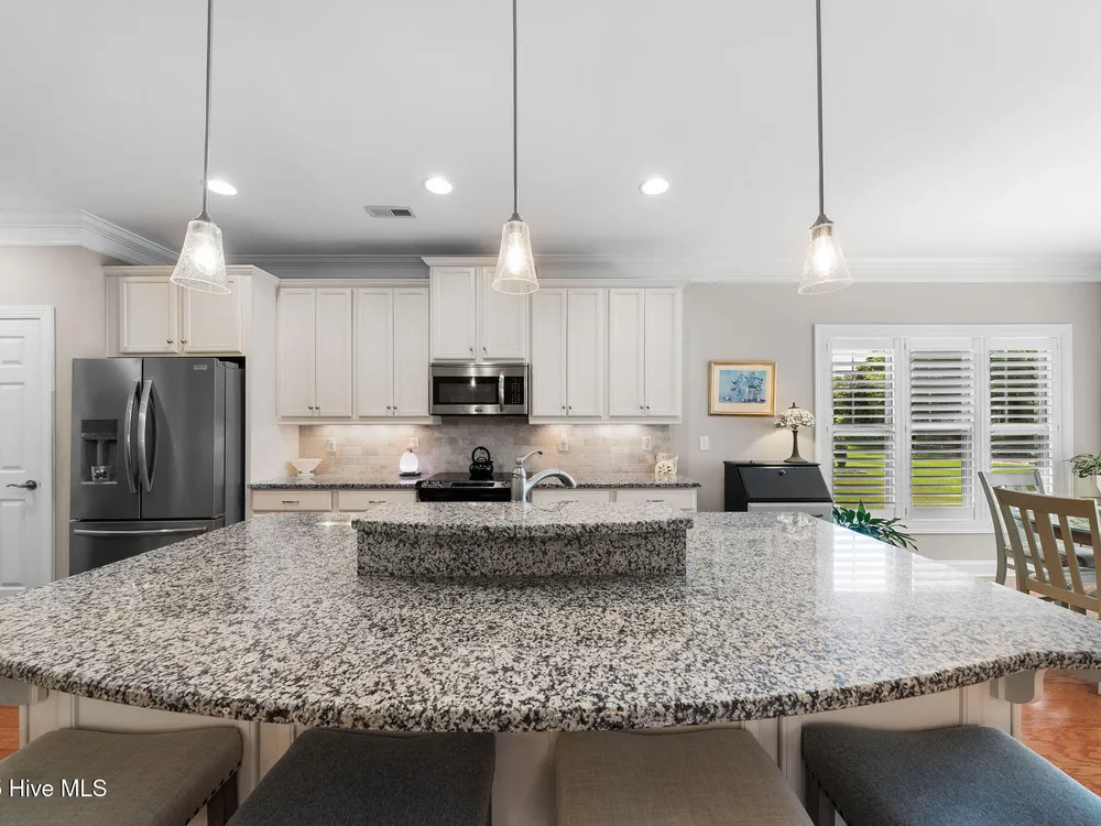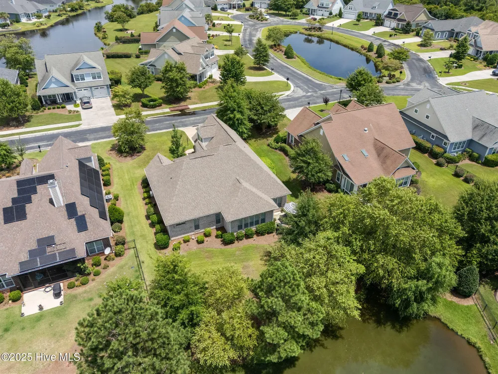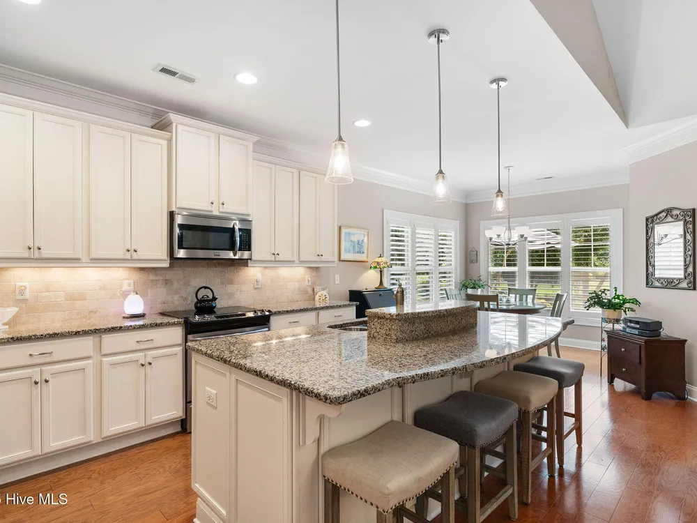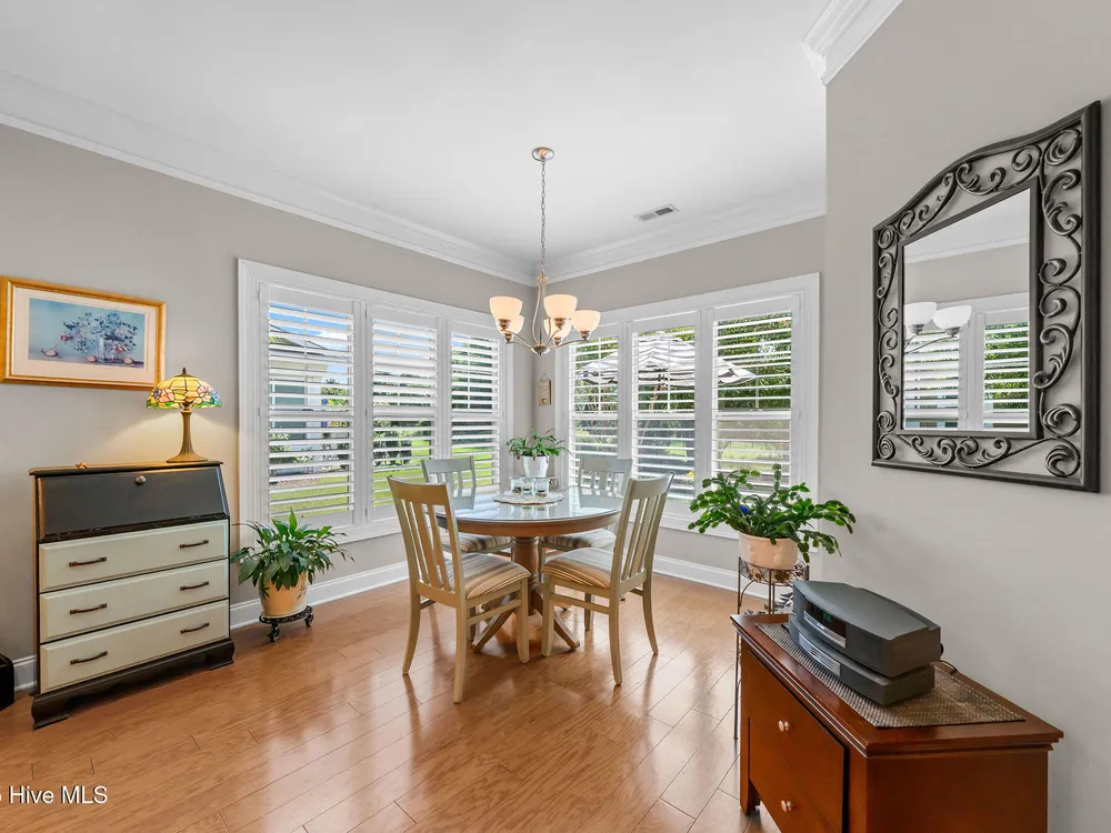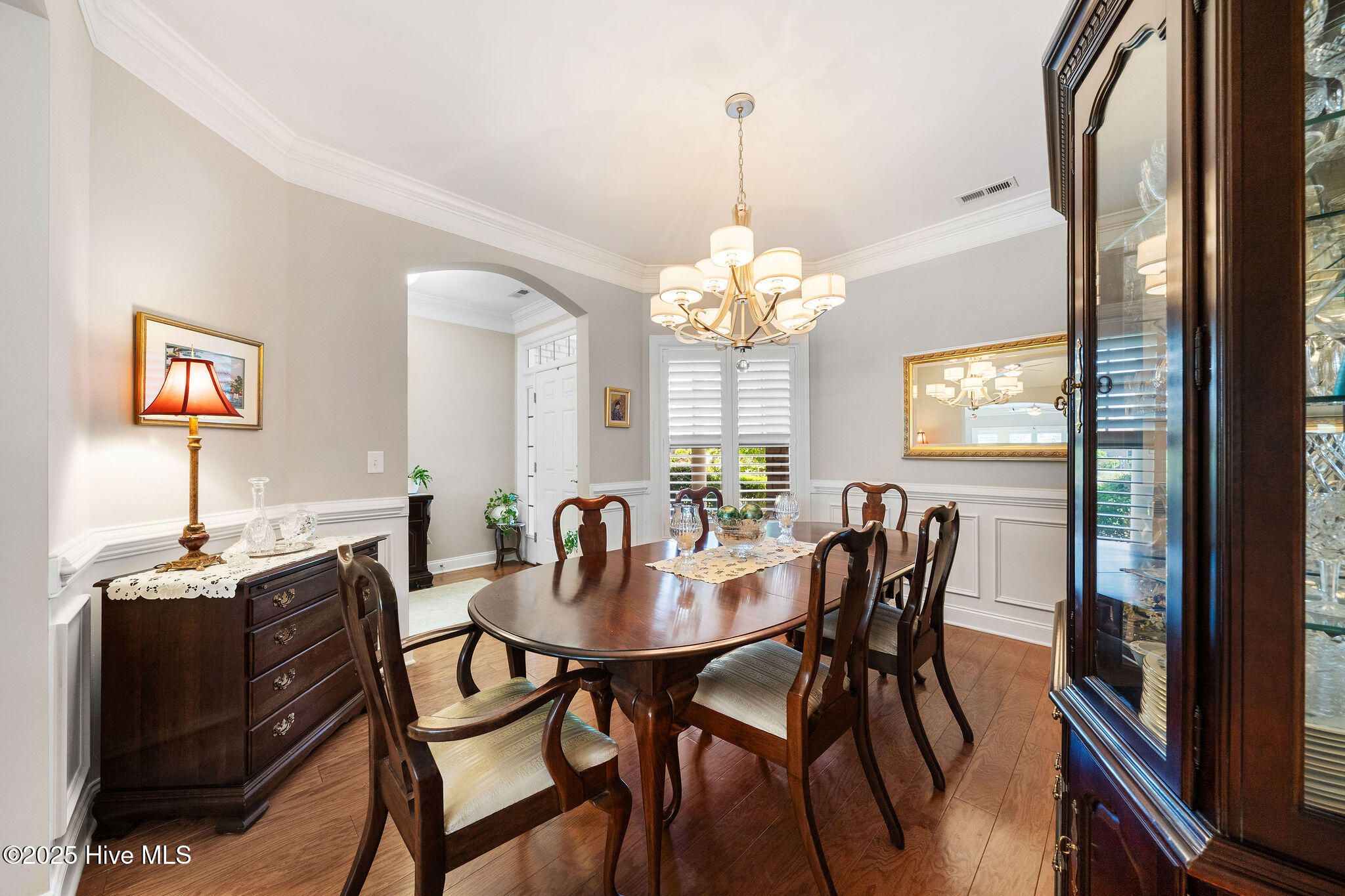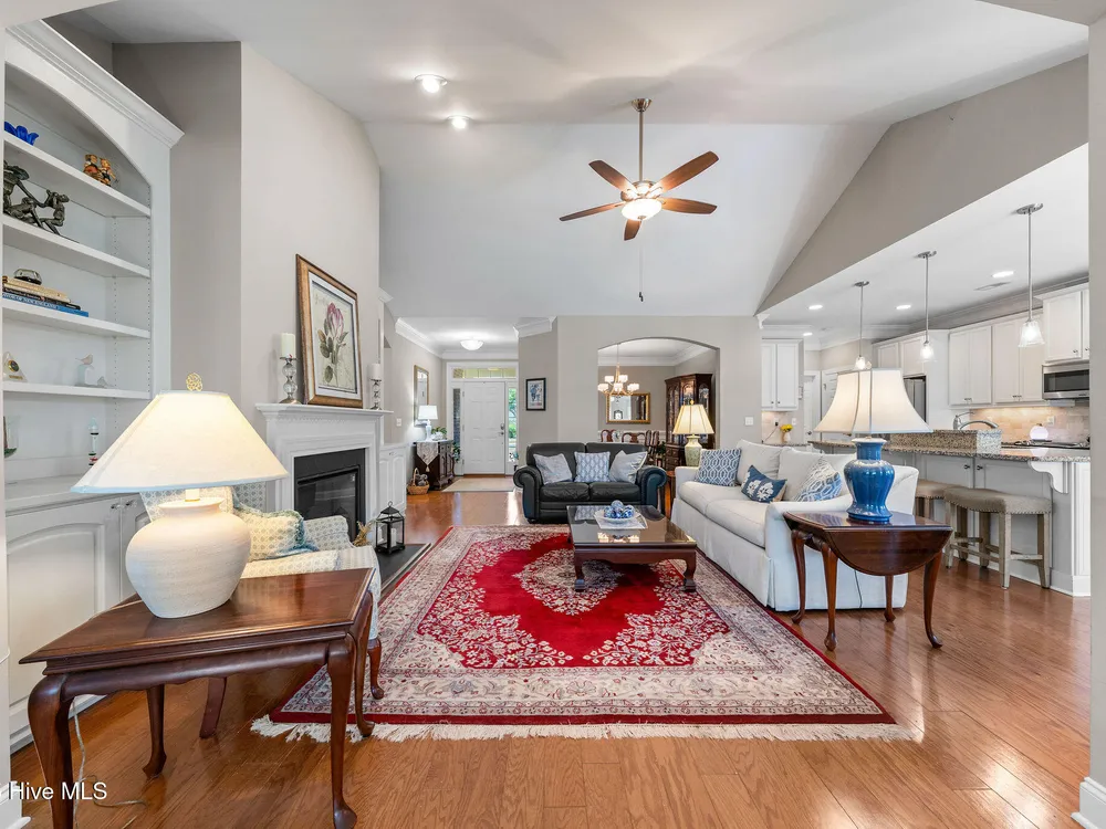This beautiful all-brick home enjoys peaceful pond views and is located in the Regency Lakes neighborhood of St. James Plantation. Regency Lakes offers maintenance free lawncare/landscaping and is conveniently located just minutes to the Players Club amenity center and entry/exit. This one-story open floorplan offers 4 bedrooms, 3 bathrooms, and 2,440 square feet of comfortable living space. An aggregate driveway and walkway lead through the front yard to a welcoming front porch, where stately columns and a charming beadboard ceiling create a warm first impression. Step inside the entryway, where wide plank engineered hardwood floors and a graceful arched doorway invite you into the formal dining room. This area features crown molding, custom wainscoting, and angled walls that add architectural interest. Plantation shutters decorate the windows throughout the main living area. Beyond the dining room, the spacious great room welcomes you with a vaulted ceiling, electric fireplace flanked by custom built-ins, and an open flow into the adjacent kitchen. A central island beneath pendant lighting offers counter-height seating, while a raised shelf cleverly conceals dishes and includes convenient electrical outlets. The kitchen is complete with stainless steel appliances, ample cabinetry, a pantry, a warm tumbled tile backsplash, and views of the pond and wildlife. A built-in desk provides the perfect space for organizational needs, and a charming breakfast nook offers additional seating for casual meals. Step through the arched opening into the sunroom where peaceful backyard views of the pond can be seen from every window. The sunroom opens directly to a concrete patio, an ideal spot for grilling and taking in the mild Carolina weather. The master suite is a true retreat, featuring an elegant octagon-shaped tray ceiling and hardwood floors that transition seamlessly to tile as you enter the en-suite bathroom. Here, a dual sink vanity, a linen closet, and a zero-entry