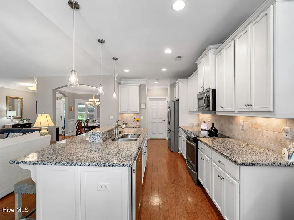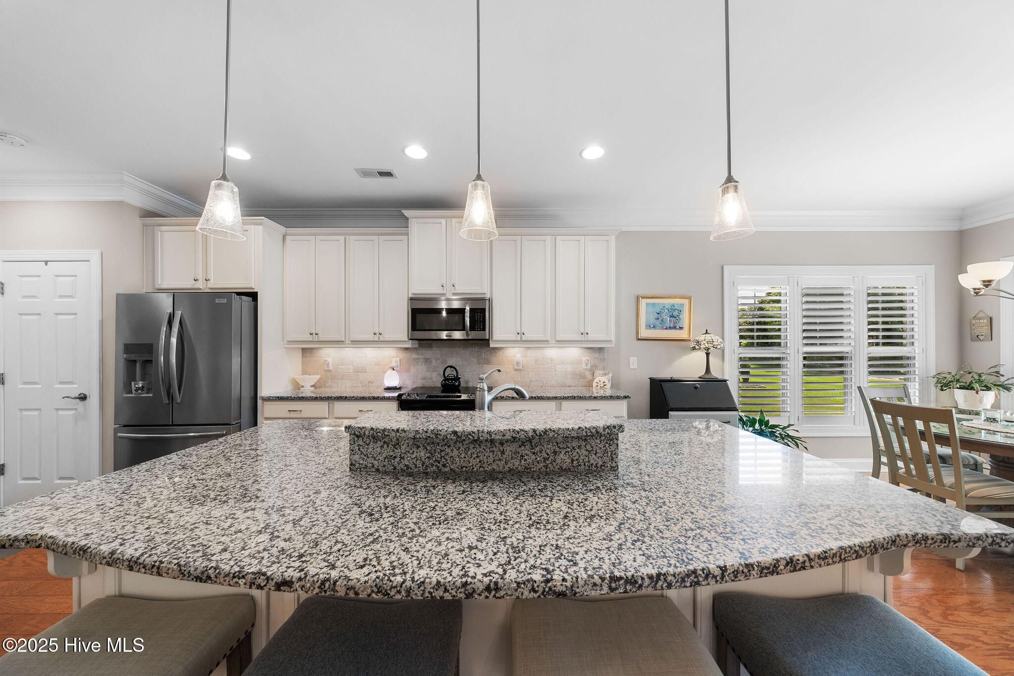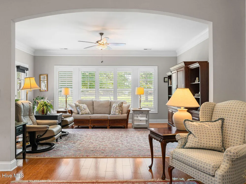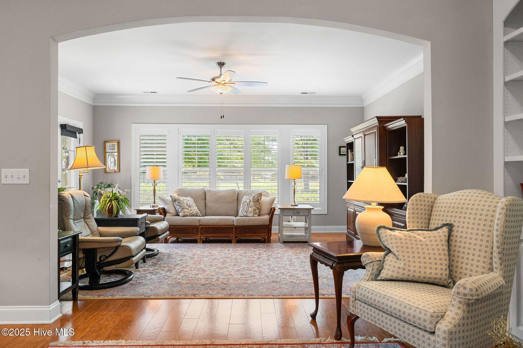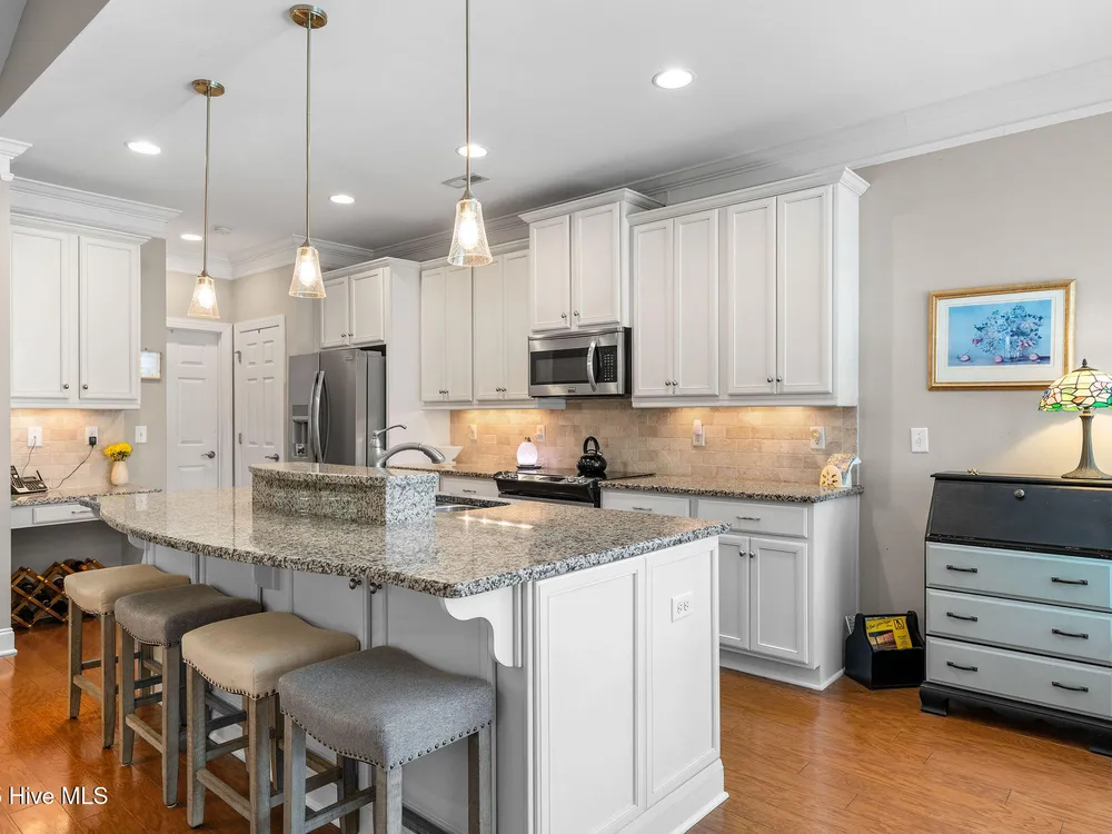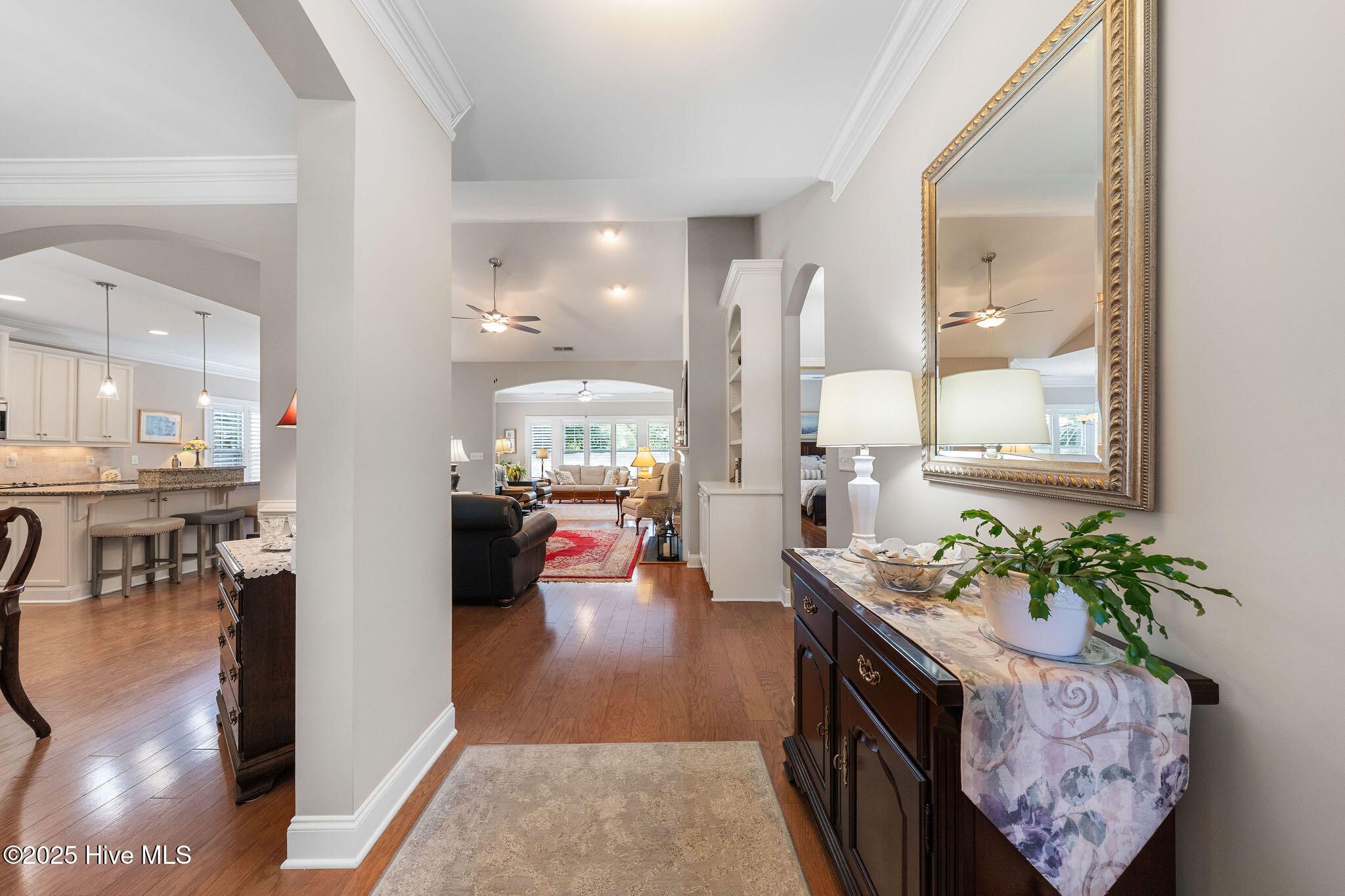 This beautiful all-brick home enjoys peaceful pond views and is located in the Regency Lakes neighborhood of St. James Plantation. Regency Lakes offers maintenance free lawncare/landscaping and is conveniently located just minutes to the Players Club amenity center and entry/exit. This one-story open floorplan offers 4 bedrooms, 3 bathrooms, and 2,440 square feet of comfortable living space. An aggregate driveway and walkway lead through the front yard to a welcoming front porch, where stately columns and a charming beadboard ceiling create a warm first impression. Step inside the entryway, where wide plank engineered hardwood floors and a graceful arched doorway invite you into the formal dining room. This area features crown molding, custom wainscoting, and angled walls that add architectural interest. Plantation shutters decorate the windows throughout the main living area. Beyond the dining room, the spacious great room welcomes you with a vaulted ceiling, electric fireplace flanked by custom built-ins, and an open flow into the adjacent kitchen. A central island beneath pendant lighting offers counter-height seating, while a raised shelf cleverly conceals dishes and includes convenient electrical outlets. The kitchen is complete with stainless steel appliances, ample cabinetry, a pantry, a warm tumbled tile backsplash, and views of the pond and wildlife. A built-in desk provides the perfect space for organizational needs, and a charming breakfast nook offers additional seating for casual meals. Step through the arched opening into the sunroom where peaceful backyard views of the pond can be seen from every window. The sunroom opens directly to a concrete patio, an ideal spot for grilling and taking in the mild Carolina weather. The master suite is a true retreat, featuring an elegant octagon-shaped tray ceiling and hardwood floors that transition seamlessly to tile as you enter the en-suite bathroom. Here, a dual sink vanity, a linen closet, and a zero-entry