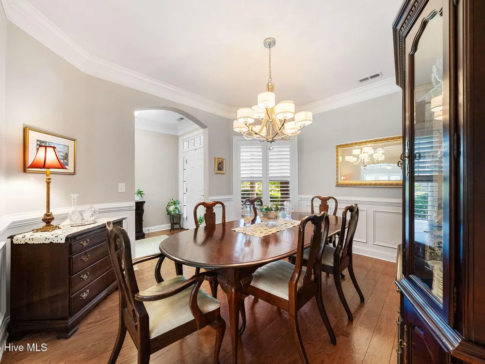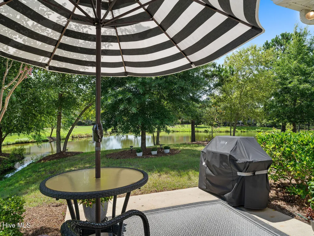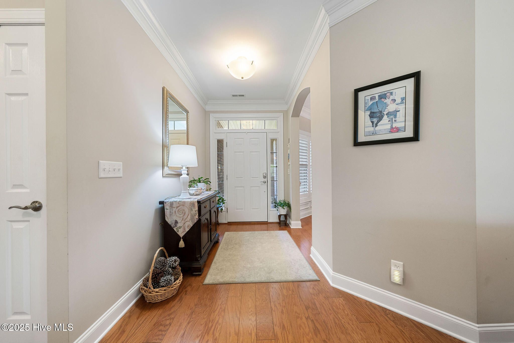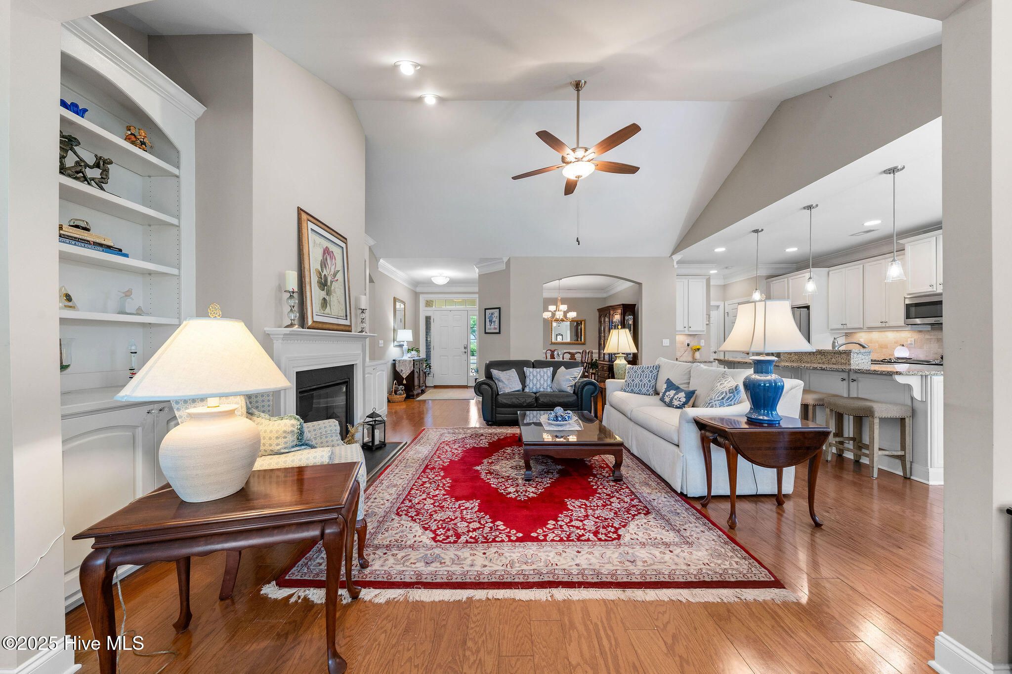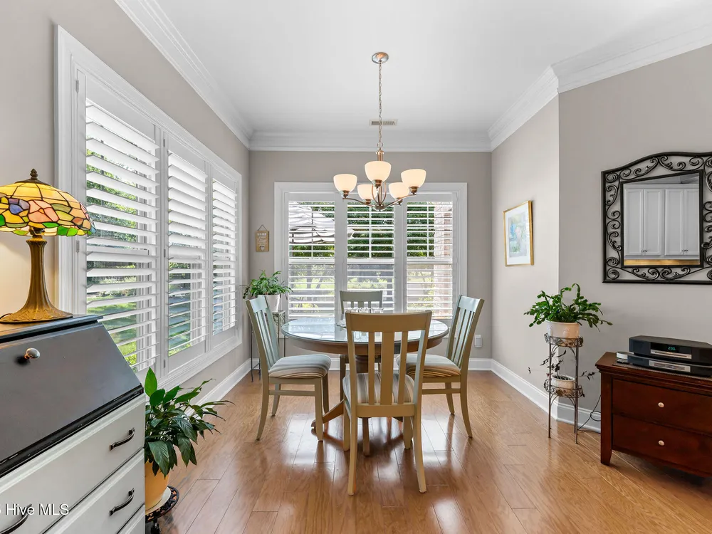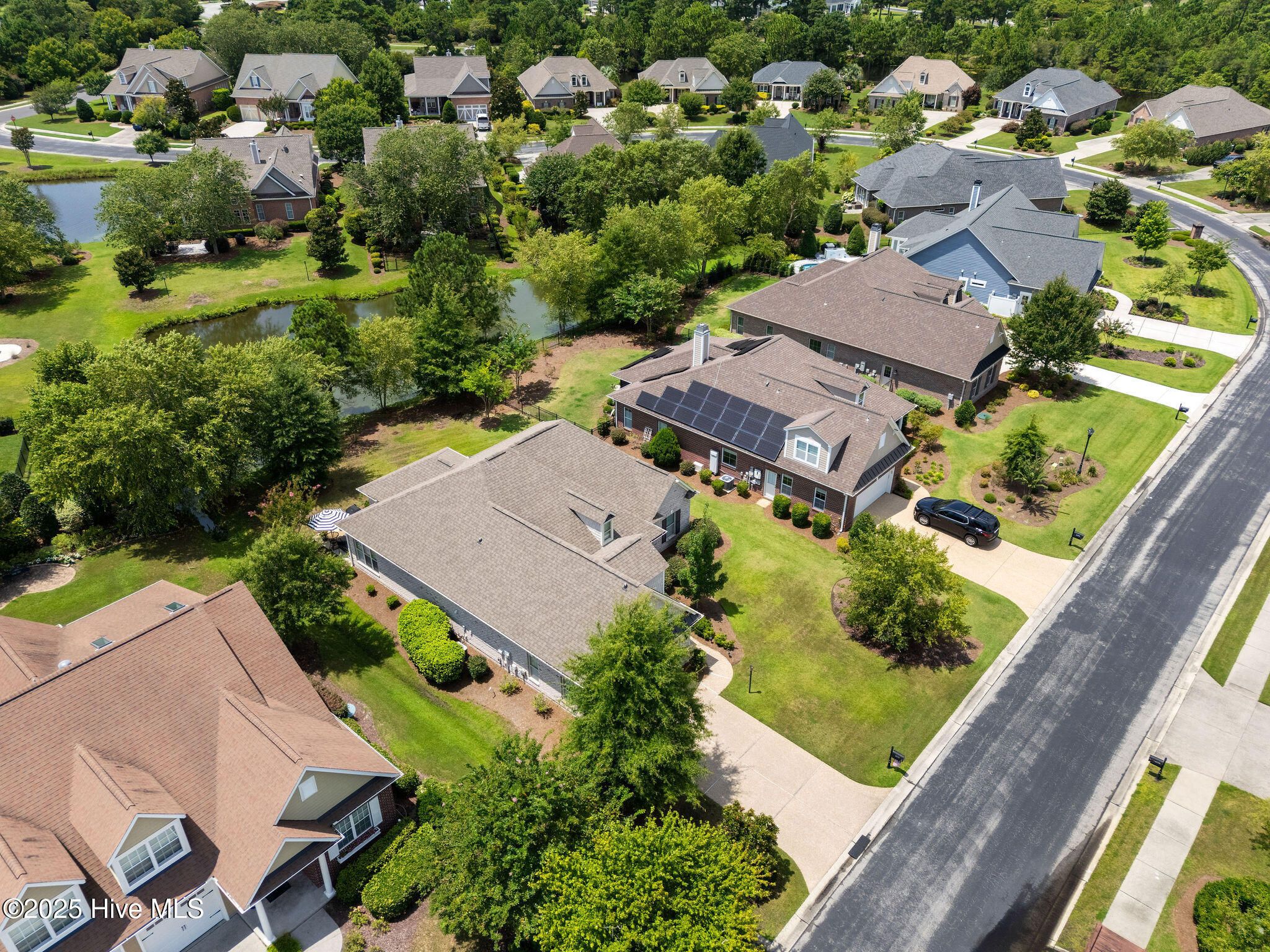 This beautiful all-brick home enjoys peaceful pond views and is located in the Regency Lakes neighborhood of St. James Plantation. Regency Lakes offers maintenance free lawncare/landscaping and is conveniently located just minutes to the Players Club amenity center and entry/exit. This one-story open floorplan offers 4 bedrooms, 3 bathrooms, and 2,440 square feet of comfortable living space. An aggregate driveway and walkway lead through the front yard to a welcoming front porch, where stately columns and a charming beadboard ceiling create a warm first impression. Step inside the entryway, where wide plank engineered hardwood floors and a graceful arched doorway invite you into the formal dining room. This area features crown molding, custom wainscoting, and angled walls that add architectural interest. Plantation shutters decorate the windows throughout the main living area. Beyond the dining room, the spacious great room welcomes you with a vaulted ceiling, electric fireplace flanked by custom built-ins, and an open flow into the adjacent kitchen. A central island beneath pendant lighting offers counter-height seating, while a raised shelf cleverly conceals dishes and includes convenient electrical outlets. The kitchen is complete with stainless steel appliances, ample cabinetry, a pantry, a warm tumbled tile backsplash, and views of the pond and wildlife. A built-in desk provides the perfect space for organizational needs, and a charming breakfast nook offers additional seating for casual meals. Step through the arched opening into the sunroom where peaceful backyard views of the pond can be seen from every window. The sunroom opens directly to a concrete patio, an ideal spot for grilling and taking in the mild Carolina weather. The master suite is a true retreat, featuring an elegant octagon-shaped tray ceiling and hardwood floors that transition seamlessly to tile as you enter the en-suite bathroom. Here, a dual sink vanity, a linen closet, and a zero-entry