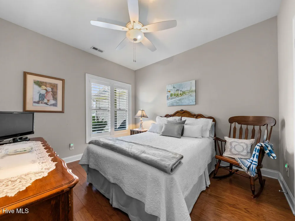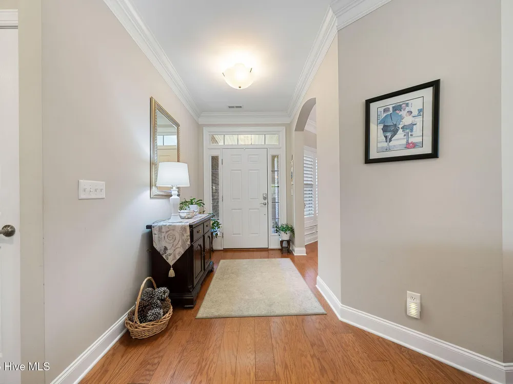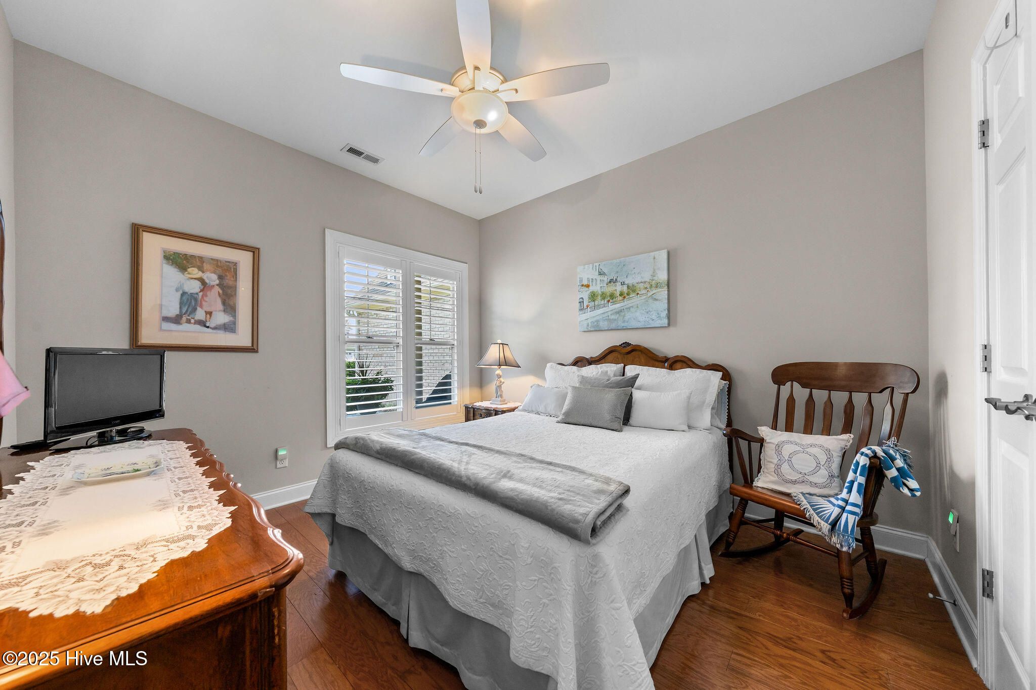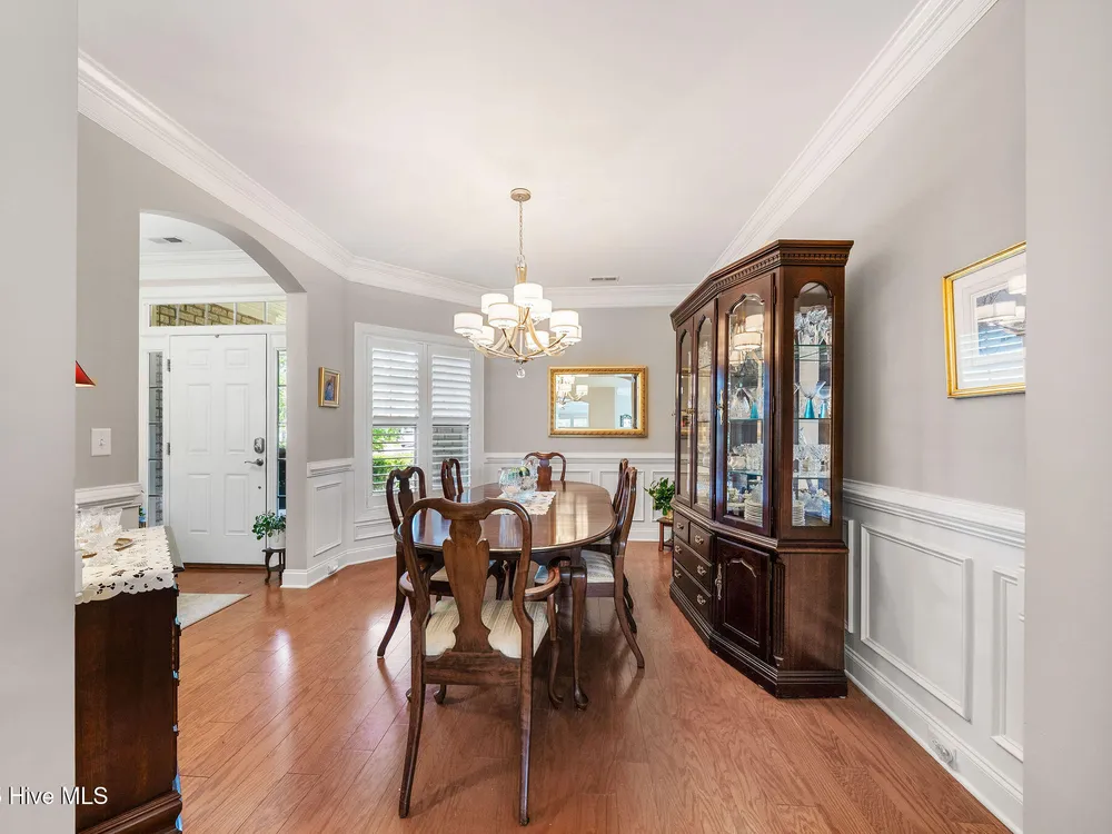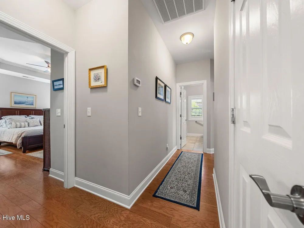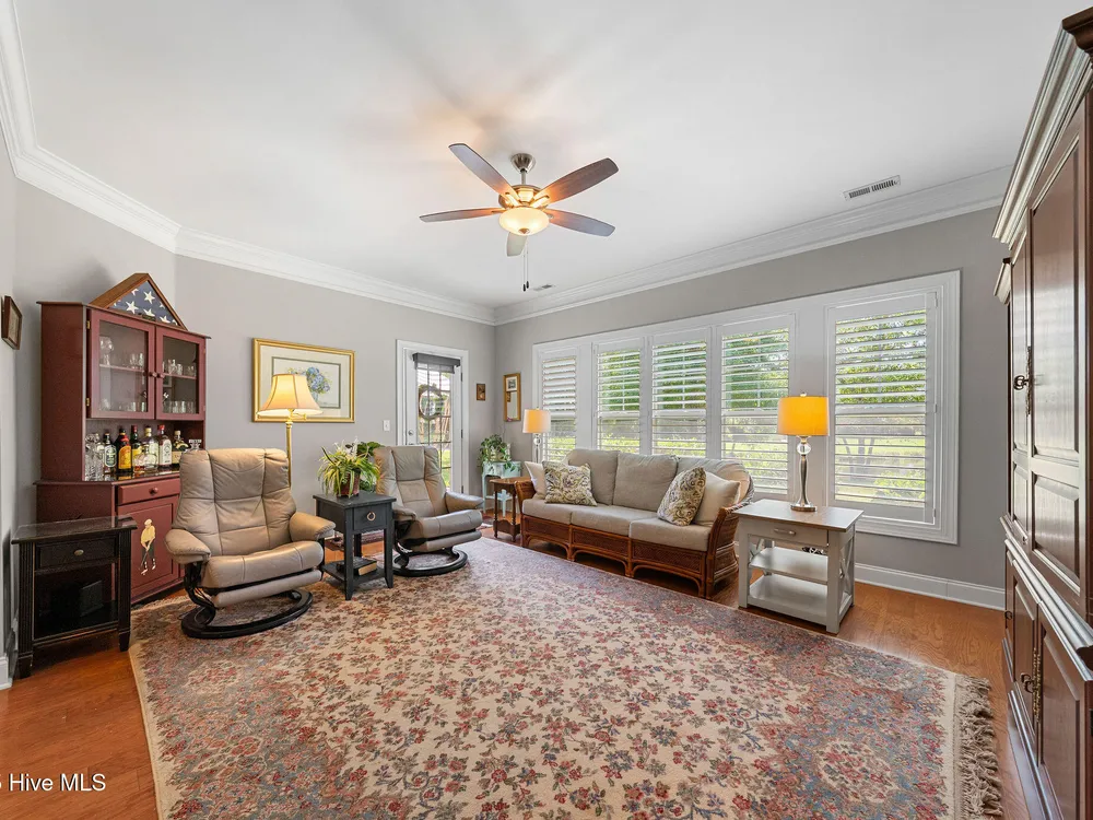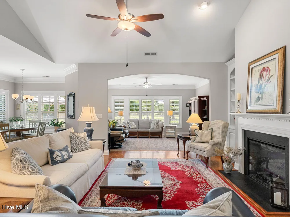 This beautiful all-brick home enjoys peaceful pond views and is located in the Regency Lakes neighborhood of St. James Plantation. Regency Lakes offers maintenance free lawncare/landscaping and is conveniently located just minutes to the Players Club amenity center and entry/exit. This one-story open floorplan offers 4 bedrooms, 3 bathrooms, and 2,440 square feet of comfortable living space. An aggregate driveway and walkway lead through the front yard to a welcoming front porch, where stately columns and a charming beadboard ceiling create a warm first impression. Step inside the entryway, where wide plank engineered hardwood floors and a graceful arched doorway invite you into the formal dining room. This area features crown molding, custom wainscoting, and angled walls that add architectural interest. Plantation shutters decorate the windows throughout the main living area. Beyond the dining room, the spacious great room welcomes you with a vaulted ceiling, electric fireplace flanked by custom built-ins, and an open flow into the adjacent kitchen. A central island beneath pendant lighting offers counter-height seating, while a raised shelf cleverly conceals dishes and includes convenient electrical outlets. The kitchen is complete with stainless steel appliances, ample cabinetry, a pantry, a warm tumbled tile backsplash, and views of the pond and wildlife. A built-in desk provides the perfect space for organizational needs, and a charming breakfast nook offers additional seating for casual meals. Step through the arched opening into the sunroom where peaceful backyard views of the pond can be seen from every window. The sunroom opens directly to a concrete patio, an ideal spot for grilling and taking in the mild Carolina weather. The master suite is a true retreat, featuring an elegant octagon-shaped tray ceiling and hardwood floors that transition seamlessly to tile as you enter the en-suite bathroom. Here, a dual sink vanity, a linen closet, and a zero-entry