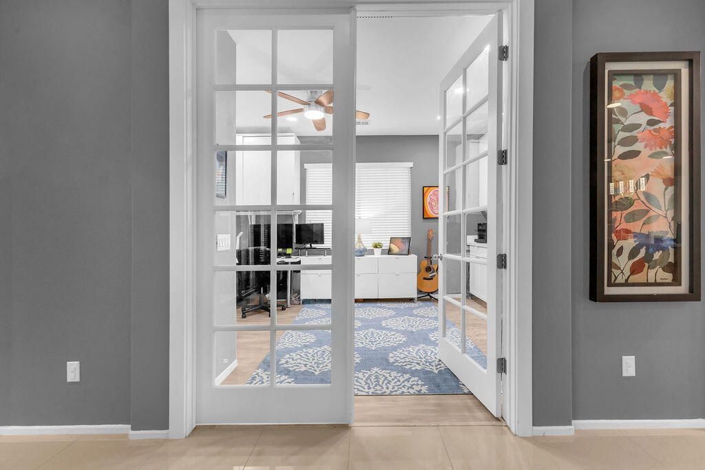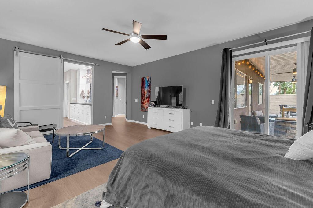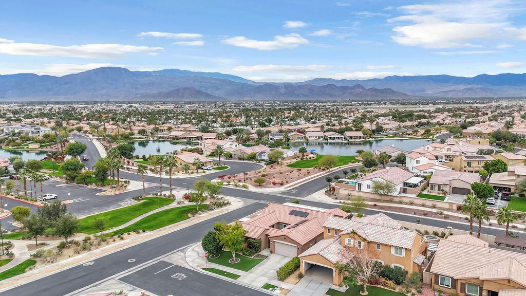 Located in the highly desirable Terra Lago community, this single-level, move-in ready home stands out with modern luxury upgrades and an unbeatable lifestyle setting. The open and spacious great room floor plan is built for both everyday living and entertaining, featuring a stone-backed fireplace with custom mantle and hearth, formal dining space, breakfast nook, and a versatile 4th bedroom or office option that opens through French doors into a private, gated courtyard entry. The master bath is fully remodeled and feels like a personal spa retreat, complete with a dual headed shower, rain shower, custom controls, premium lighting, and high-end fixtures throughout. The space also includes a 4'x7' custom sauna built directly into the master bath, creating a true luxury experience at home. The master closet has been fully built out with custom shelving and additional storage. The half bath is also remodeled with modern hardware, upgraded lighting, and an elevated design. Major upgrades include owned solar, a whole-house water filtration system, low-maintenance landscaping with artificial turf, a well-maintained garden with custom landscape lighting, an Alumawood-covered patio showcasing mountain views, lattice window covers, tandem garage storage, a custom built shed with double-gate access, and a recently refreshed and painted exterior. Terra Lago offers resort-style amenities including a clubhouse, pool, spa, fitness center, and social spaces, all within walking distance. Privacy, luxury, convenience, and lifestyle come together in one of the best communities in the desert. This home is truly a standout inside of it.
